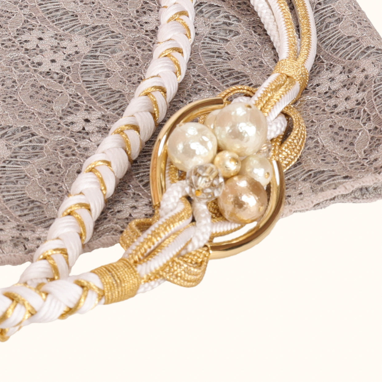 《帯締め》透明ビーズとコットンパールとゴールドで装飾。