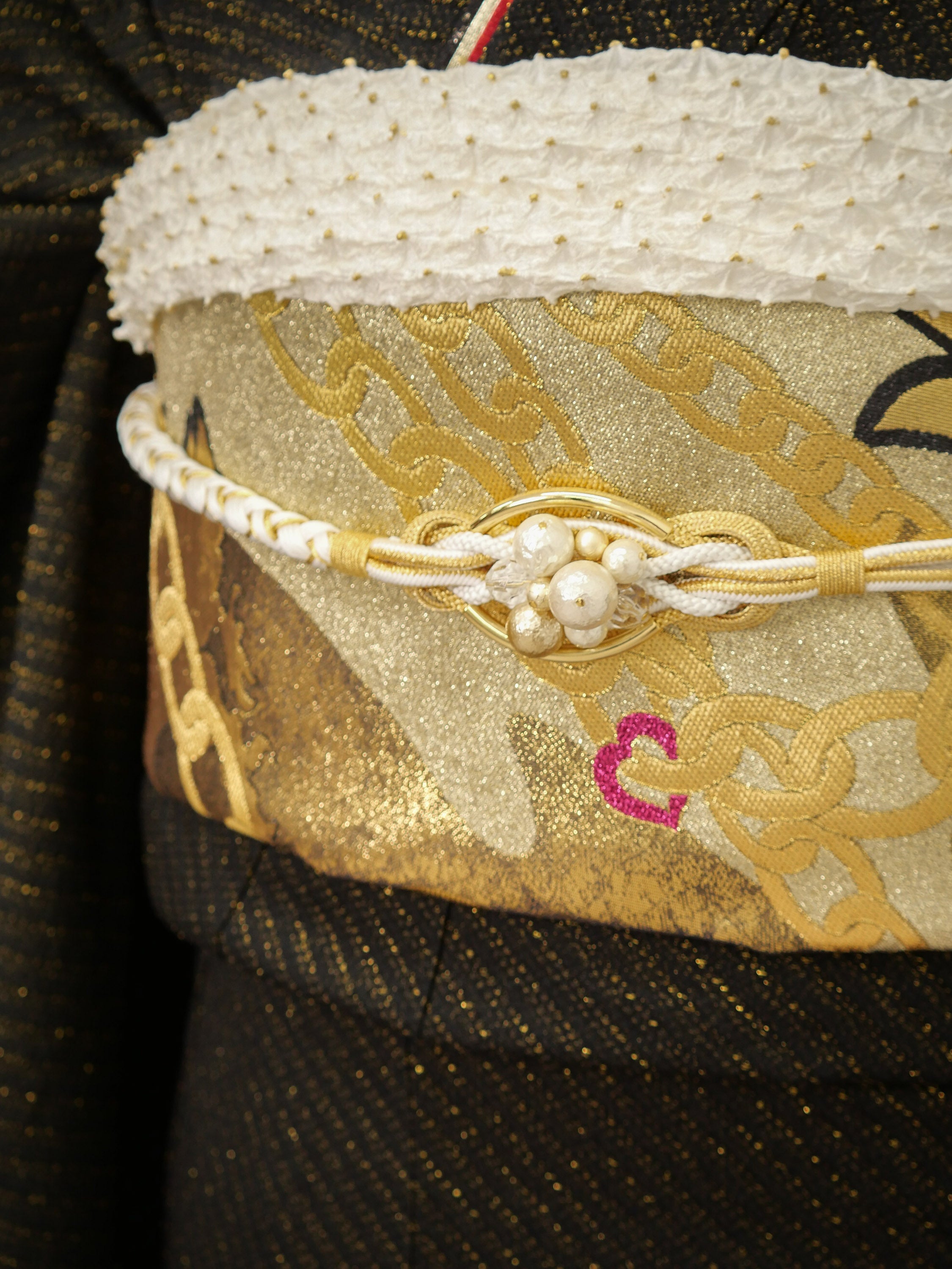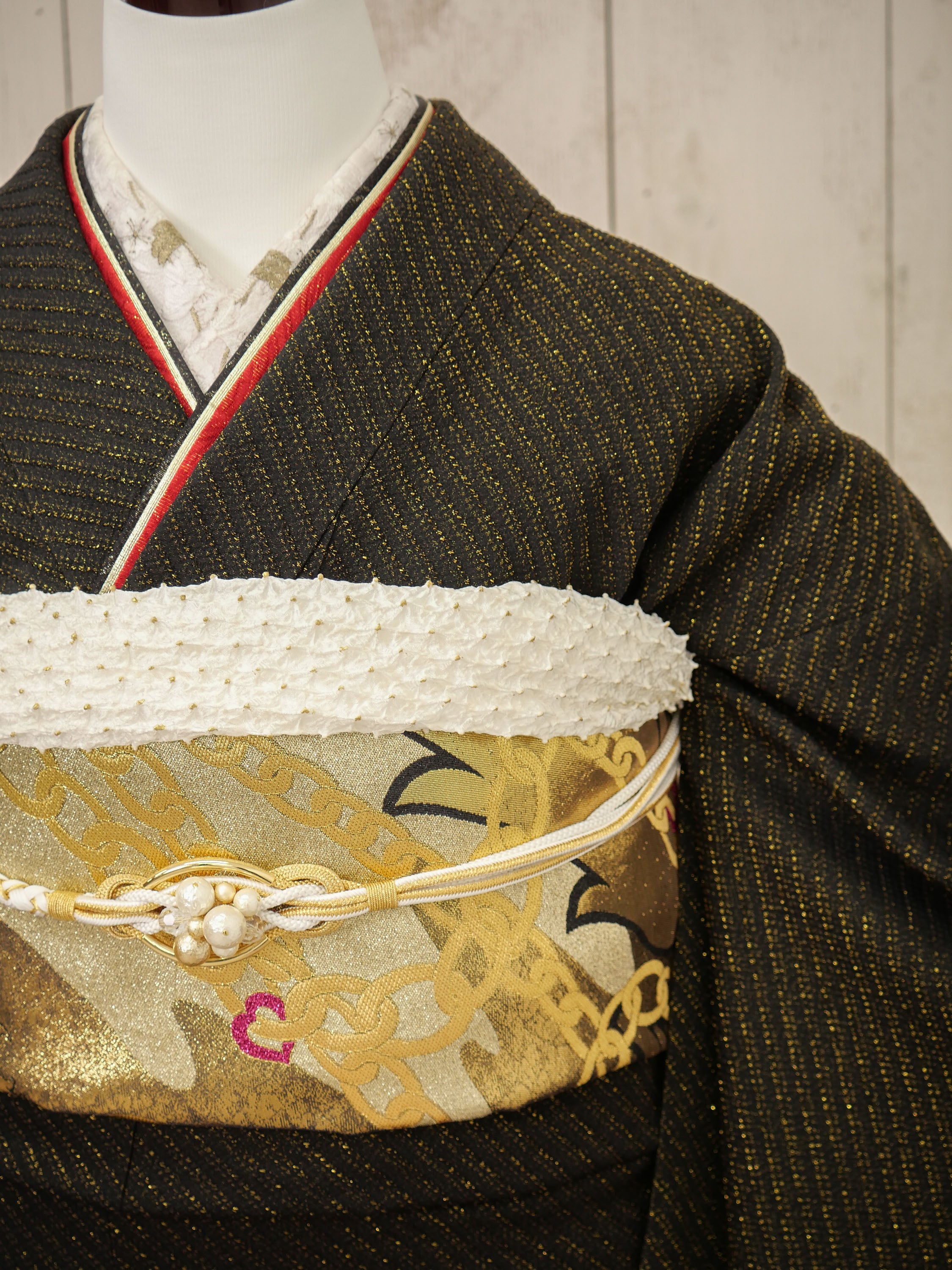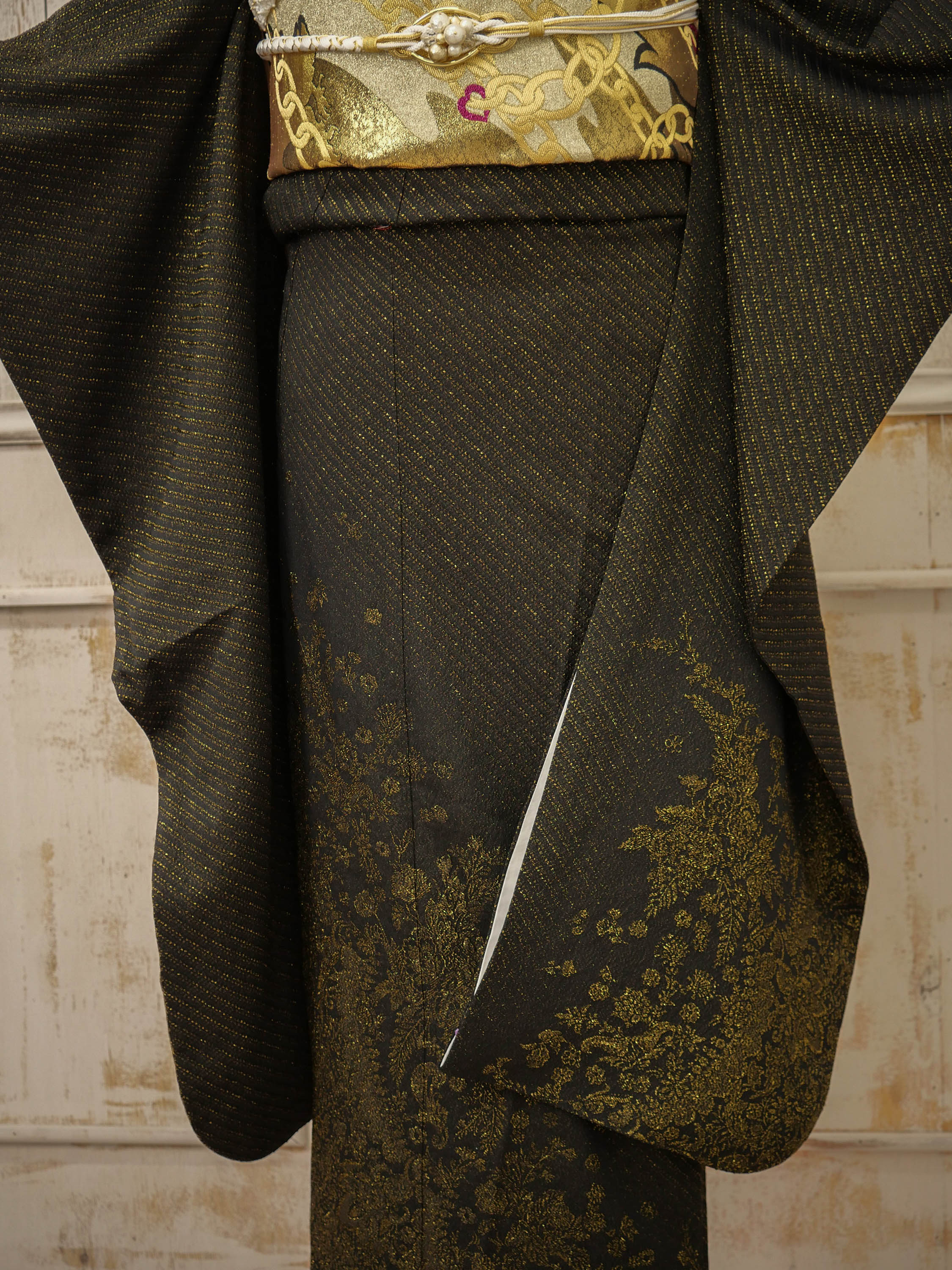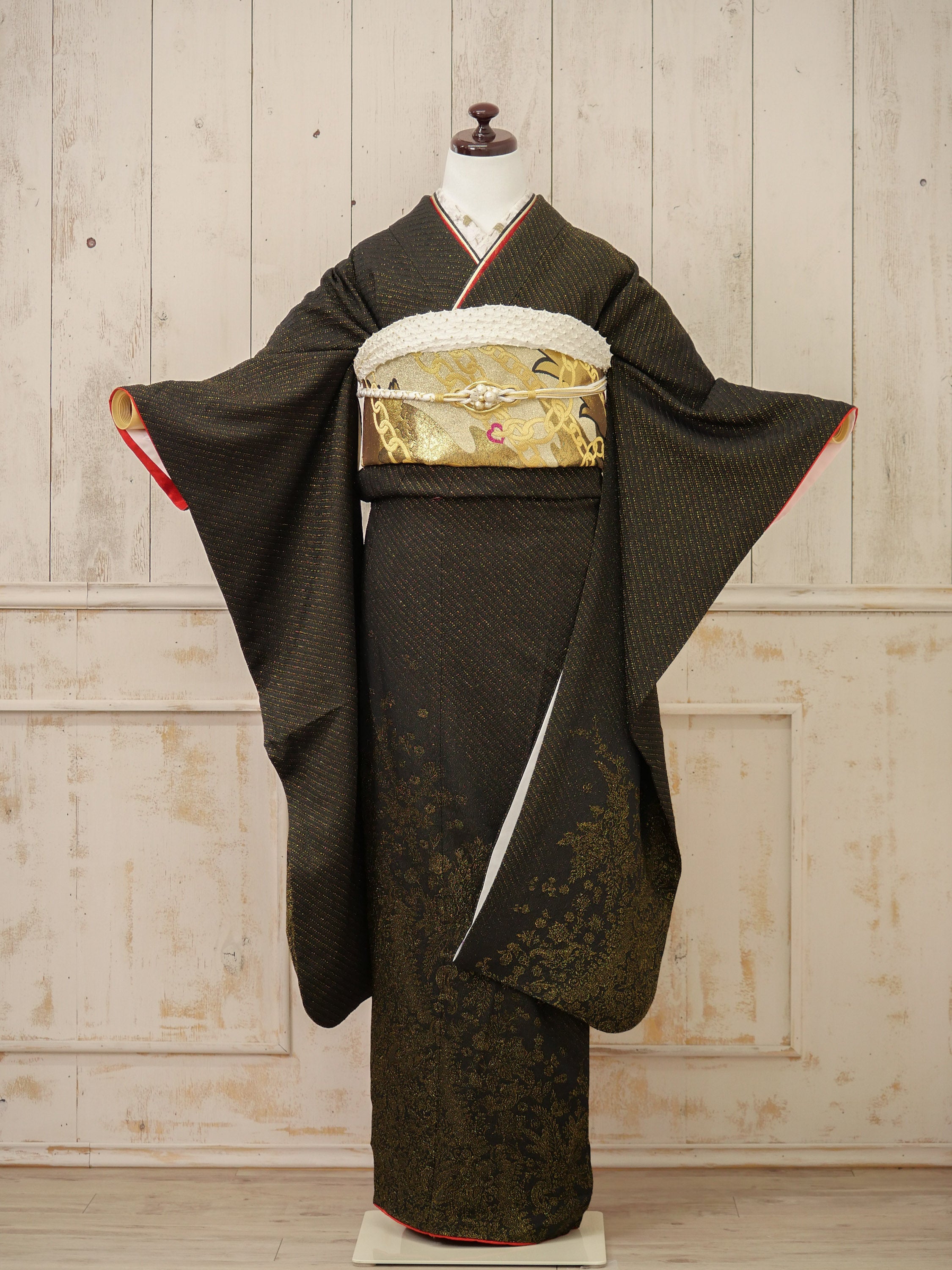 漆黒の地に繊細な金彩模様が広がる、シックで大人の気品漂う振袖。落ち着いた色味と控えめな華やかさが、知性と美しさを引き立てます。格式ある場にもぴったりの一着。