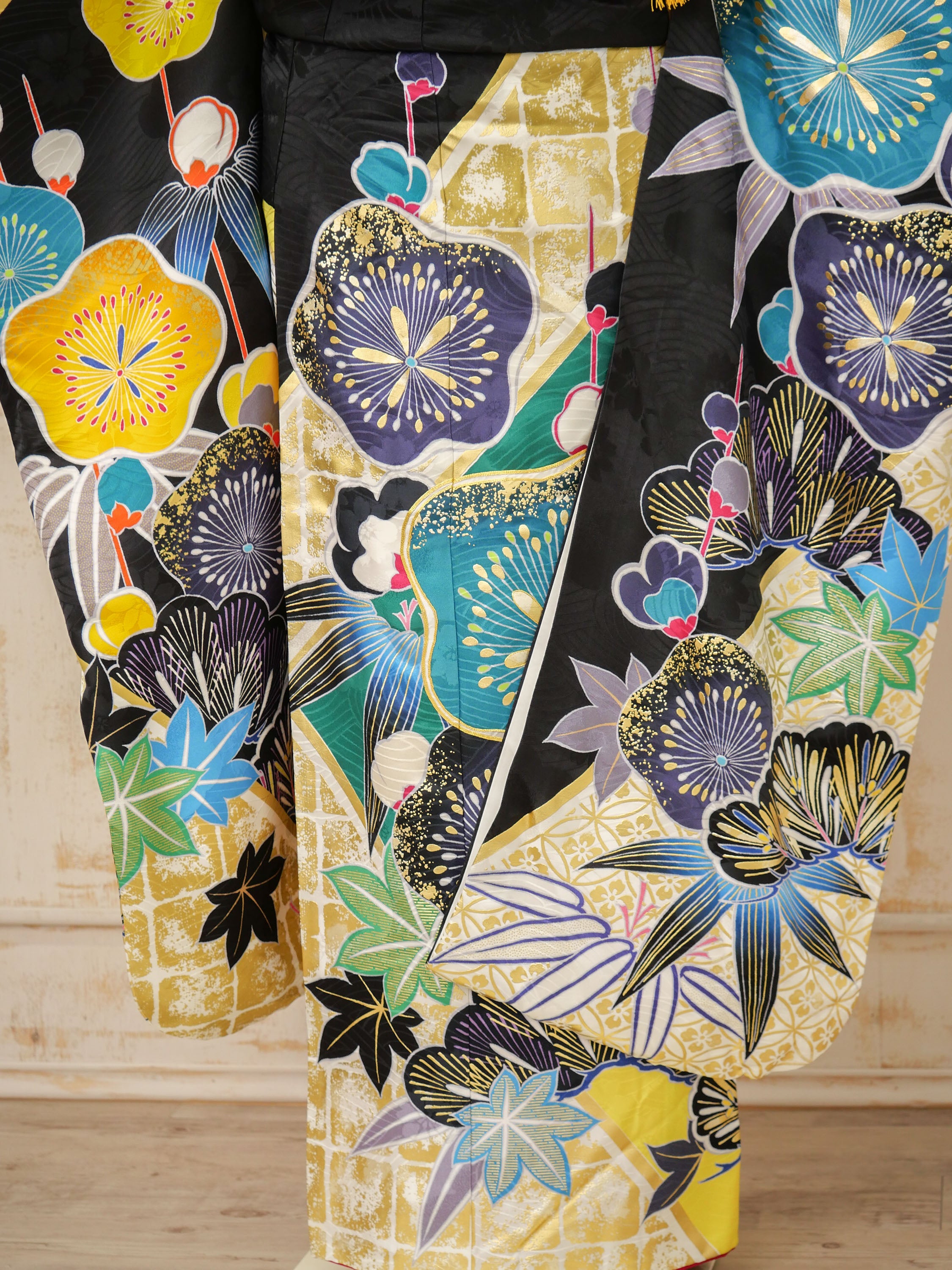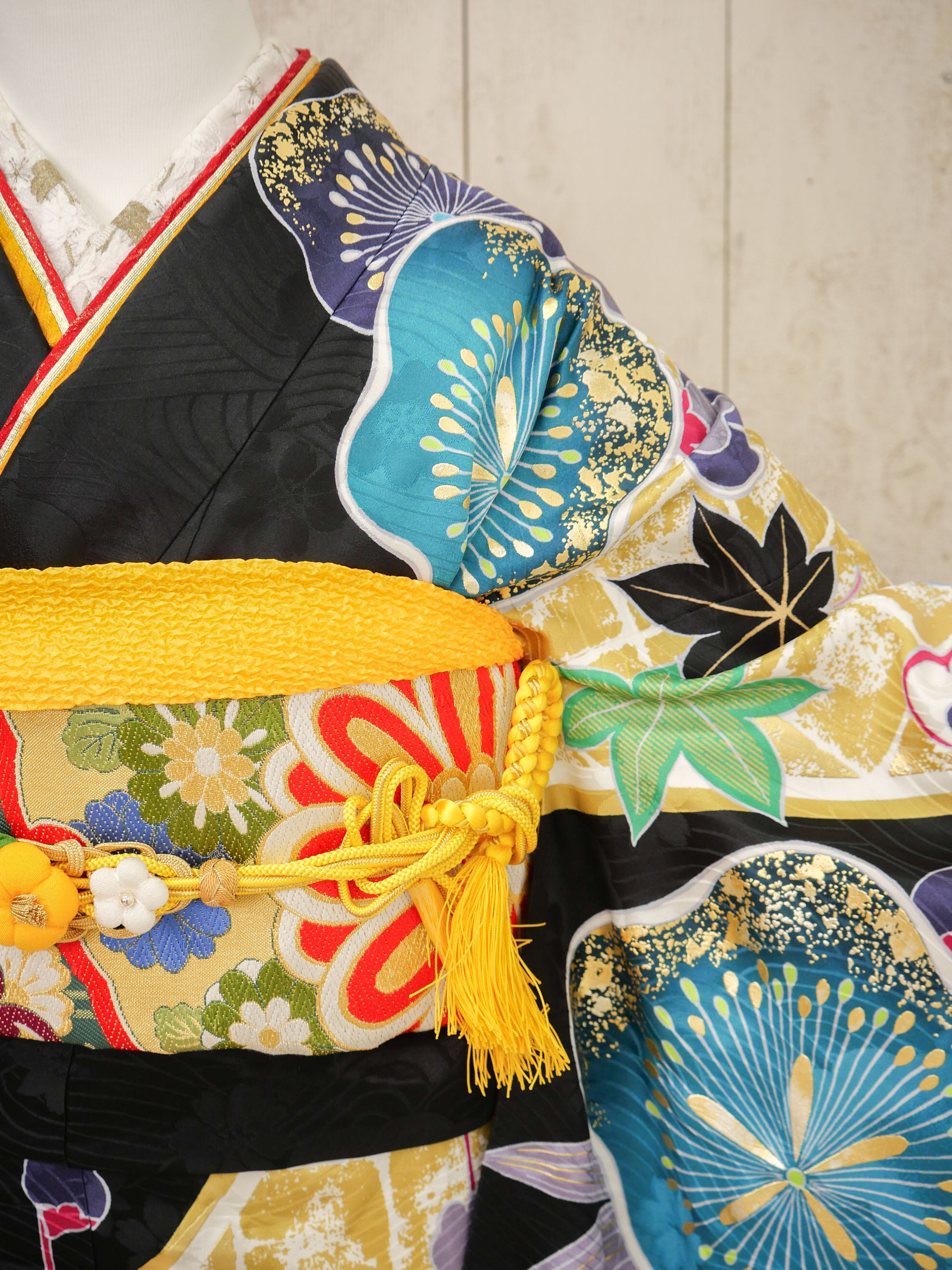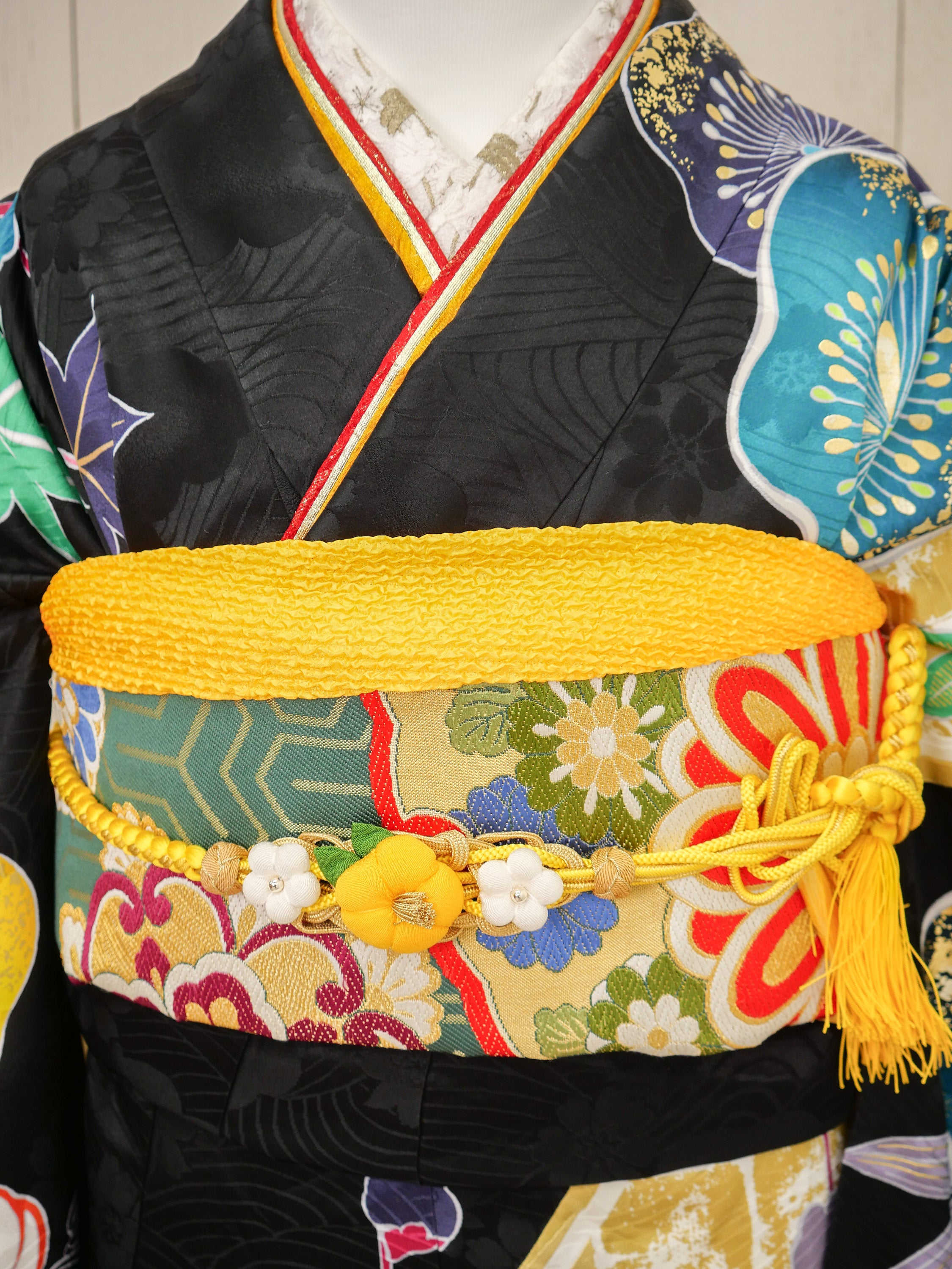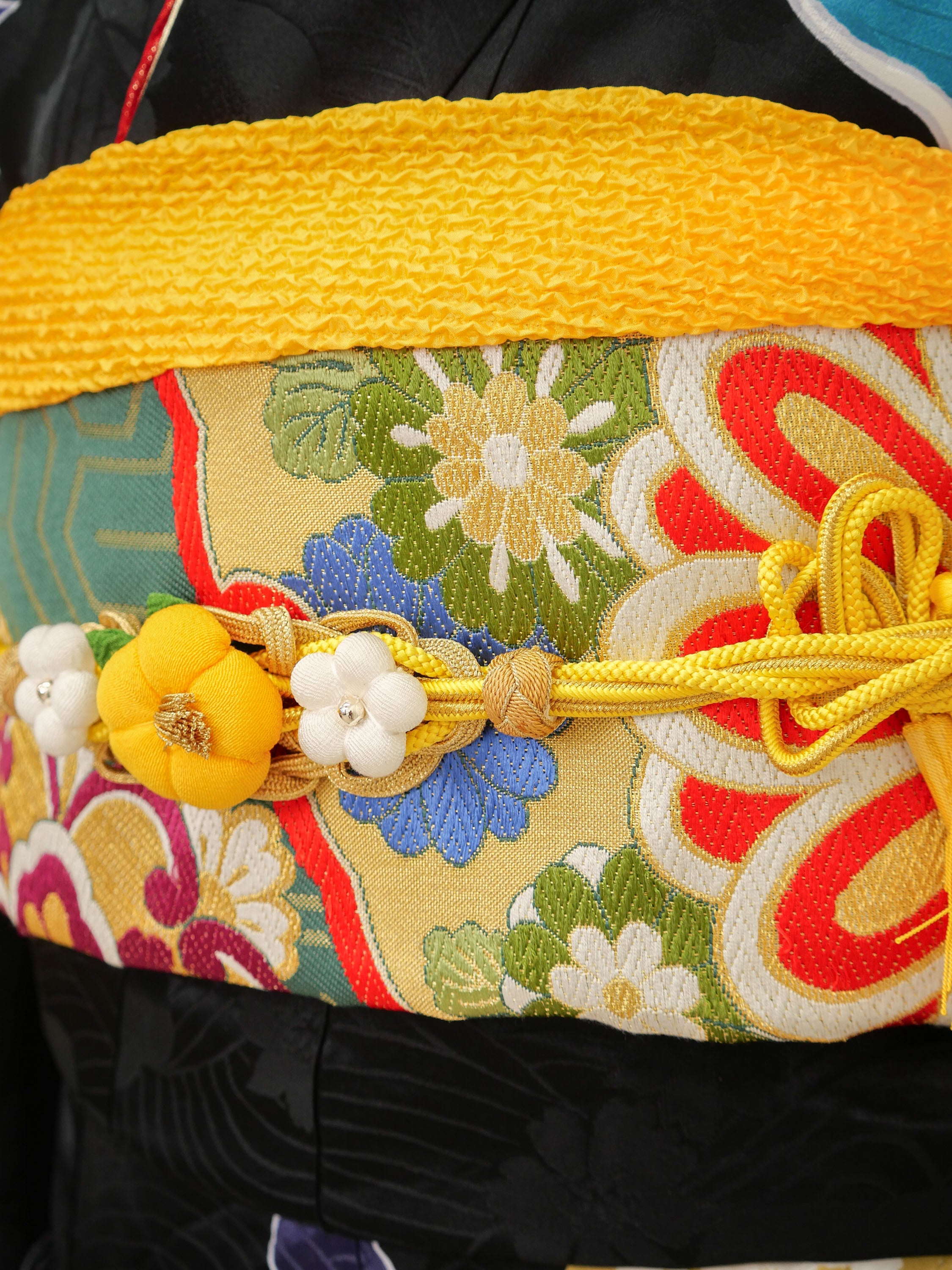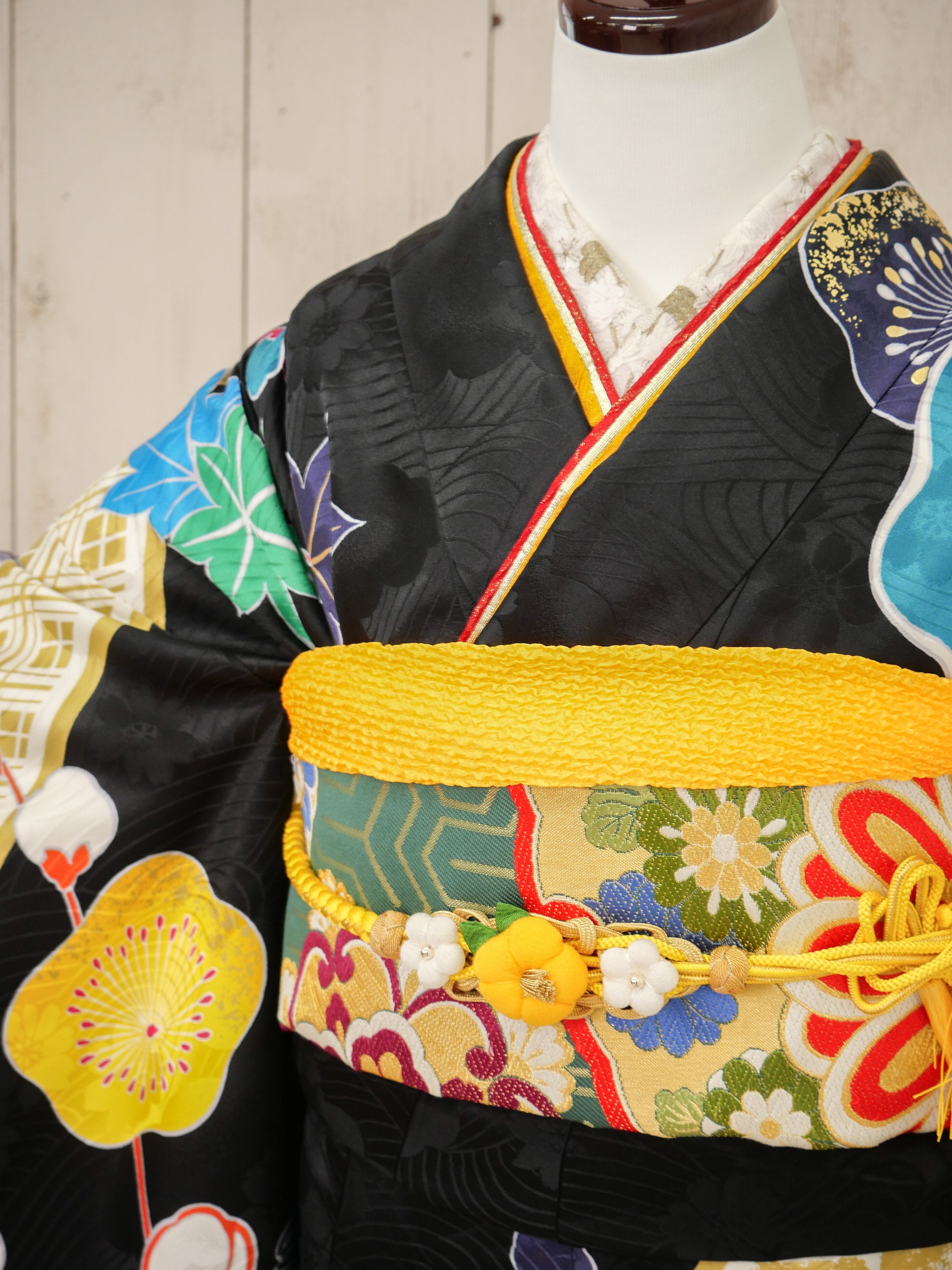 黒地にポップで鮮やかな花模様を大胆に描いたモダンスタイル。レトロ調の柄と黄色い帯がアクセントになり、他とは被らない唯一無二の存在感を放つ一着です。