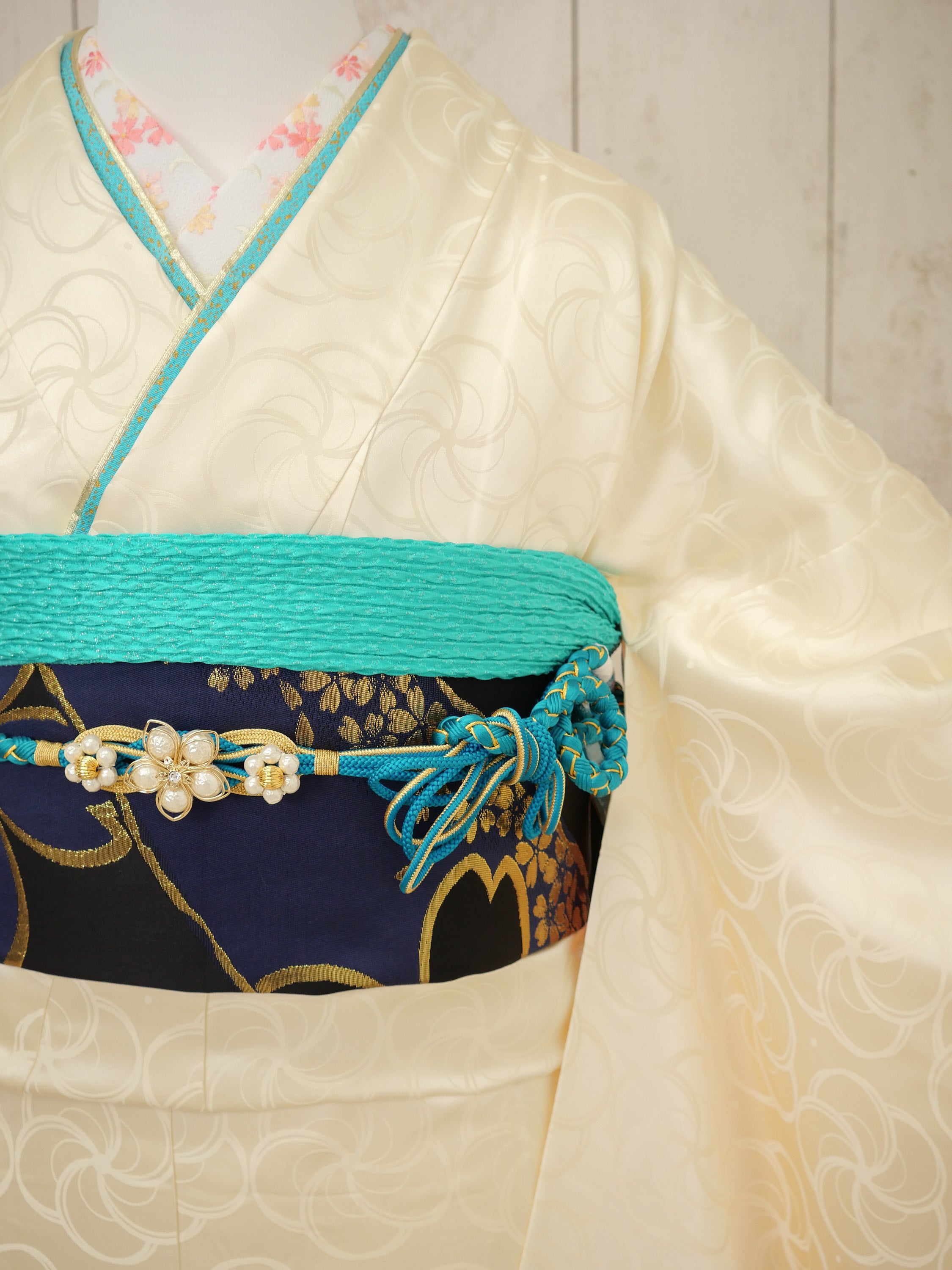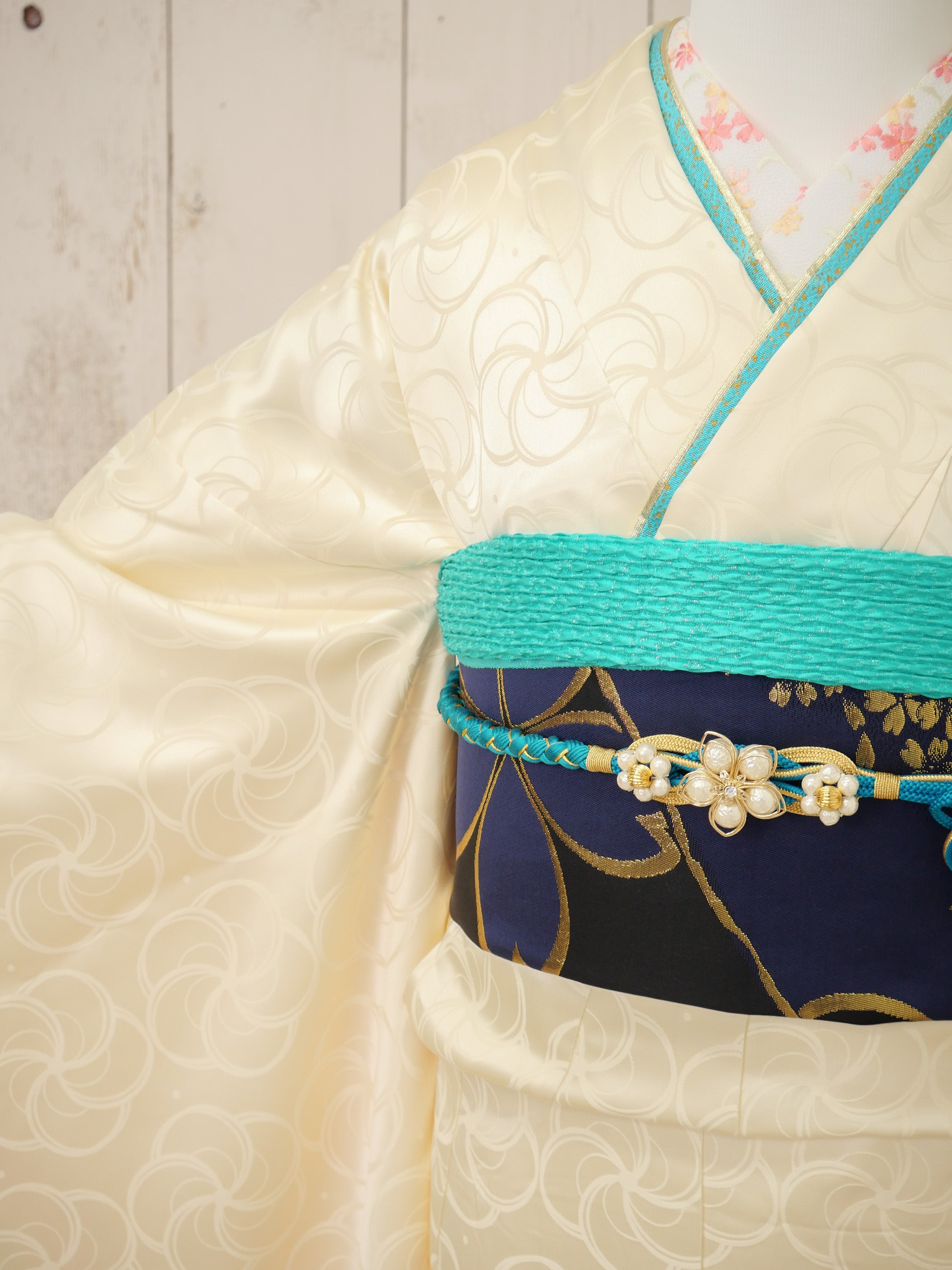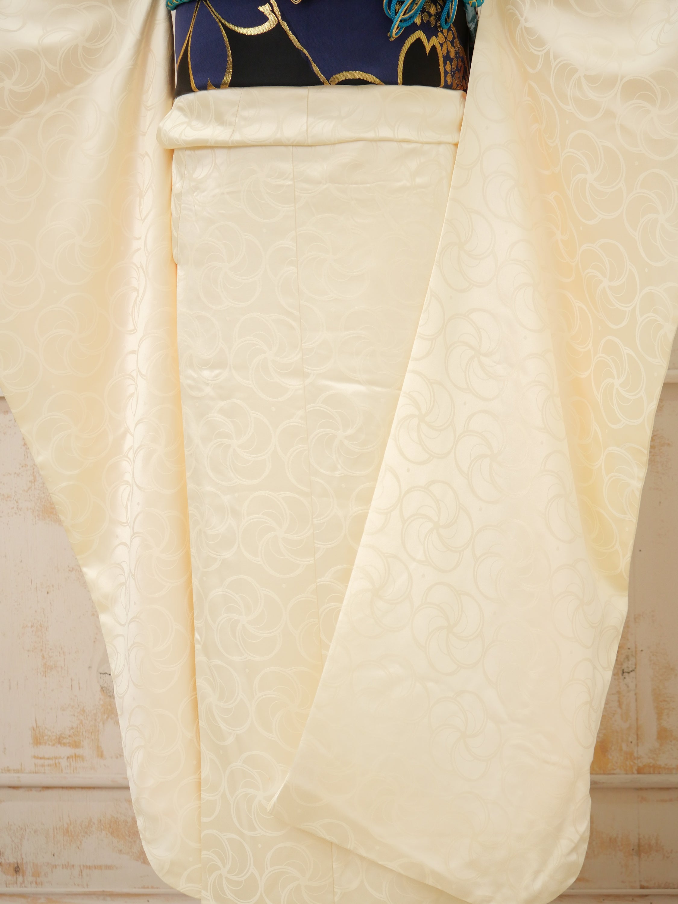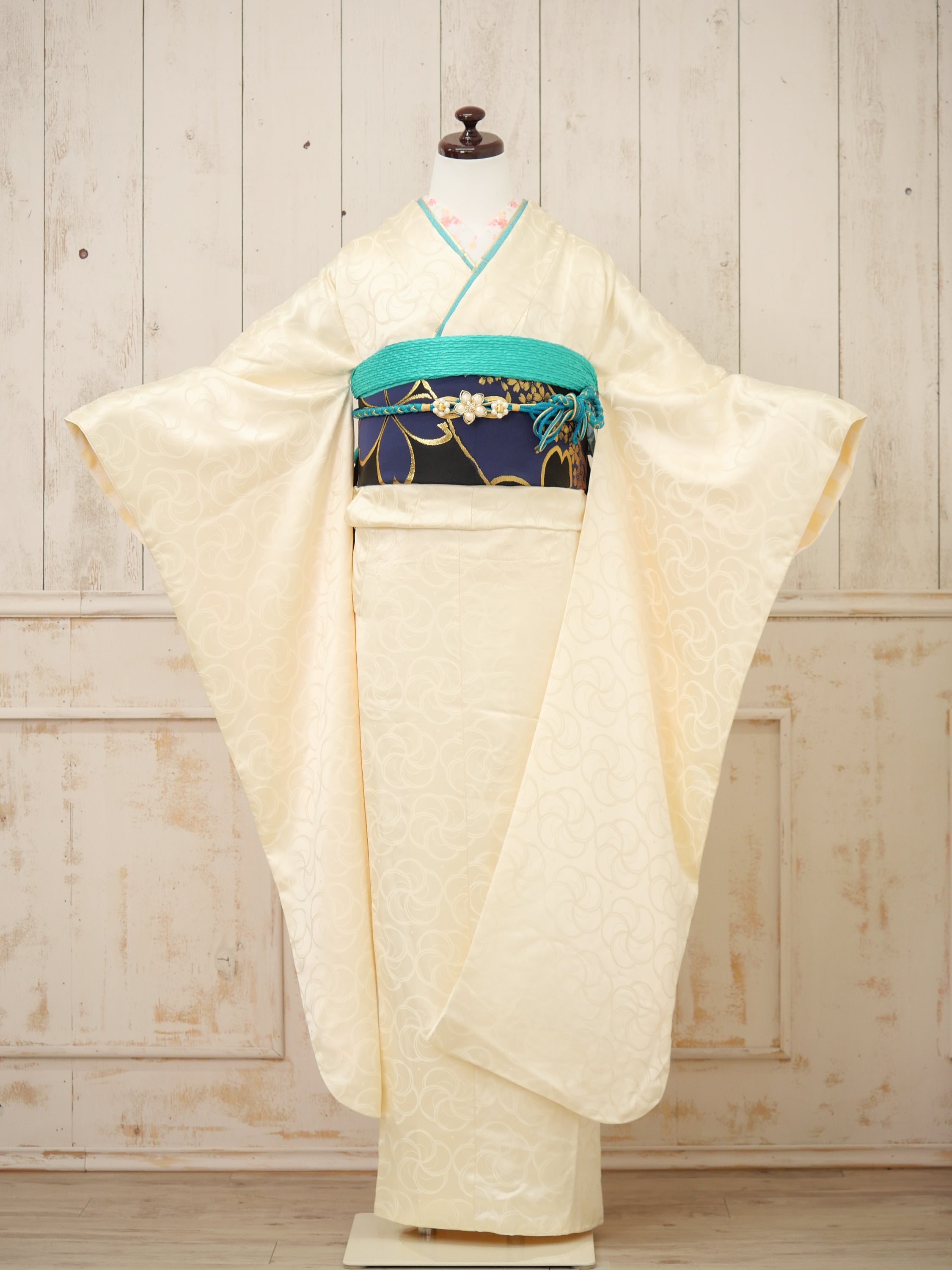 シンプルながらも、上品な地紋が優雅に浮かび上がる生成りの振袖。帯や小物で自由に個性を加えられる、洗練されたナチュラルスタイルを好む方にぴったりです。