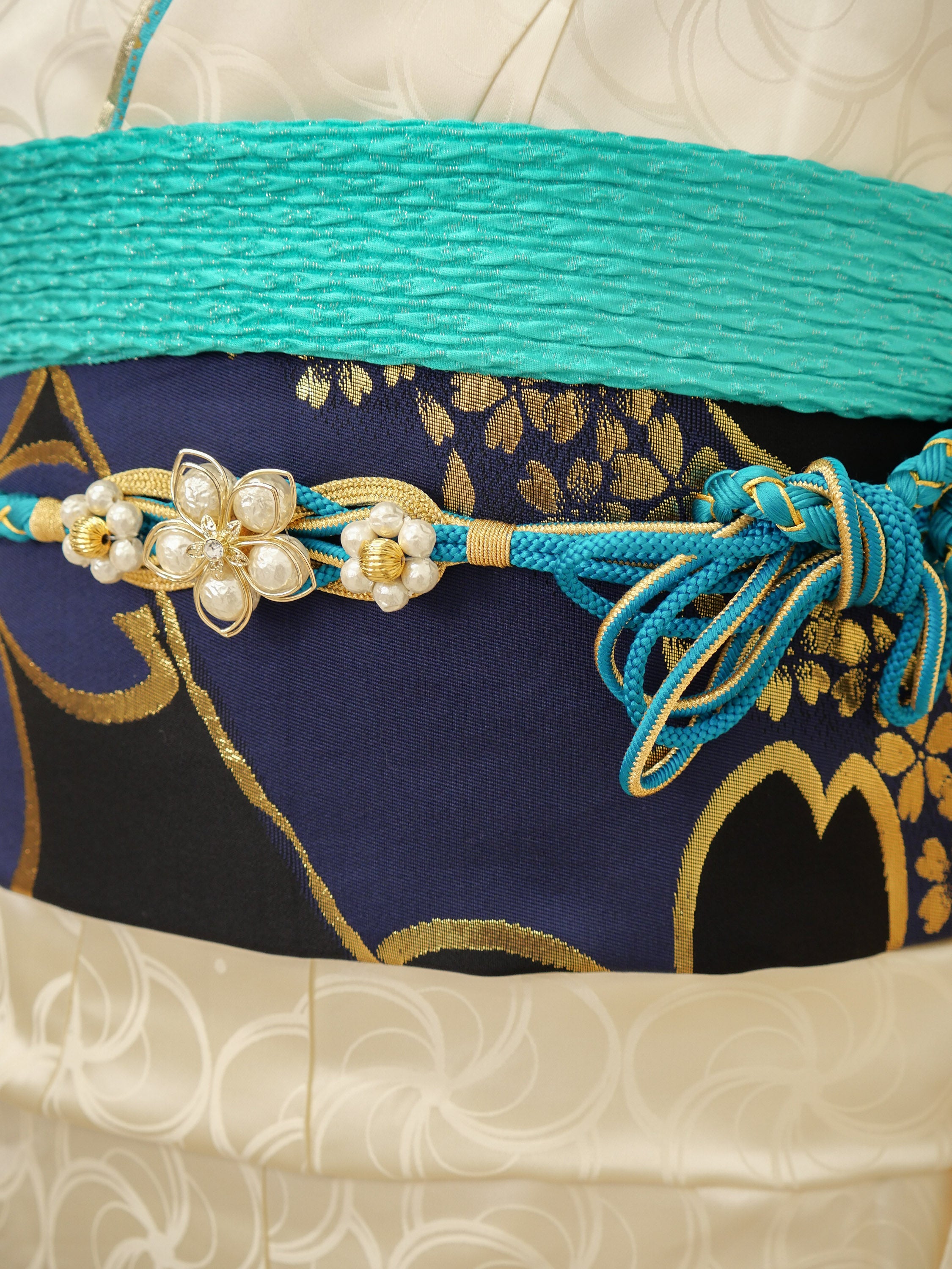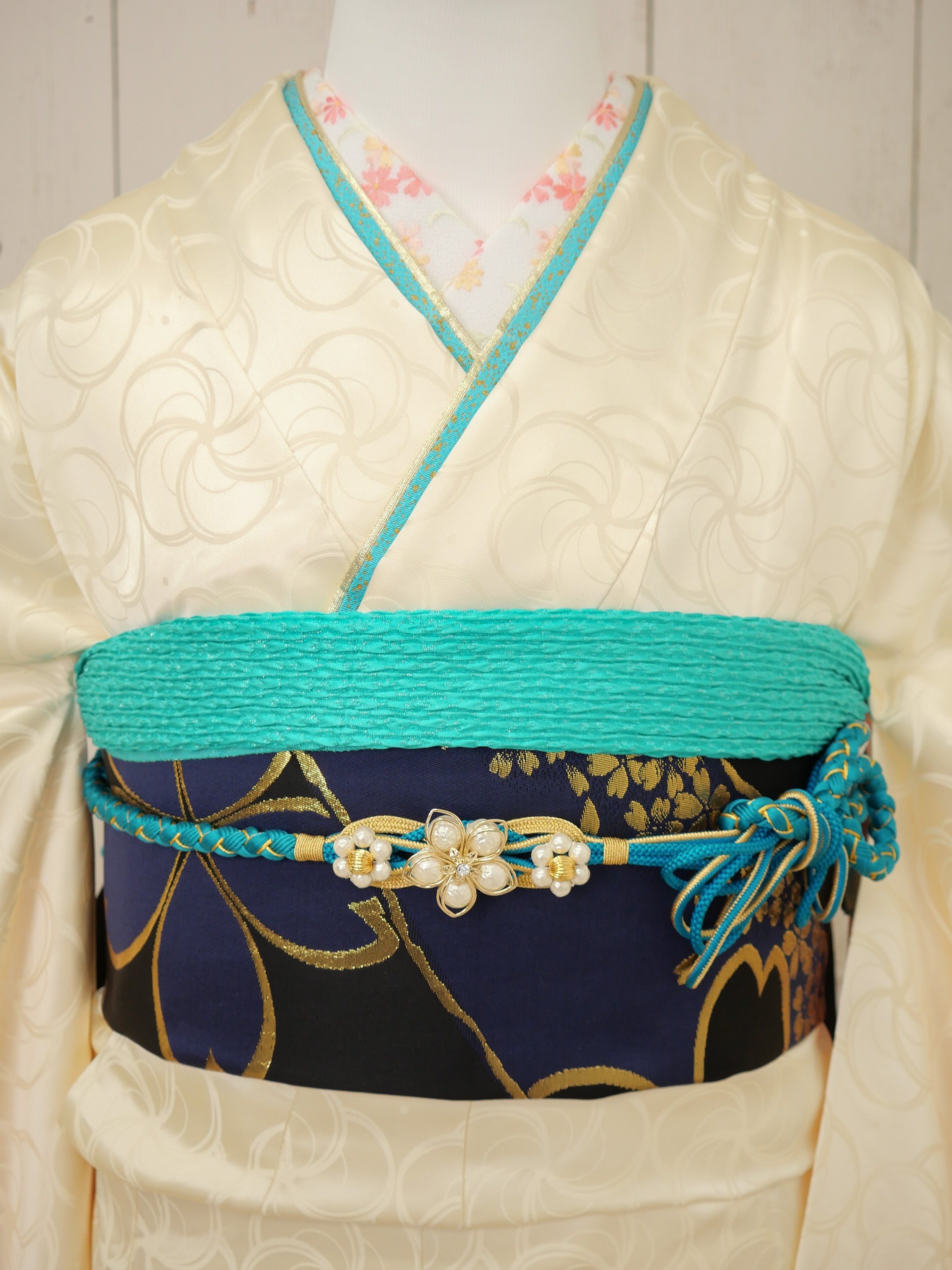 中振袖、袋帯、長襦袢(半襟付き、ポリエステル)、重ね衿(着物に縫い付けの商品あり)、帯揚げ、帯締め、ショール、腰紐5本、伊達締め2本、衿芯、前板、後板、帯枕(ガーゼ付き)、コーリンベルト1本、三重紐、草履、バッグ
