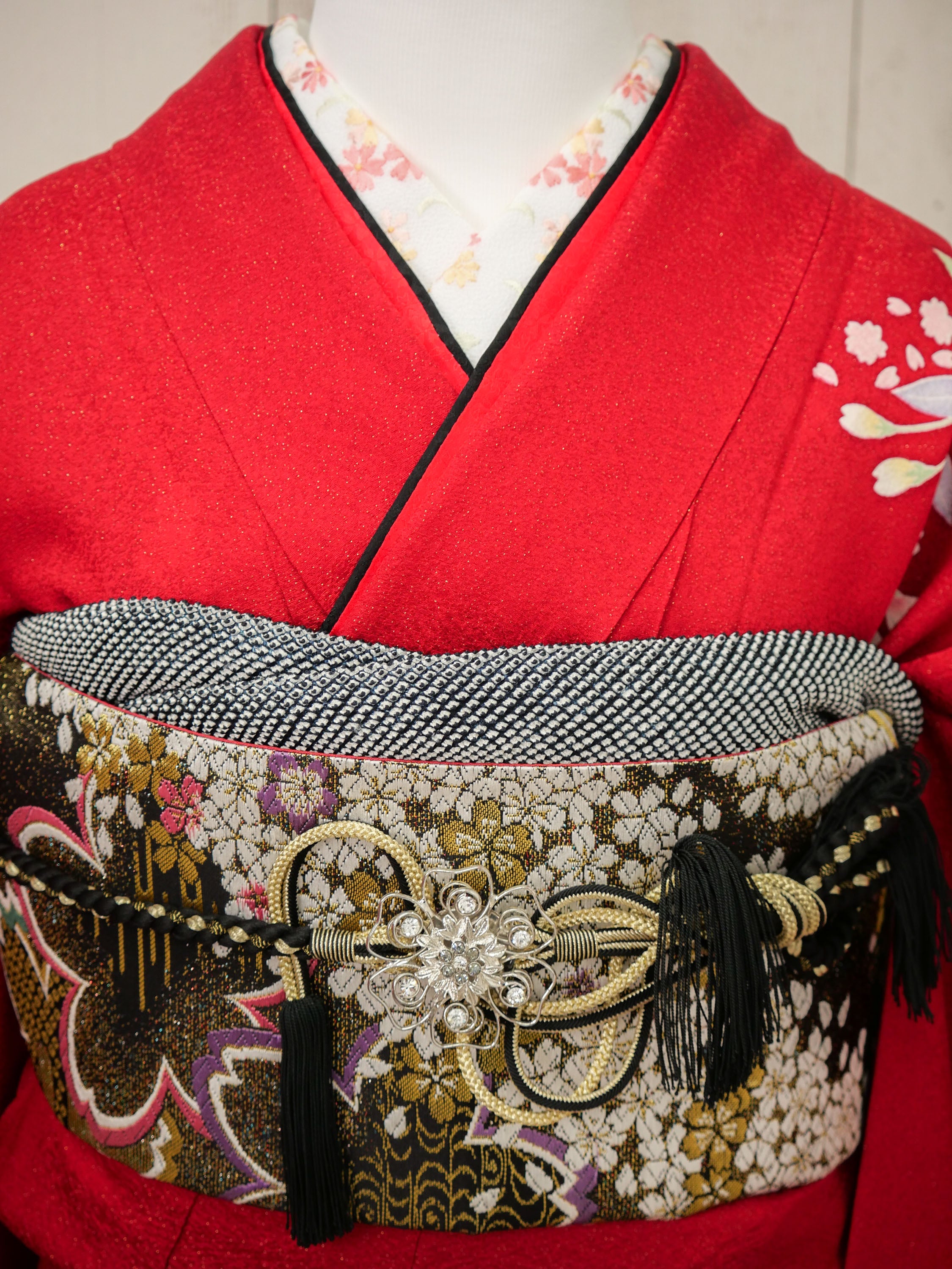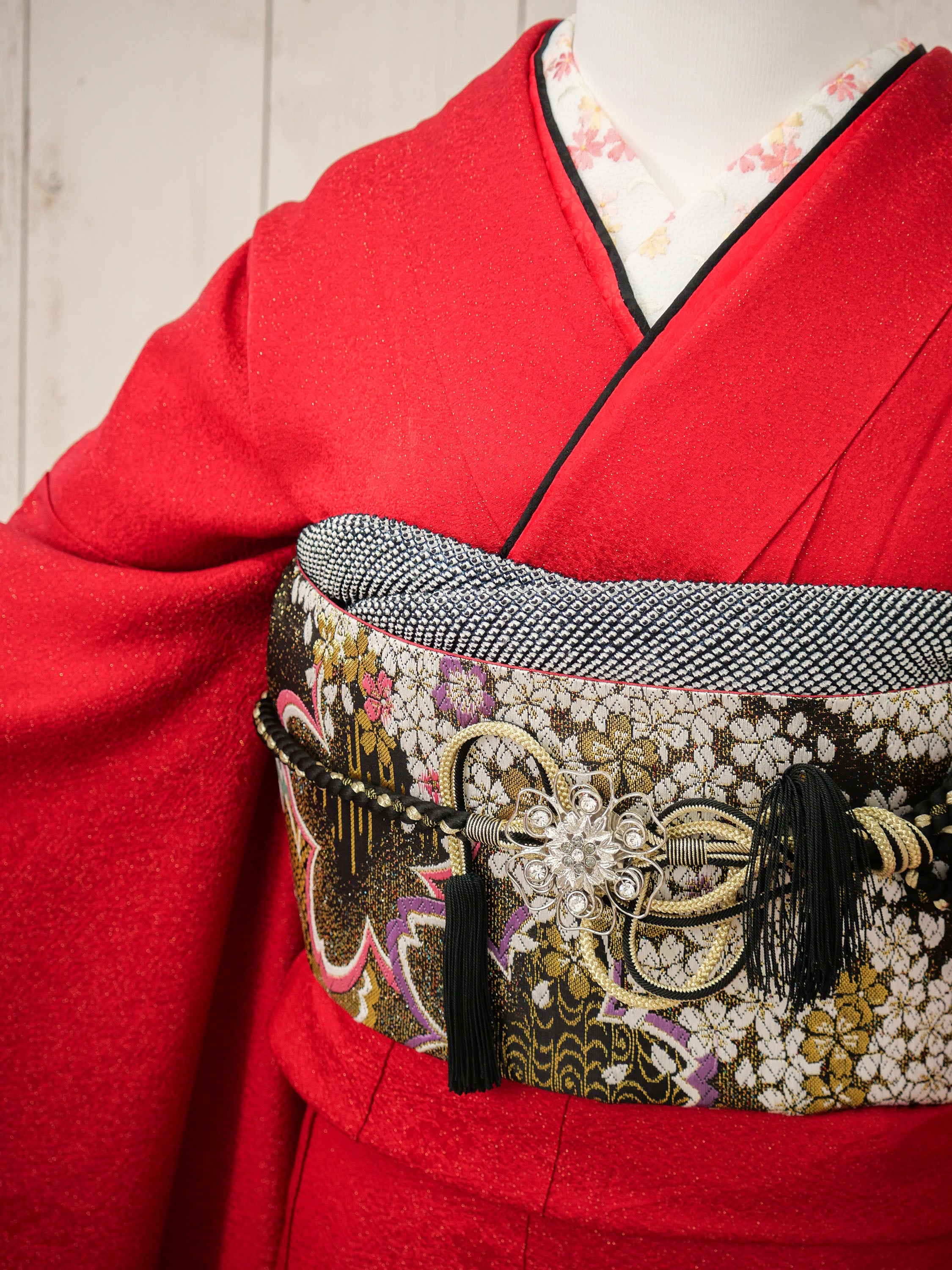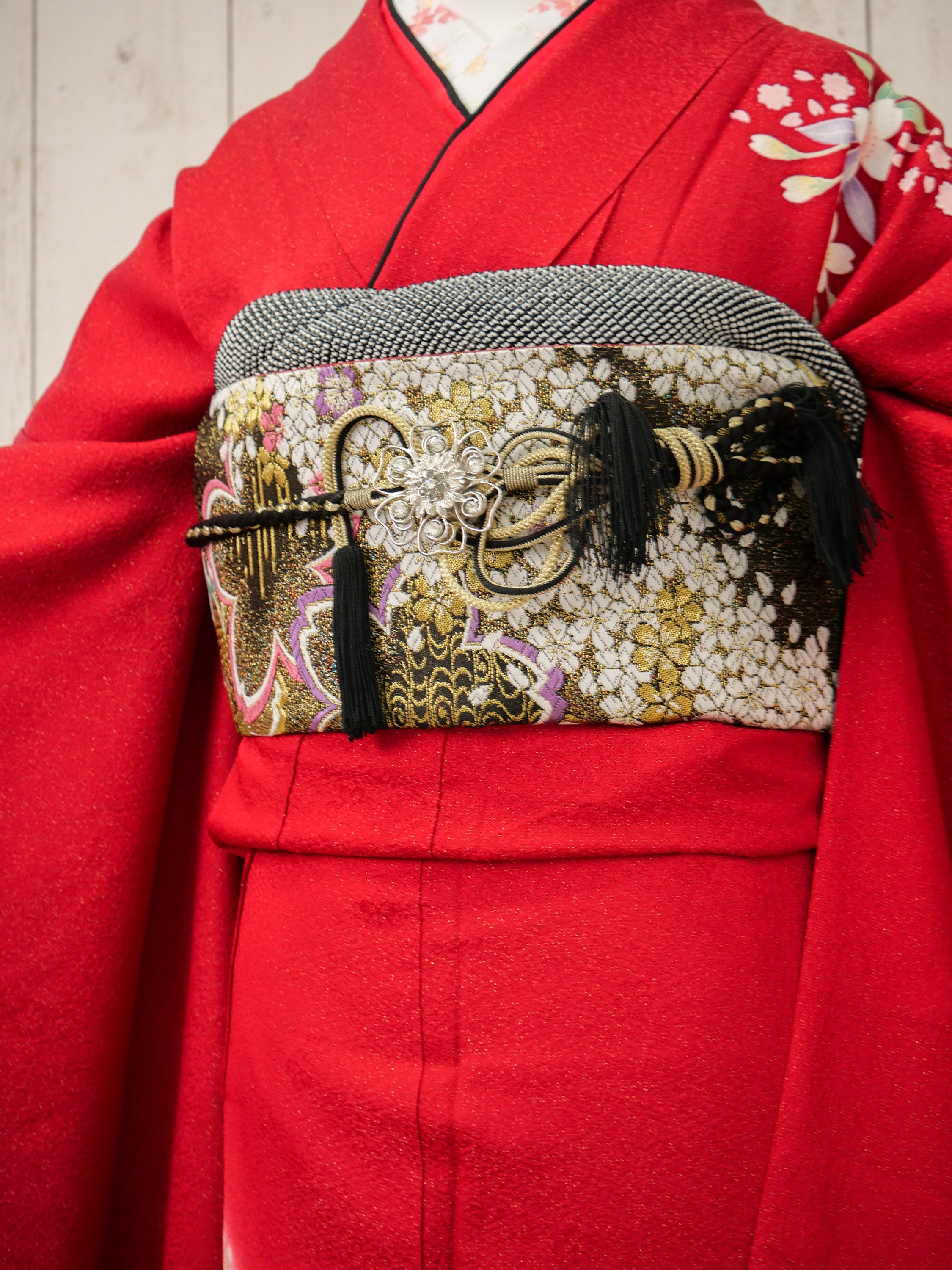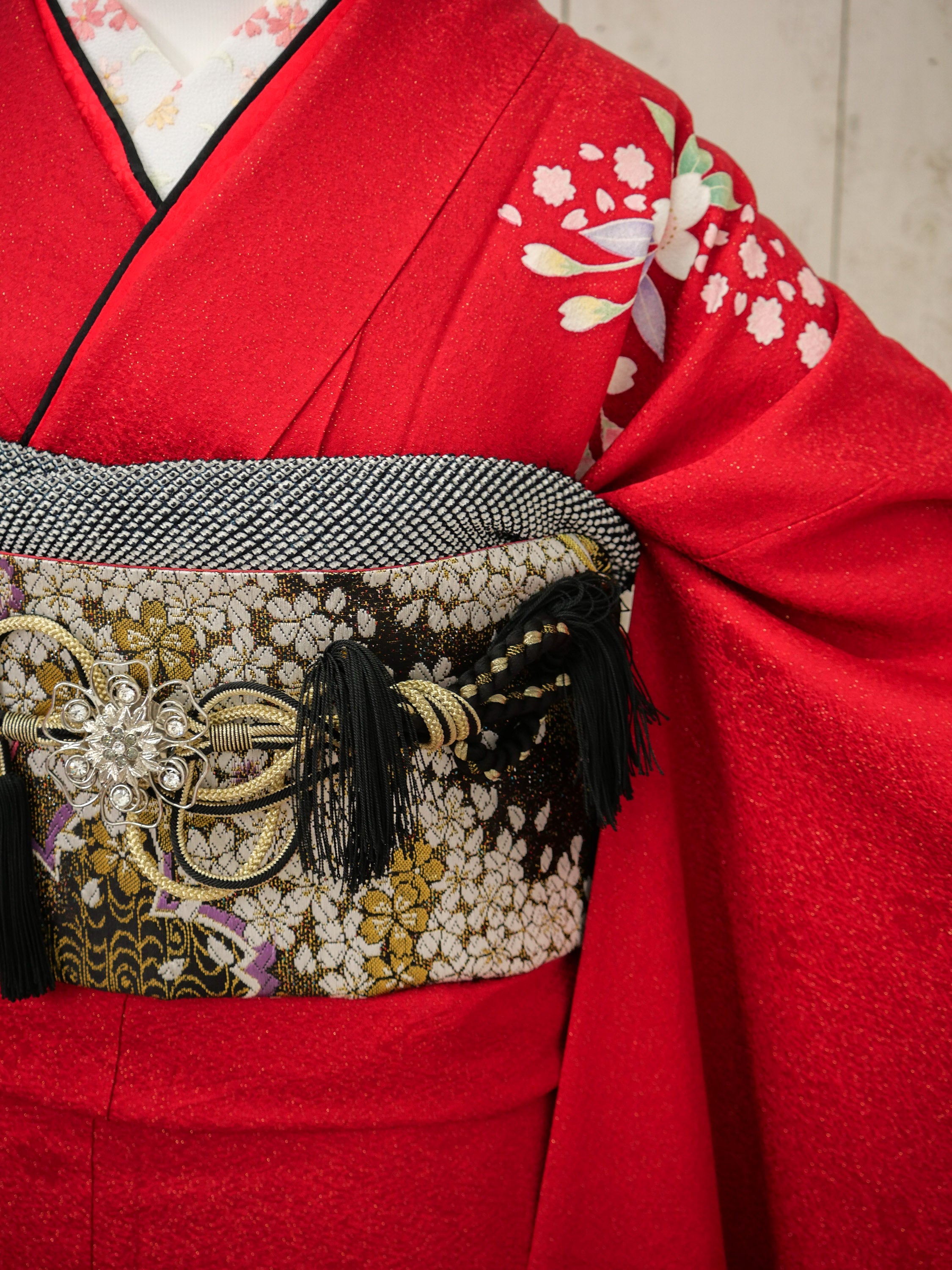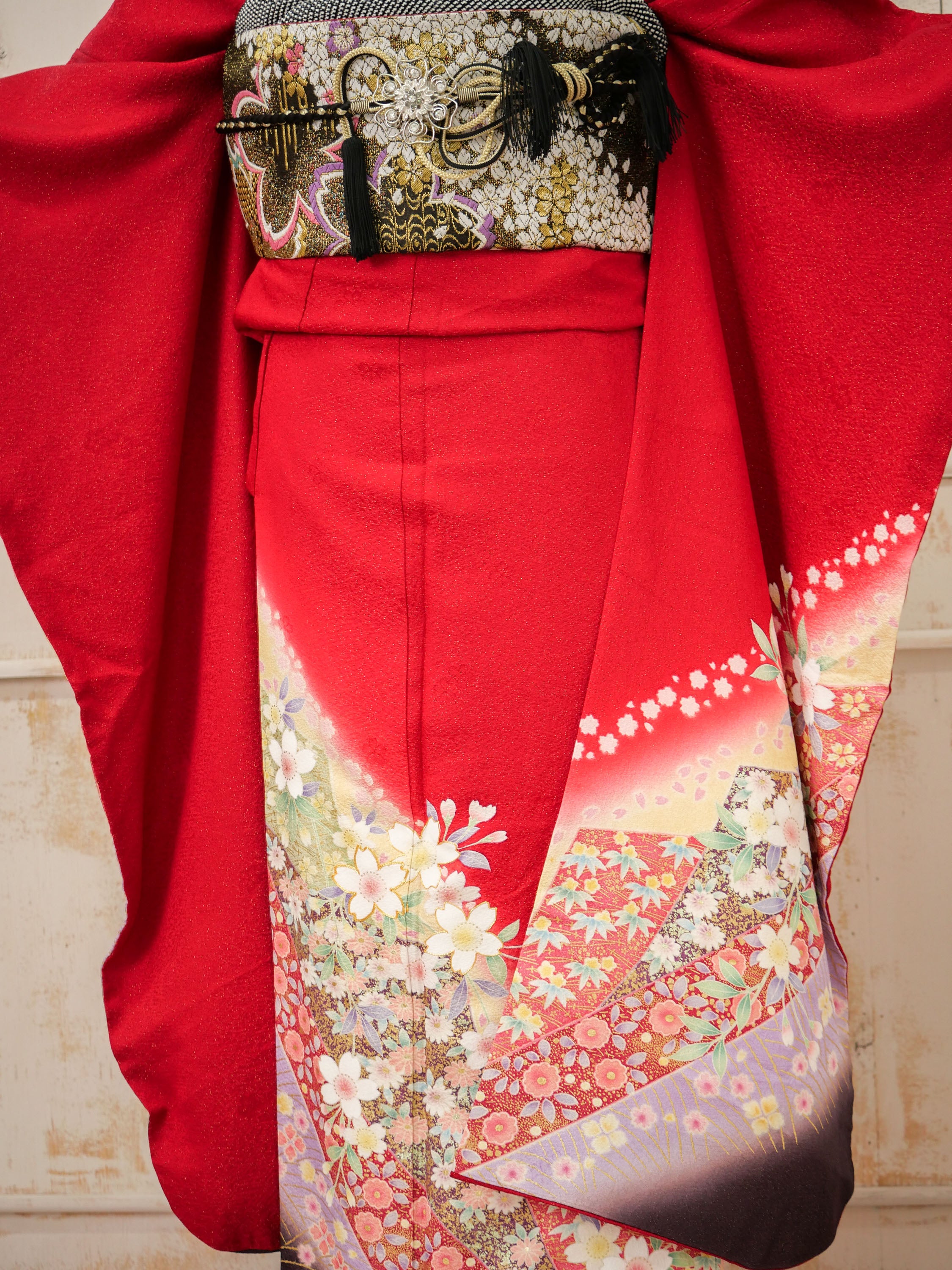 鮮やかな赤地に流れるような花模様が施された華やかな振袖。裾の濃紅から淡桃への移ろいが華麗で、格式と若々しさを兼ね備えています。黒地の帯が全体を引き締め、堂々とした存在感を放つ晴れの日にふさわしい一枚。