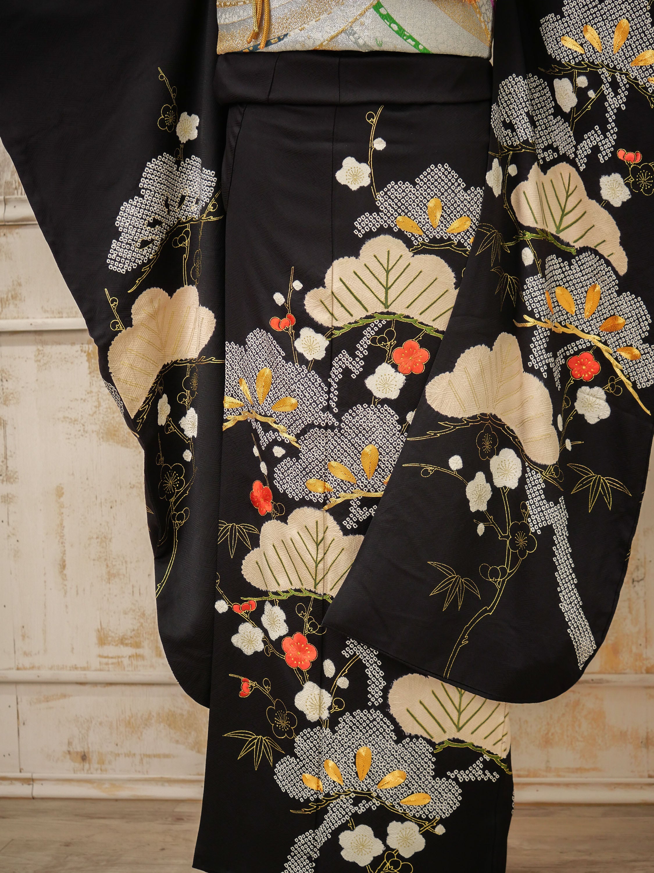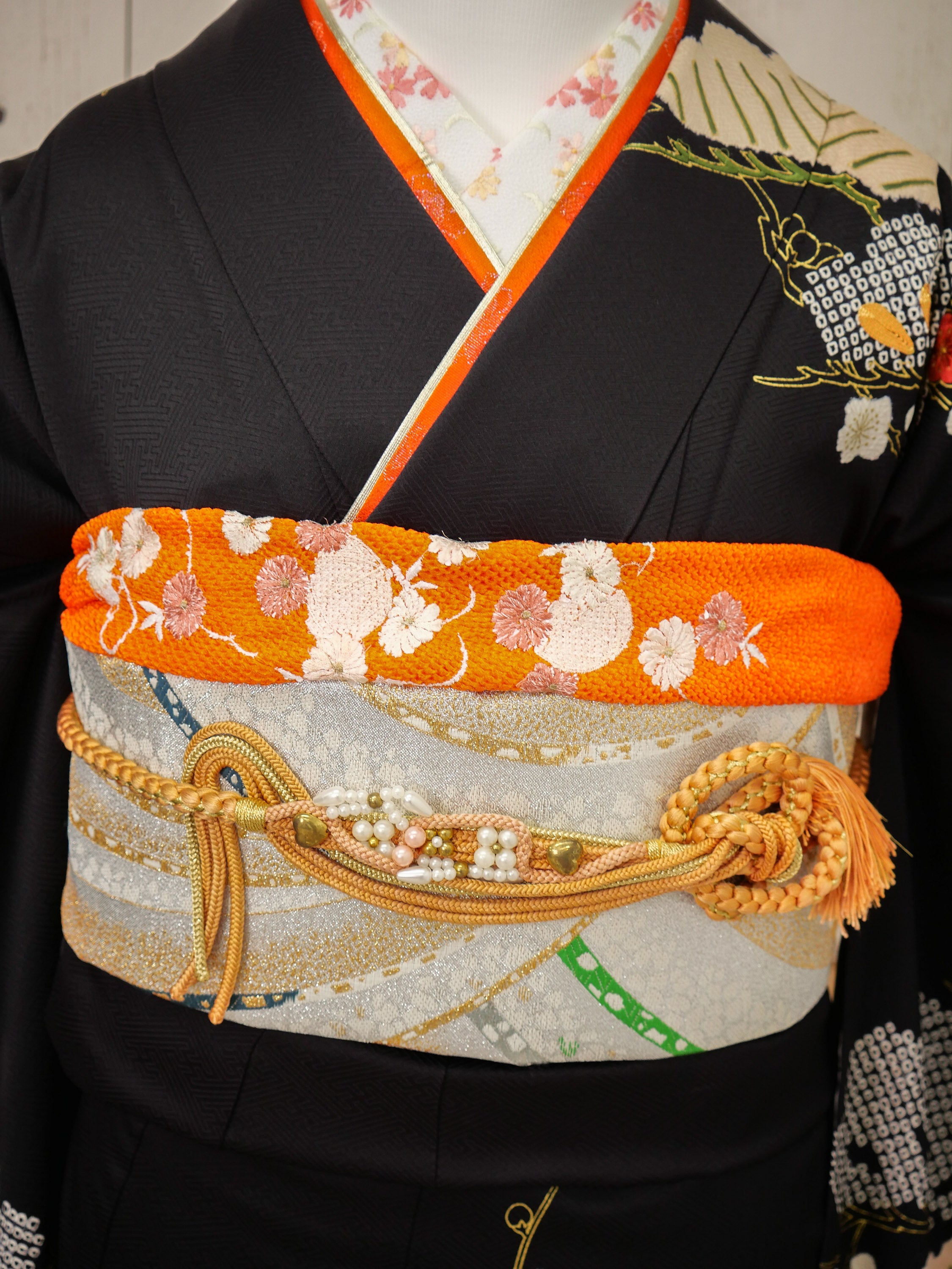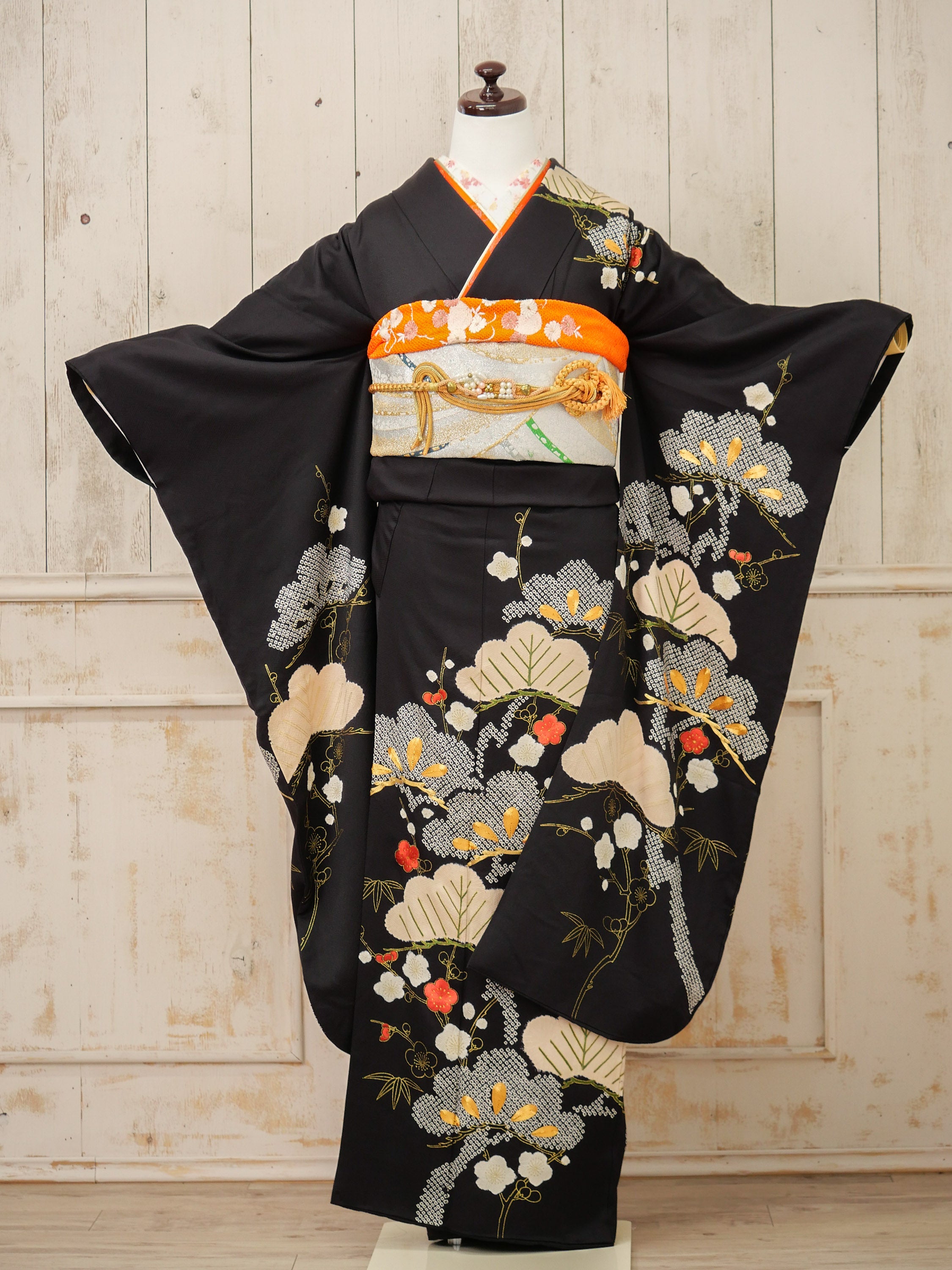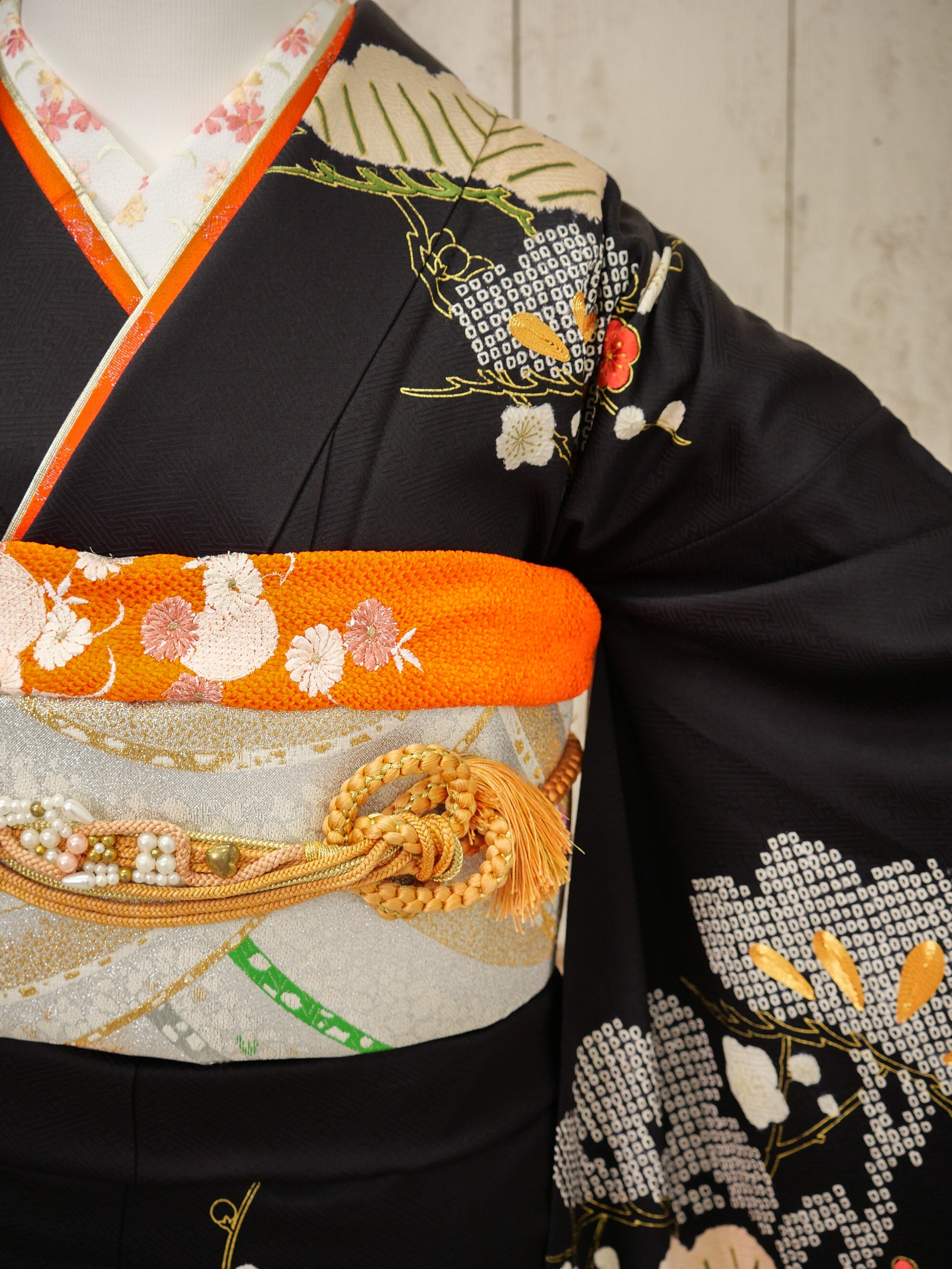 黒地に扇面と花模様が描かれた、品格漂うクラシカルな振袖。金と橙の帯が華やかさを添え、落ち着いた美しさを引き立てます。伝統美を重んじる方にぴったりの、格調高く気品あふれる逸品です。