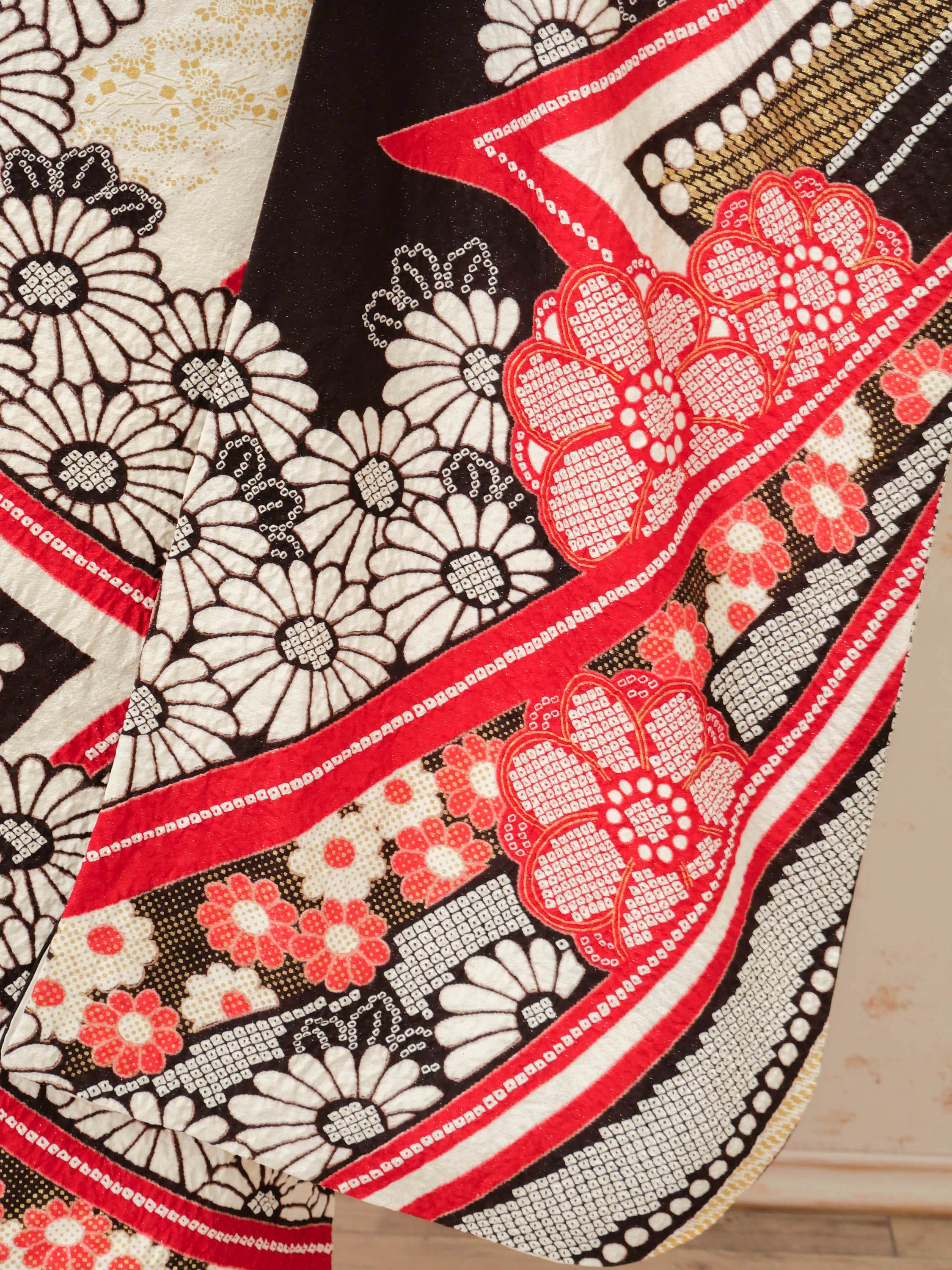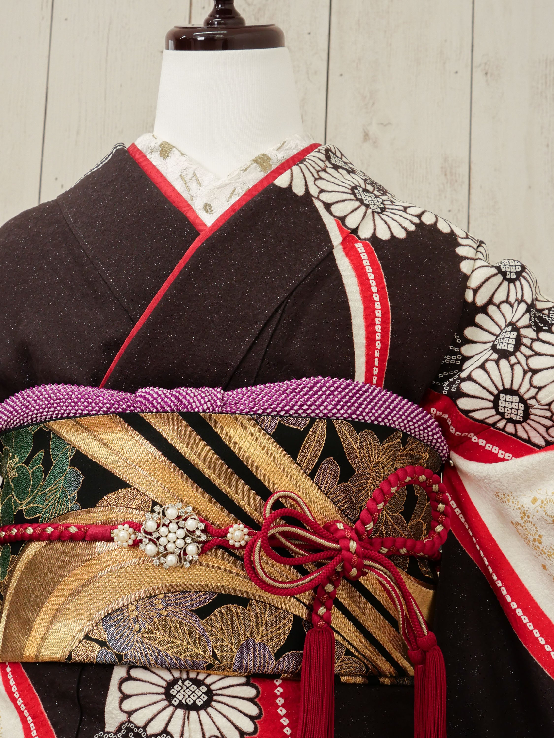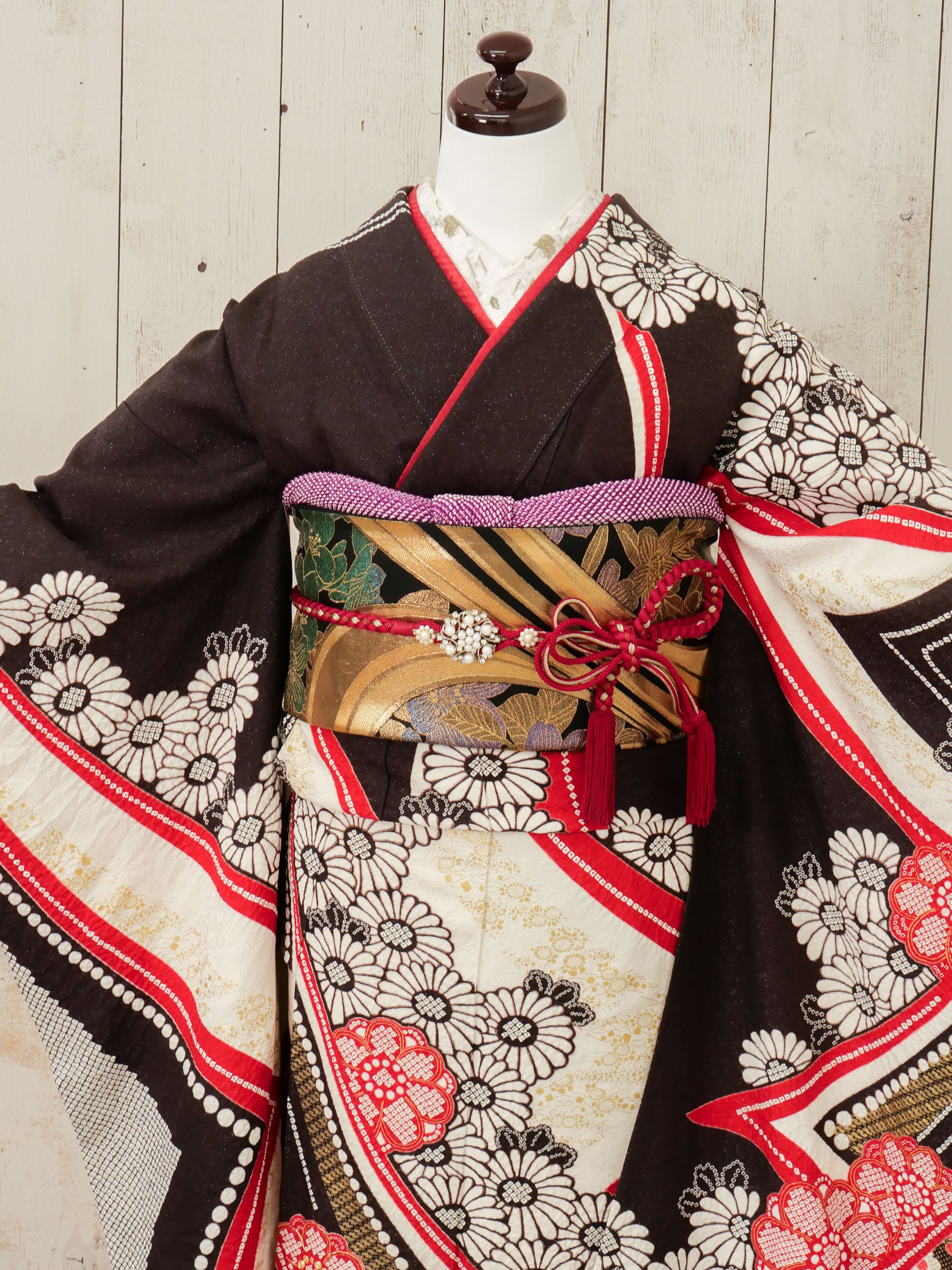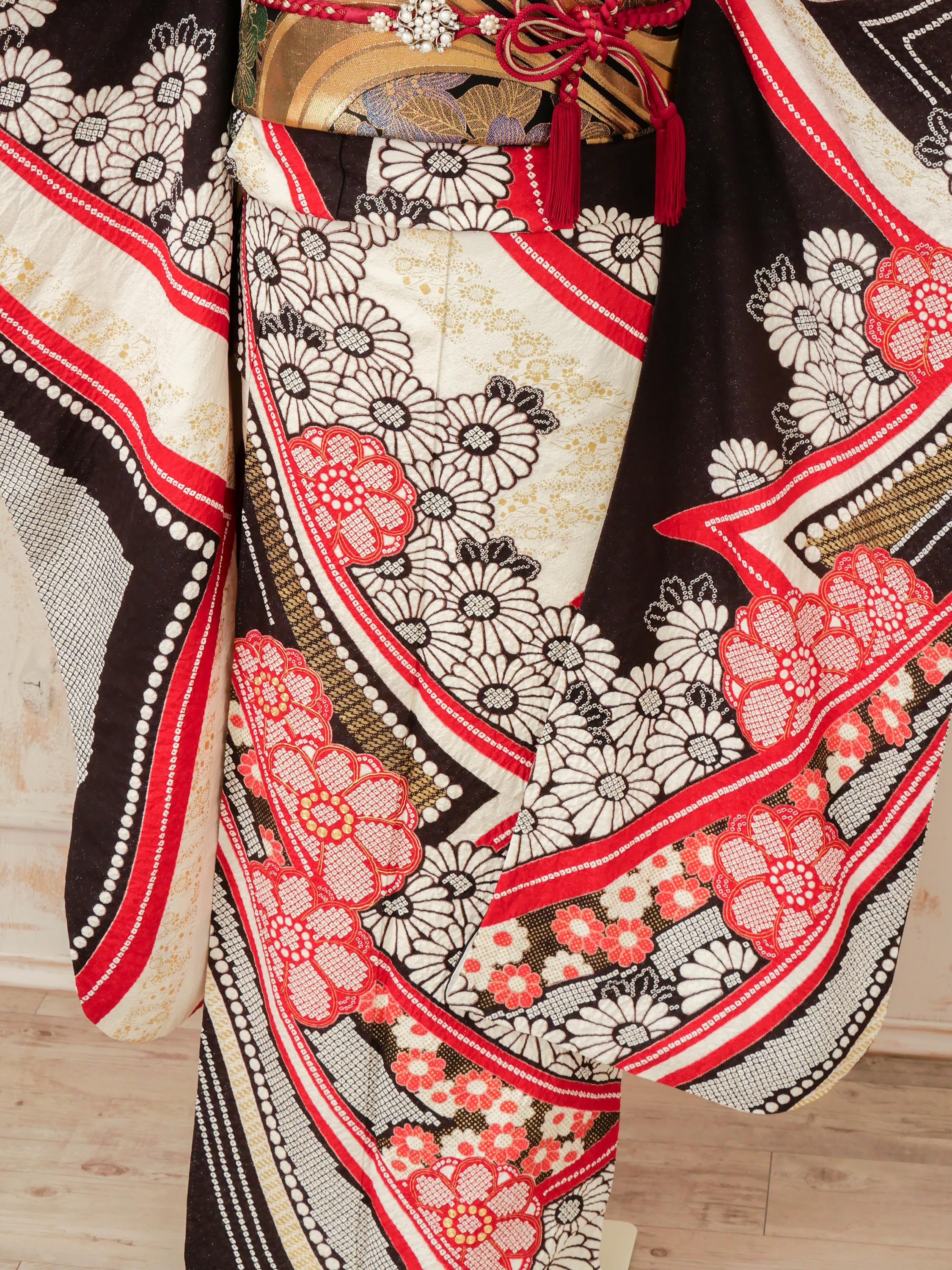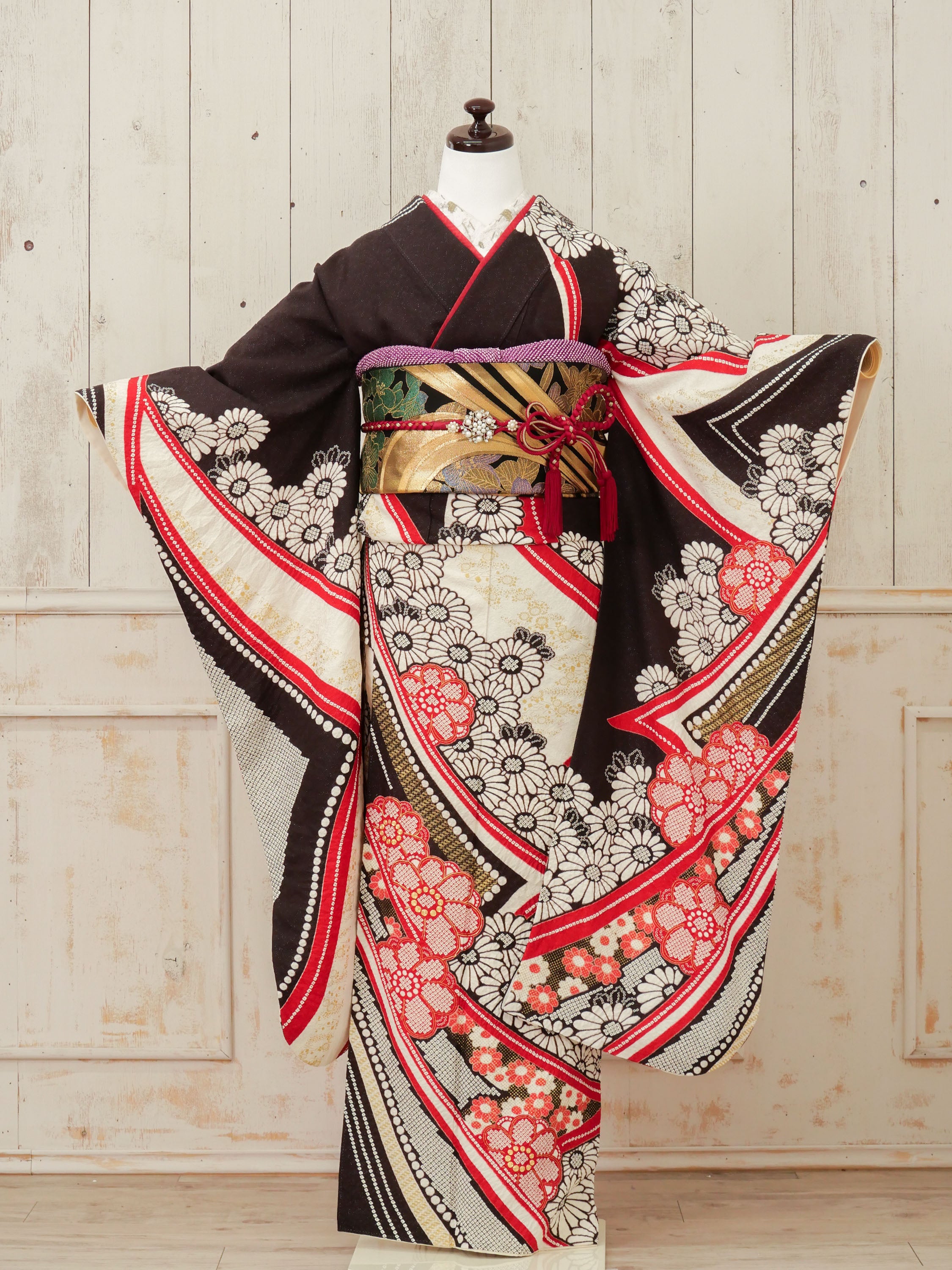 黒地に赤と金の曲線が大胆に走る、アート感ある振袖。モノトーンと和柄の融合が印象的で、モダンな美しさが際立ちます。