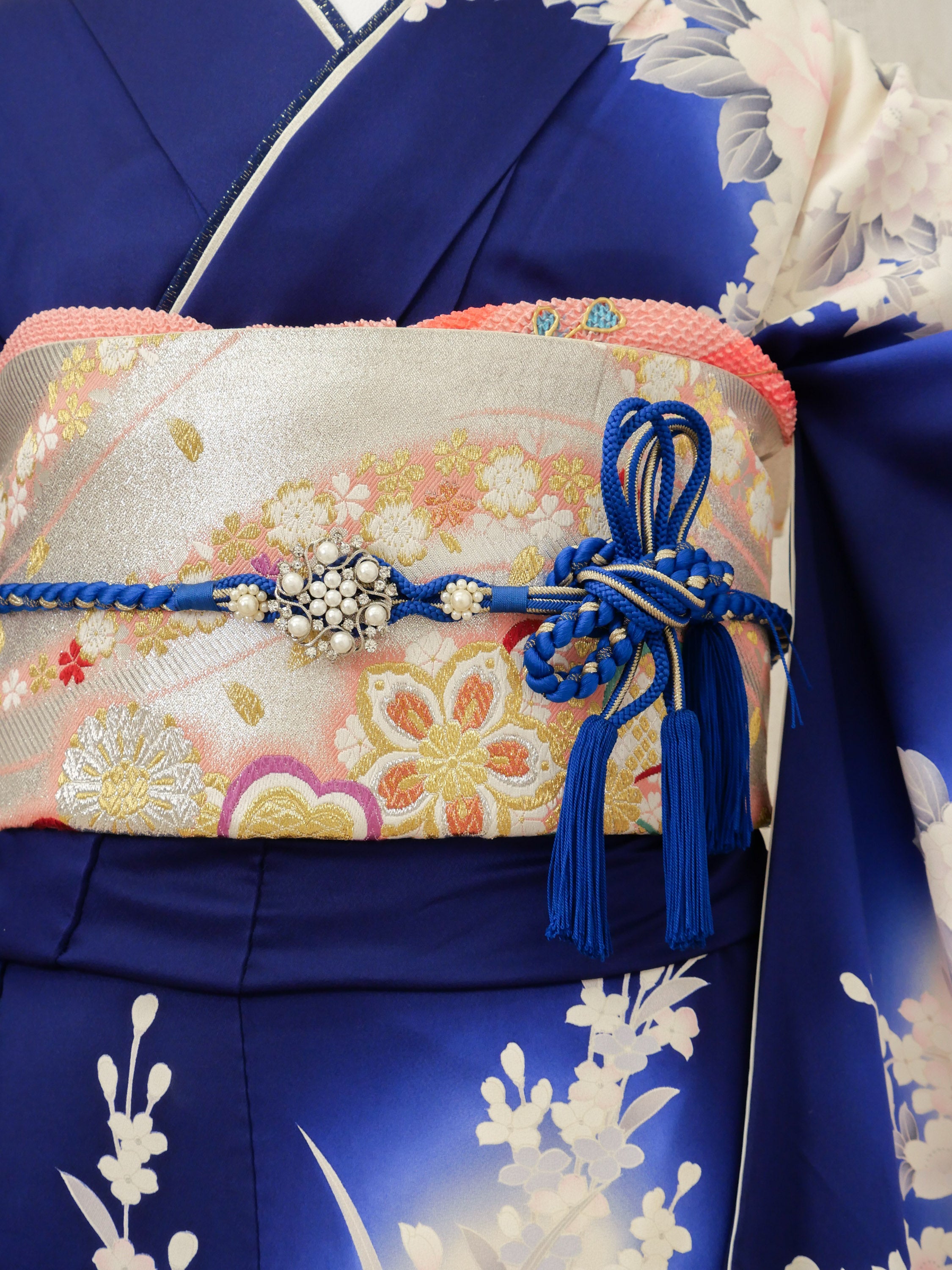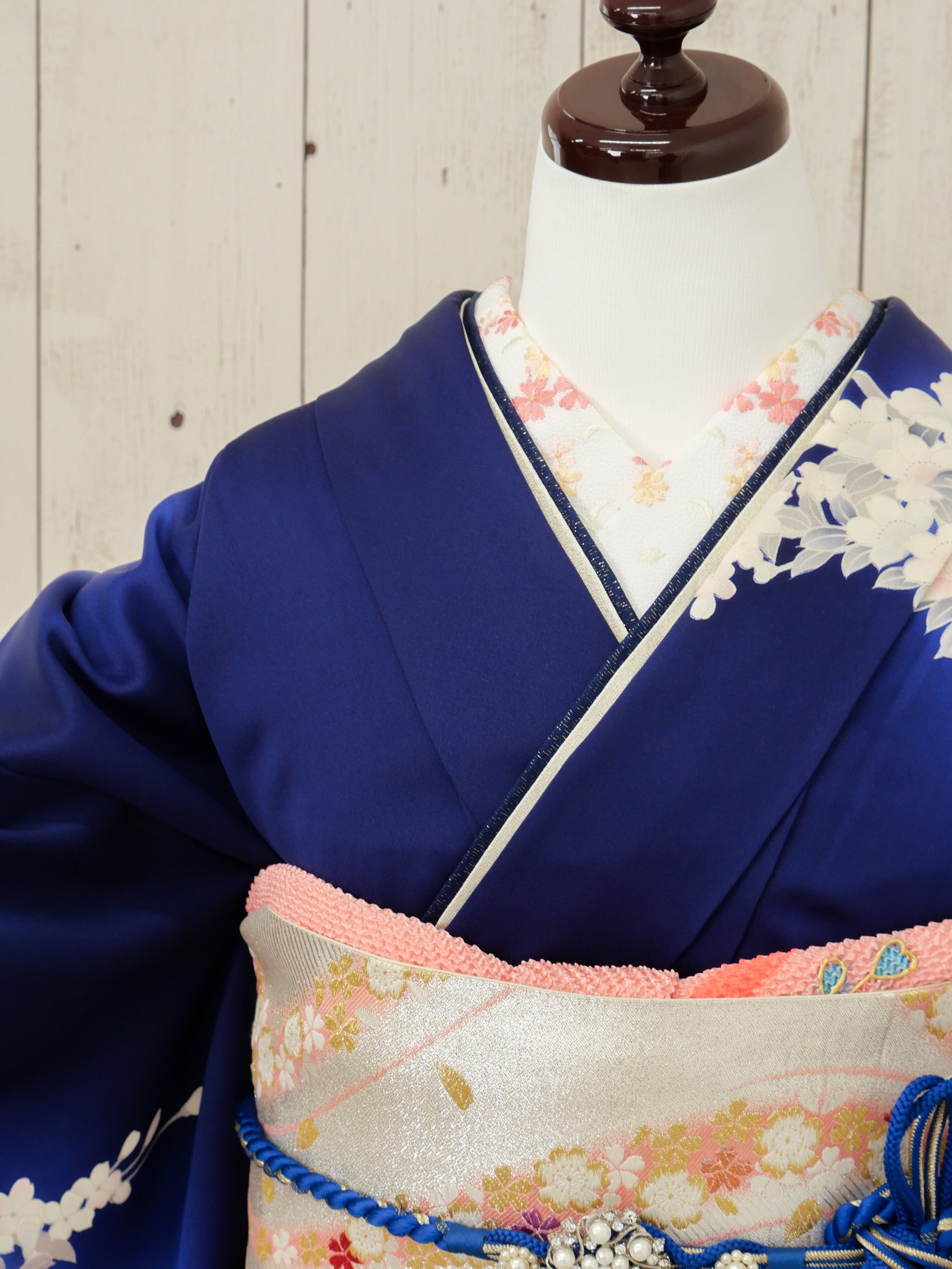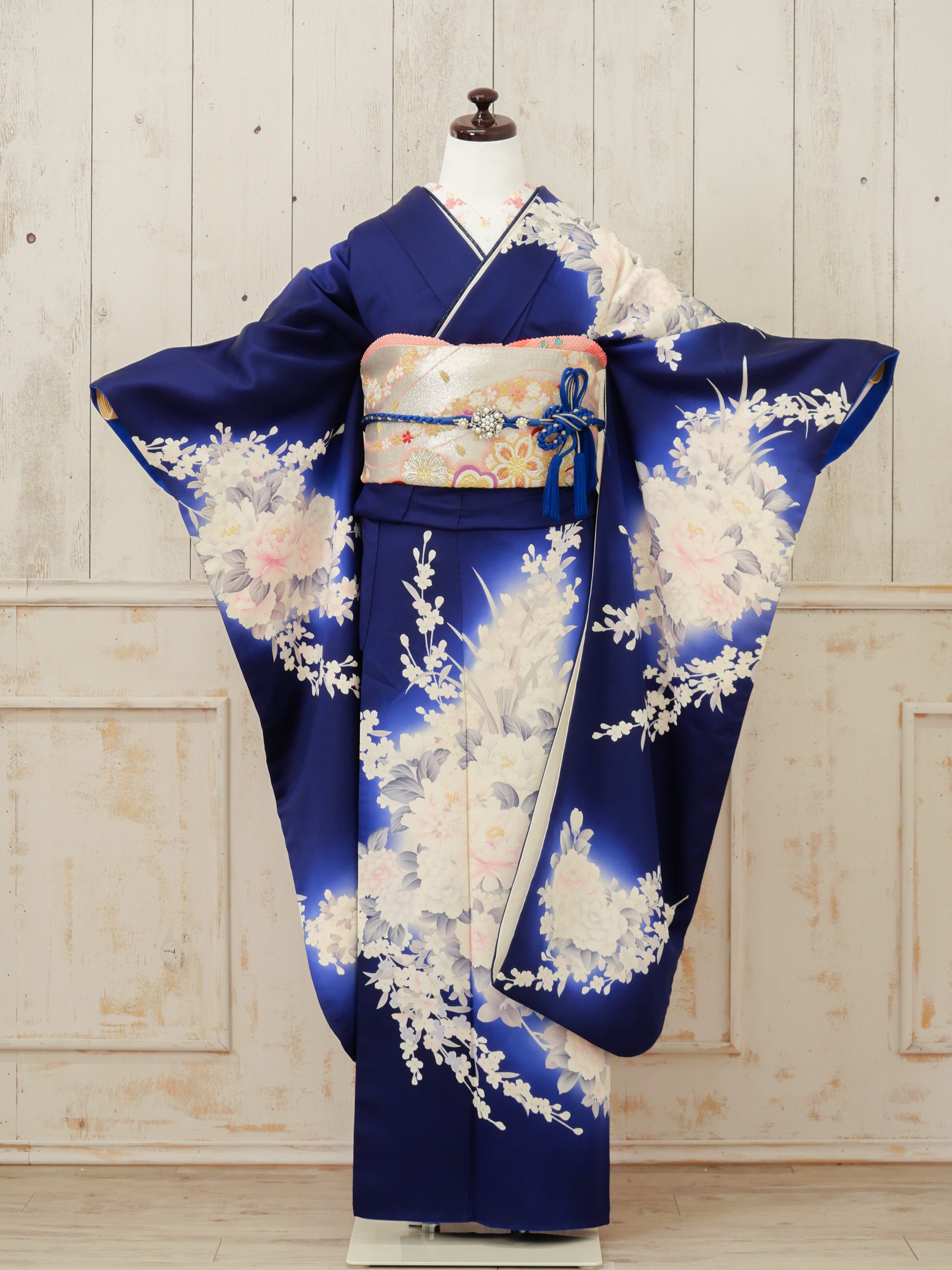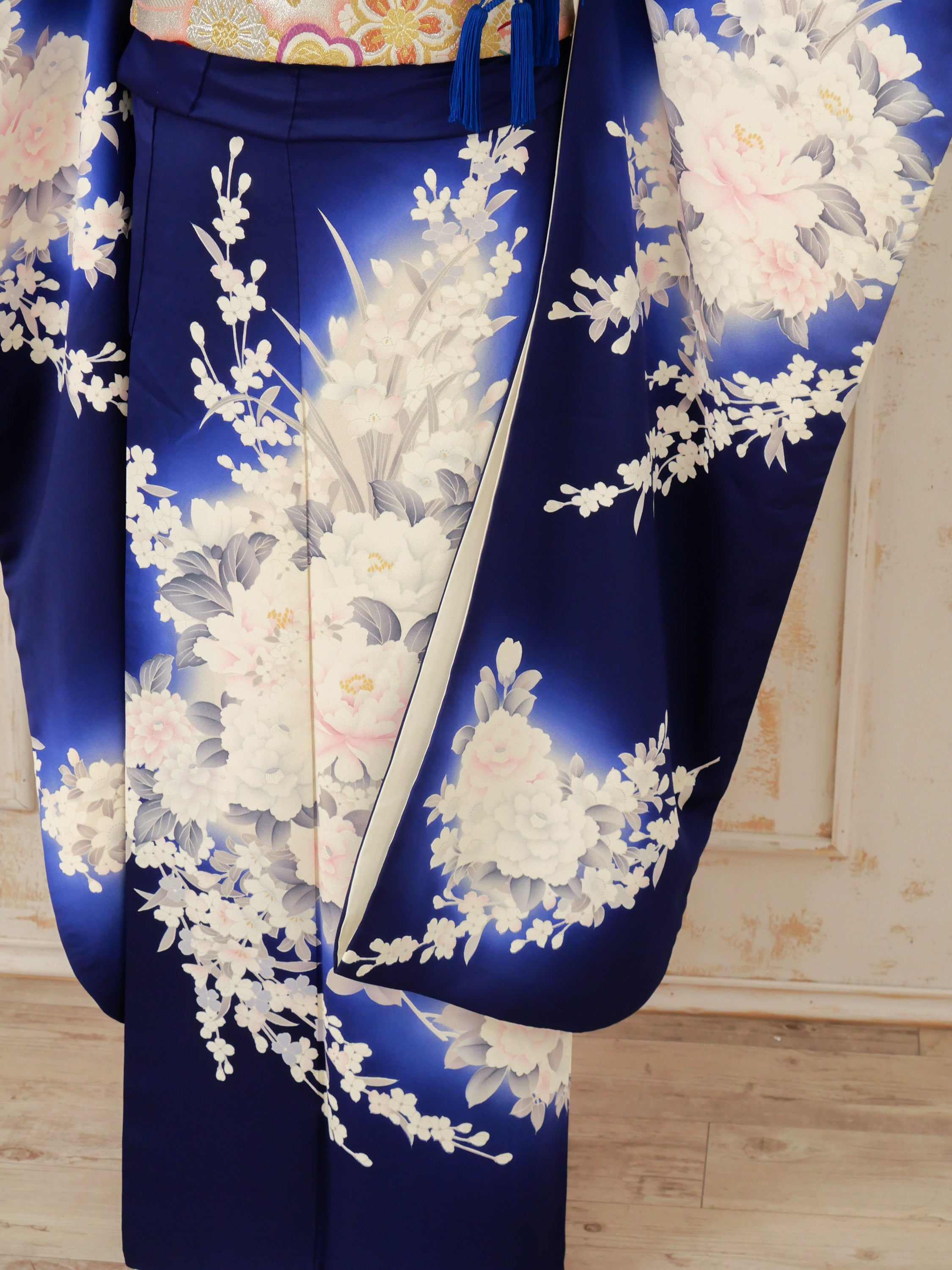 濃紺に白と薄紫の牡丹が映える、クールで優雅な印象の振袖。月夜のような幻想的なグラデーションが魅力です。