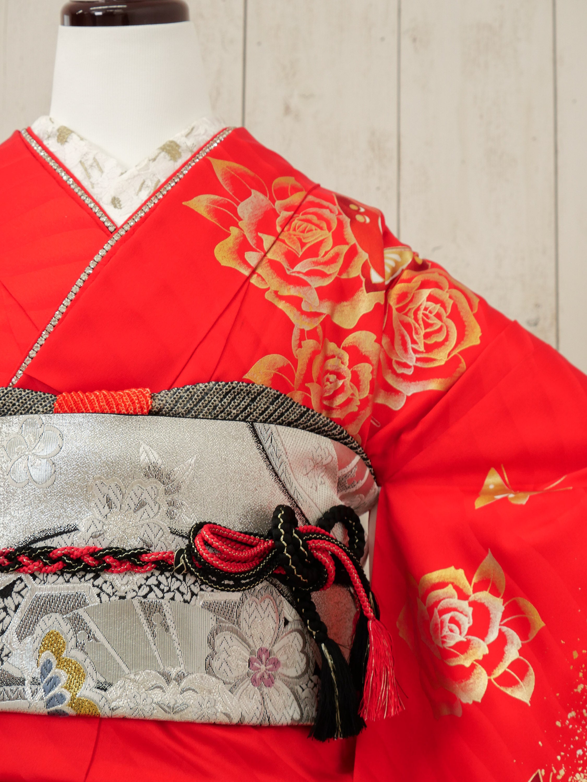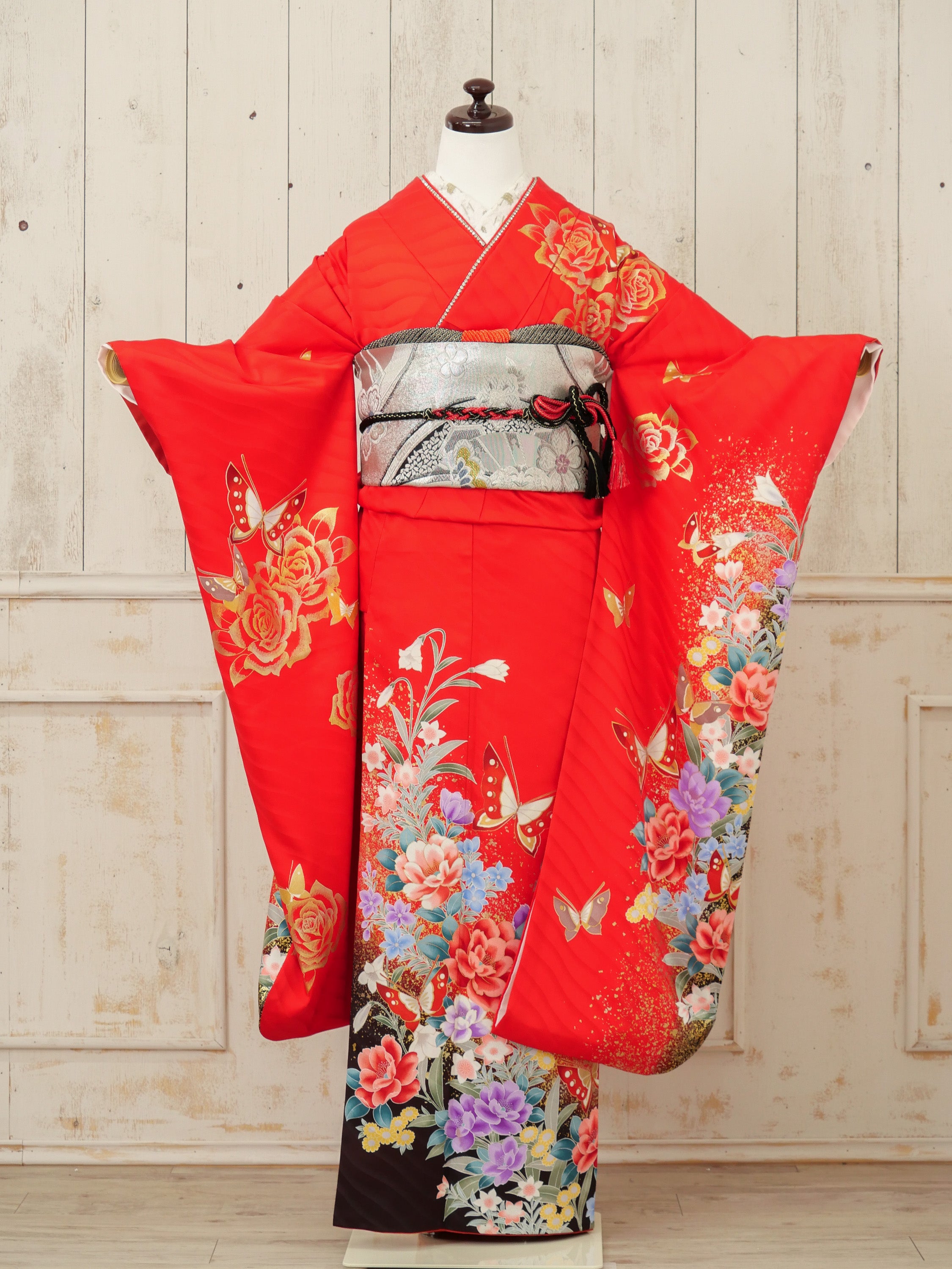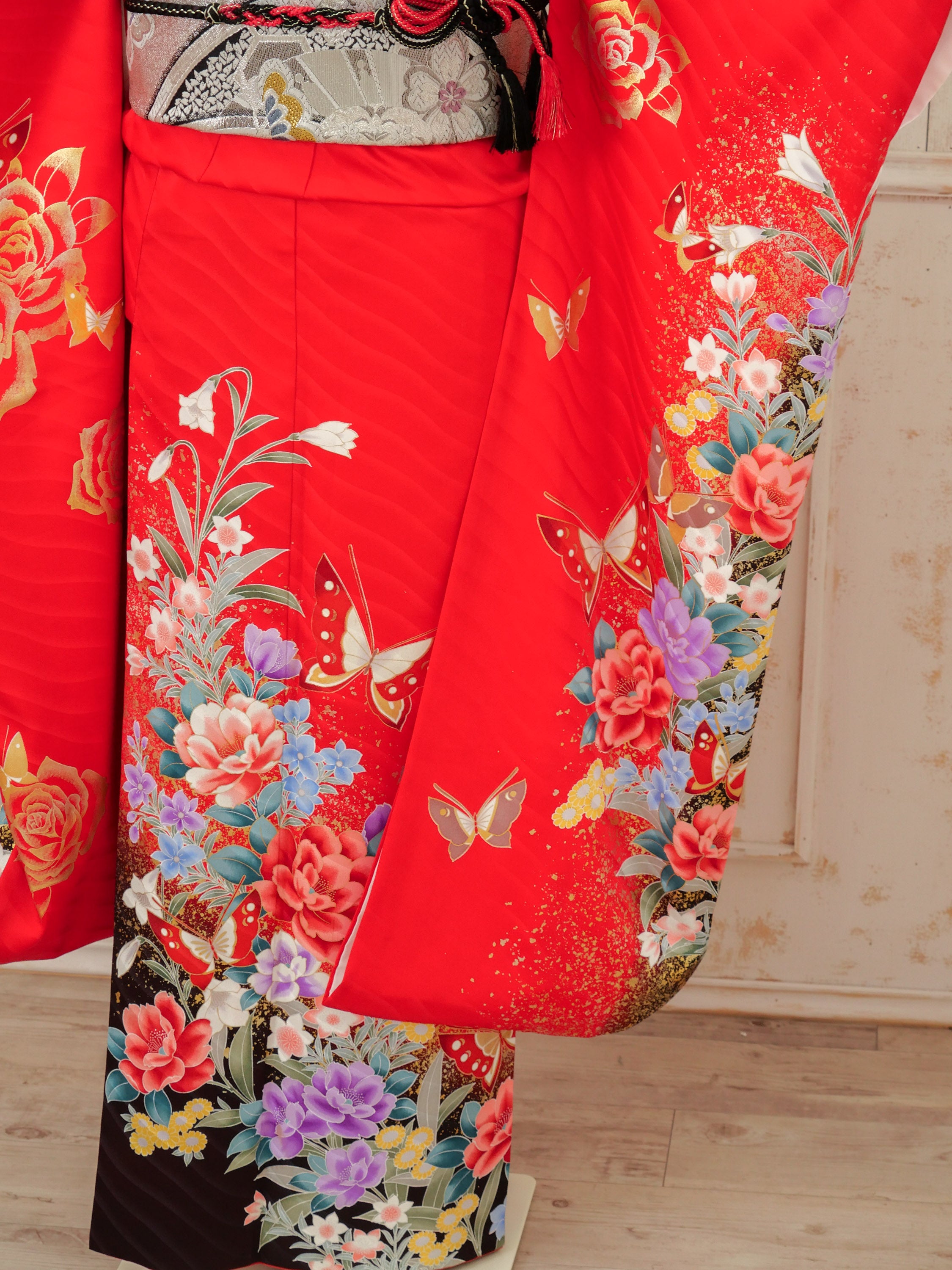 鮮やかな朱赤に舞う蝶とバラの花が印象的な振袖。裾の黒とのコントラストで華やかさと大人っぽさを演出します