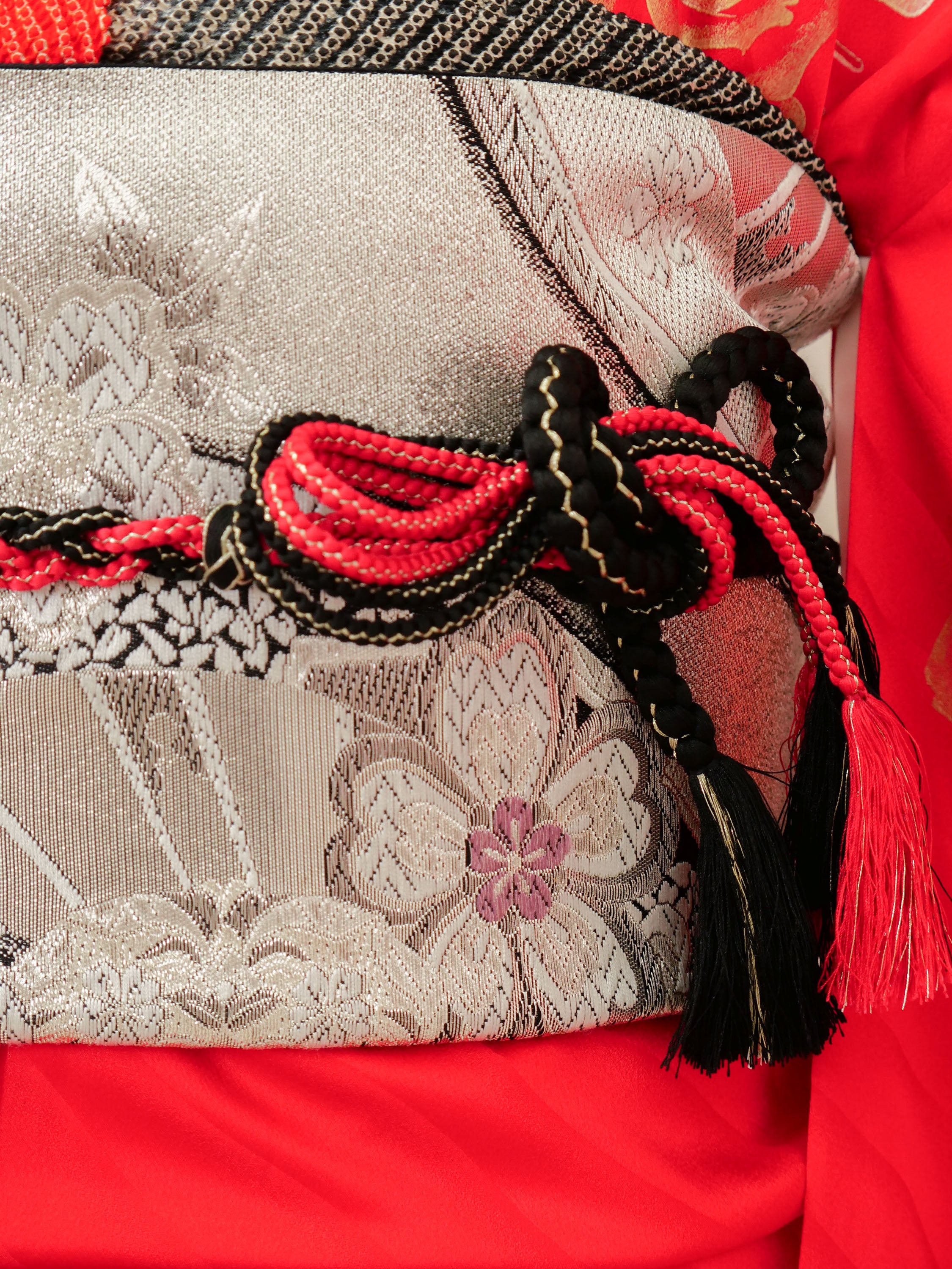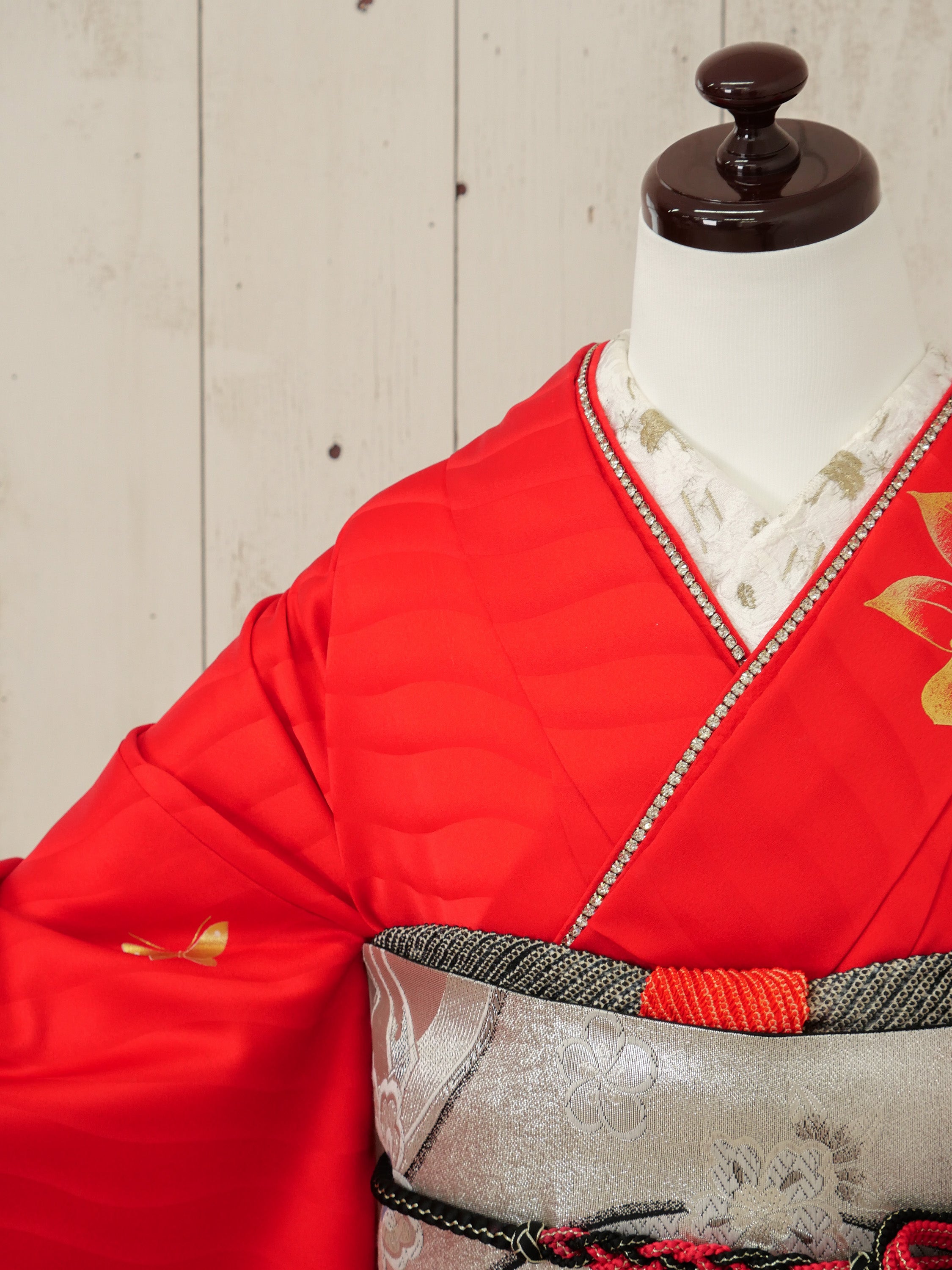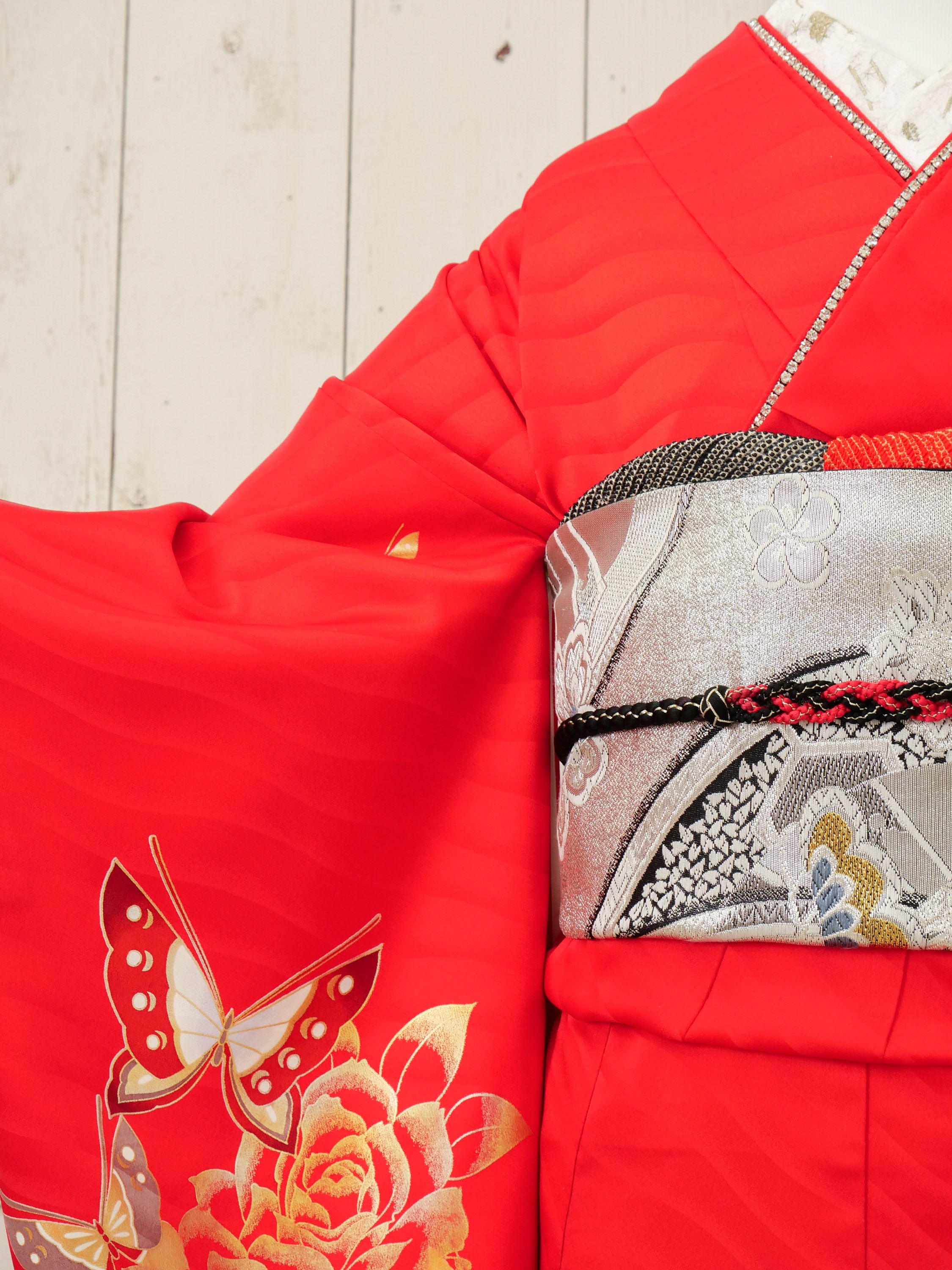 鮮やかな朱赤に舞う蝶とバラの花が印象的な振袖。裾の黒とのコントラストで華やかさと大人っぽさを演出します