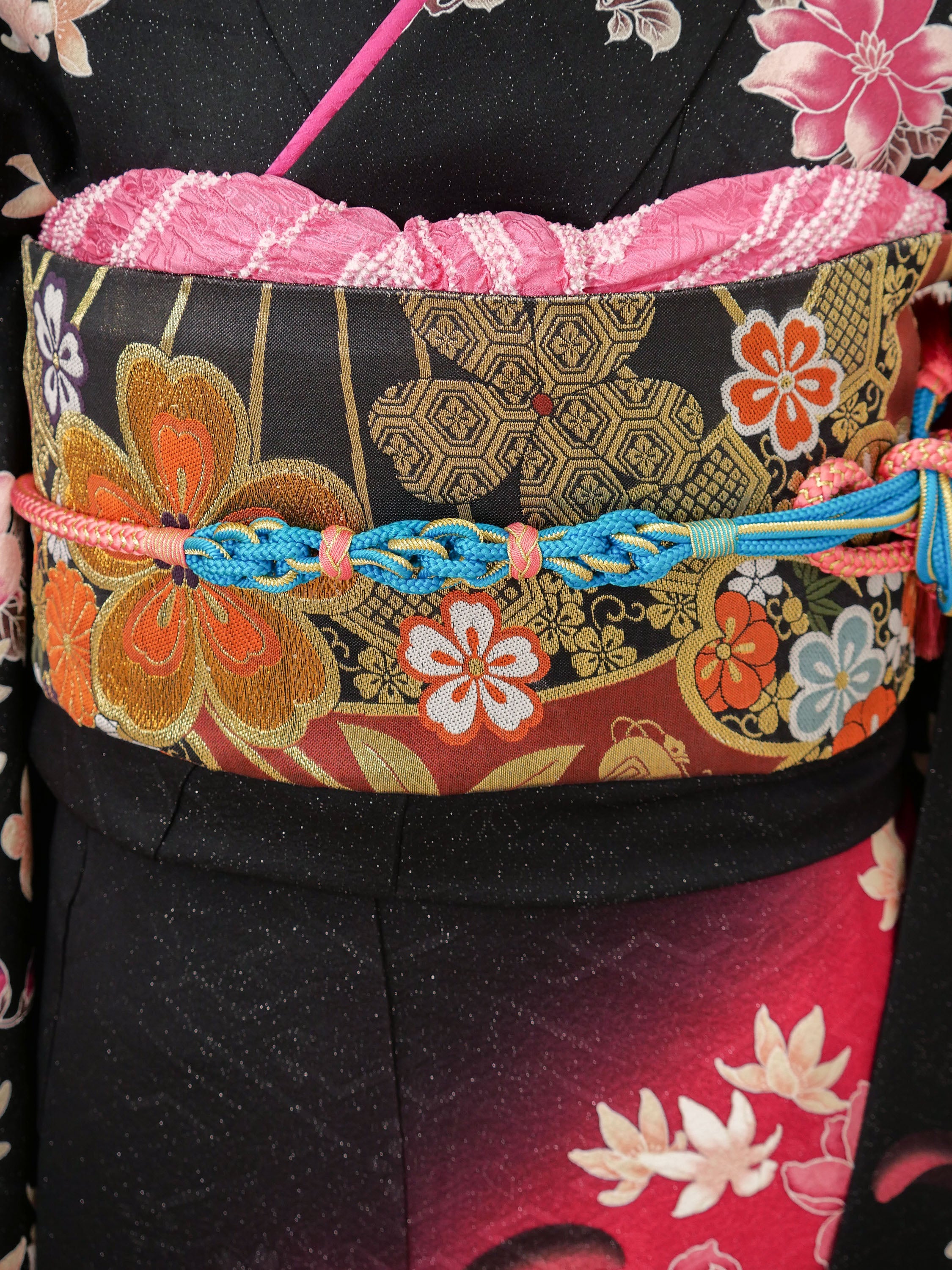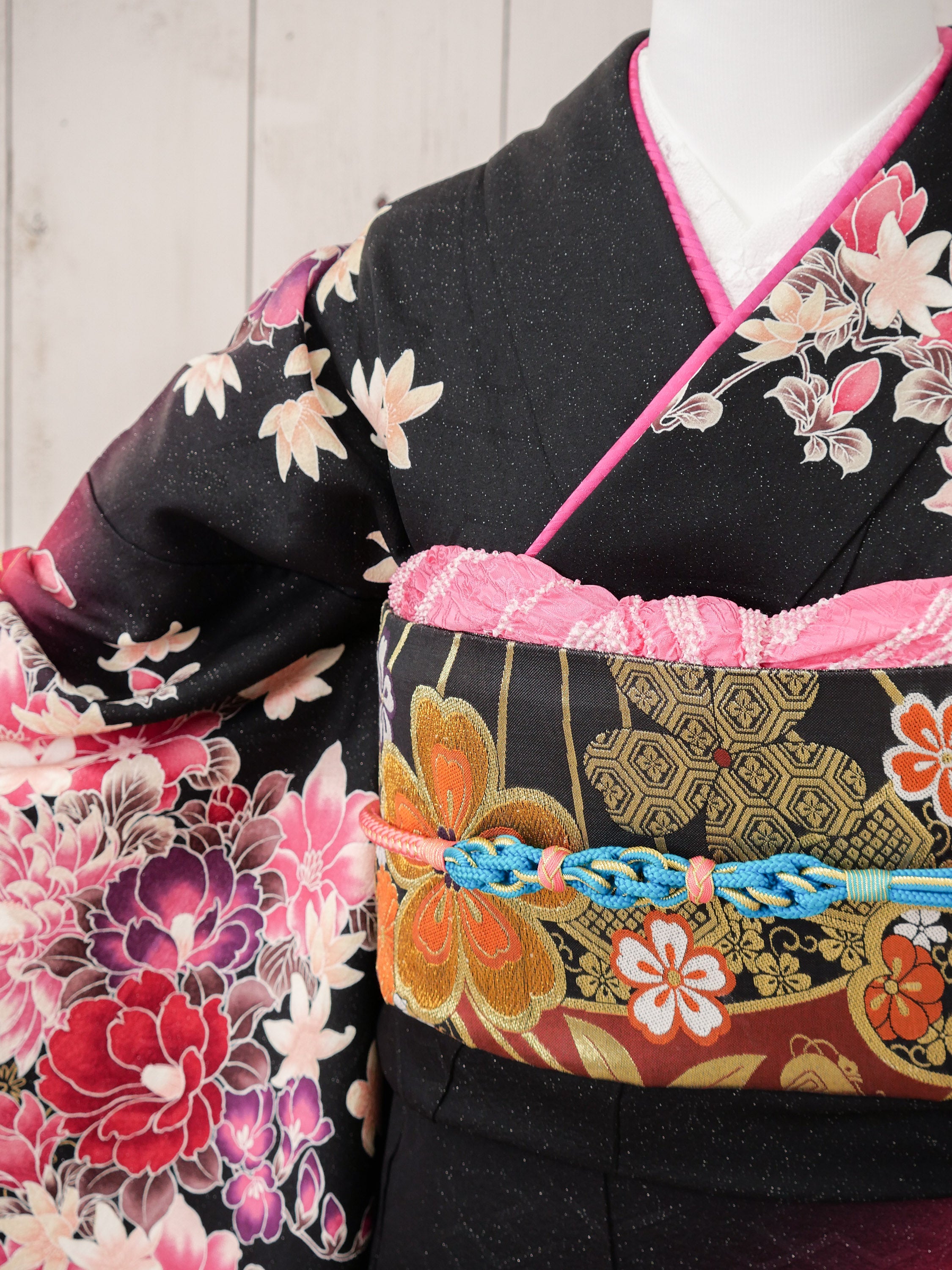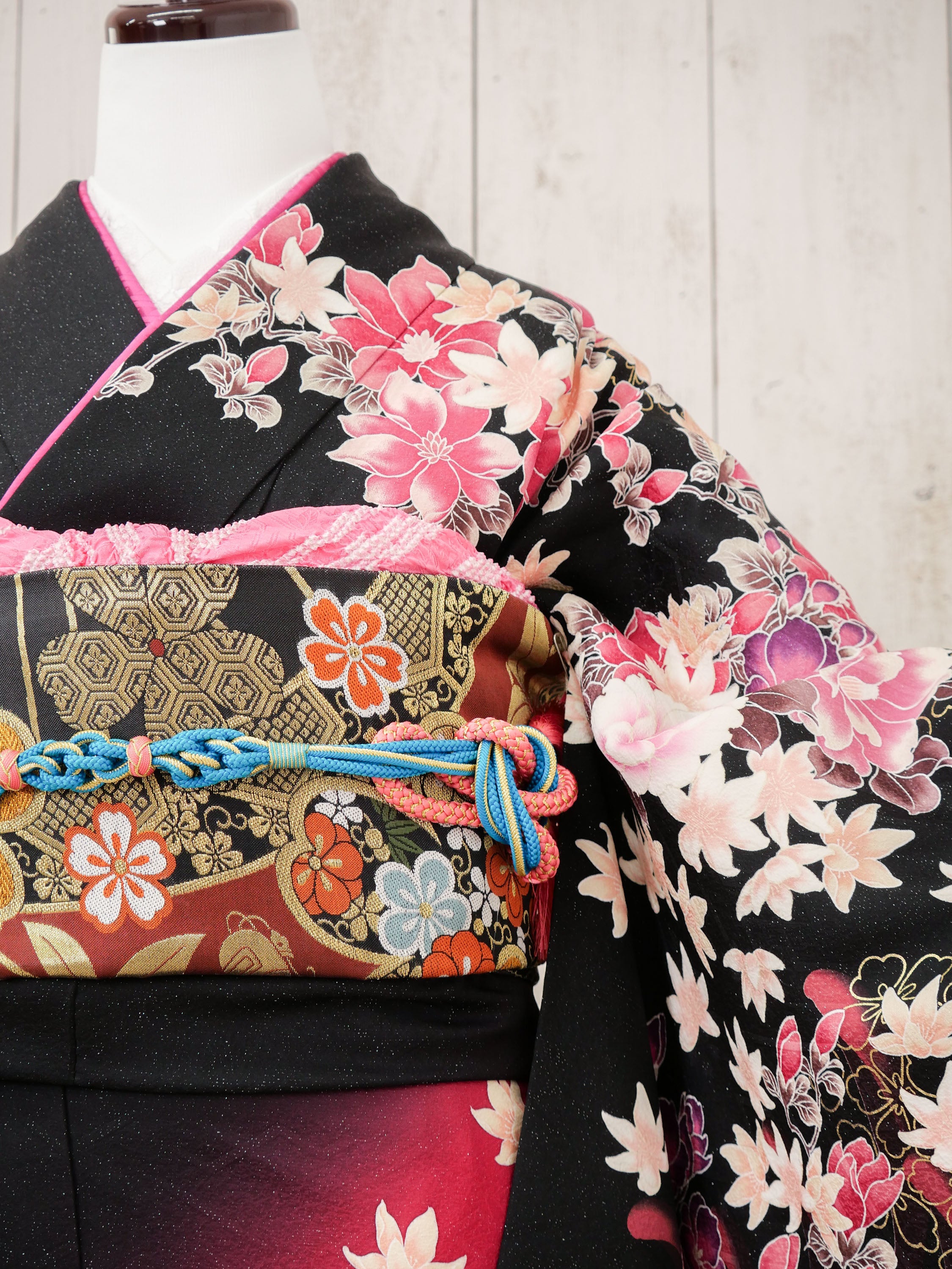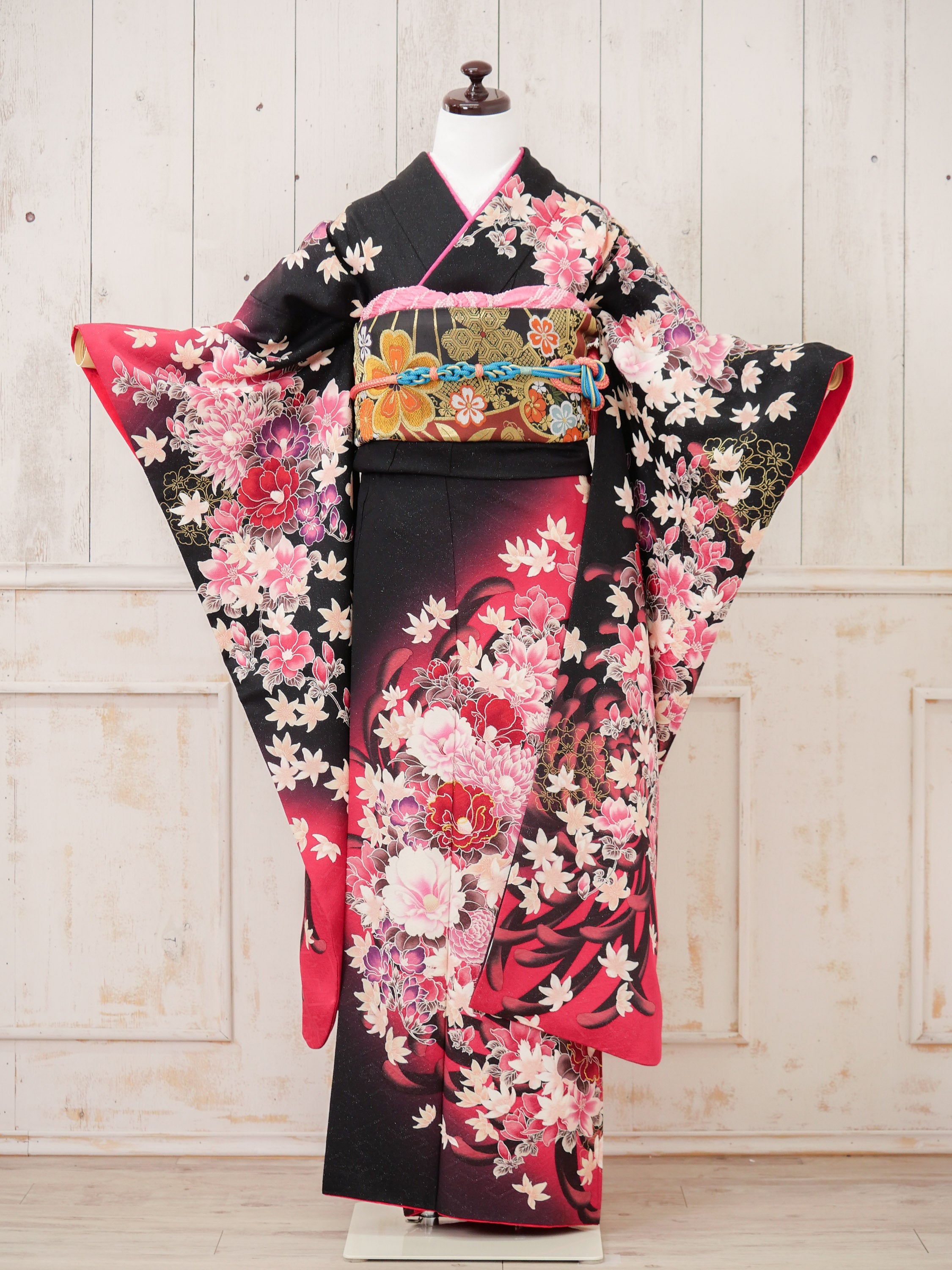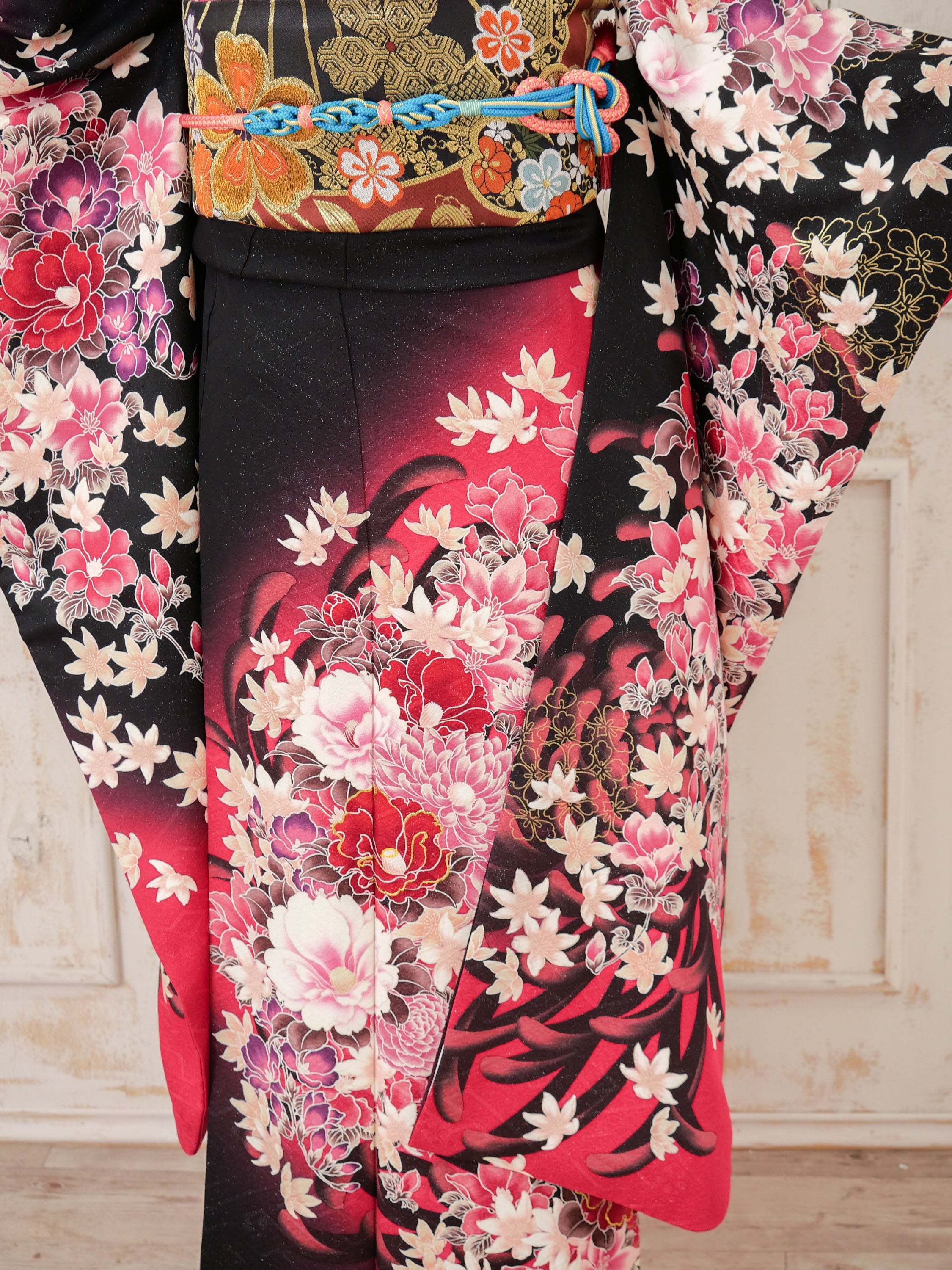 深みある黒地に赤とピンクの花々が舞う、艶やかで妖艶な振袖。裾にかけて赤へと移ろうグラデーションが情熱的で、力強い華やかさを表現します。帯には金彩を用いた重厚感のあるデザインを合わせ、気品と豪華さを同時に演出。大人の女性らしい美しさと華やぎを兼ね備え、記念日の装いをより格調高く彩ります。