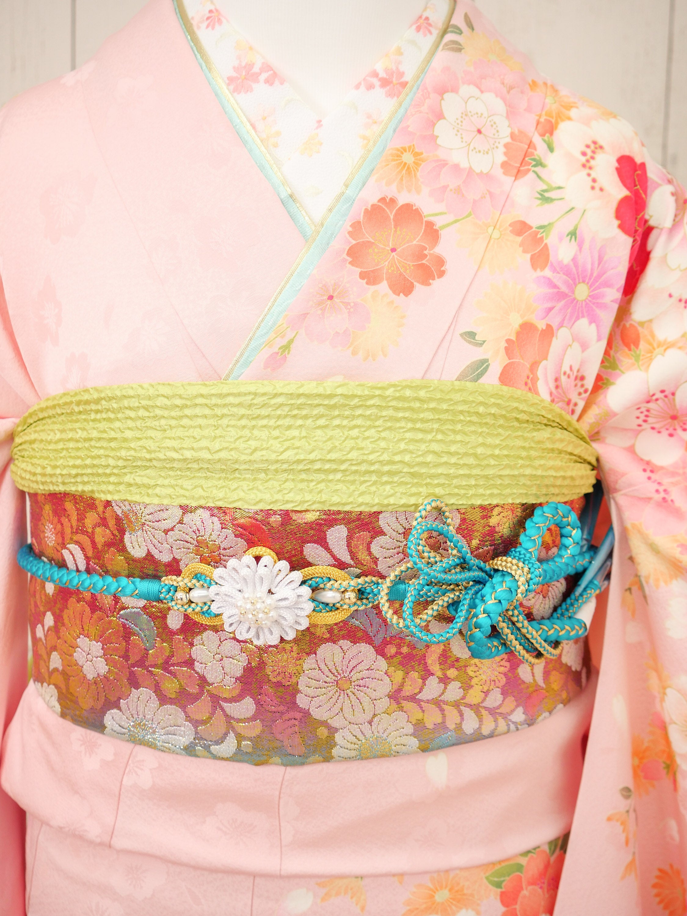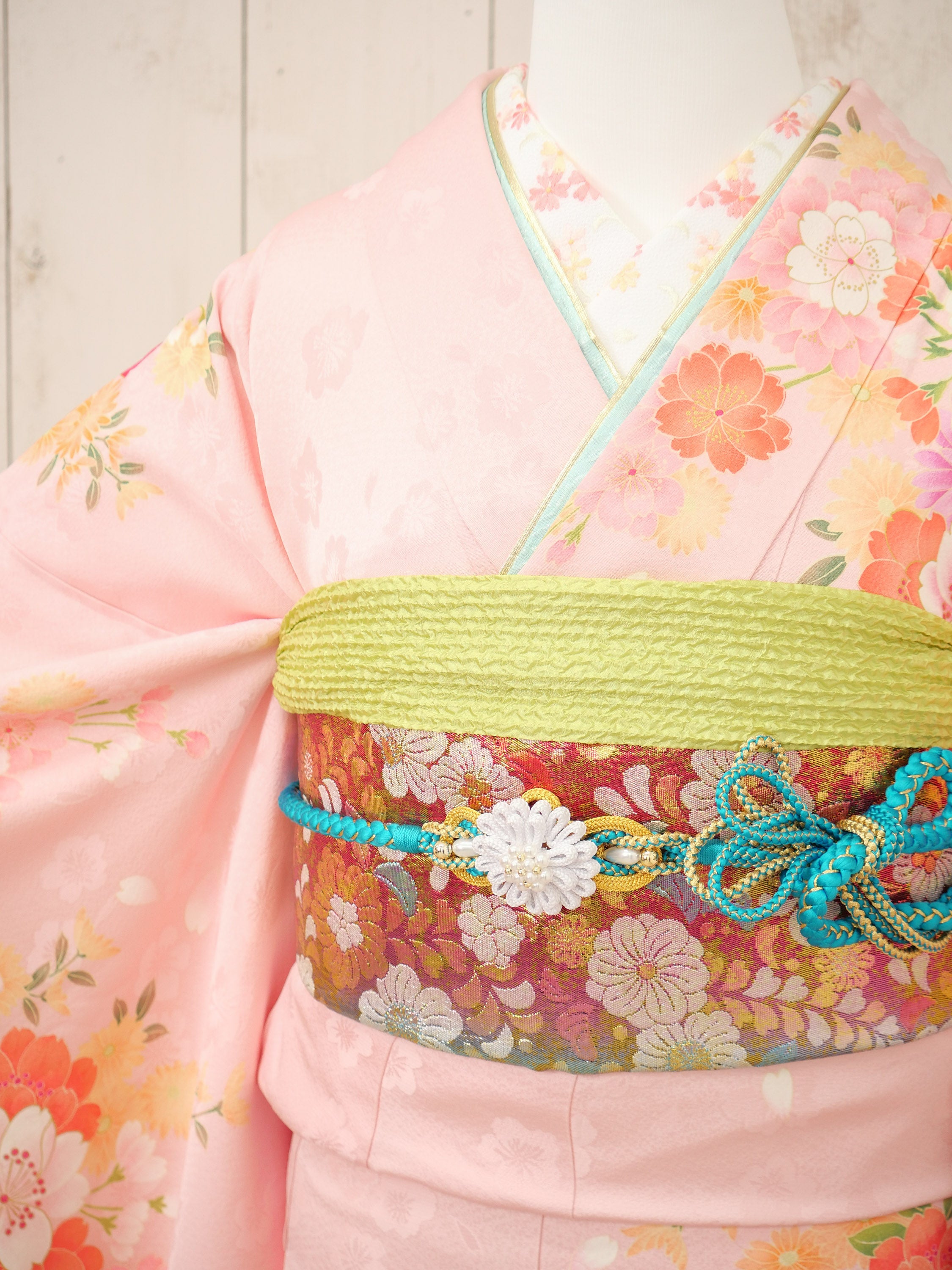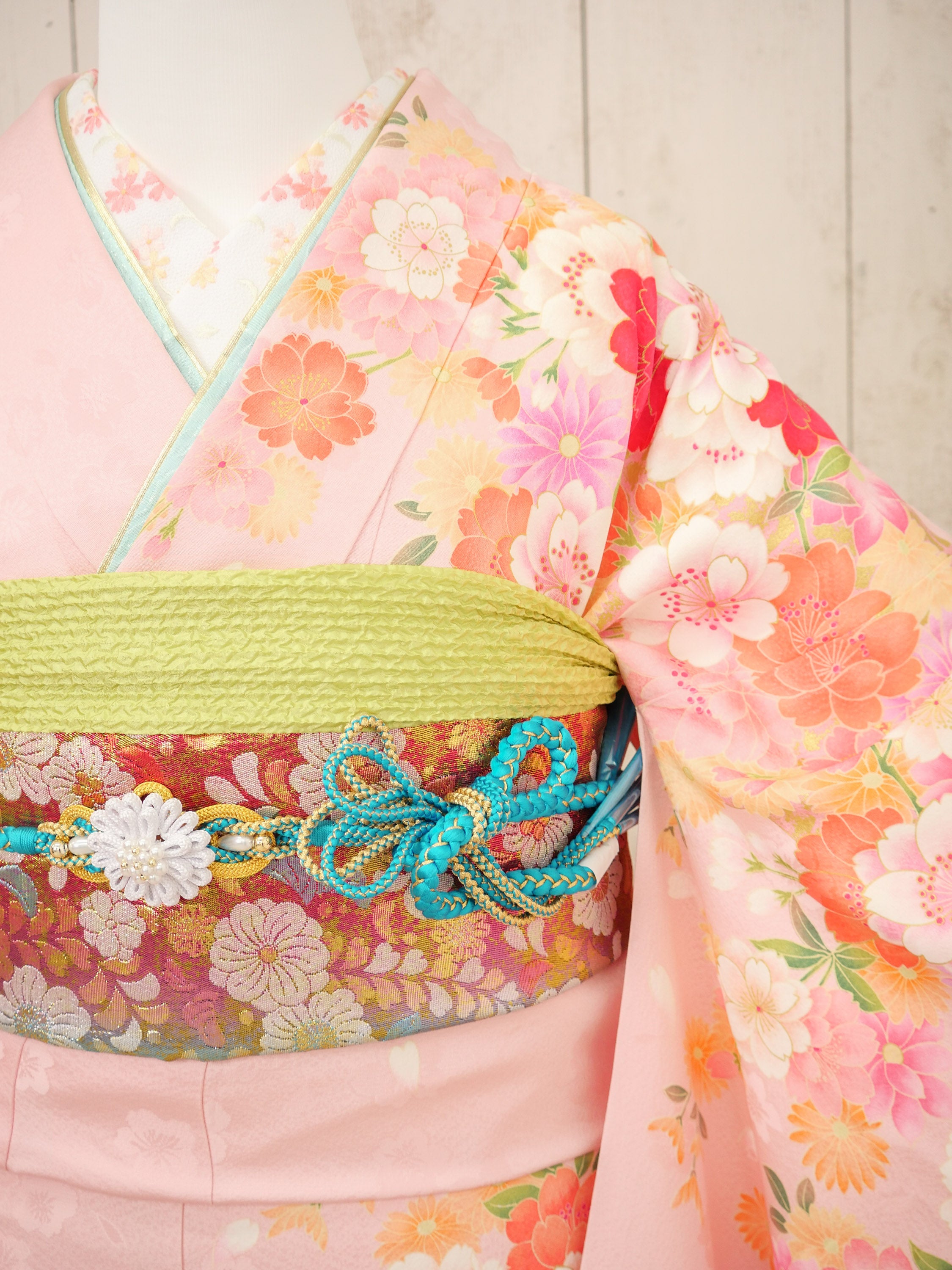 やさしいピンク地に満開の桜が舞う、春の陽だまりのような愛らしい振袖。やわらかな色合いと繊細な花模様が、ふんわりとした印象を与えます。ナチュラルで上品なスタイルを好む方におすすめです。