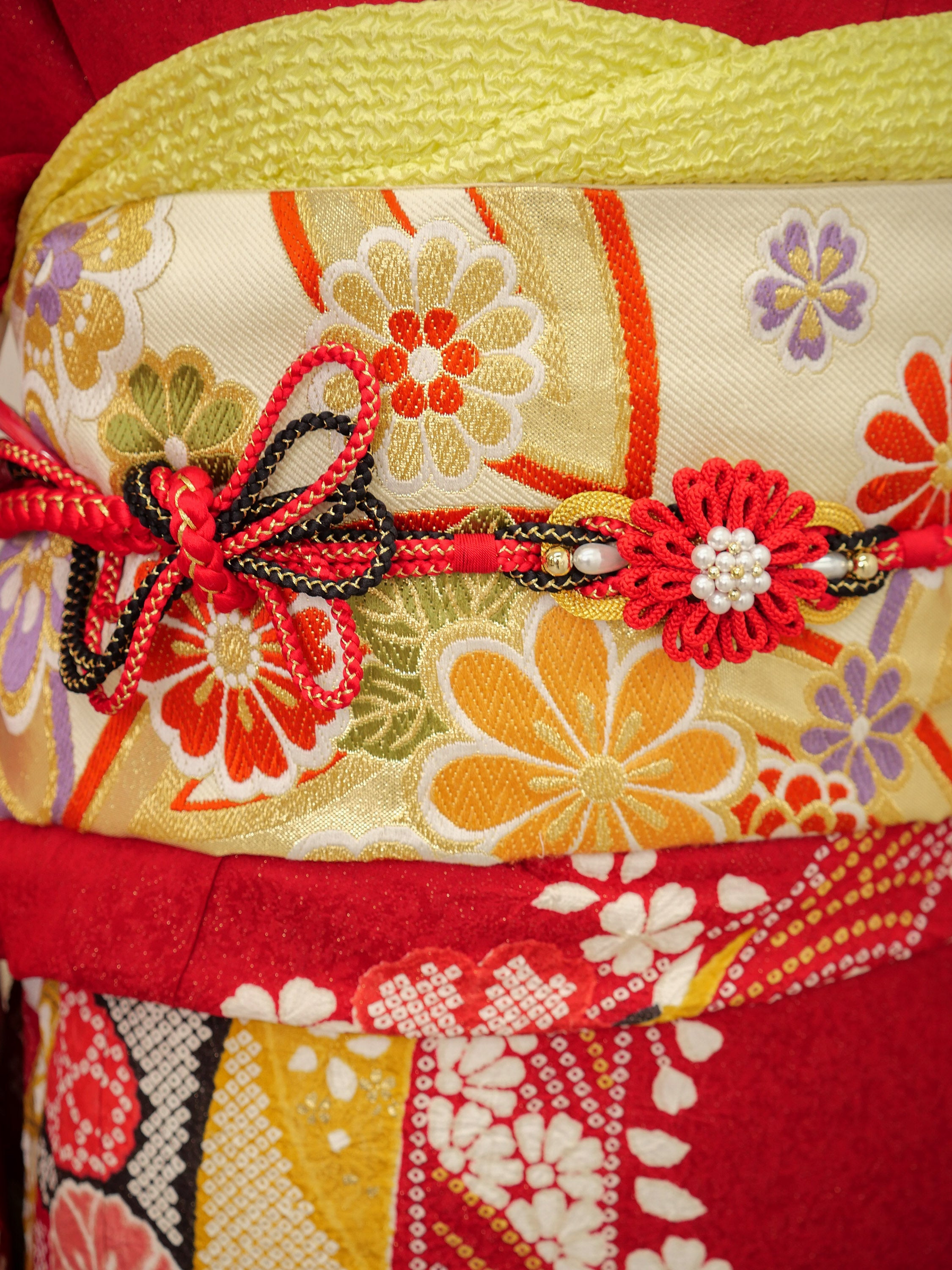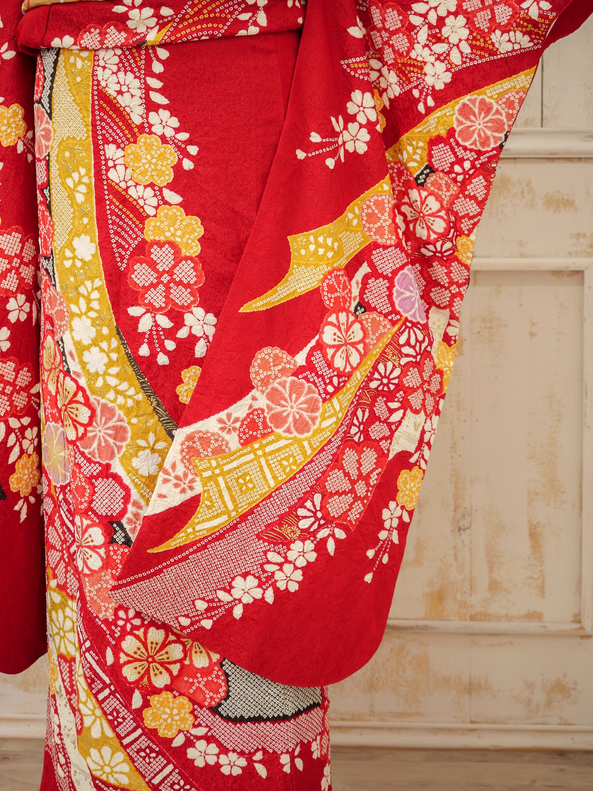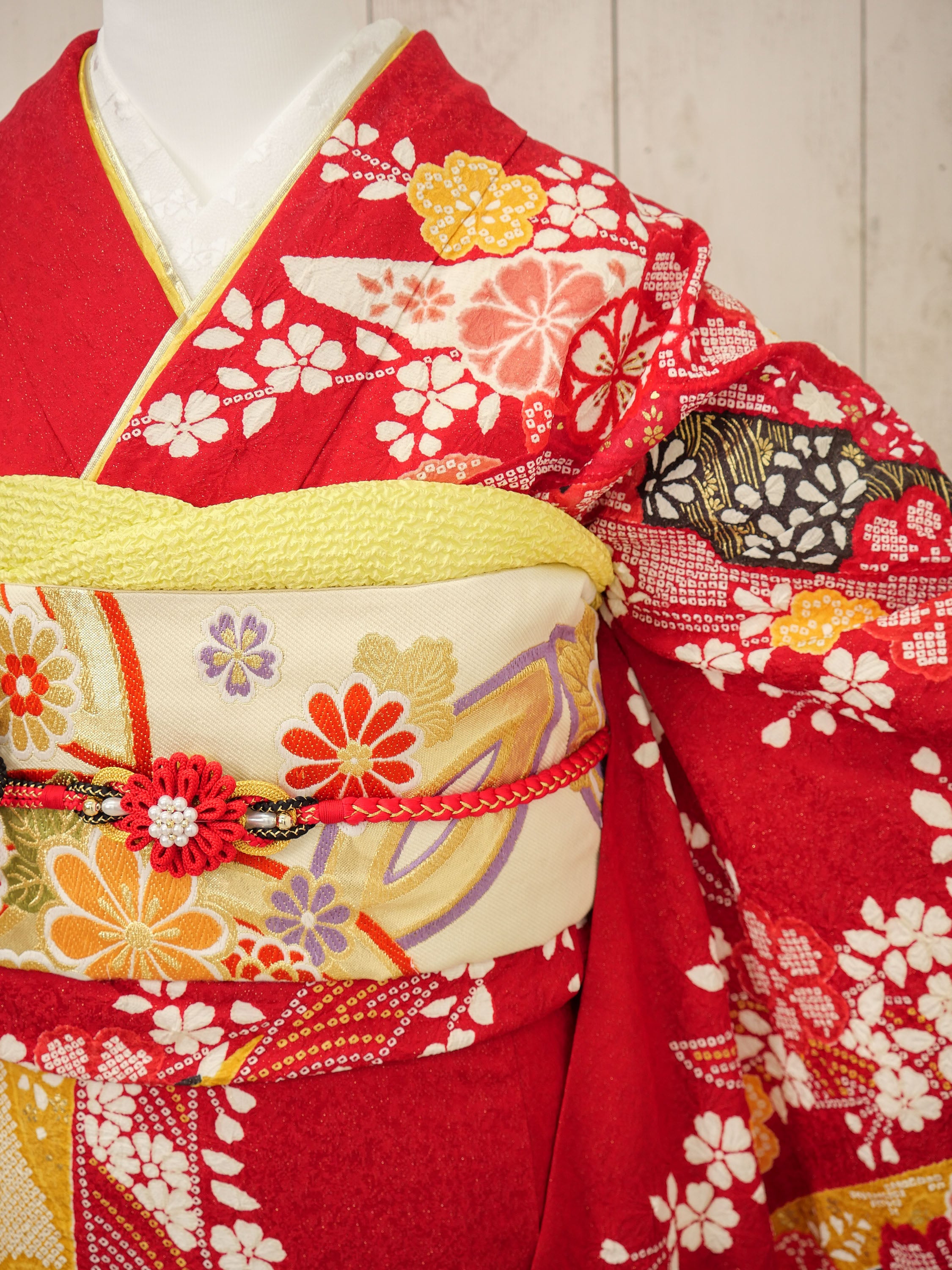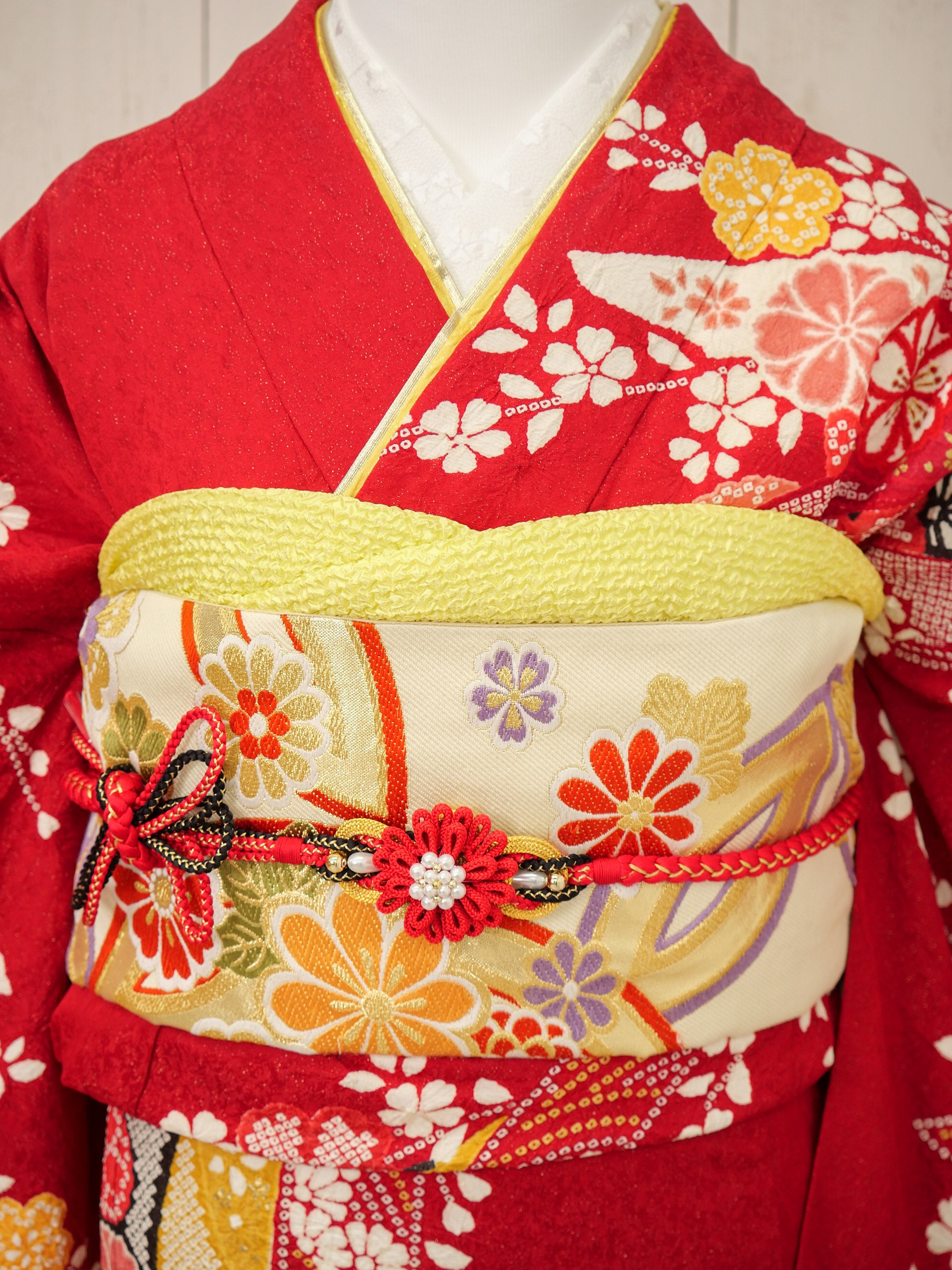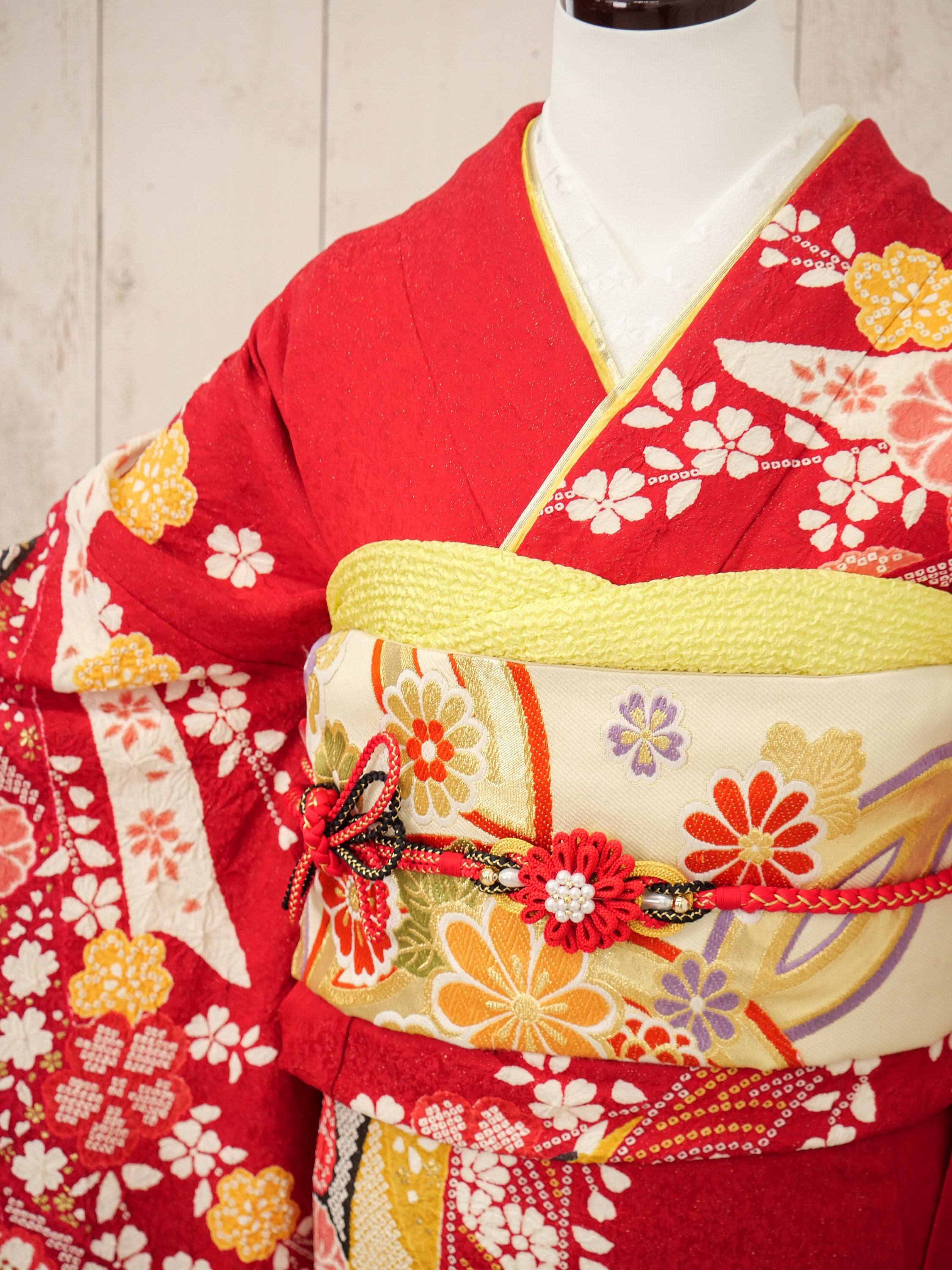 艶やかな赤地に咲き誇る梅や桜の古典柄が華やかで印象的。伝統美あふれる意匠に、黄色の帯がアクセントとなり、堂々とした美しさを際立たせます。成人式にもぴったり。
