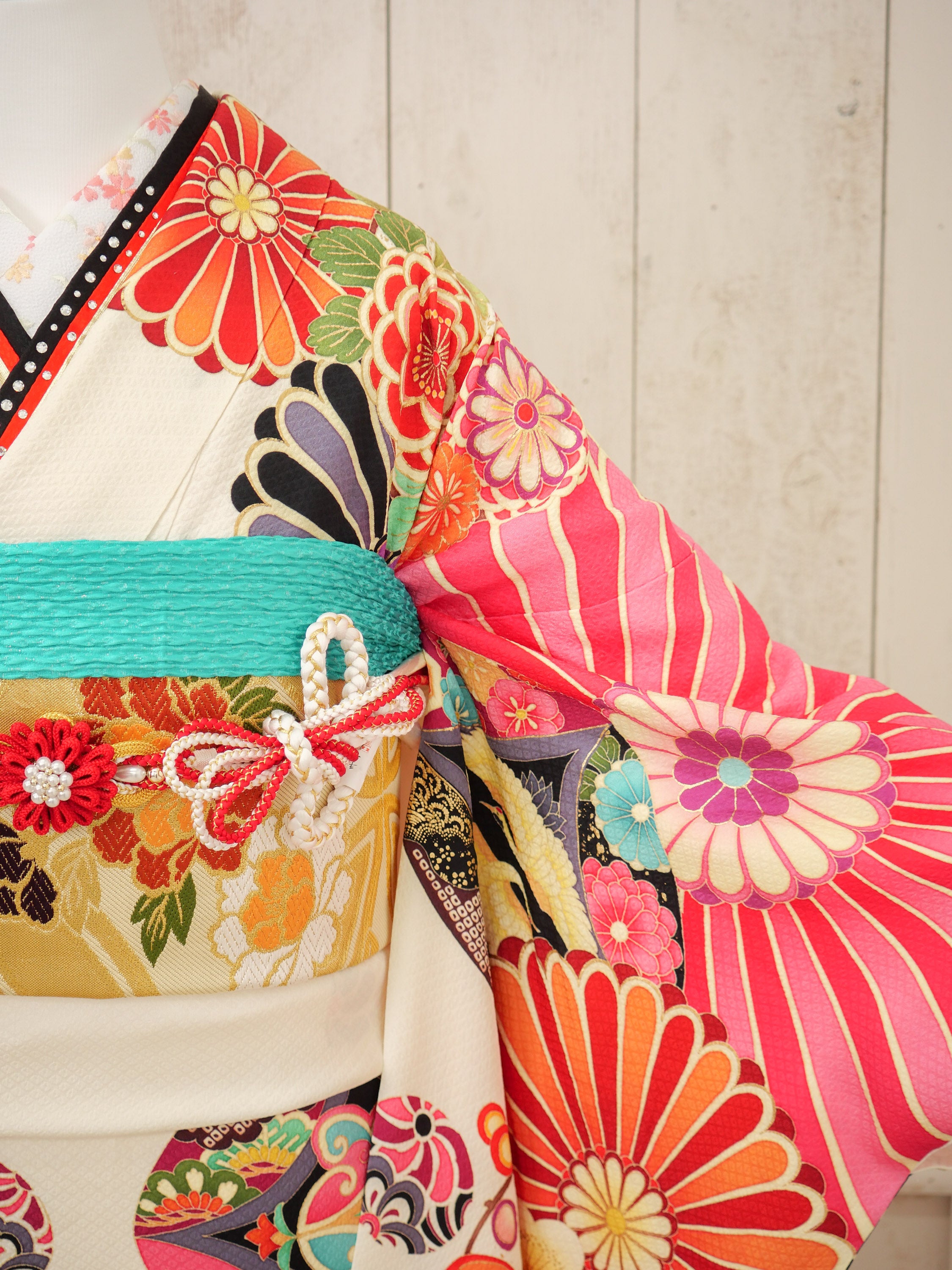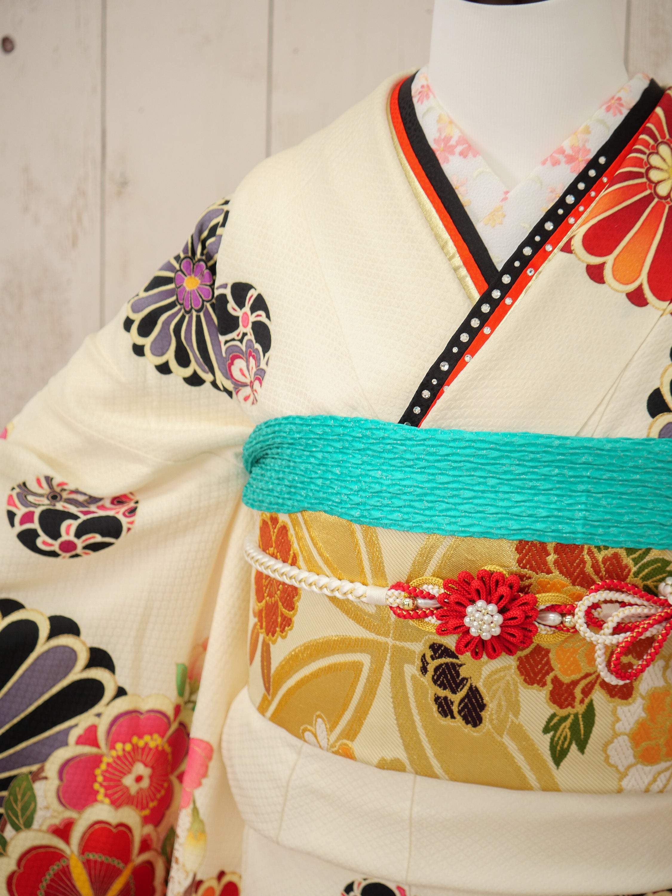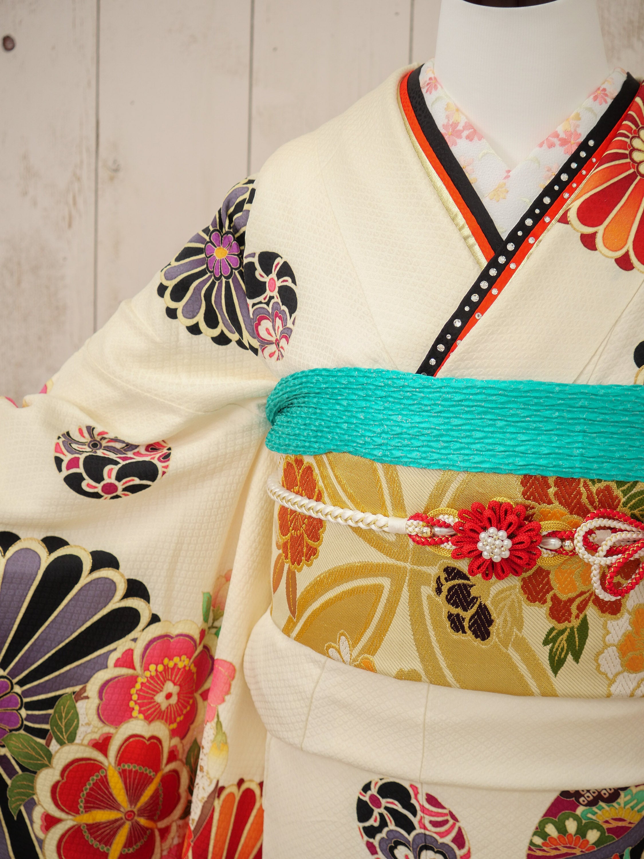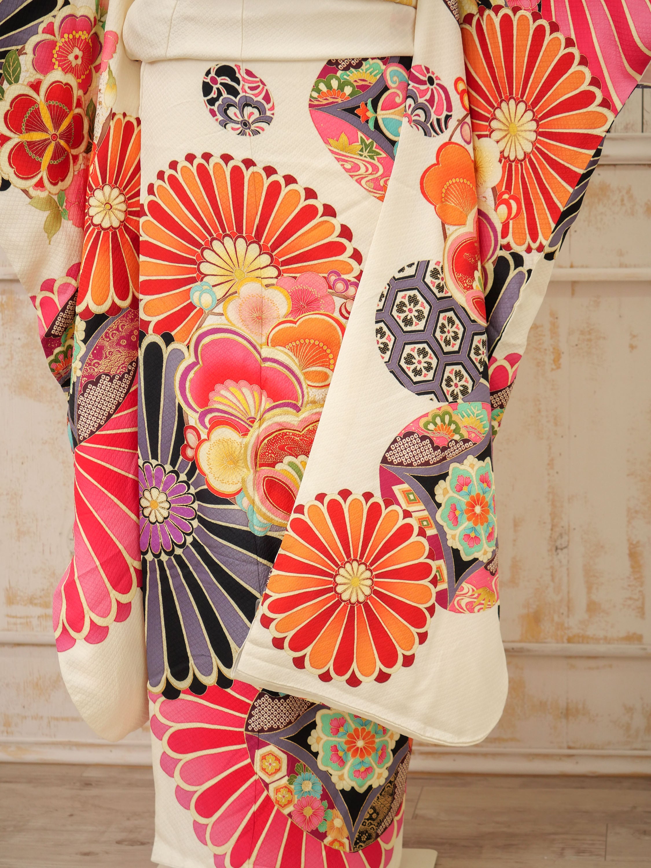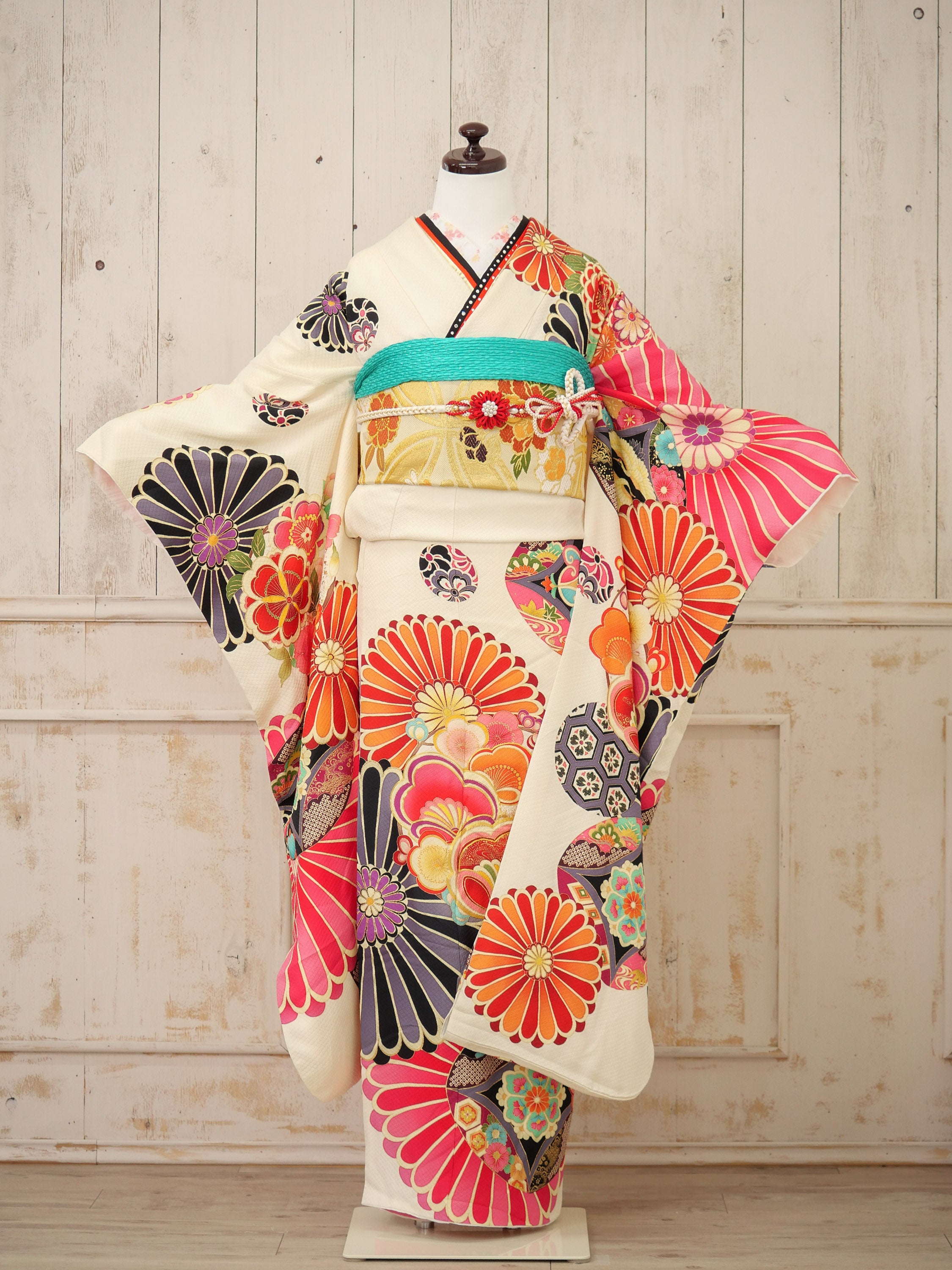 オフホワイトの地に、レトロな扇と花々が彩りを添える個性派振袖。ビビッドな赤や黒の大きな柄が印象的で、モダンで力強いスタイルを楽しめる大胆デザイン。