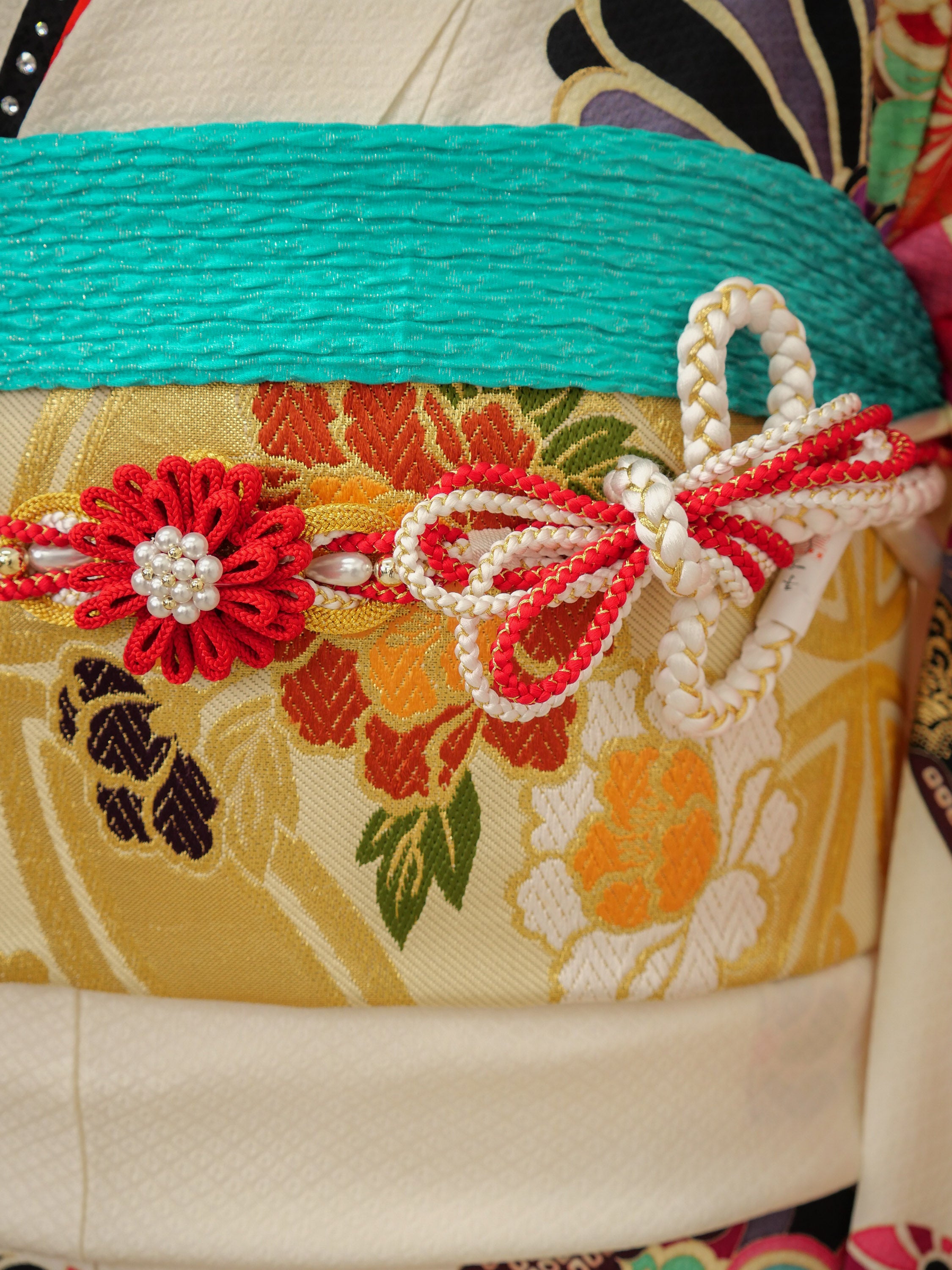 中振袖、袋帯、長襦袢(半襟付き、ポリエステル)、重ね衿(着物に縫い付けの商品あり)、帯揚げ、帯締め、ショール、腰紐5本、伊達締め2本、衿芯、前板、後板、帯枕(ガーゼ付き)、コーリンベルト1本、三重紐、草履、バッグ