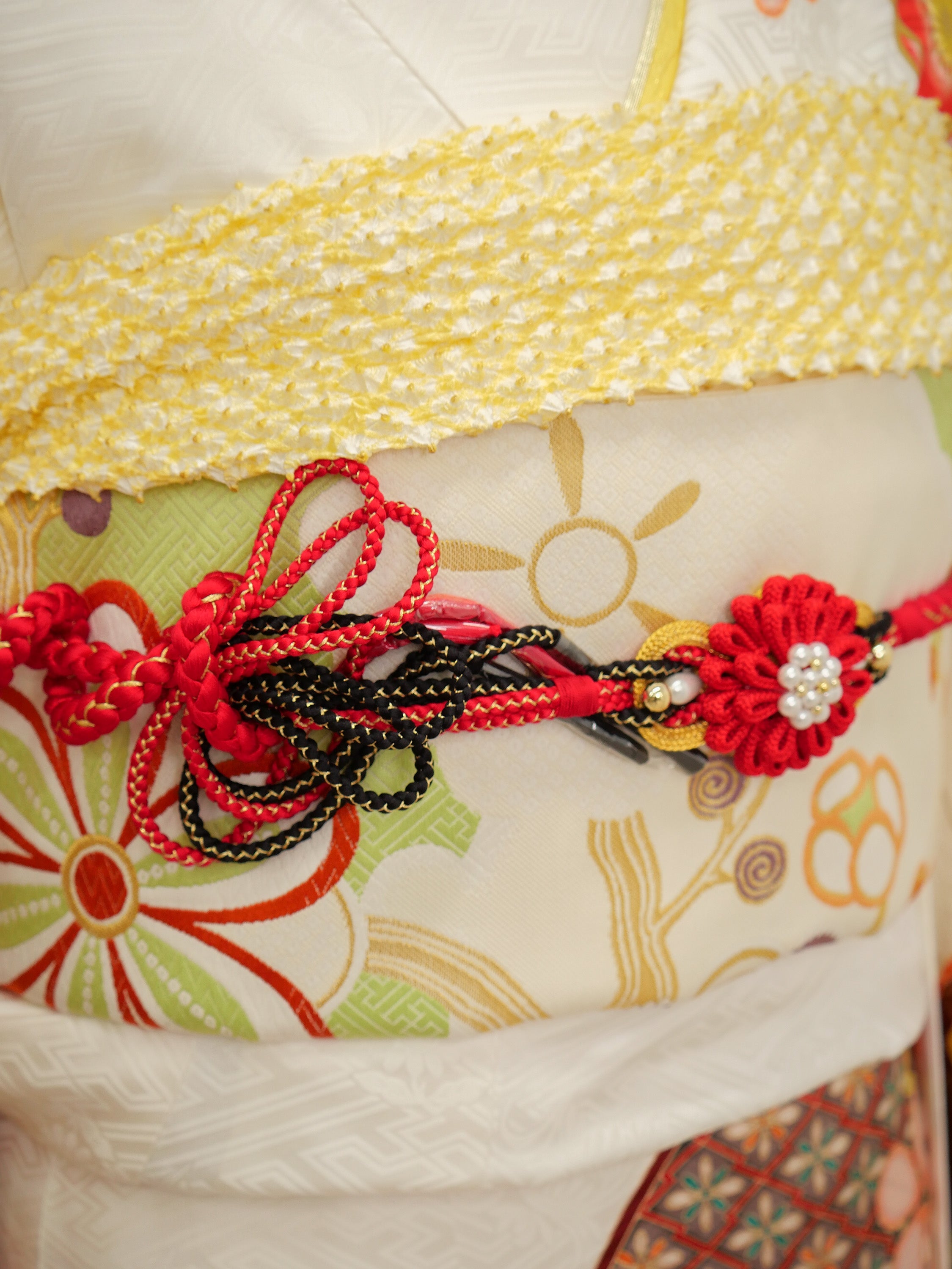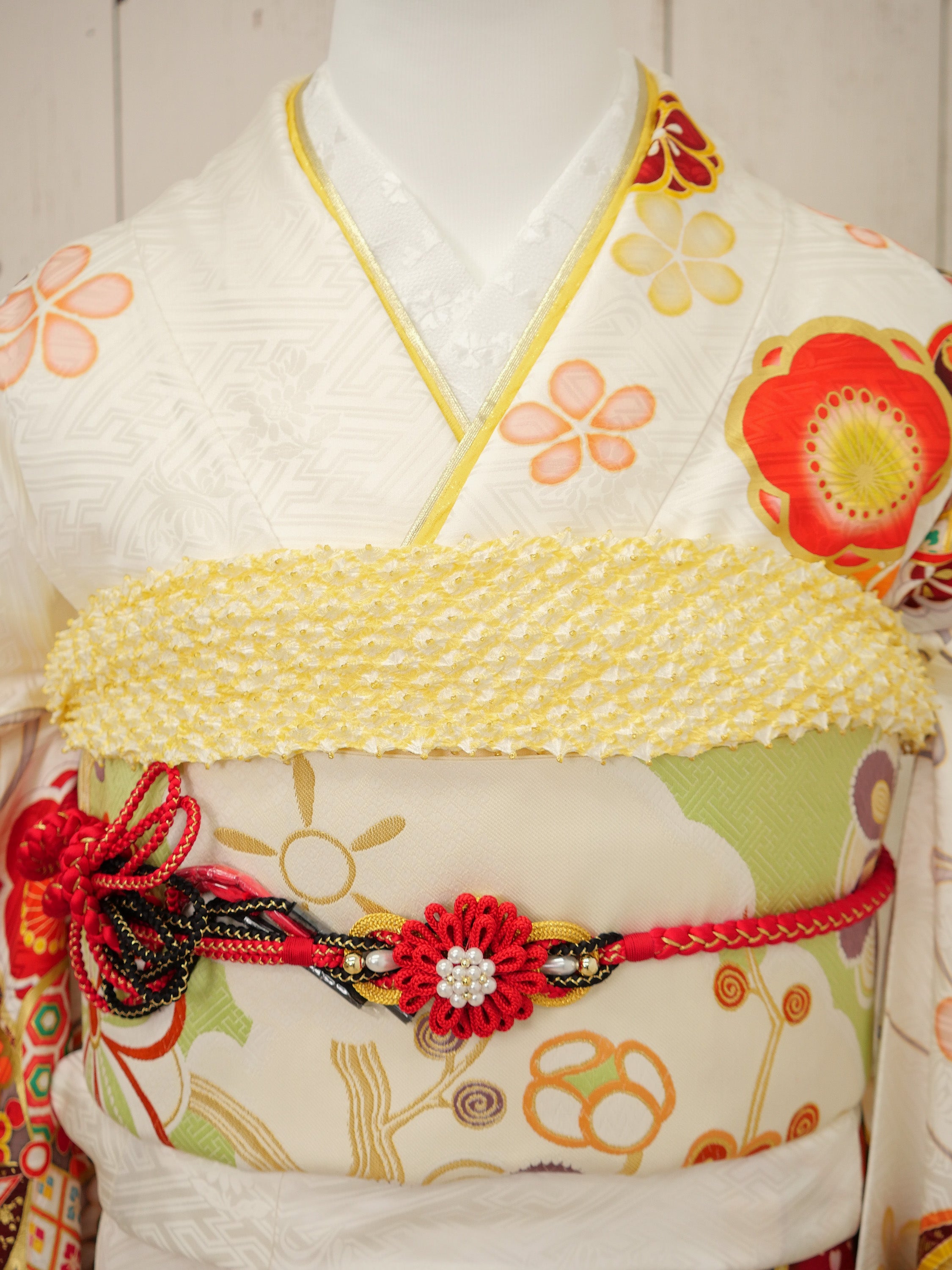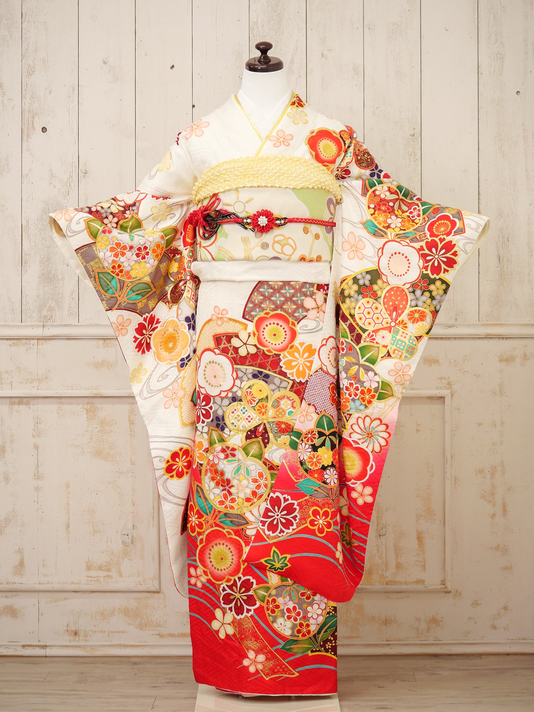中振袖、袋帯、長襦袢(半襟付き、ポリエステル)、重ね衿(着物に縫い付けの商品あり)、帯揚げ、帯締め、ショール、腰紐5本、伊達締め2本、衿芯、前板、後板、帯枕(ガーゼ付き)、コーリンベルト1本、三重紐、草履、バッグ