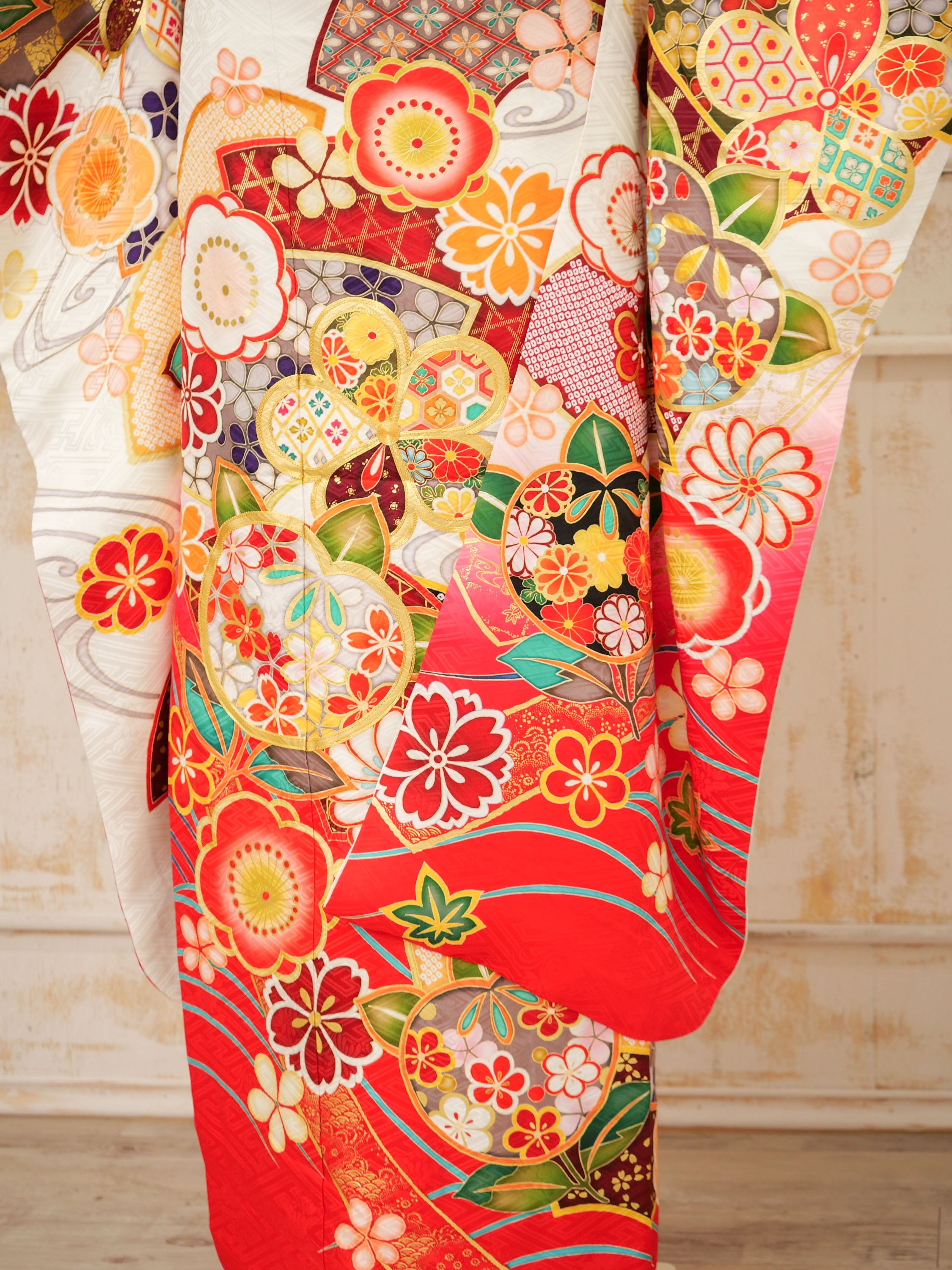 淡い生成りの地に、花紋と鞠が華やかに舞う格式高いデザイン。赤の挿し色が晴れやかさを引き立て、古典柄ながらも柔らかい印象に。優しさと気品を兼ね備えた一枚です。