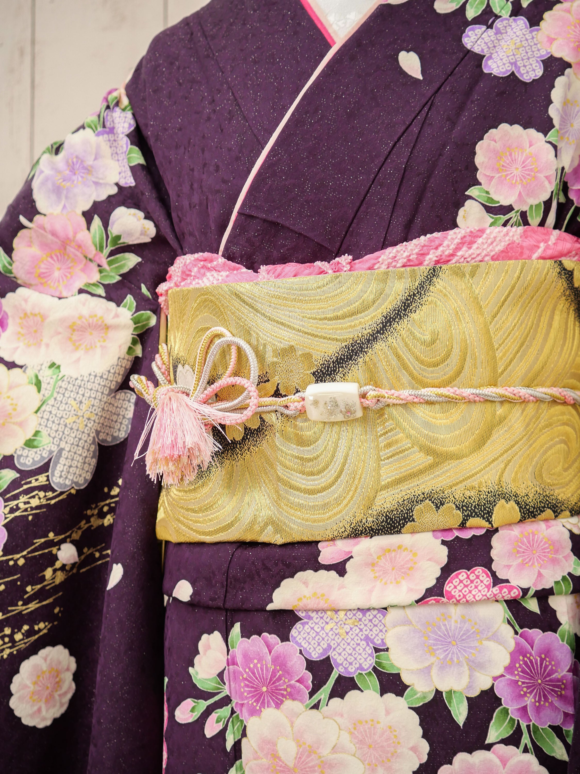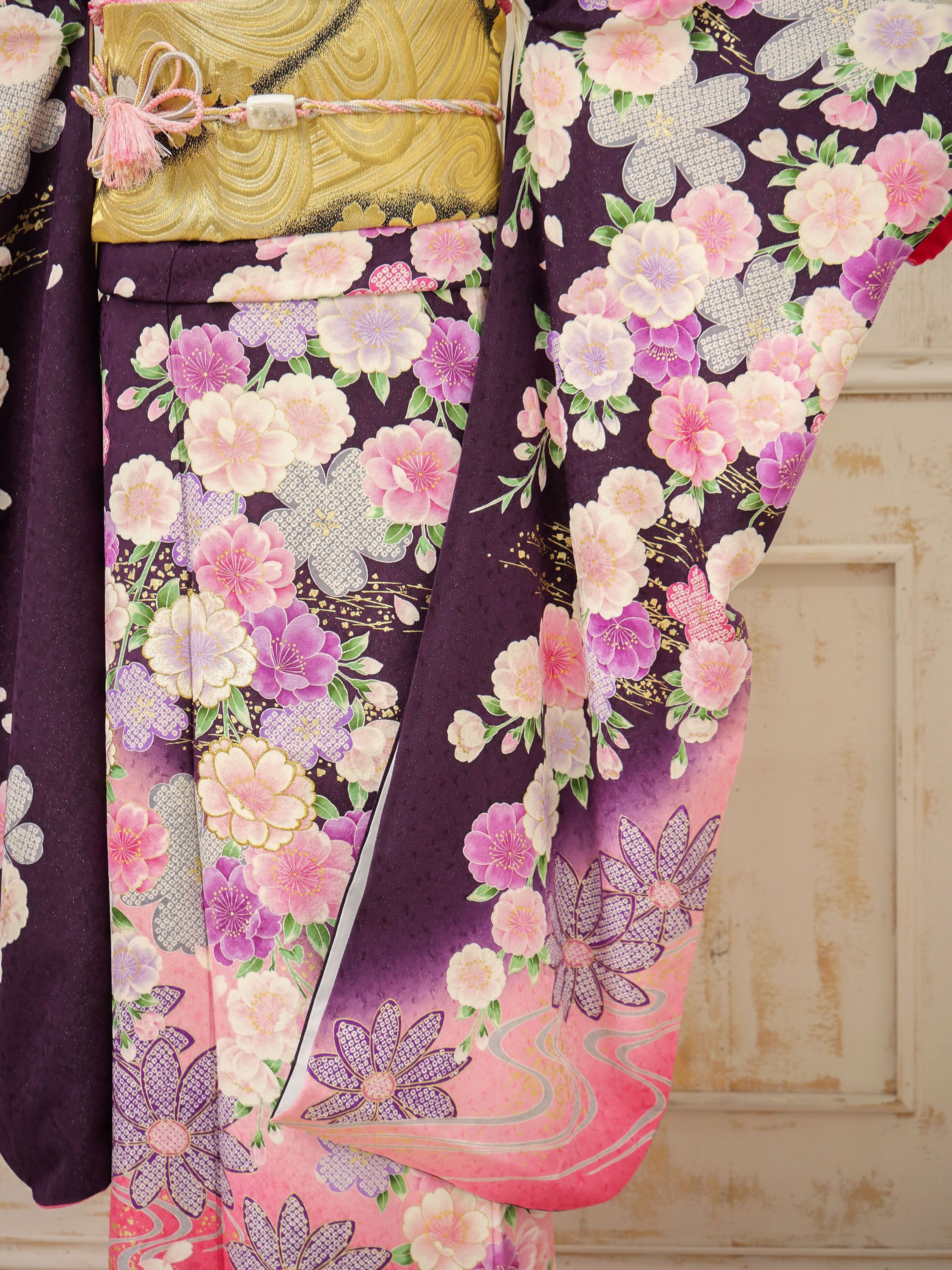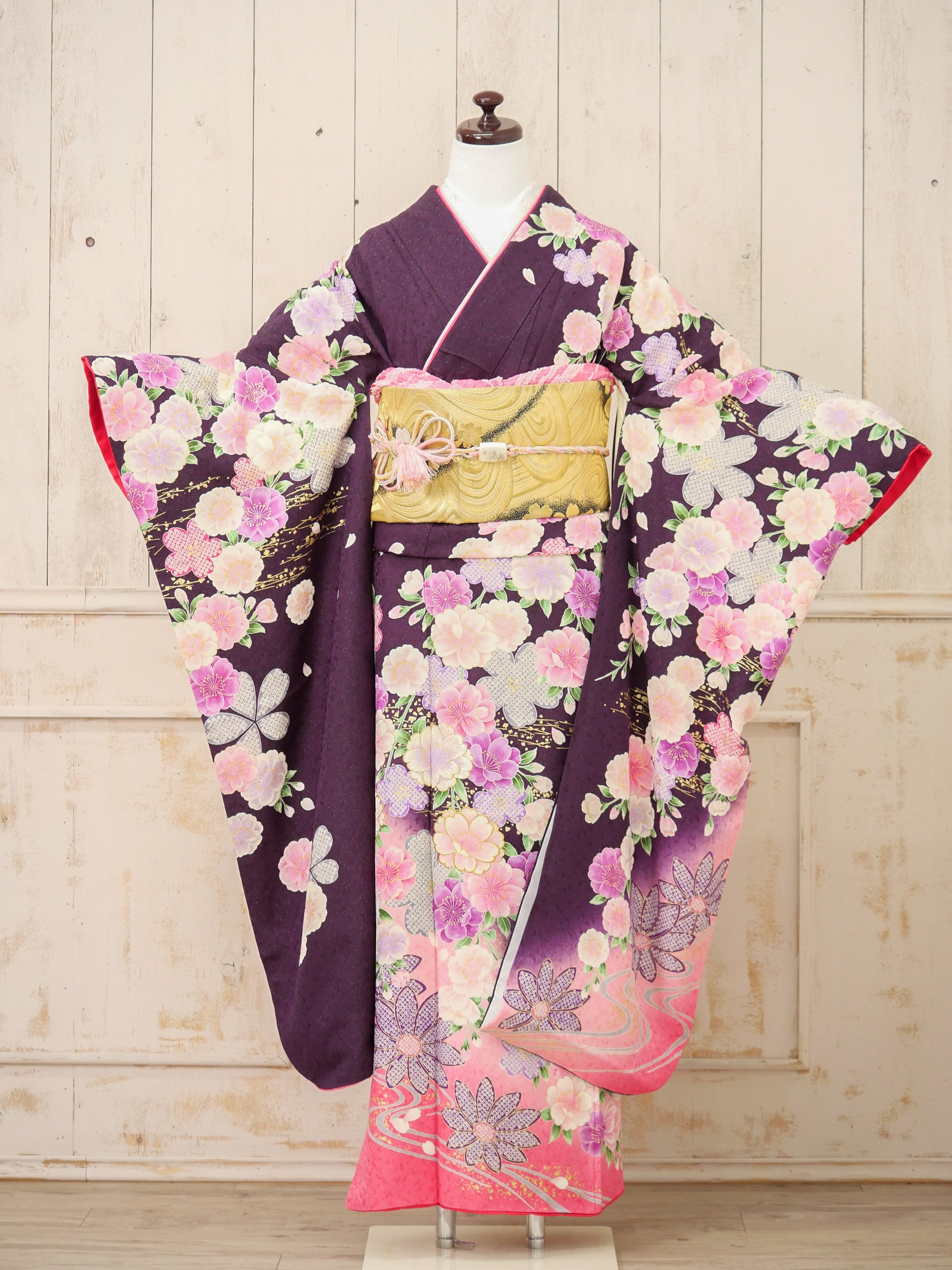 深みのある紫から優しい桃色へとグラデーションする地色に、桜や牡丹が繊細に咲き誇る華やかな振袖。落ち着いた華やかさが魅力で、可憐さと上品さを兼ね備えた一着。