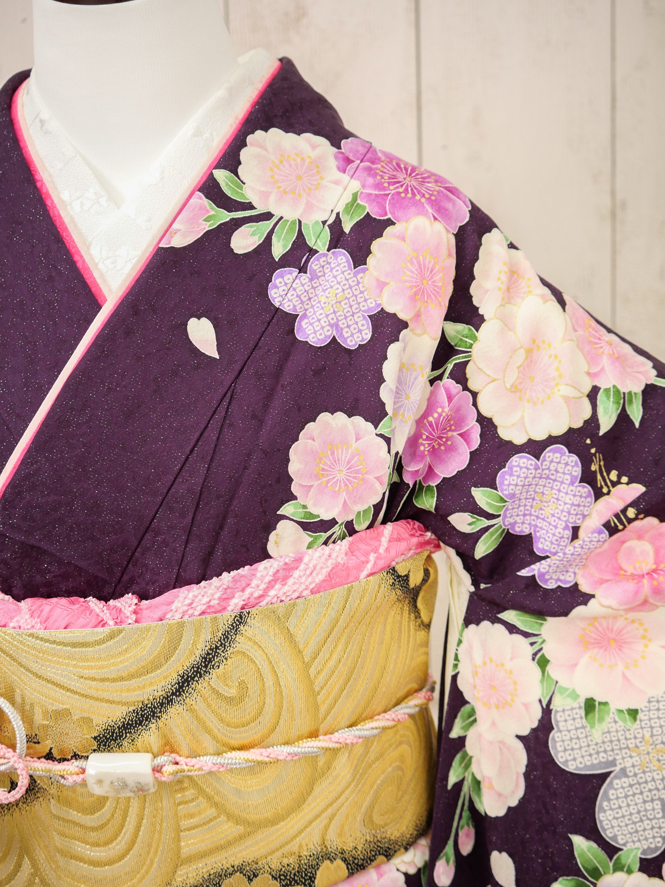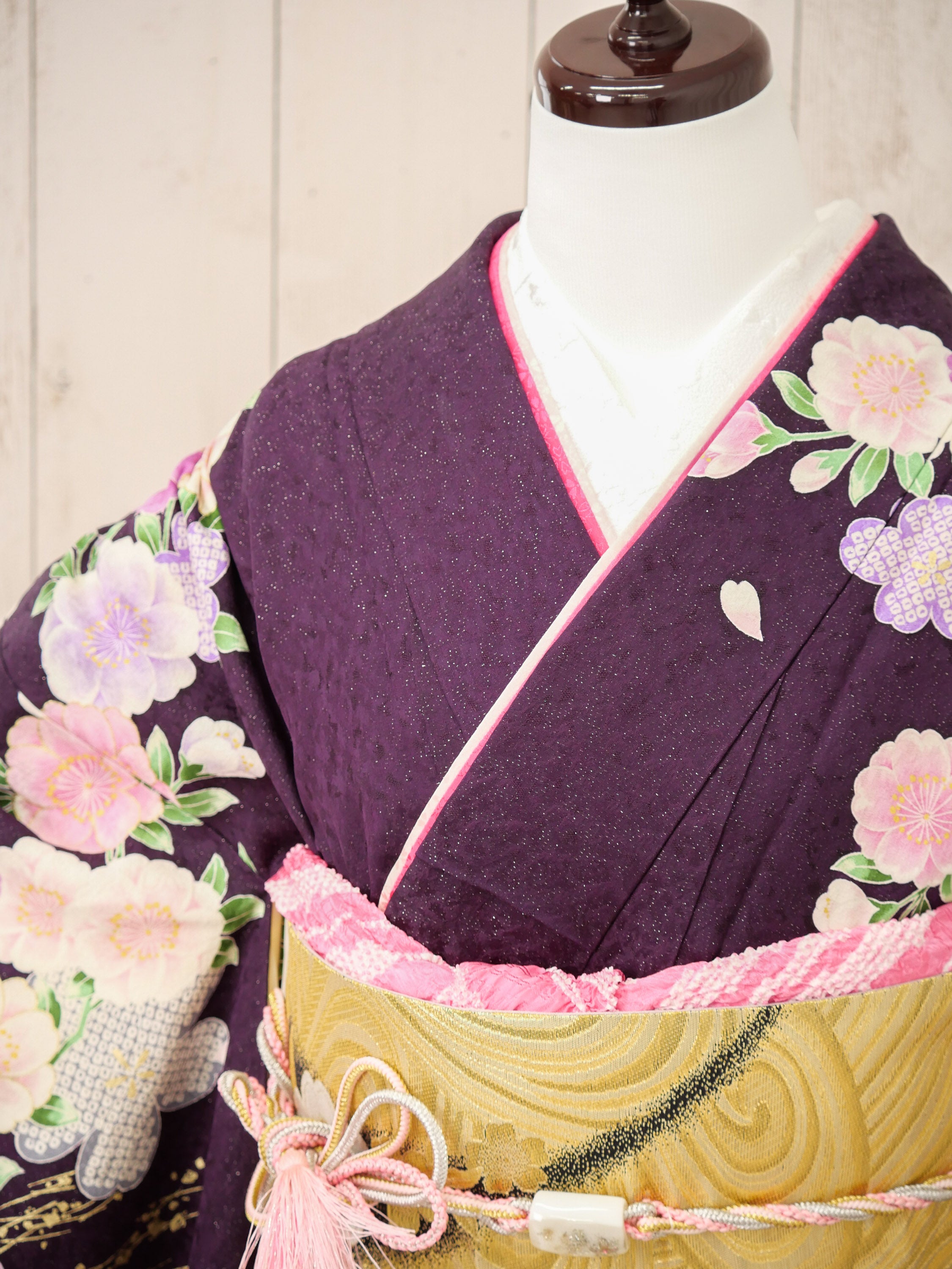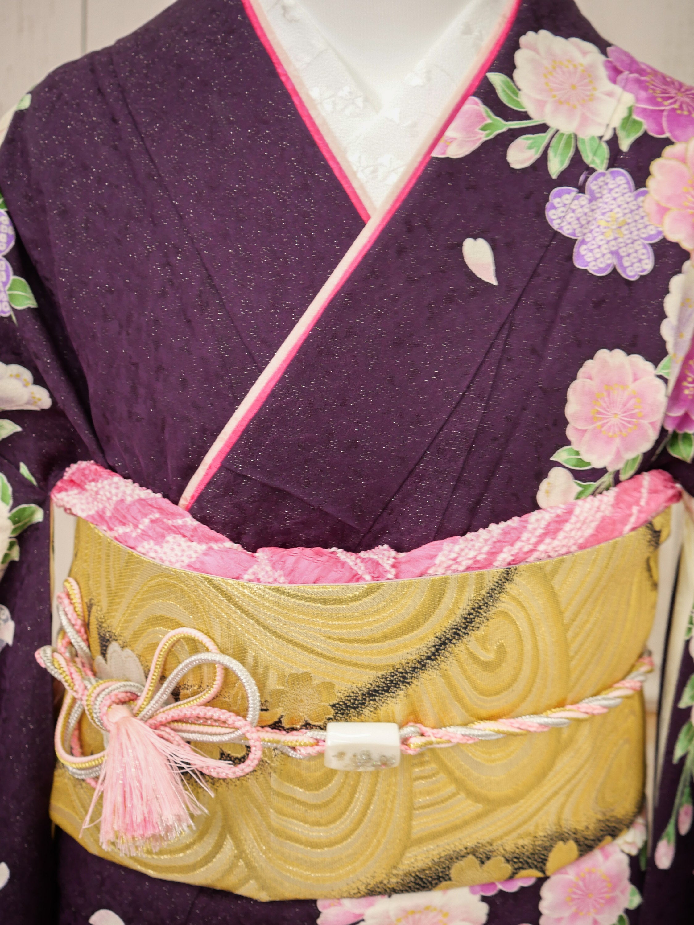 深みのある紫から優しい桃色へとグラデーションする地色に、桜や牡丹が繊細に咲き誇る華やかな振袖。落ち着いた華やかさが魅力で、可憐さと上品さを兼ね備えた一着。