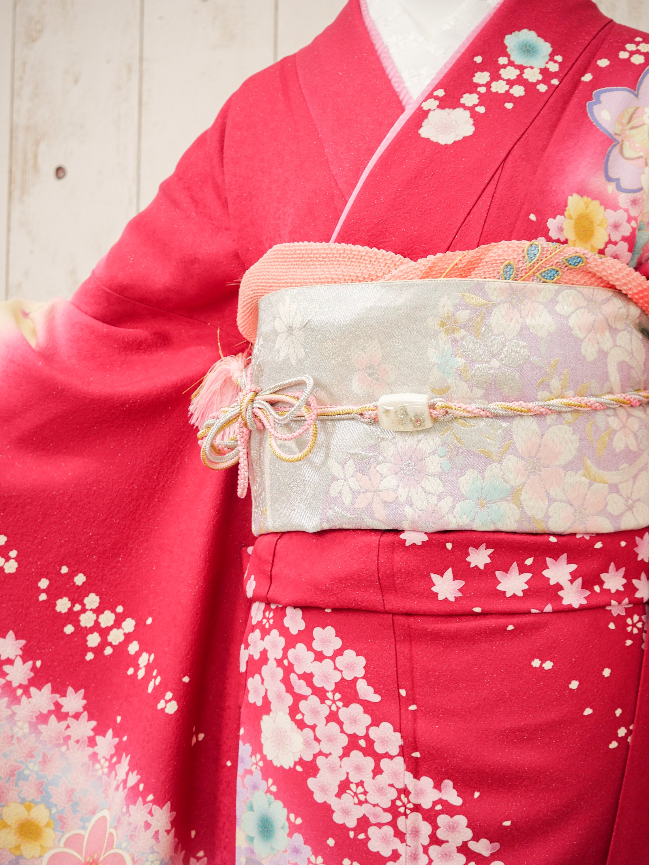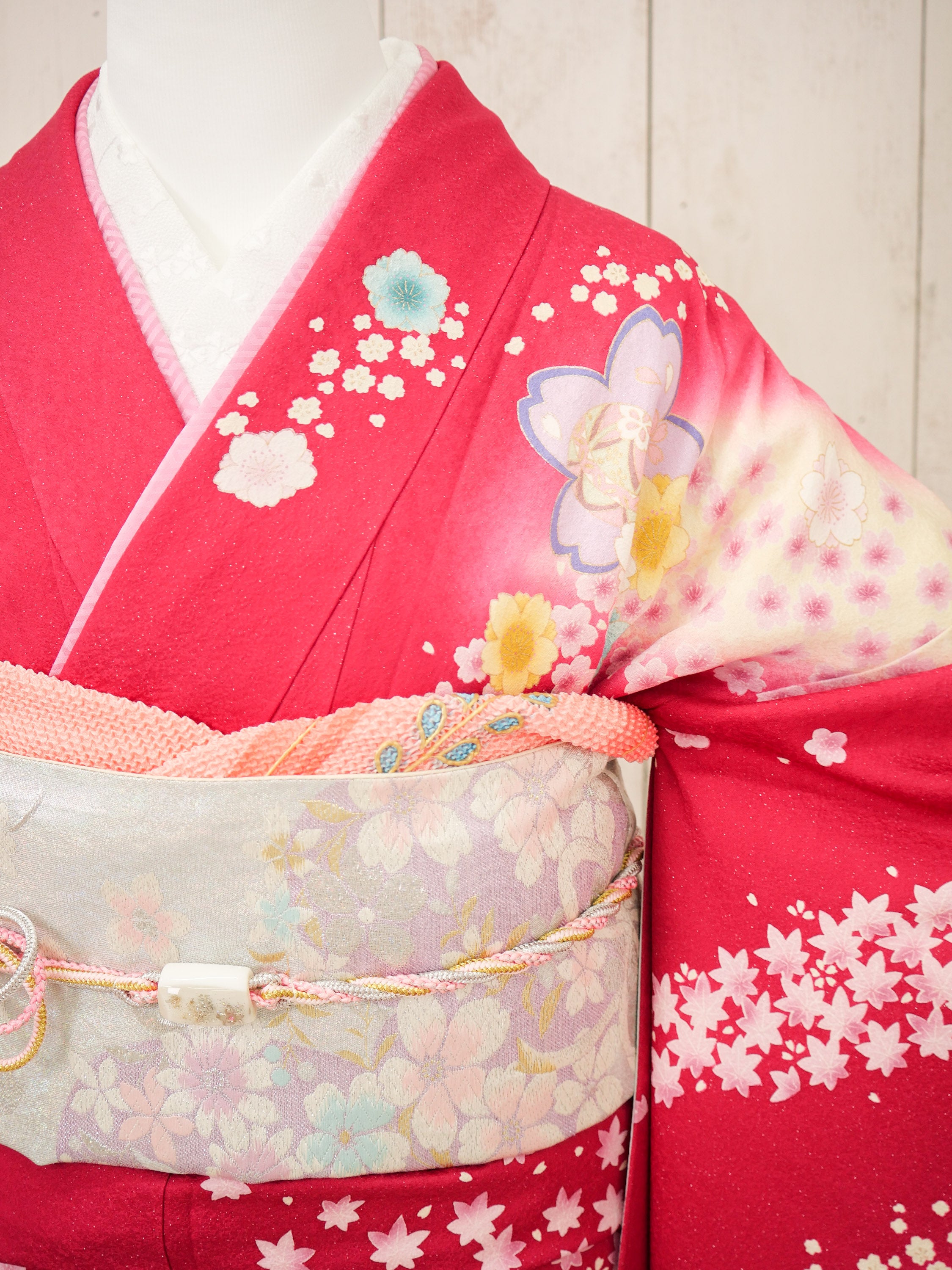 中振袖、袋帯、長襦袢(半襟付き、ポリエステル)、重ね衿(着物に縫い付けの商品あり)、帯揚げ、帯締め、ショール、腰紐5本、伊達締め2本、衿芯、前板、後板、帯枕(ガーゼ付き)、コーリンベルト1本、三重紐、草履、バッグ