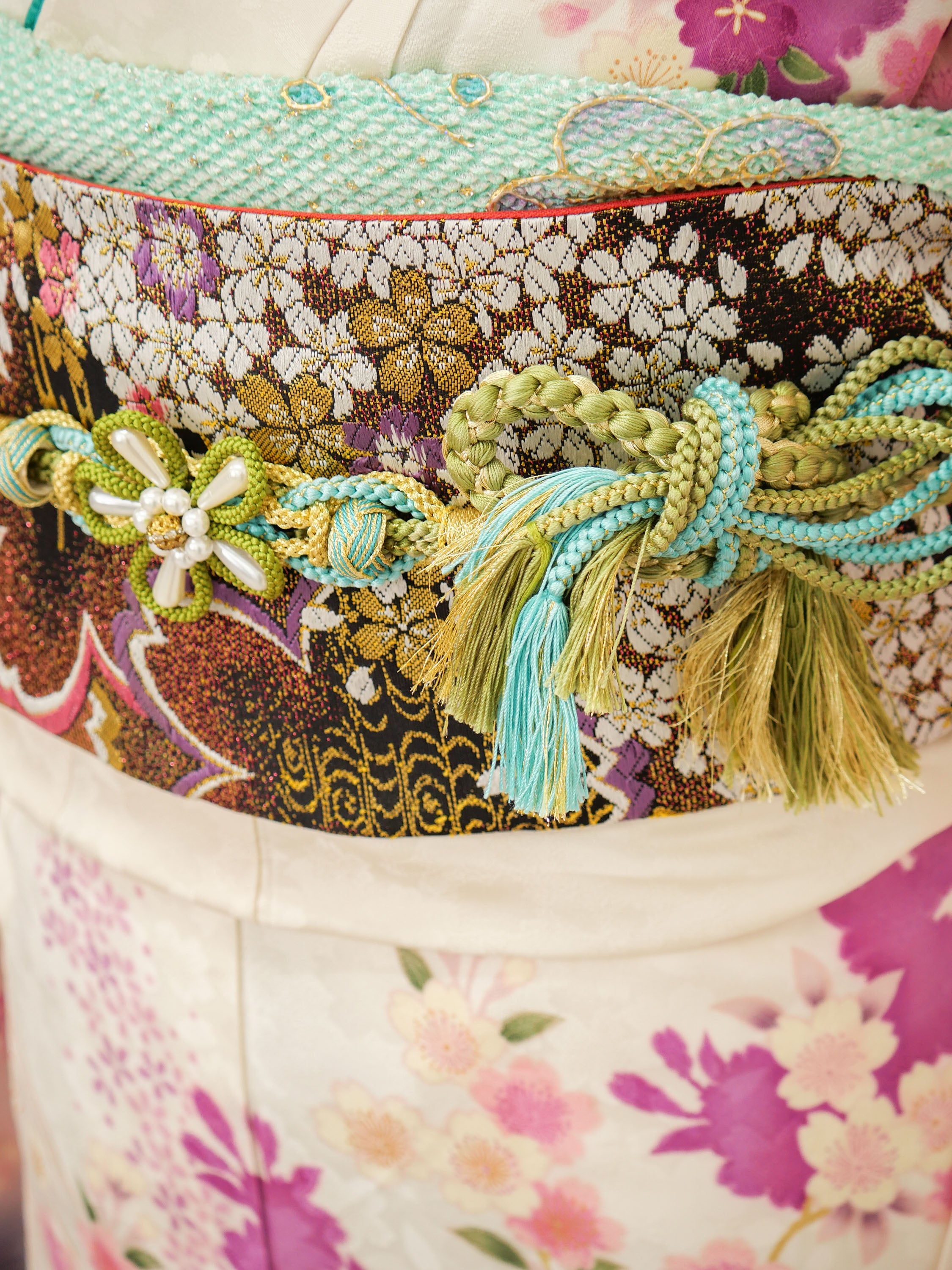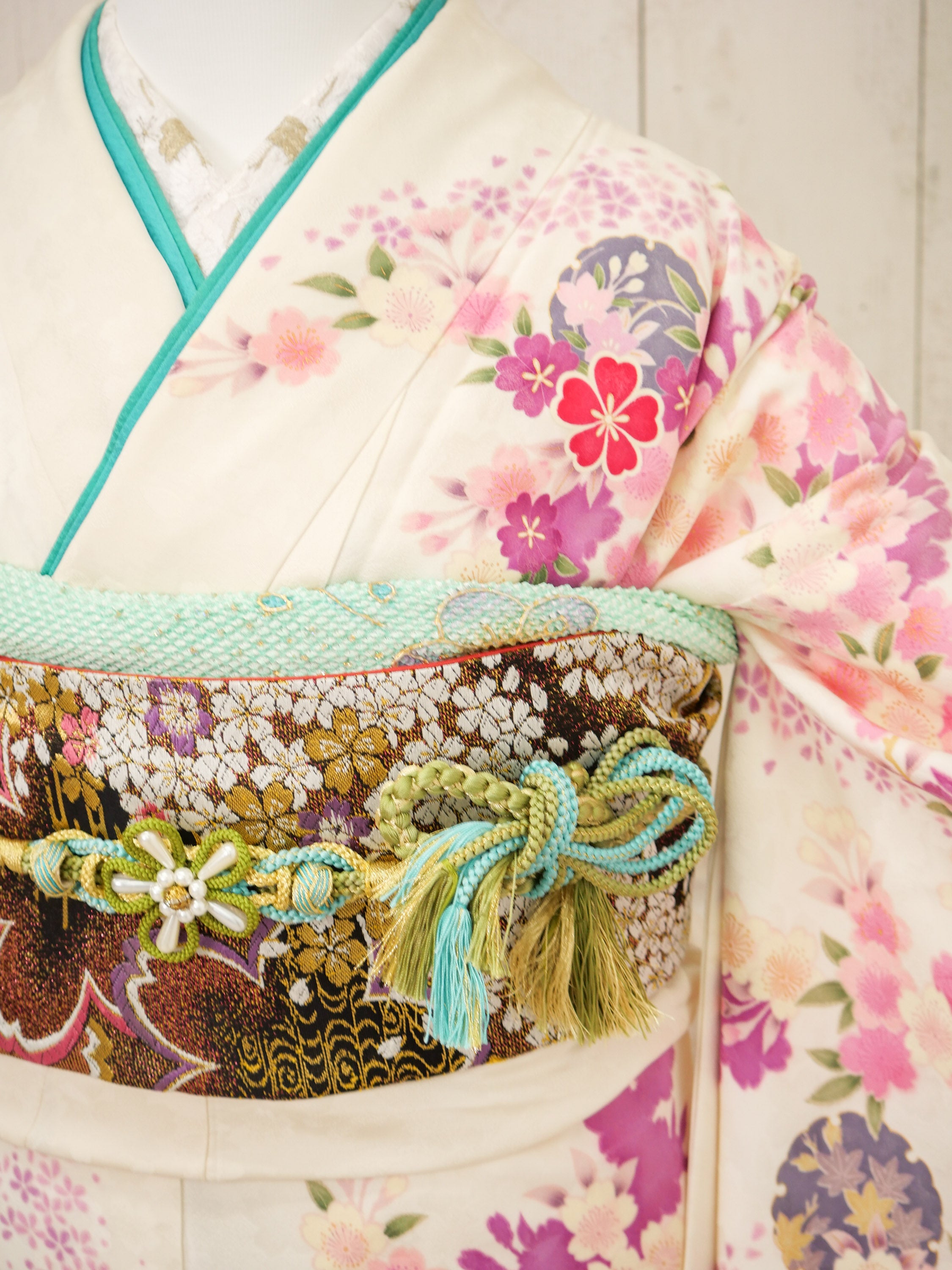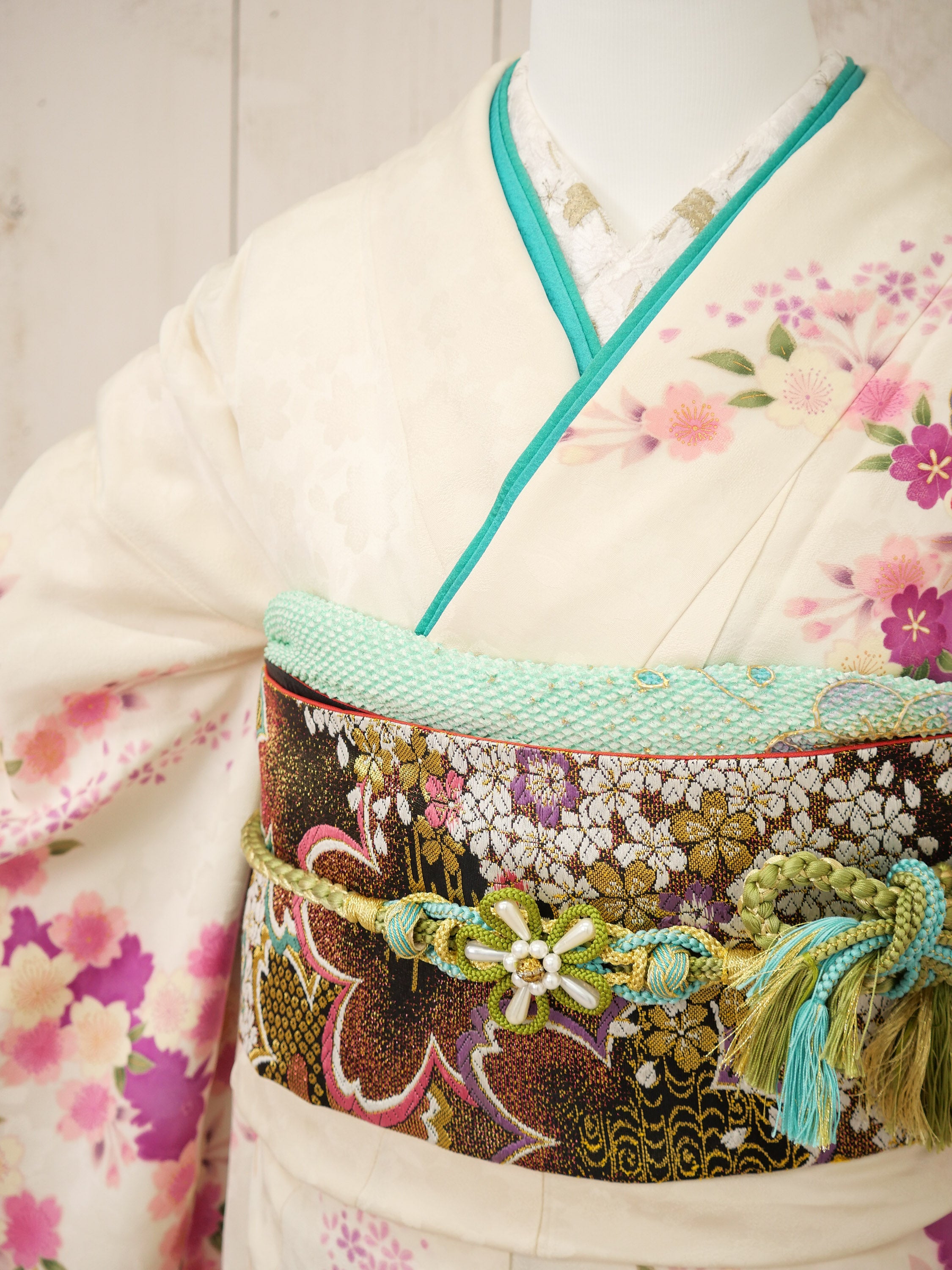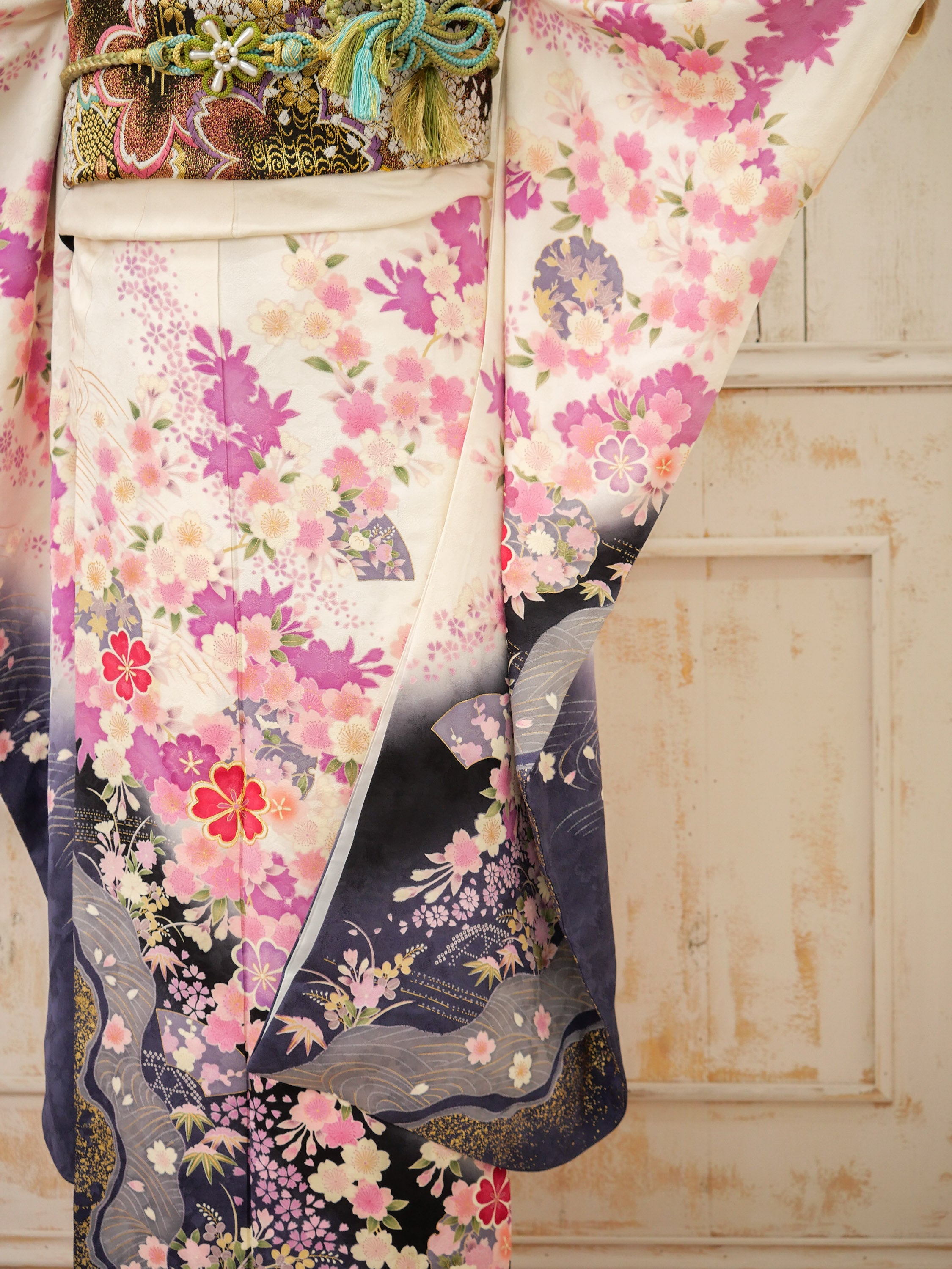生成り地に鮮やかな桜や牡丹が咲き誇る華やかな振袖。淡い色合いと濃紺のグラデーションが奥行きを与え、優雅さを引き立てます。格調高い帯の金彩が存在感を放ち、上品さと華麗さを兼ね備えた特別な日の装いに。
