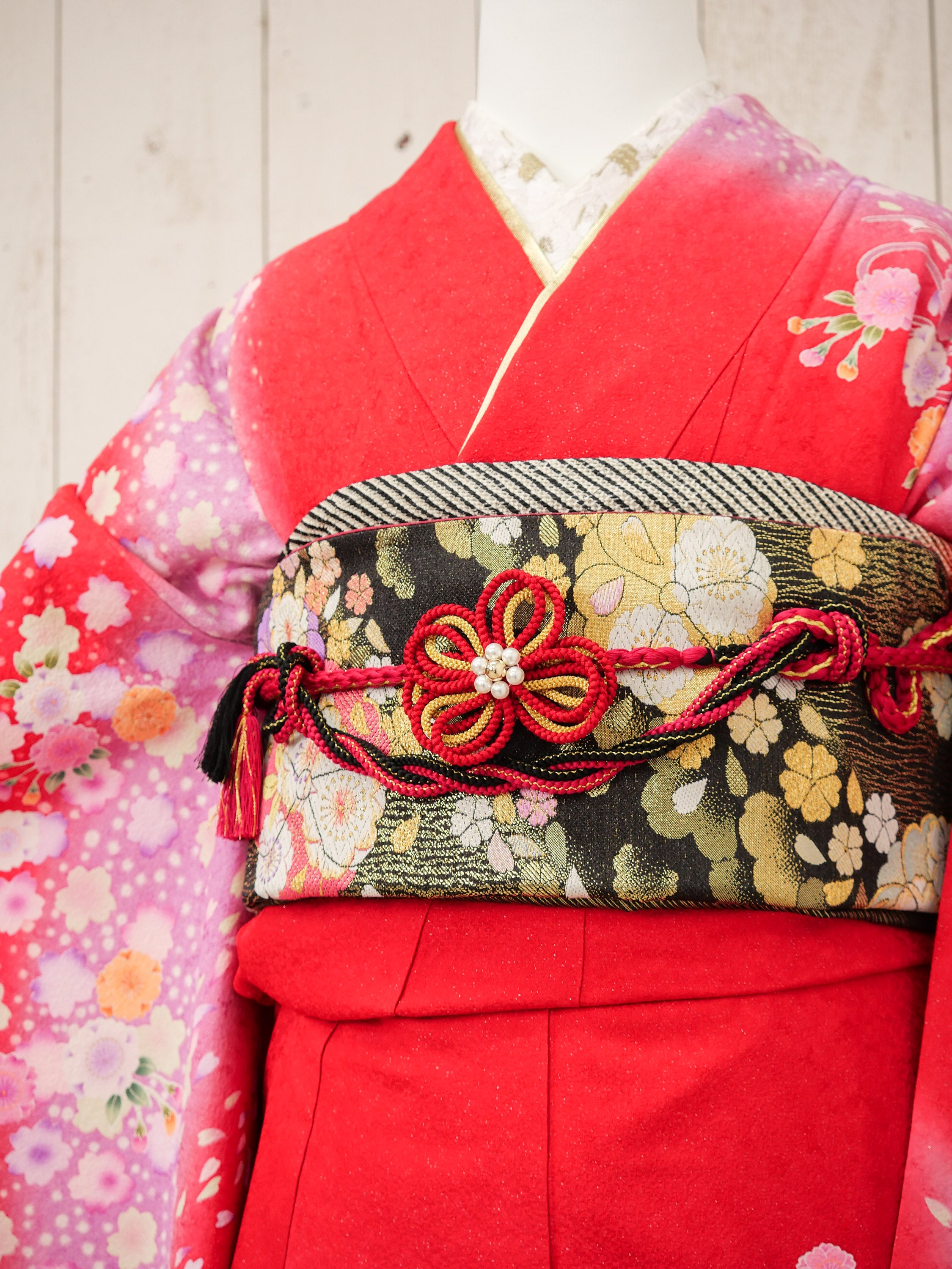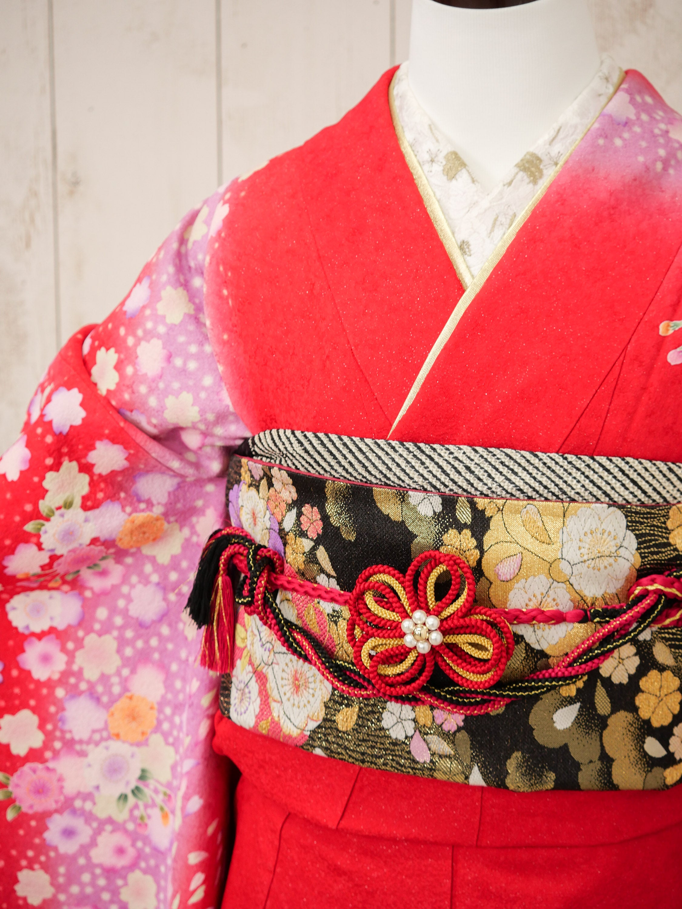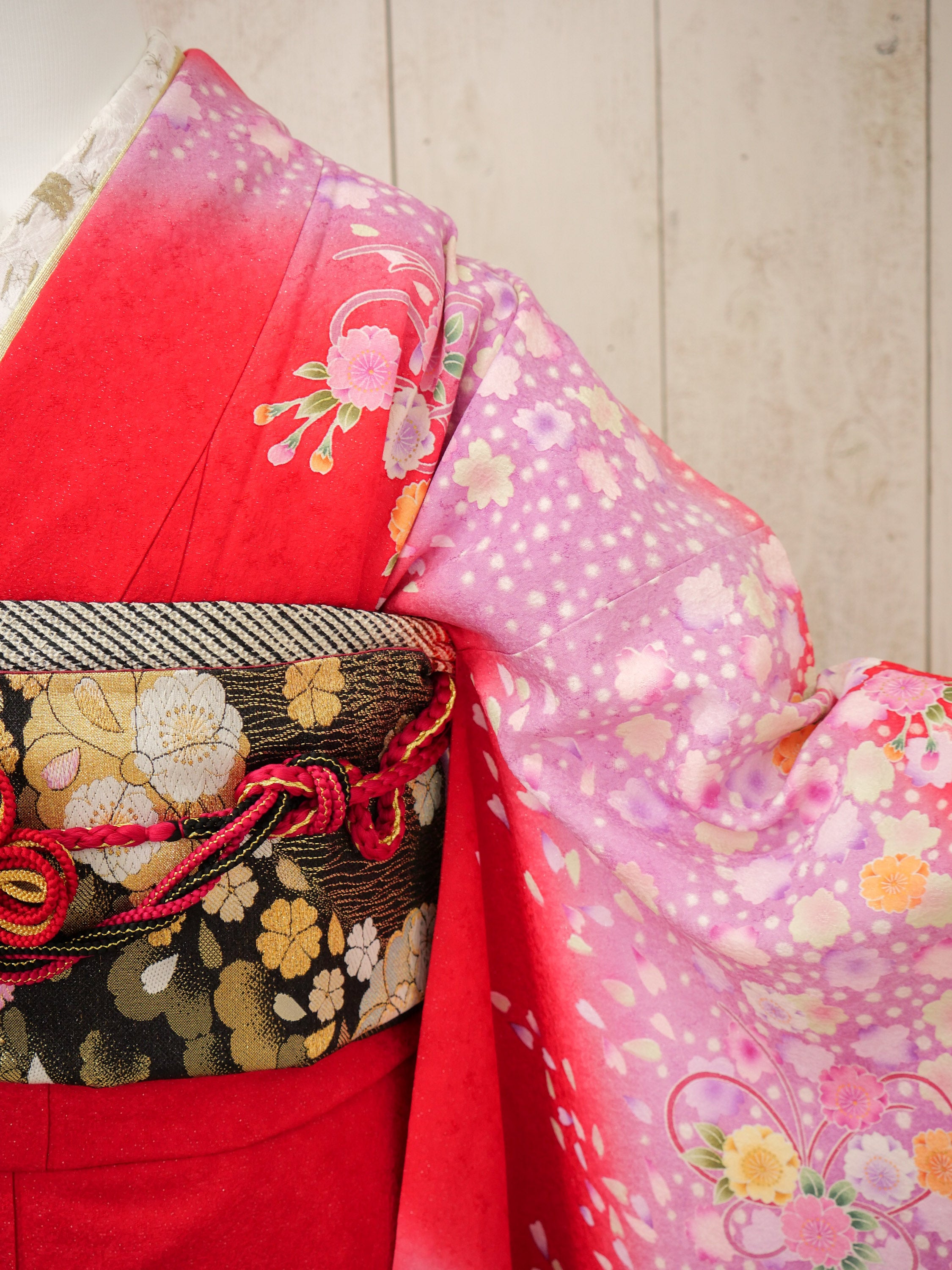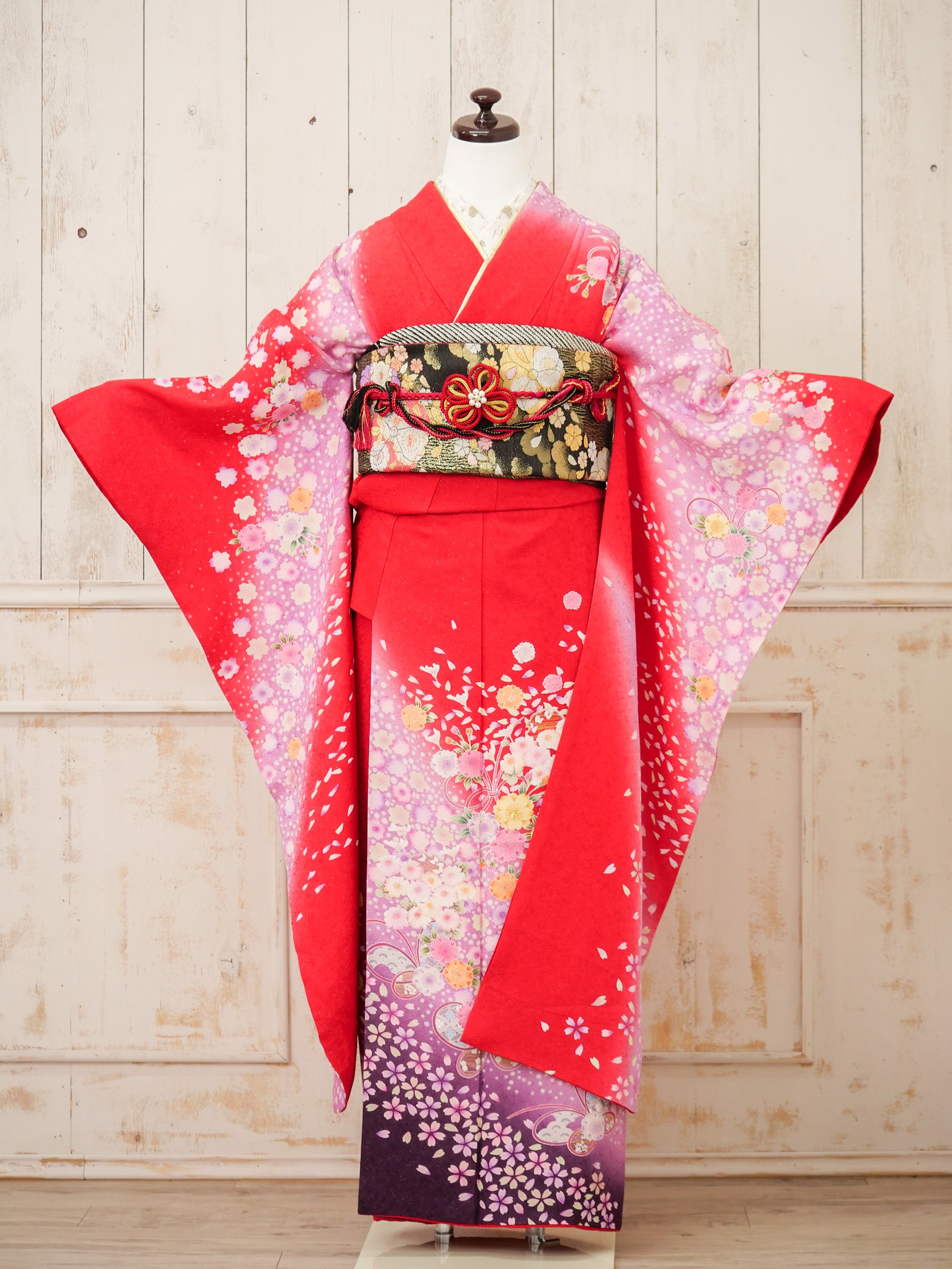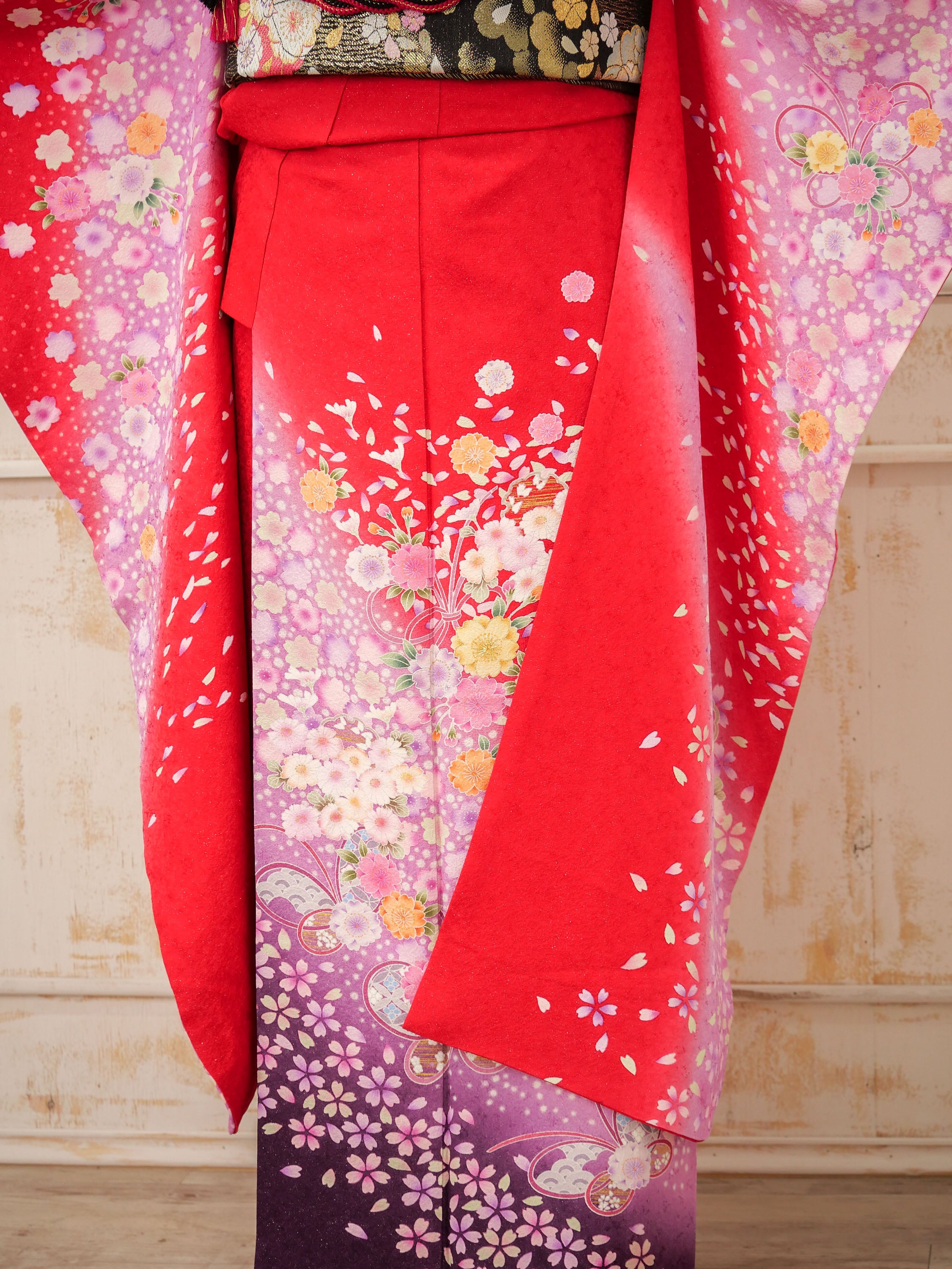 赤地に紫と桃色の花々が咲き誇る華麗な振袖。全体に広がる桜模様が華やかで、春の雰囲気を存分に表現しています。黒地の帯に金彩が重厚感を加え、豪華でありながら可愛らしさも感じさせる晴れの日に最適な一枚です。