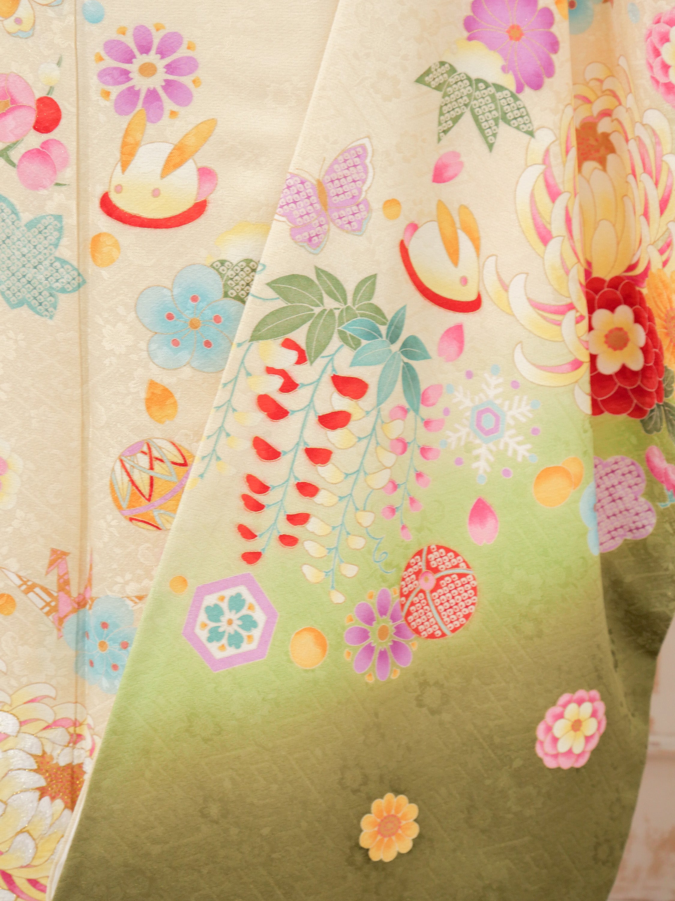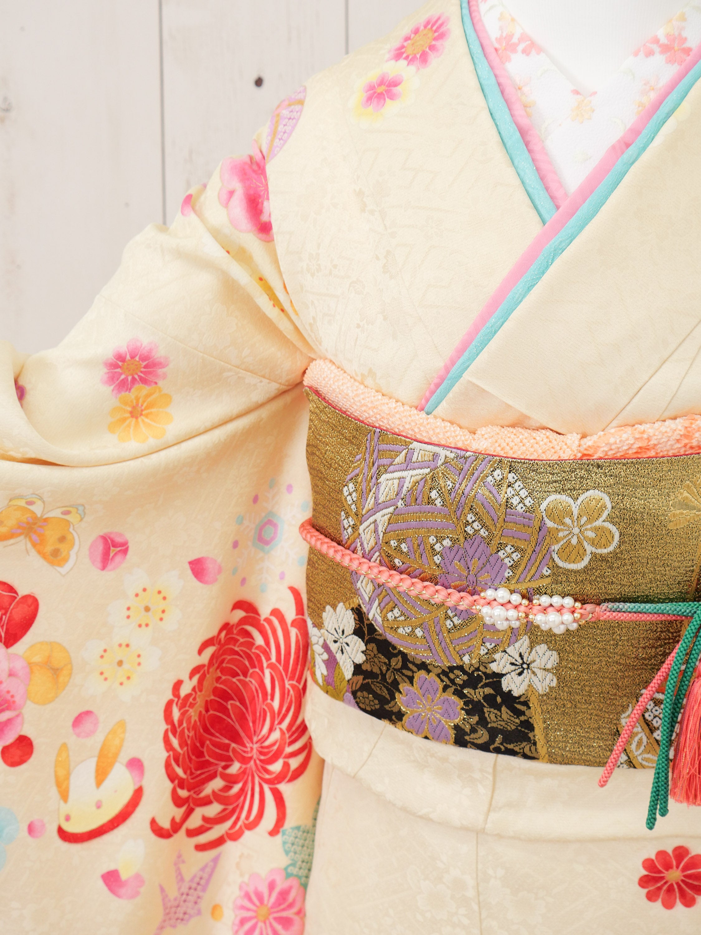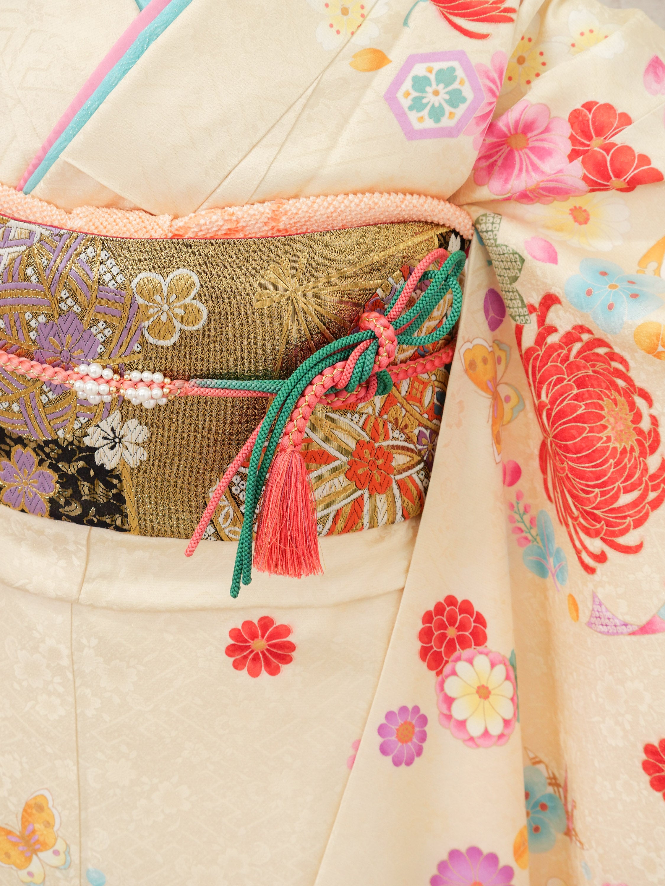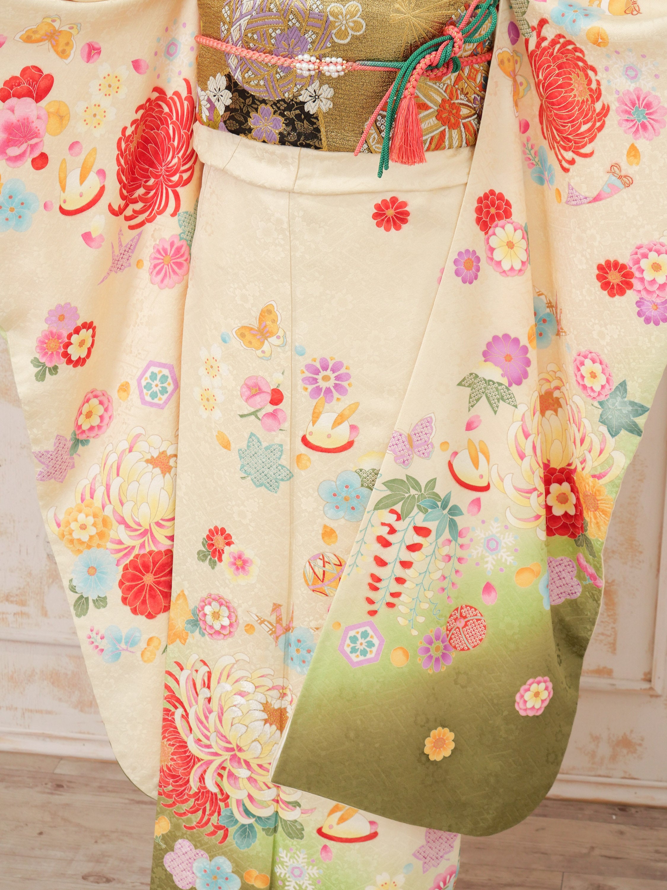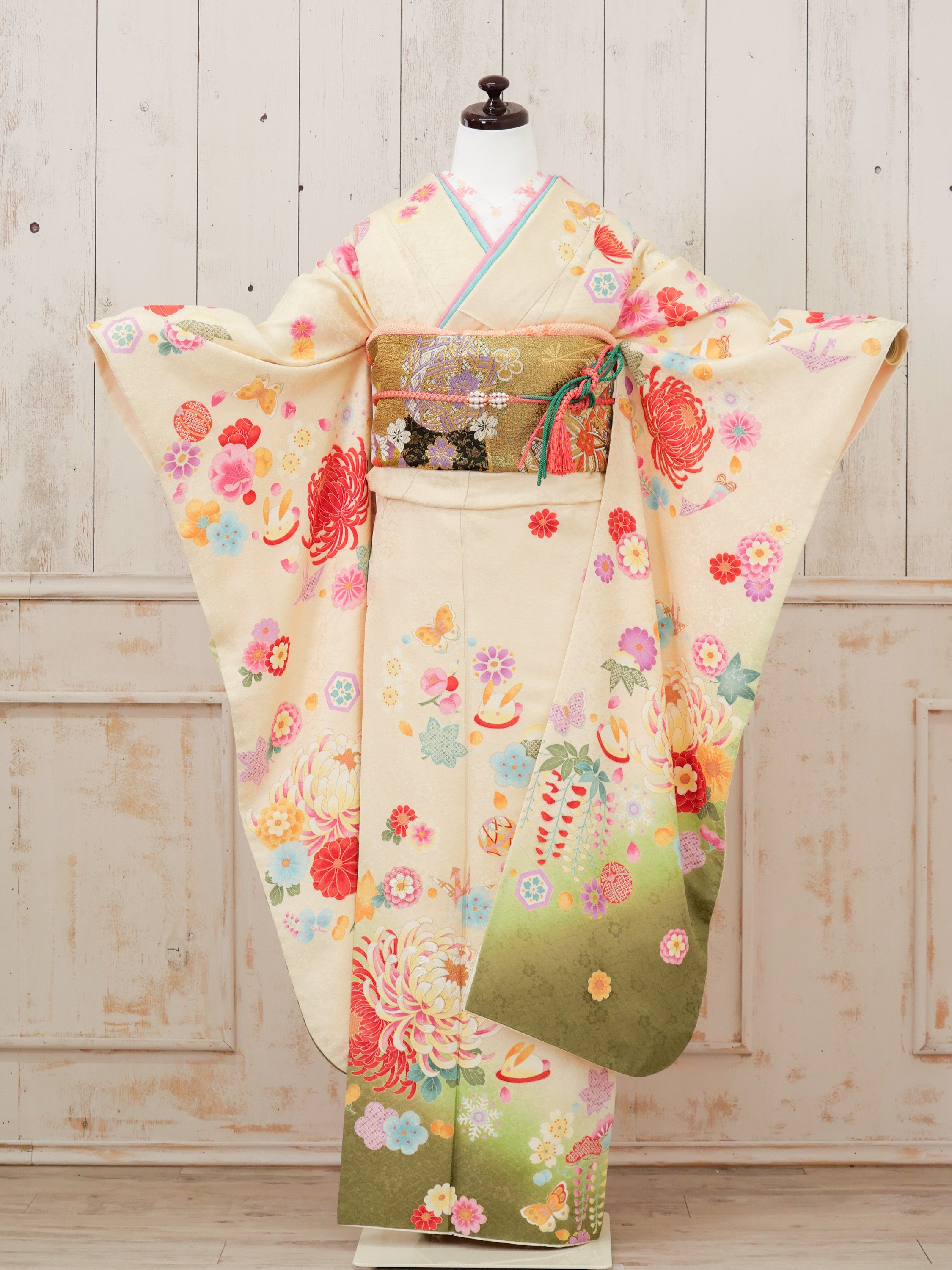 中振袖、袋帯、長襦袢(半襟付き、ポリエステル)、重ね衿(着物に縫い付けの商品あり)、帯揚げ、帯締め、ショール、腰紐5本、伊達締め2本、衿芯、前板、後板、帯枕(ガーゼ付き)、コーリンベルト1本、三重紐、草履、バッグ