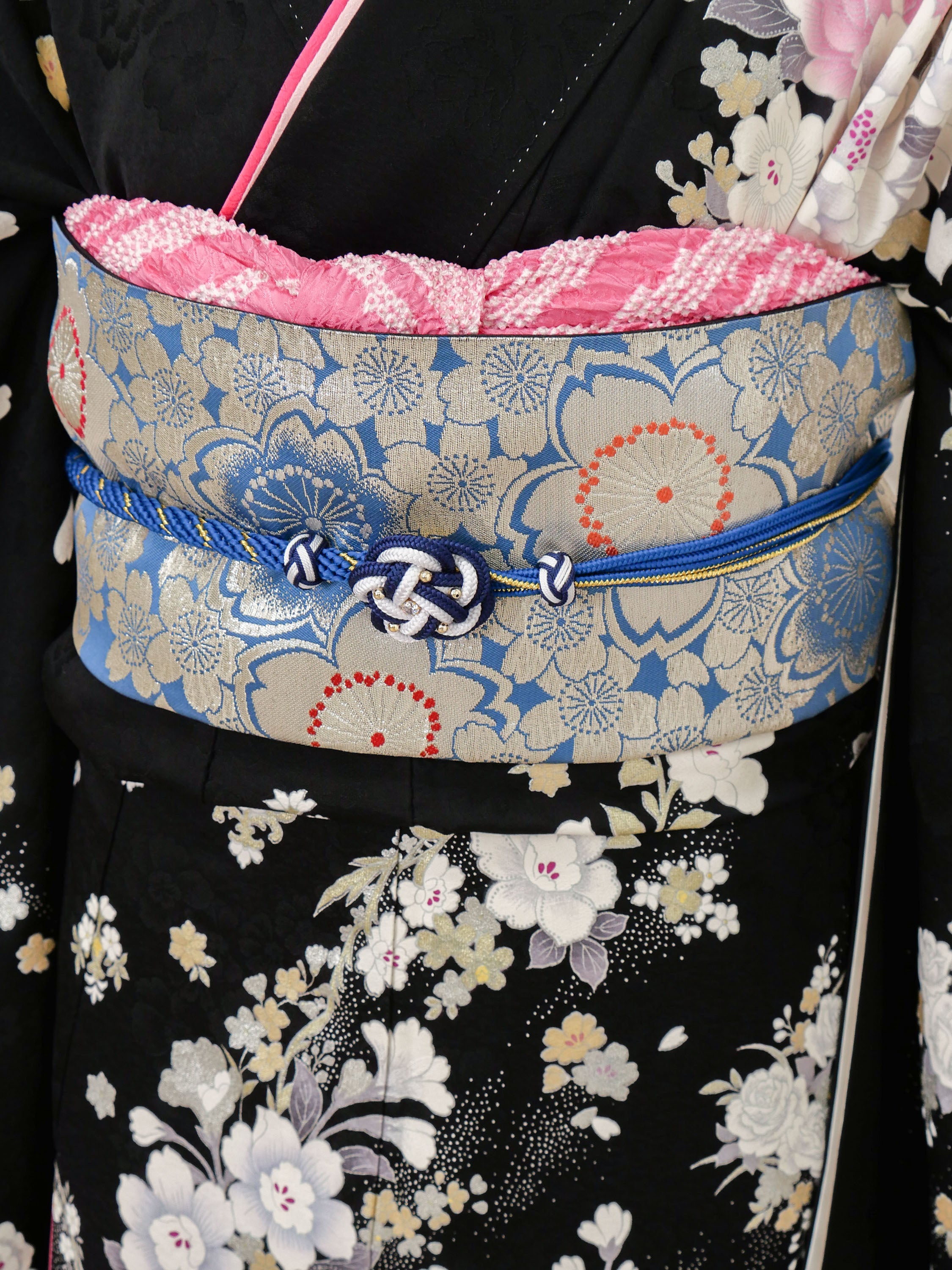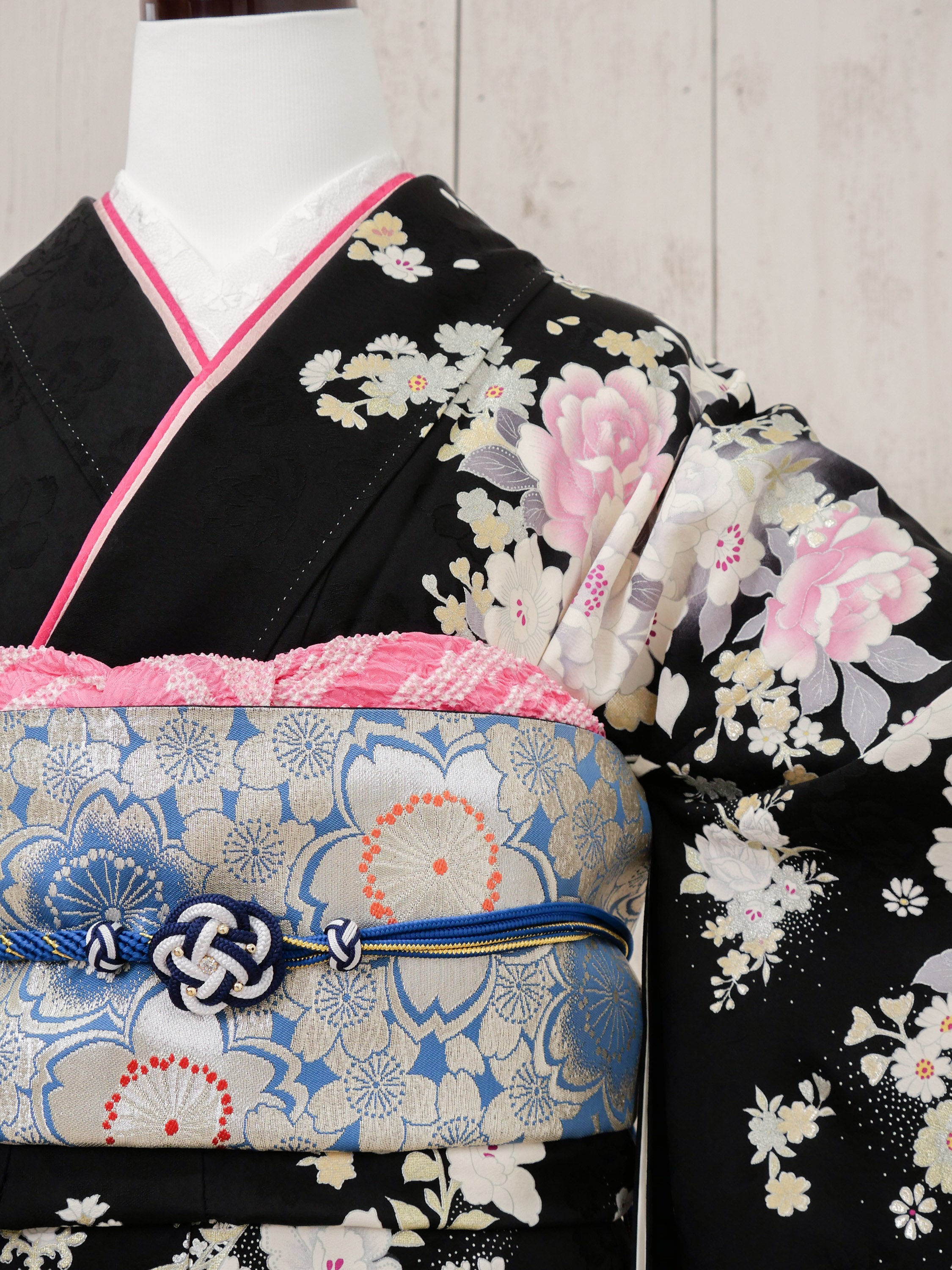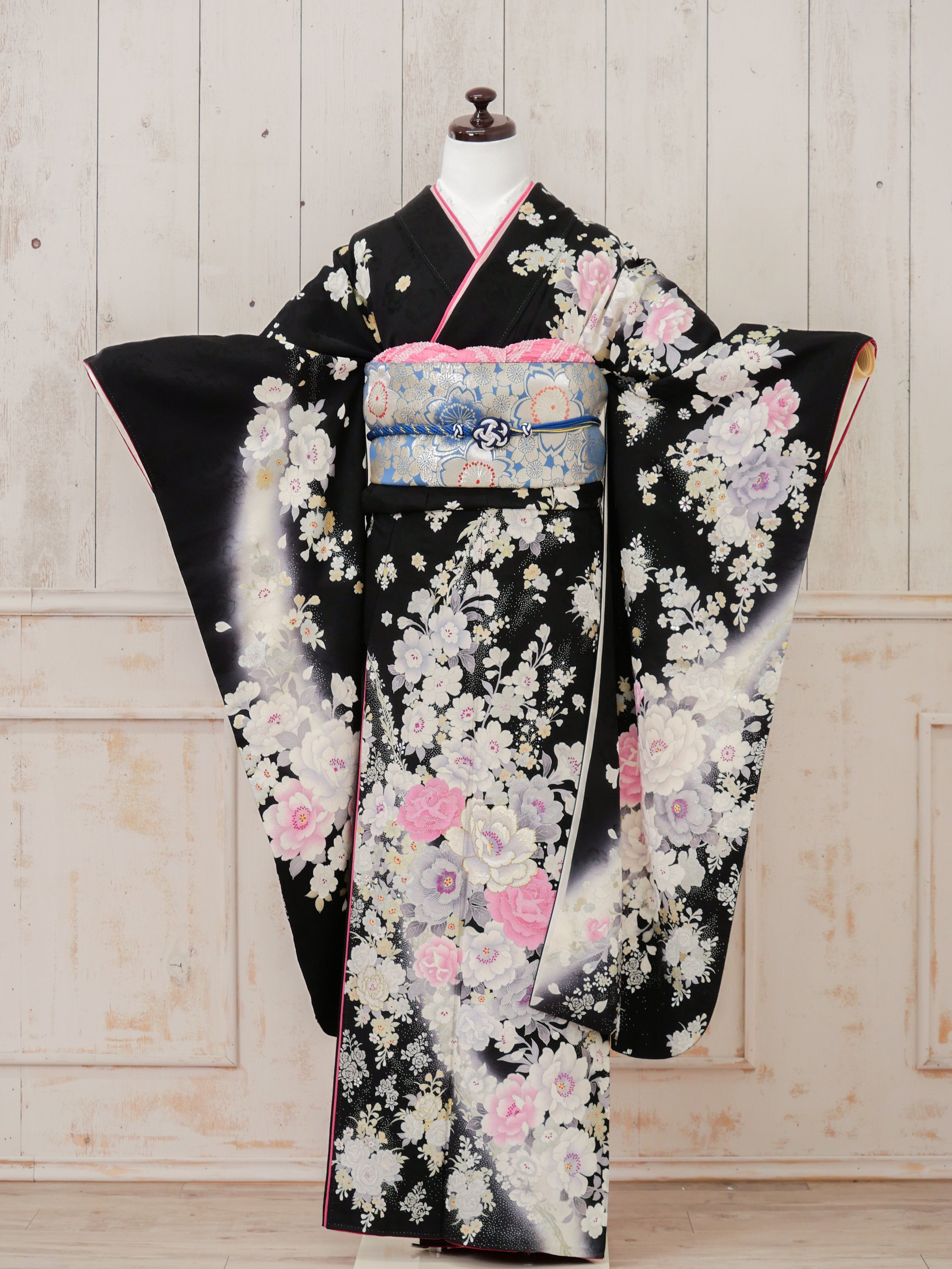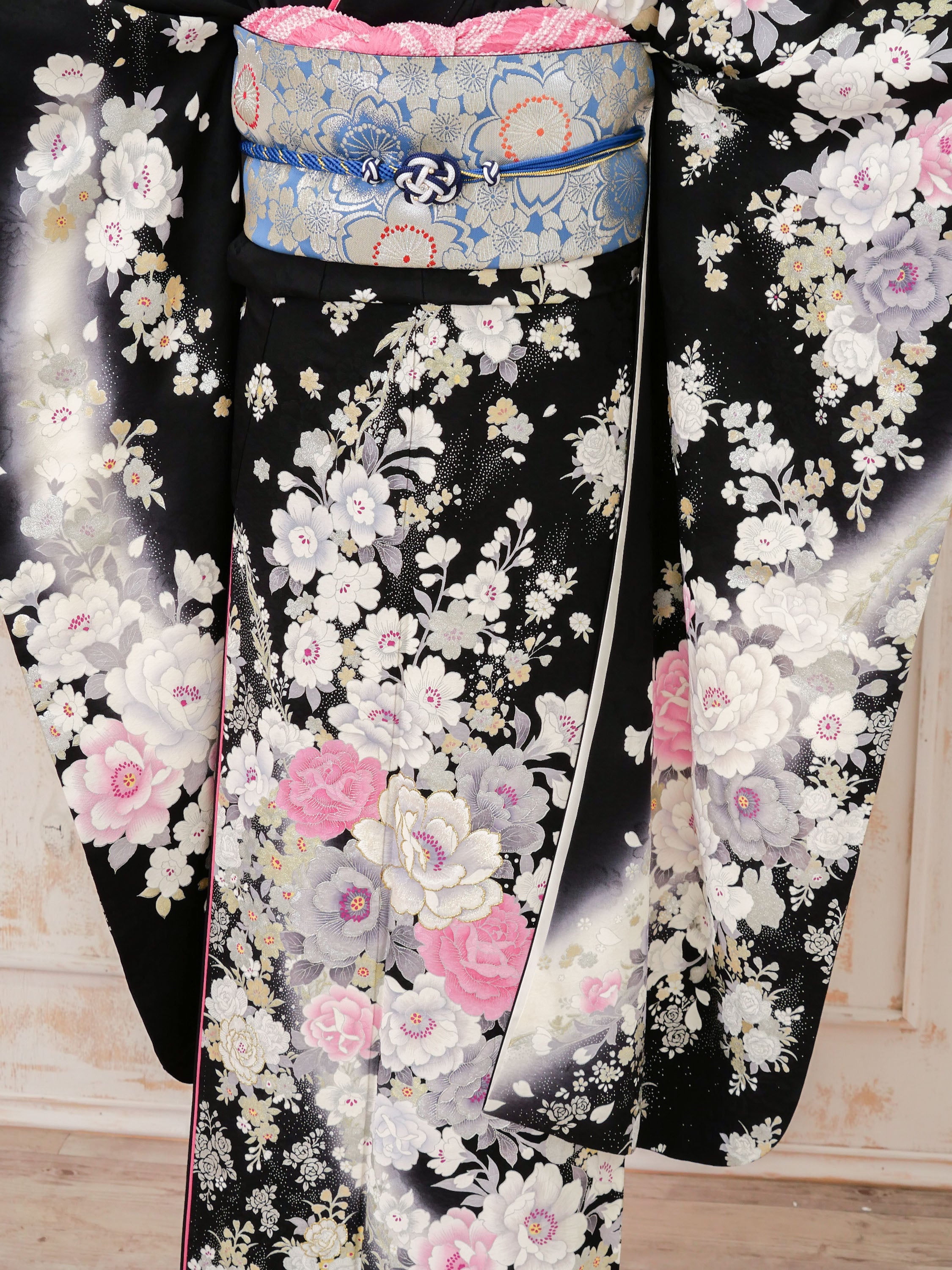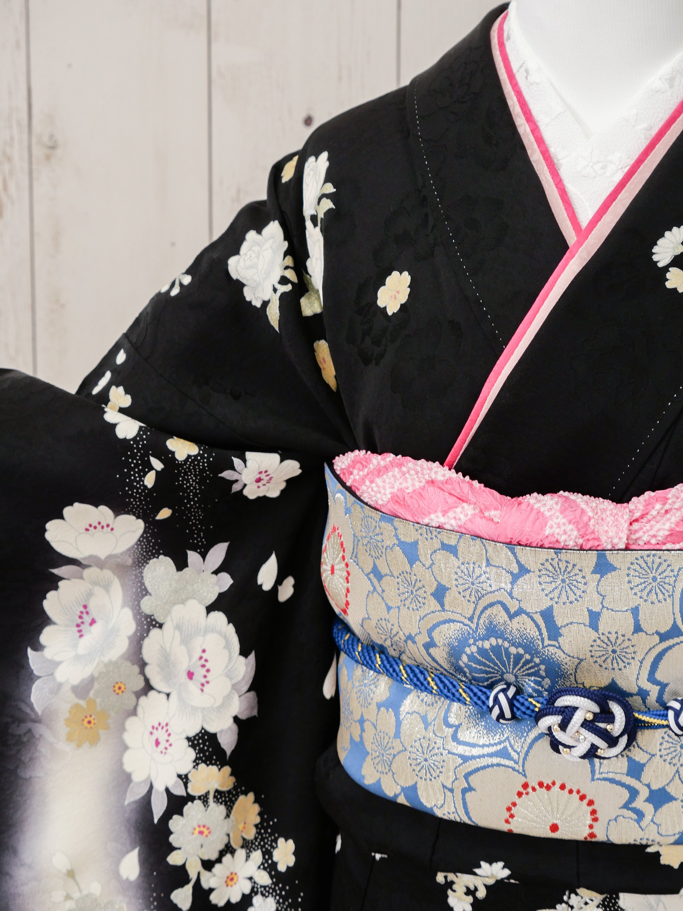 シックな黒地に白と淡いピンクの花々が咲き誇る、エレガントな振袖。繊細な花模様がまるで夜空に浮かぶ花束のように輝き、帯の青が洗練されたアクセントを添えます。落ち着いた色合いながらも華やかさを感じさせるデザインで、大人の女性らしい気品を演出。シンプルさと華やぎをバランス良く兼ね備えた一着です。