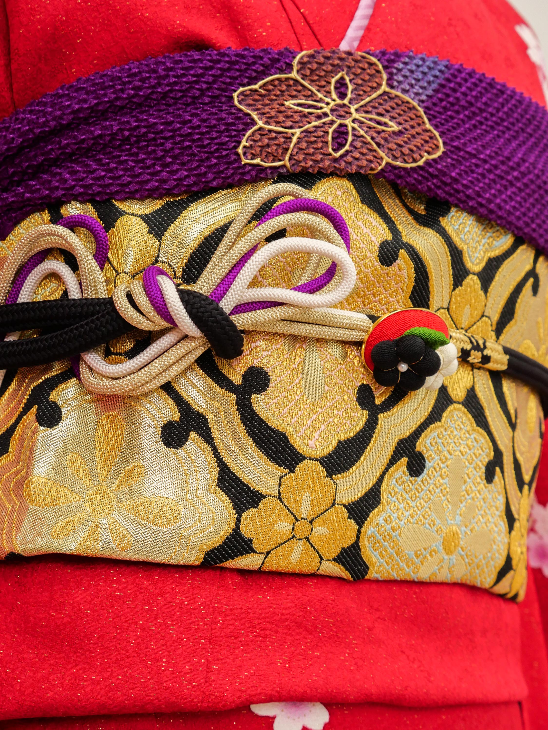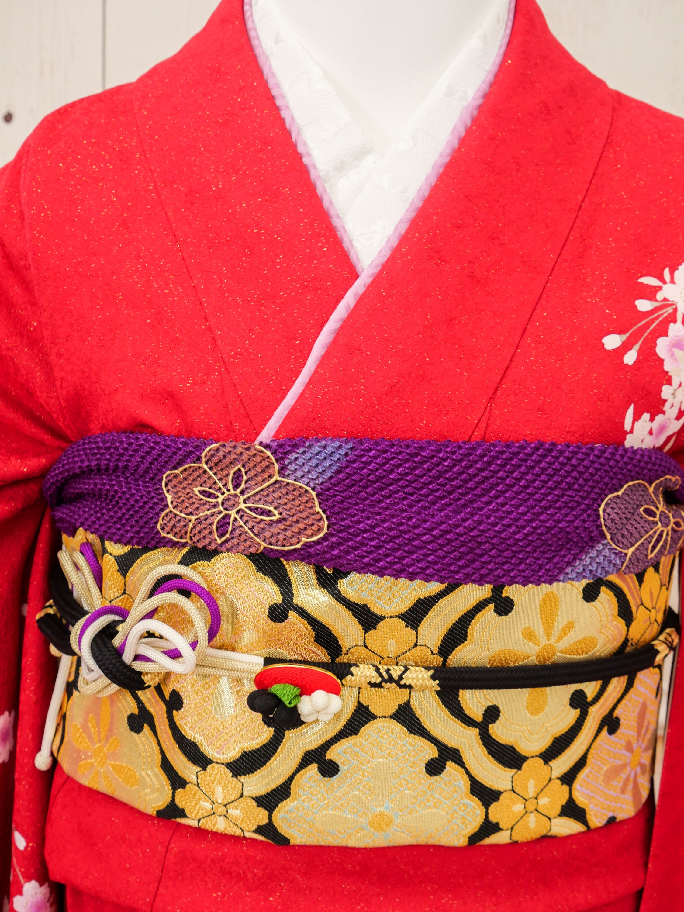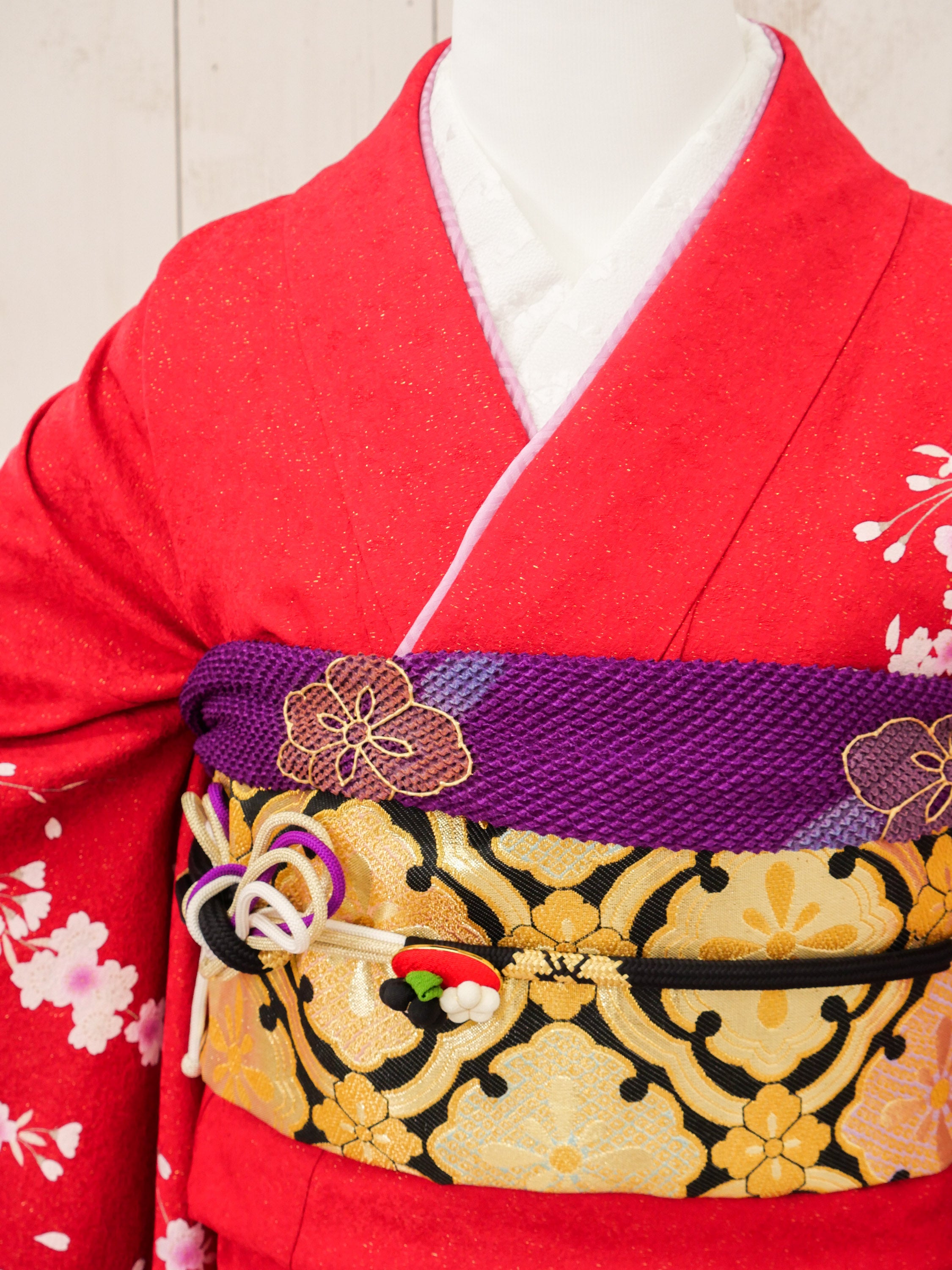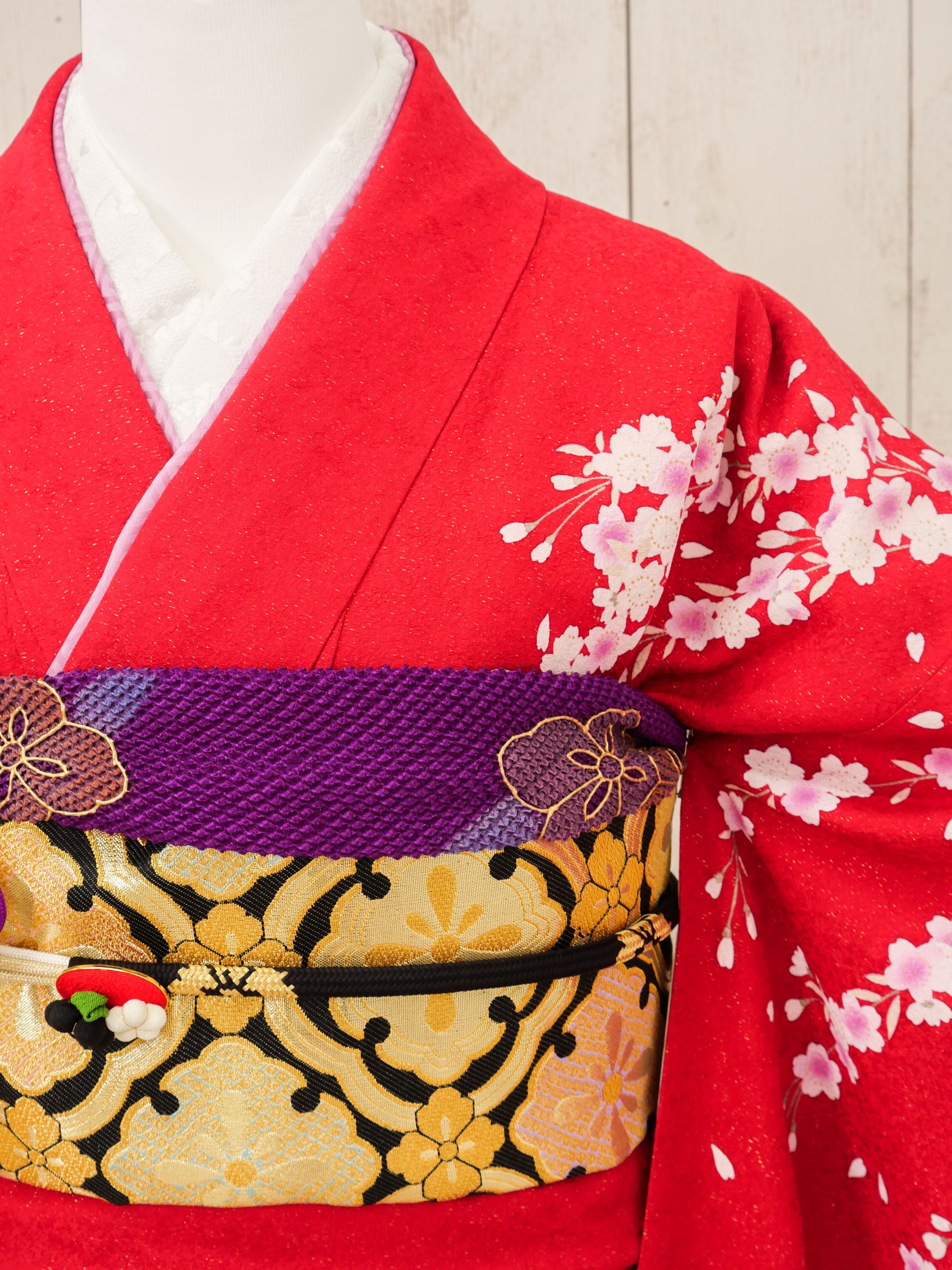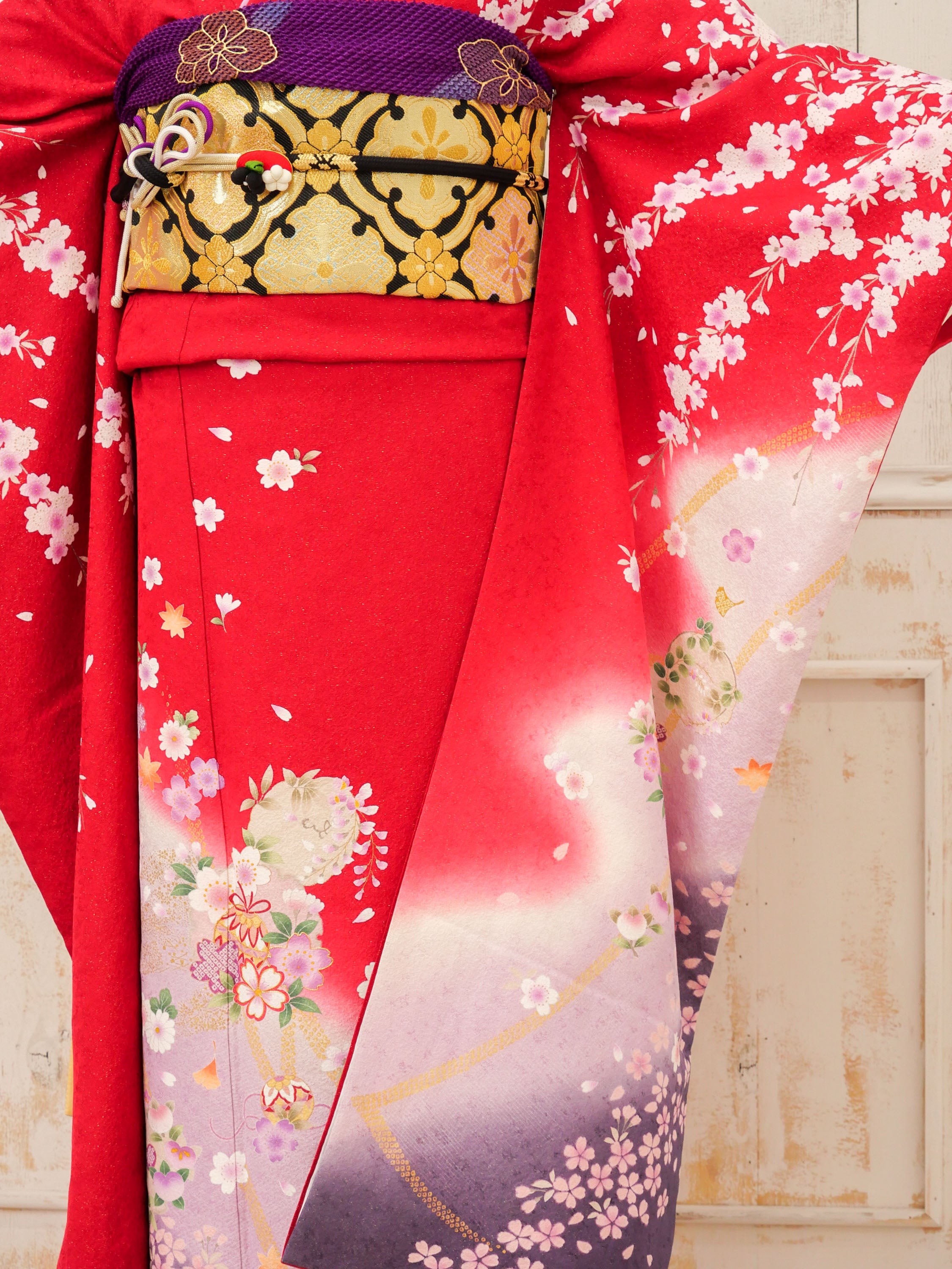 赤の地に小花が舞い散る、王道の古典美が魅力の一枚。裾の紫のぼかしと金の帯で引き締められた配色は、清楚ながらも華やかさを備え、世代を超えて愛されるデザインです。