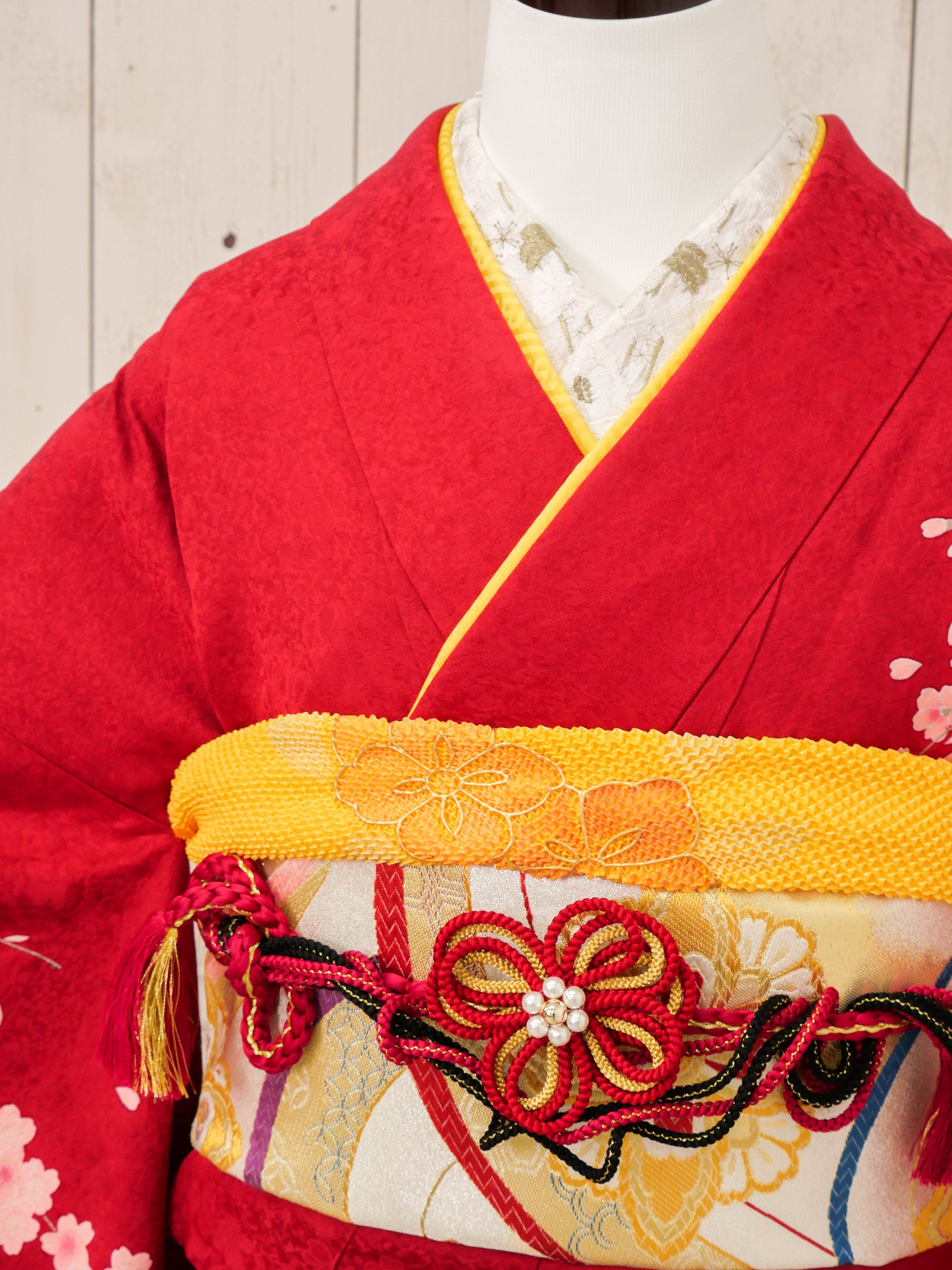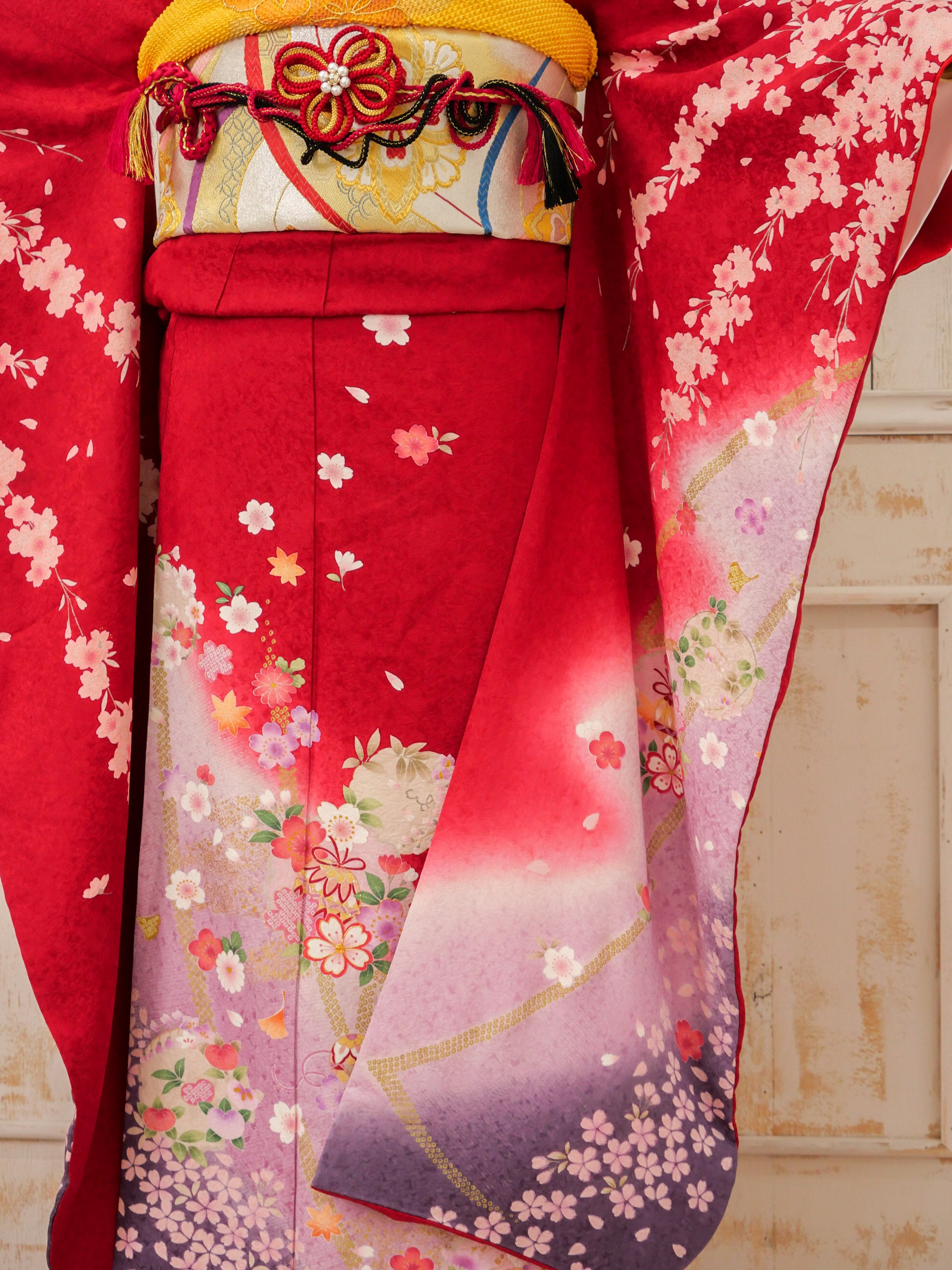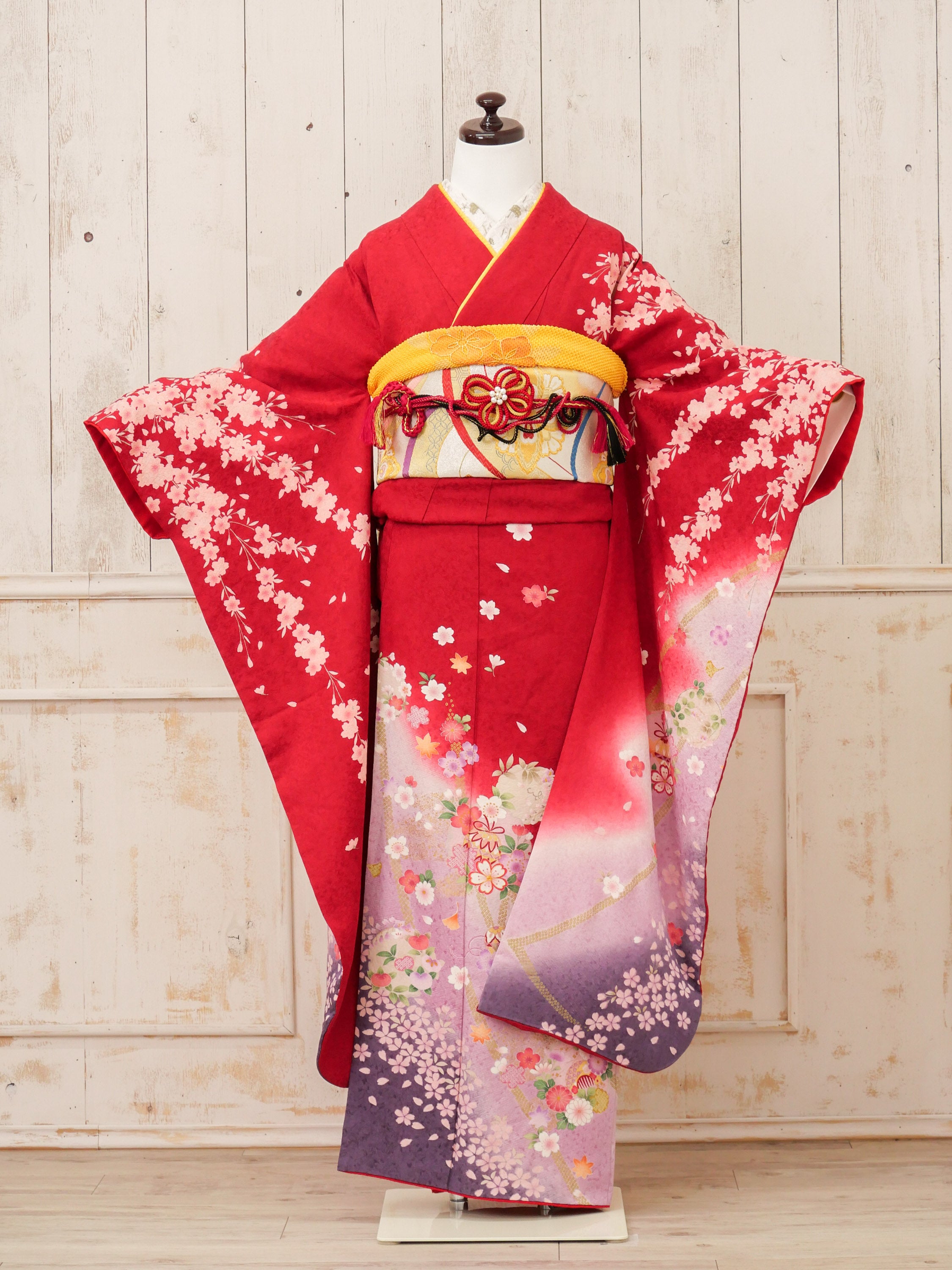 鮮やかな赤とピンクのグラデーションに、大輪の花々が華やかに咲き誇る華やか系振袖。金の帯と赤の小物が明るさを引き立て、元気で晴れやかな印象に。お祝いムードを存分に高めてくれる王道の一着です。