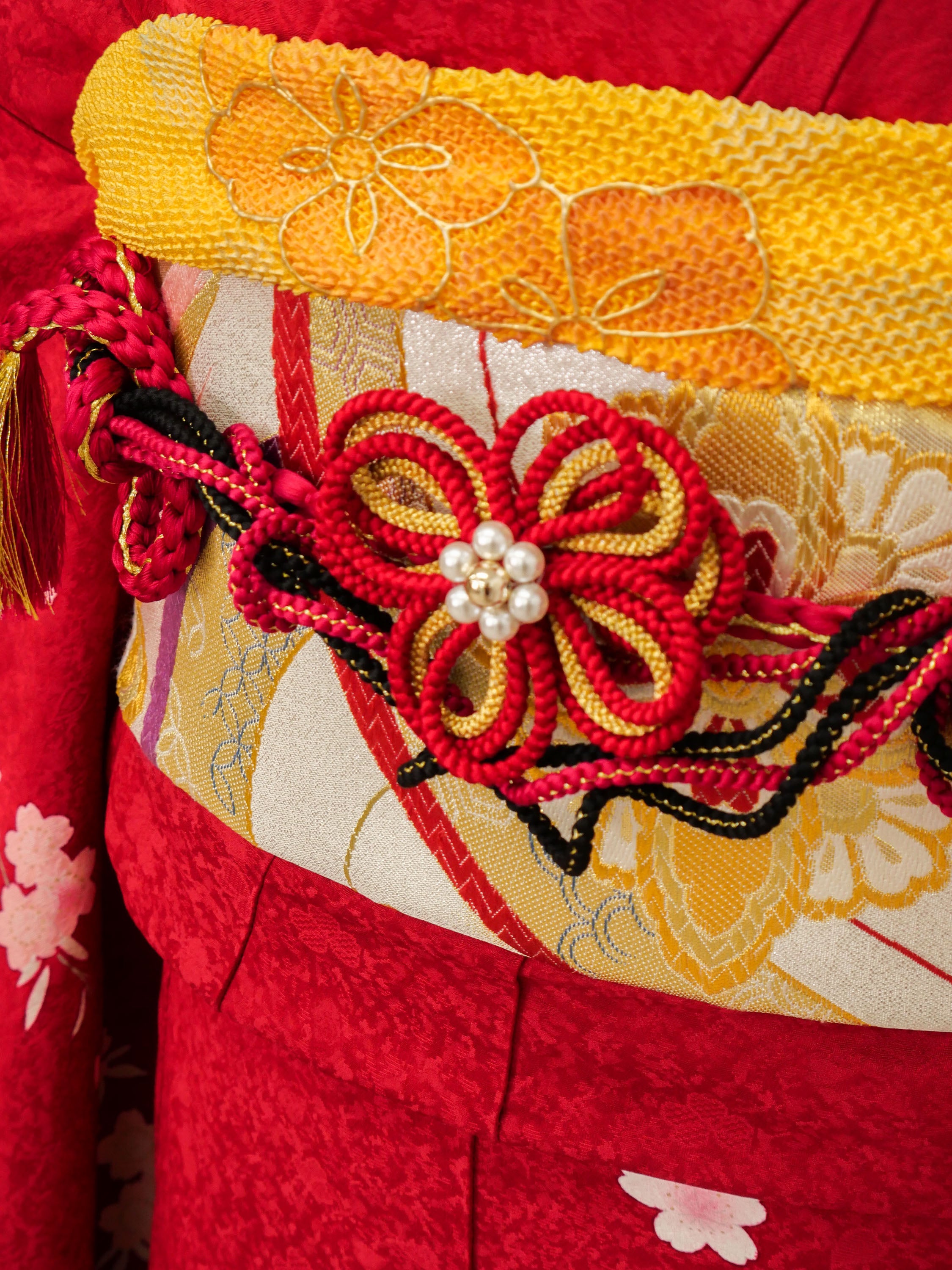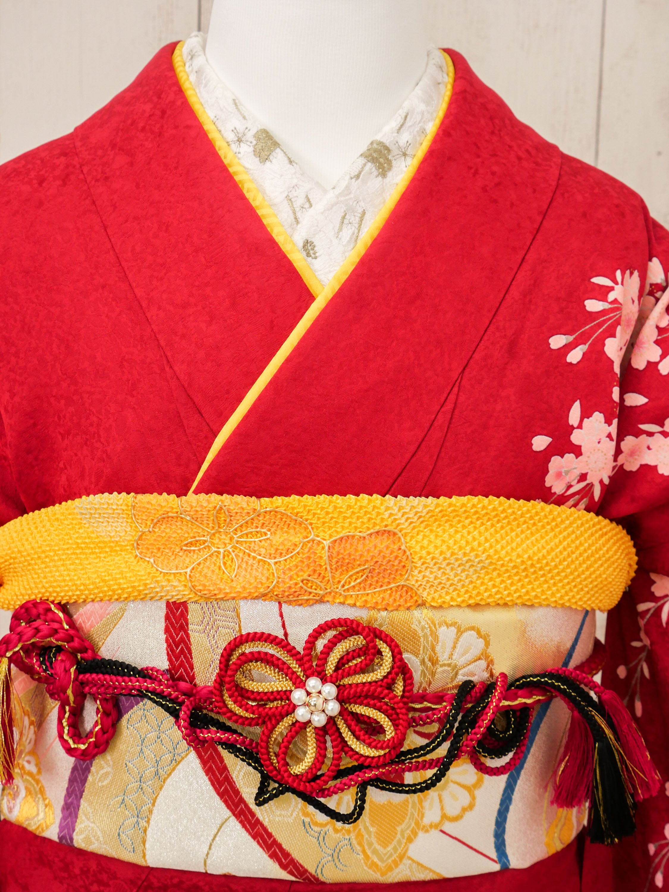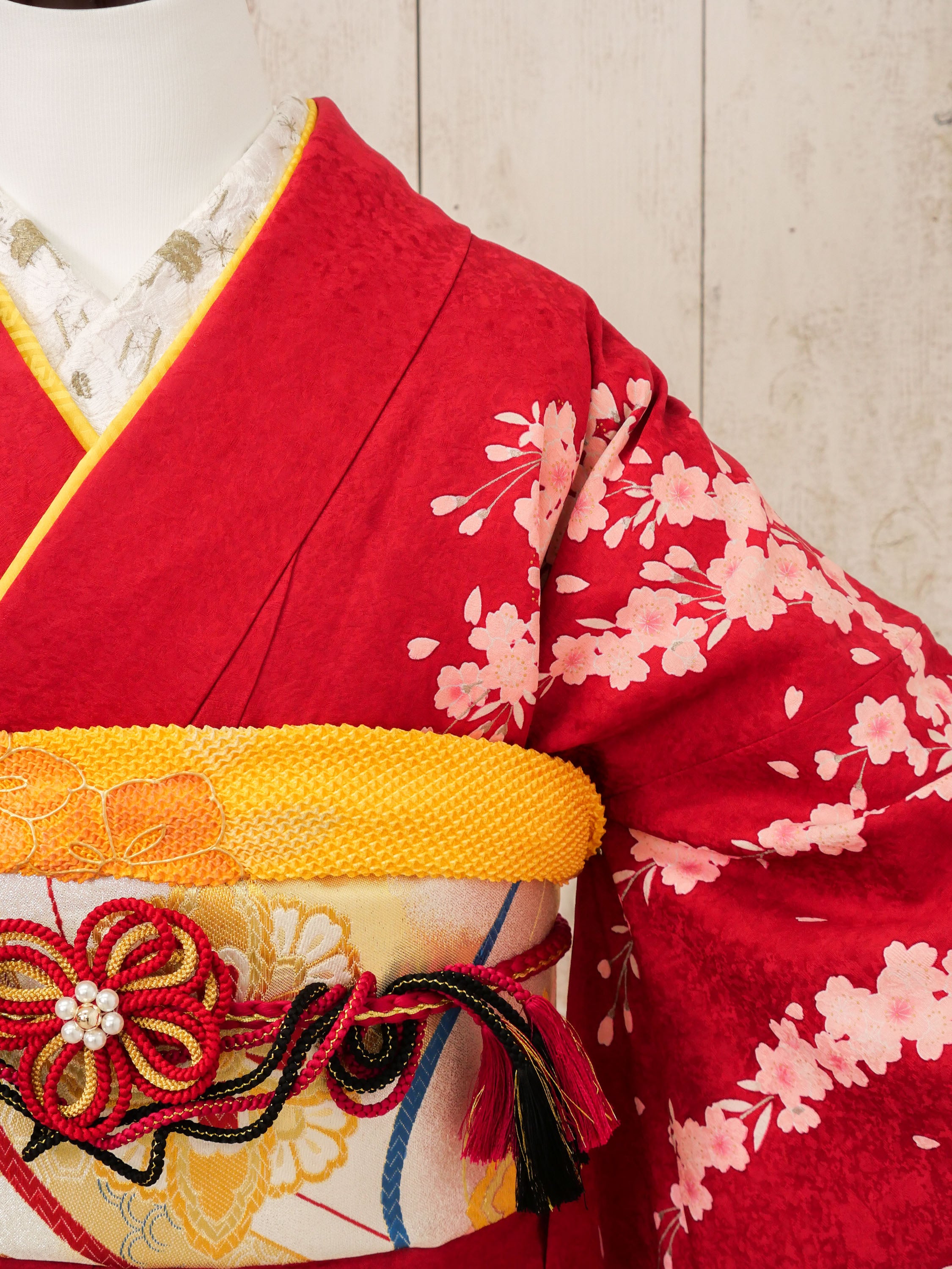 鮮やかな赤とピンクのグラデーションに、大輪の花々が華やかに咲き誇る華やか系振袖。金の帯と赤の小物が明るさを引き立て、元気で晴れやかな印象に。お祝いムードを存分に高めてくれる王道の一着です。