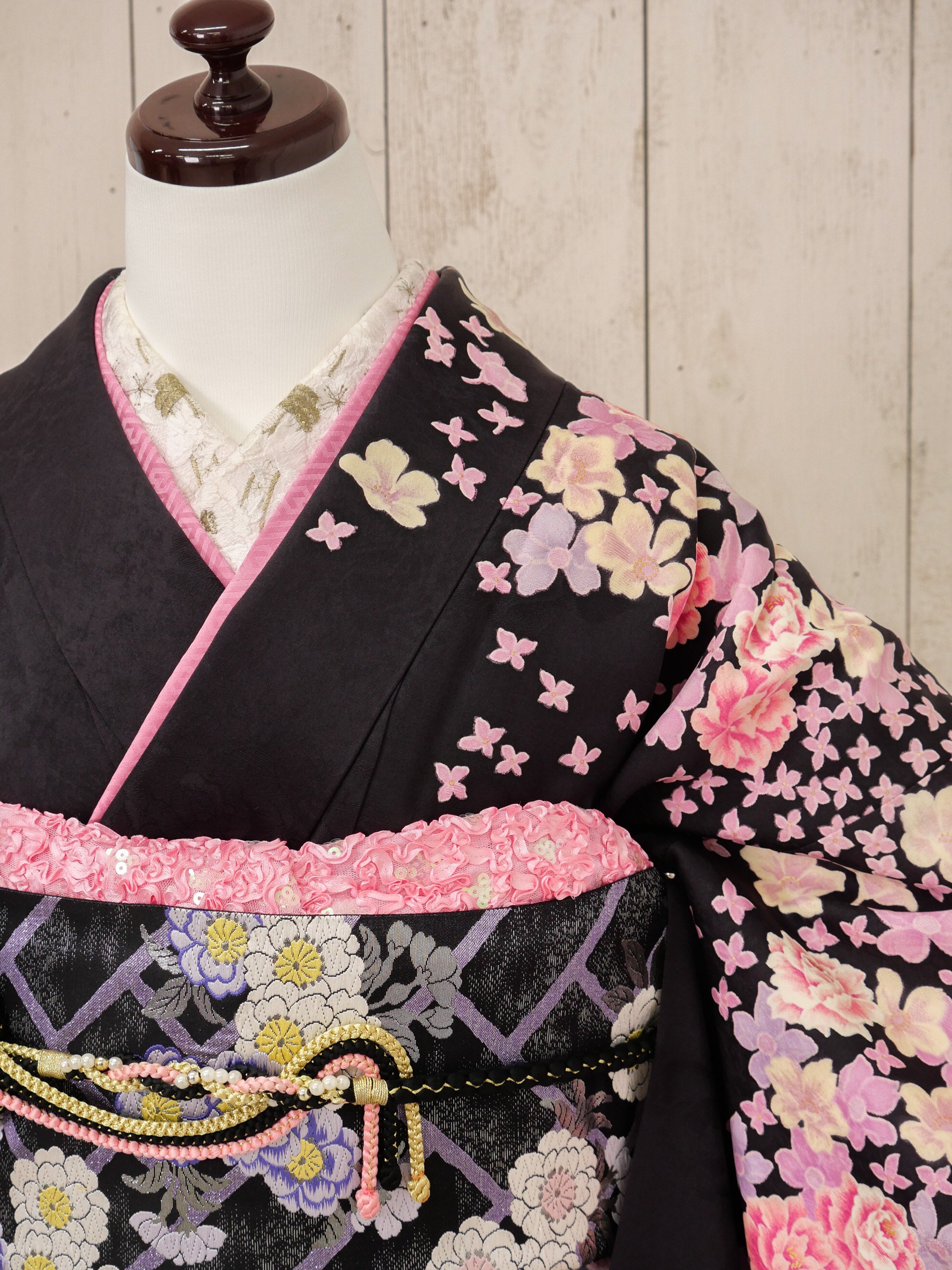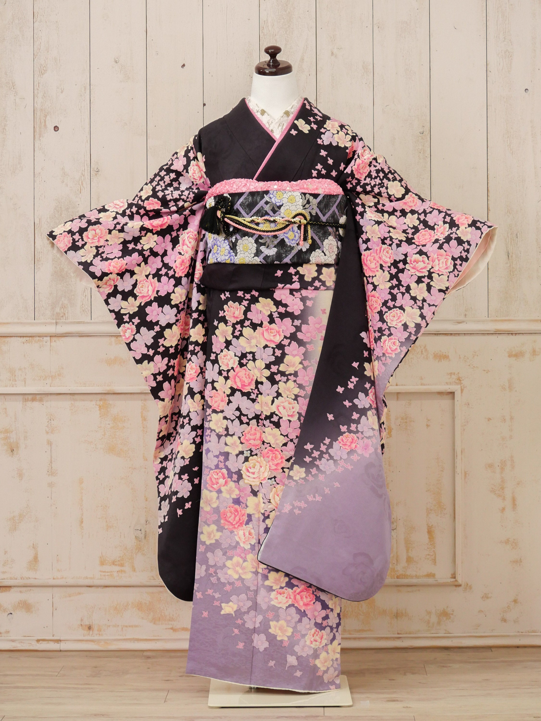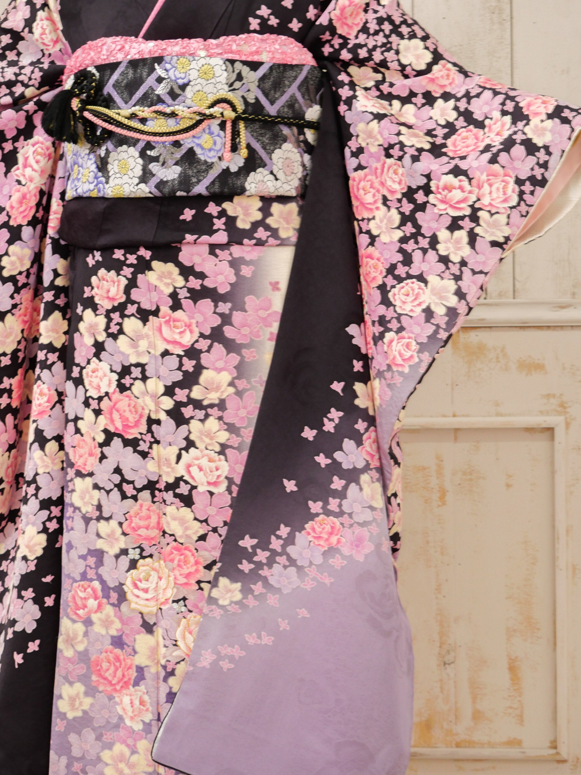 黒とラベンダーのコントラストが映える個性派振袖。満開のバラと舞い散る桜が幻想的に描かれ、甘さの中に強さを秘めた大人ガーリースタイルに。