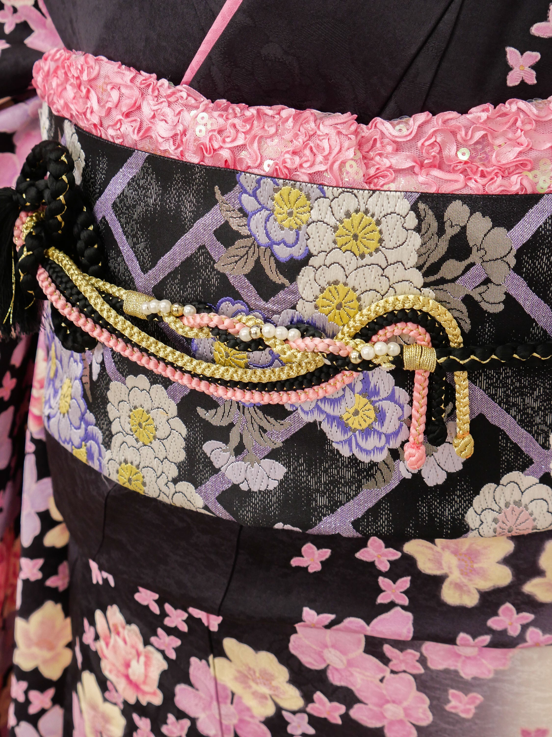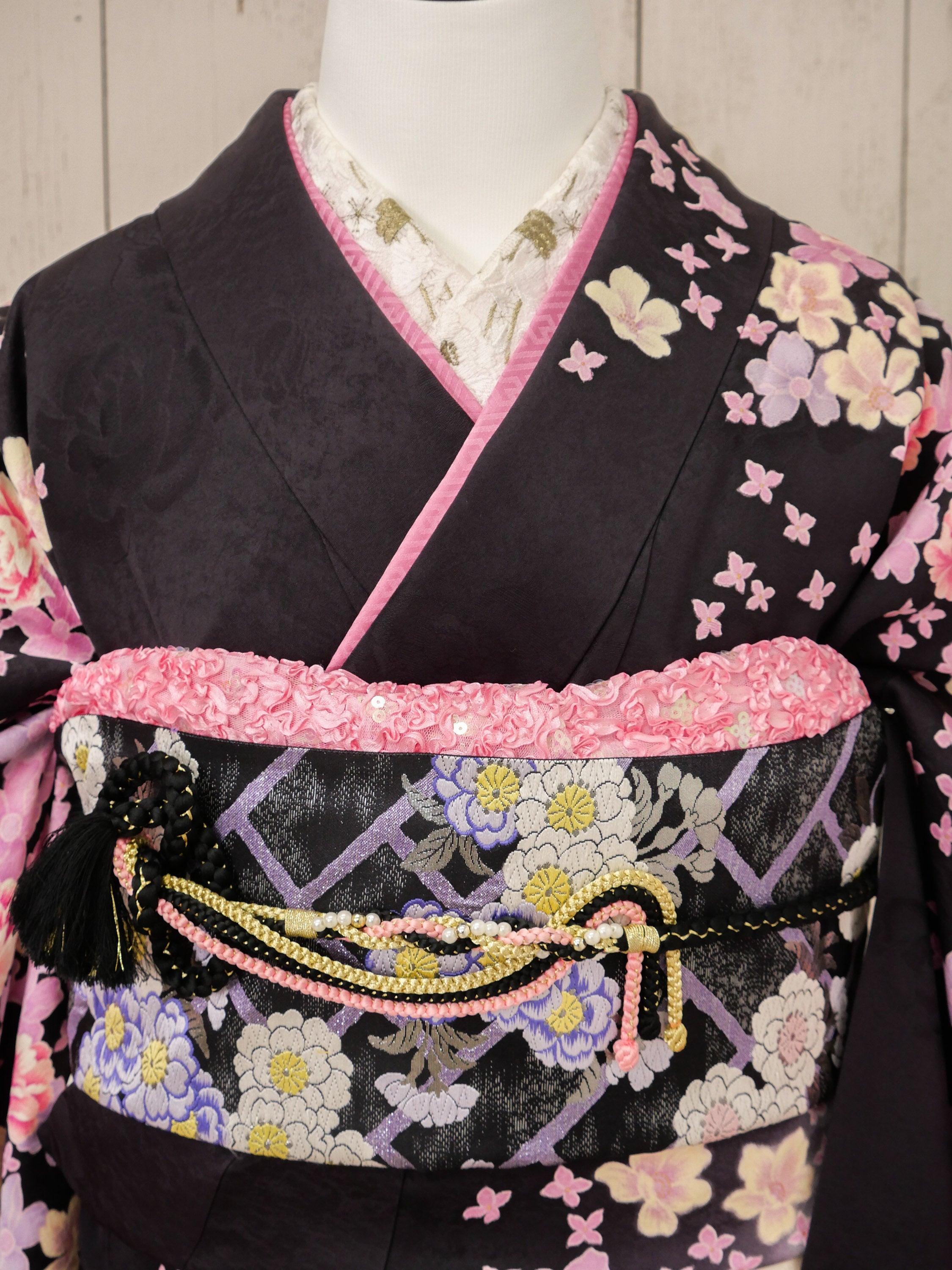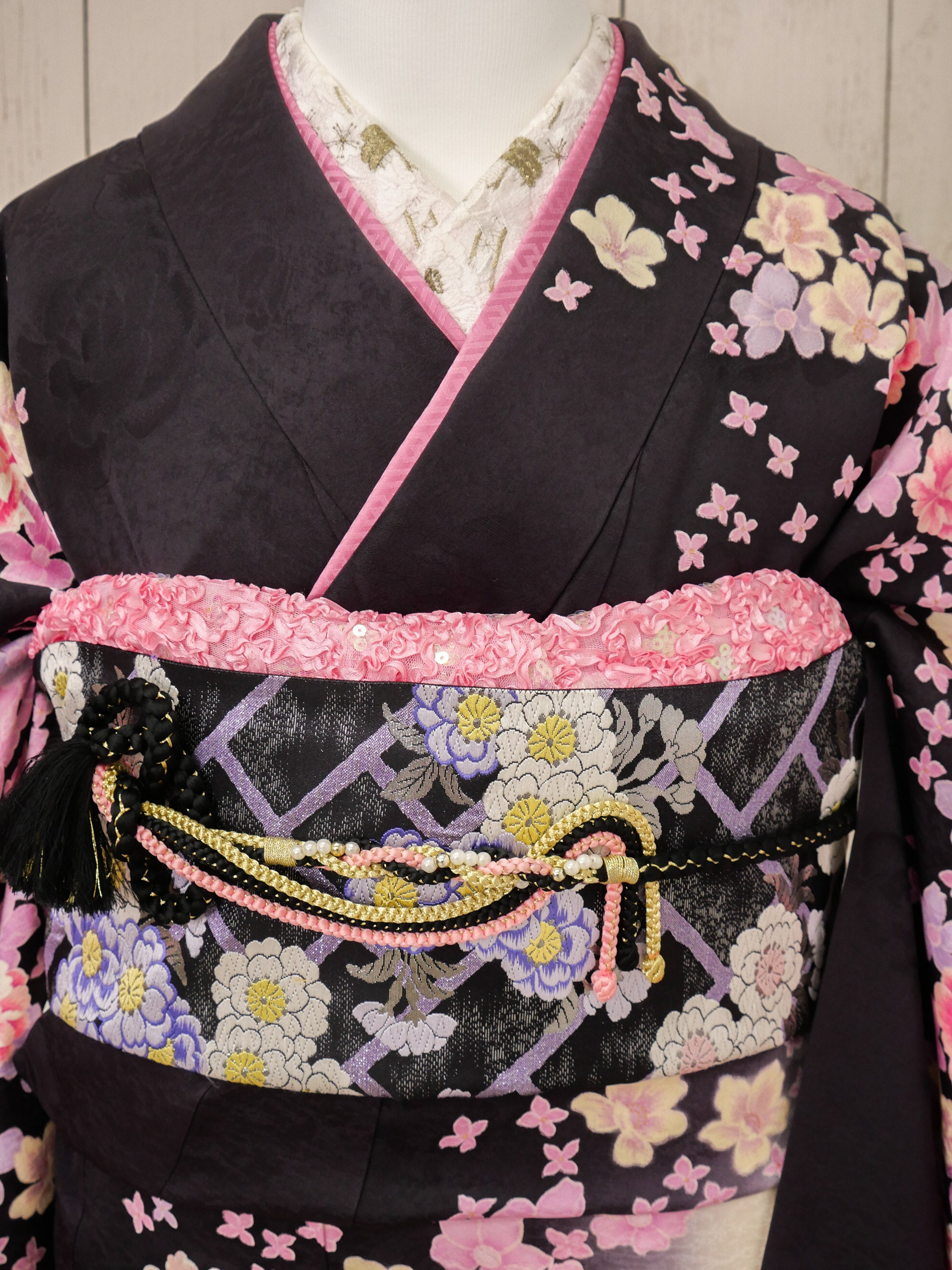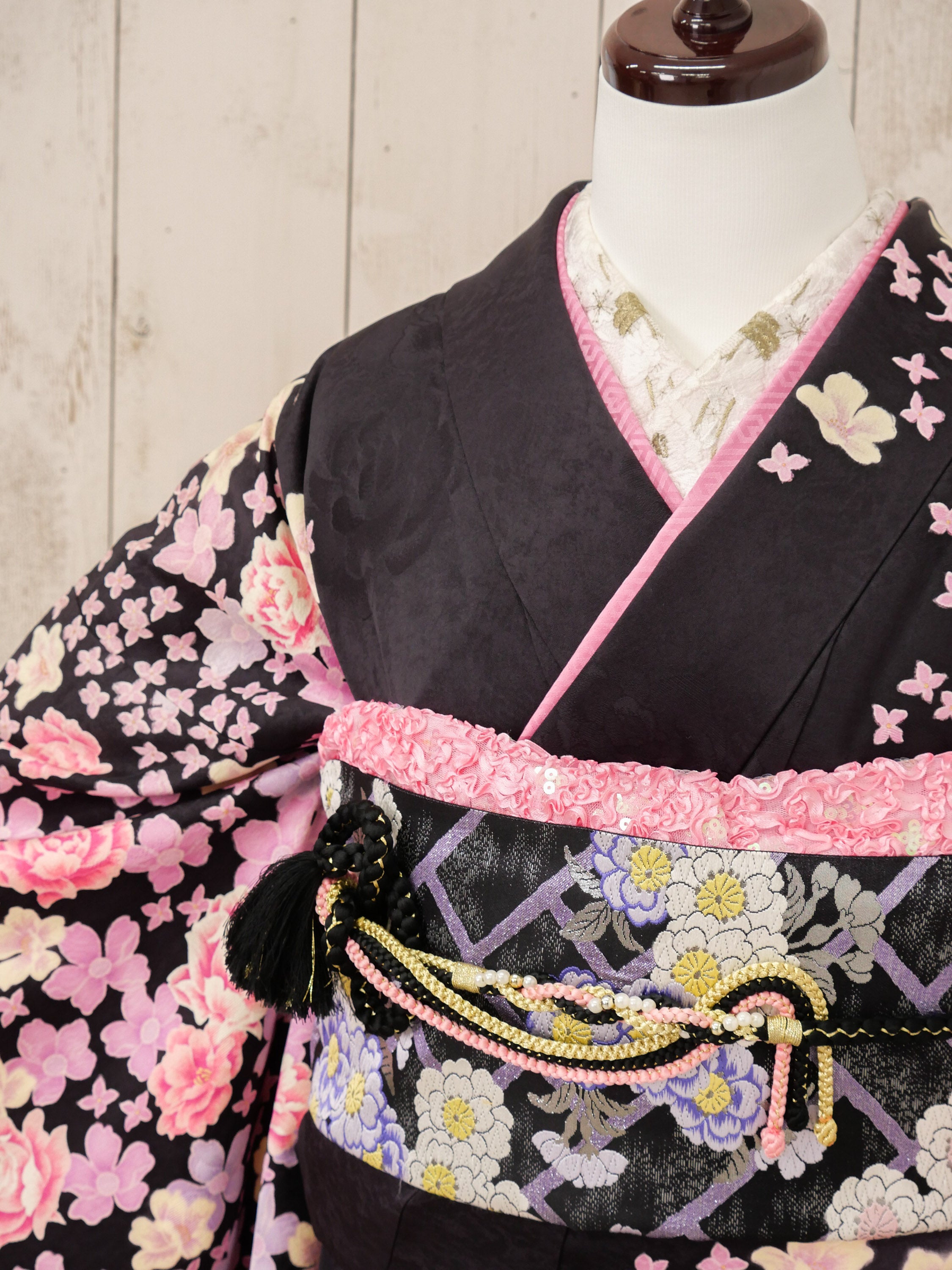 黒とラベンダーのコントラストが映える個性派振袖。満開のバラと舞い散る桜が幻想的に描かれ、甘さの中に強さを秘めた大人ガーリースタイルに。