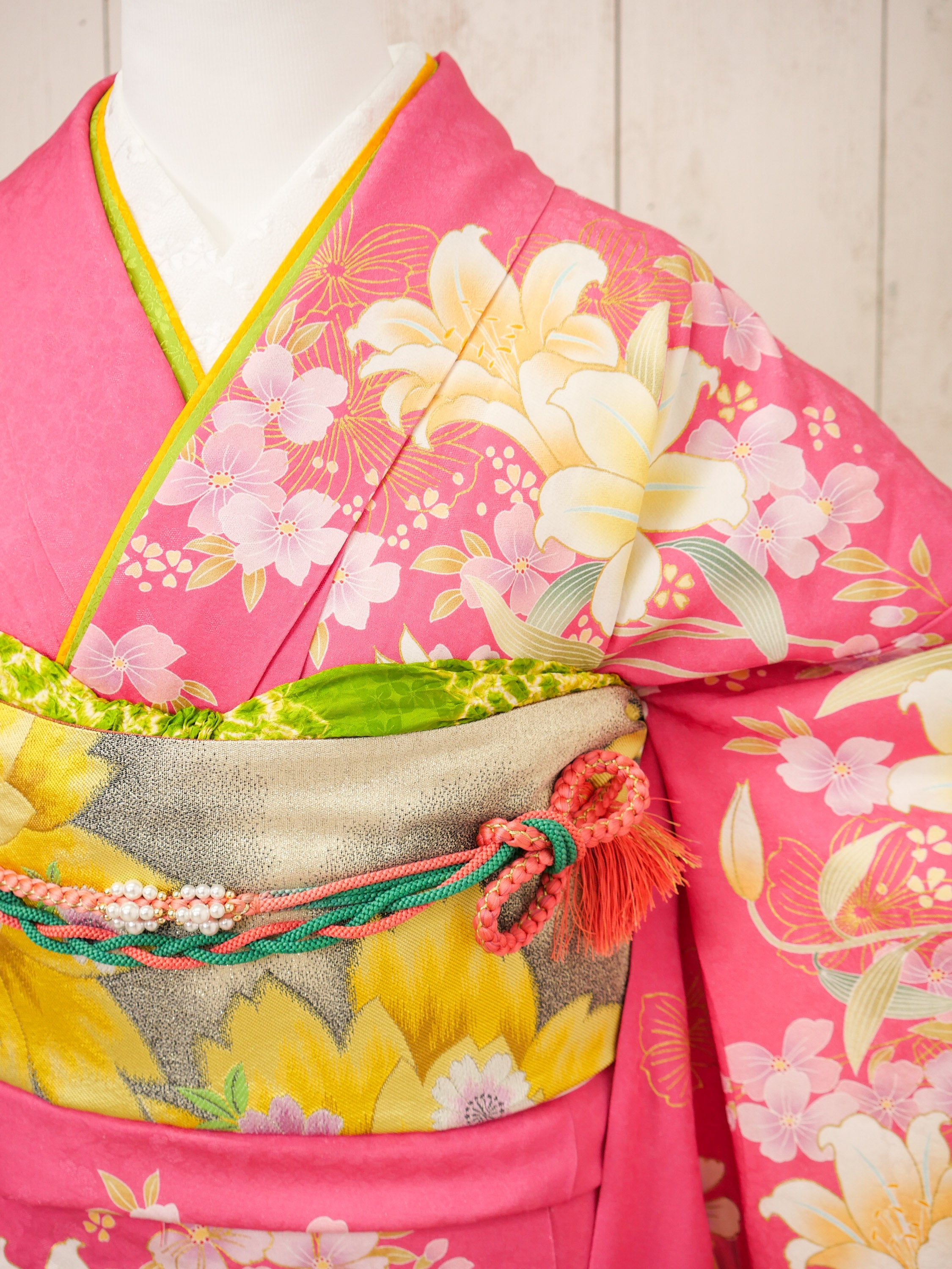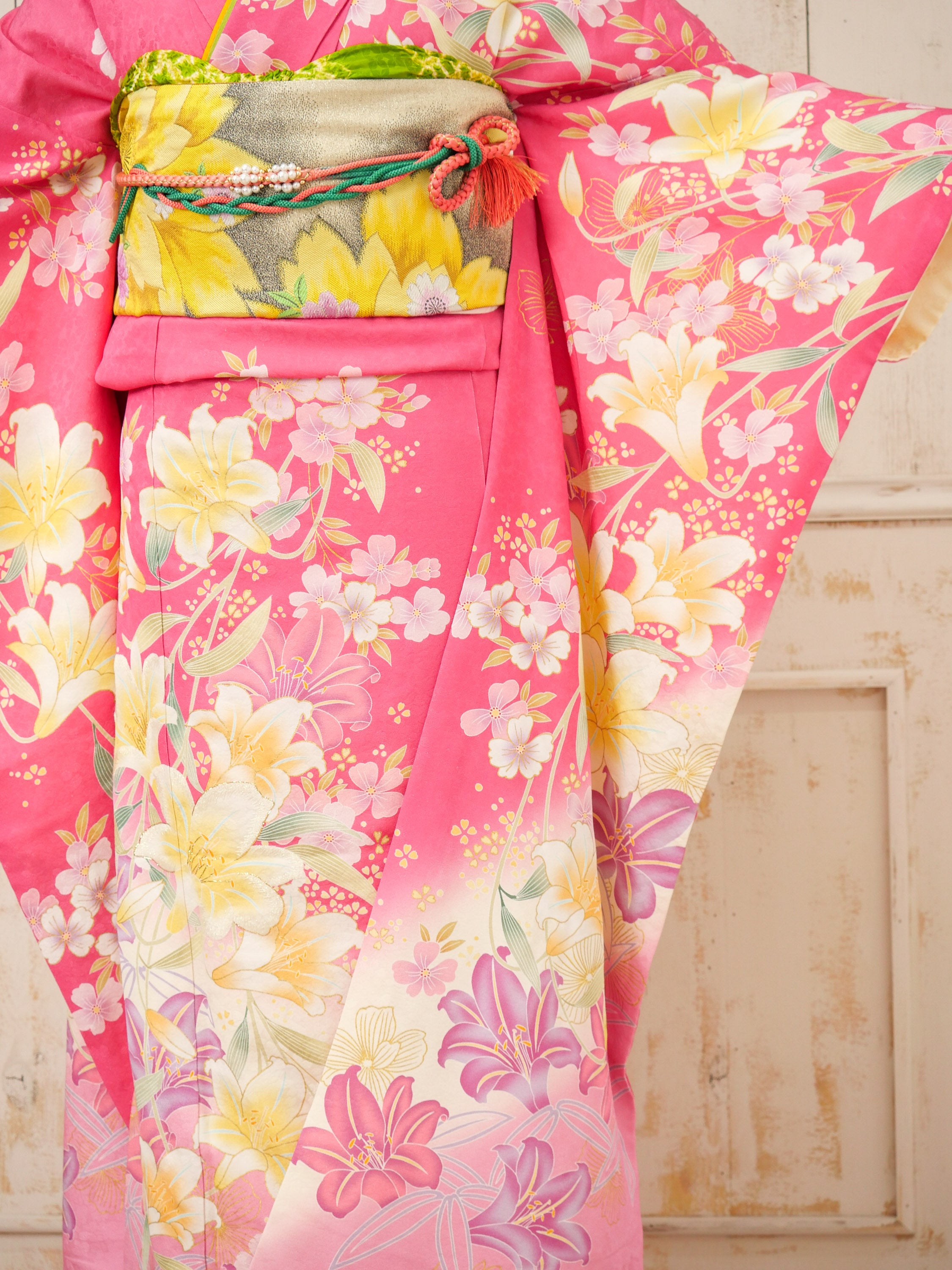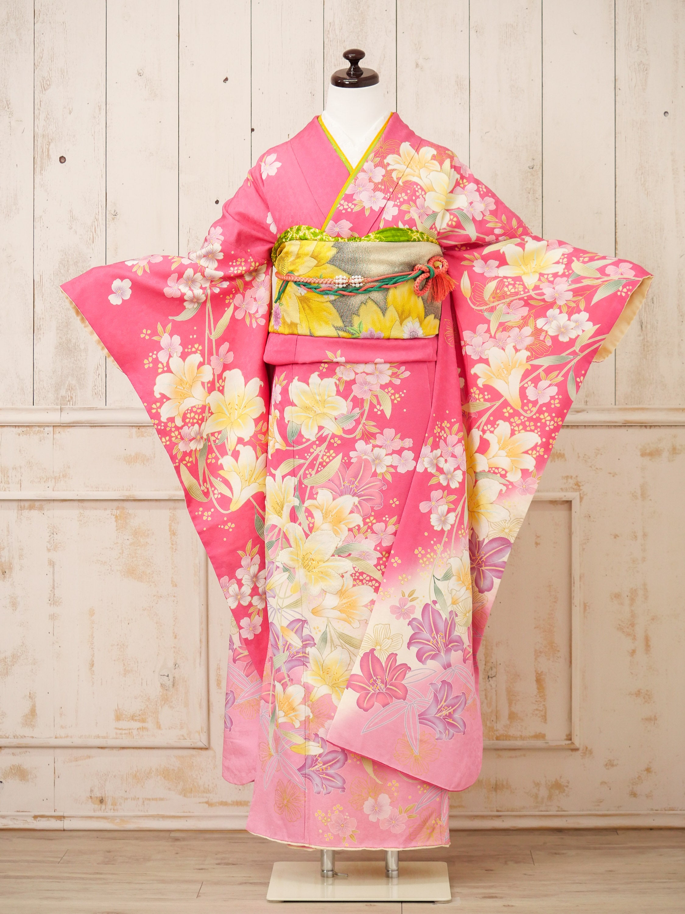 濃いピンク地に咲き誇る白と黄の百合が印象的な振袖。全体に流れるような柄配置がスタイルを美しく魅せ、元気で明るい印象を与えてくれる一枚です。