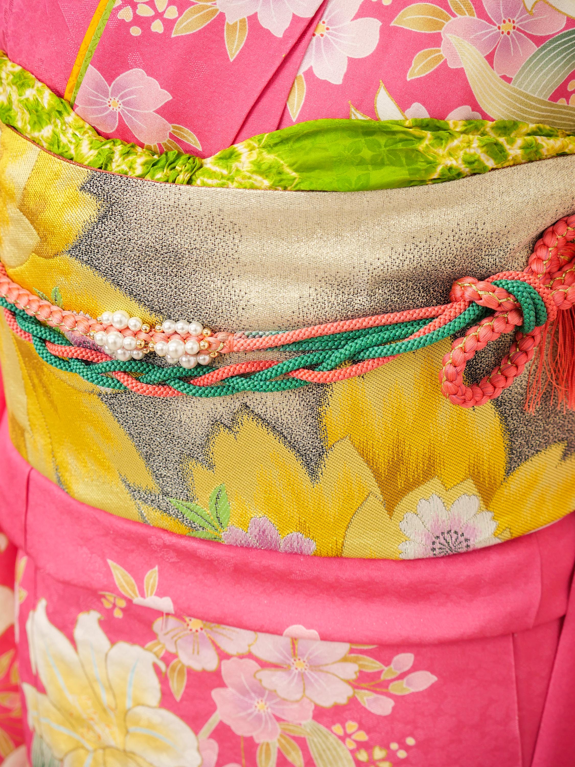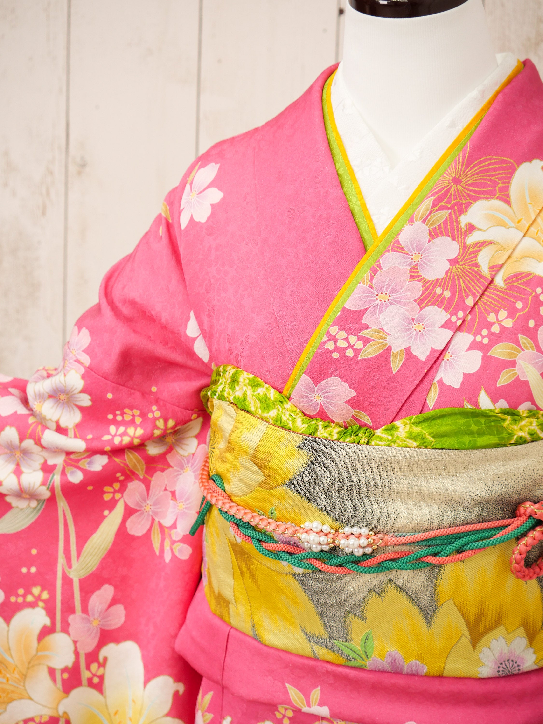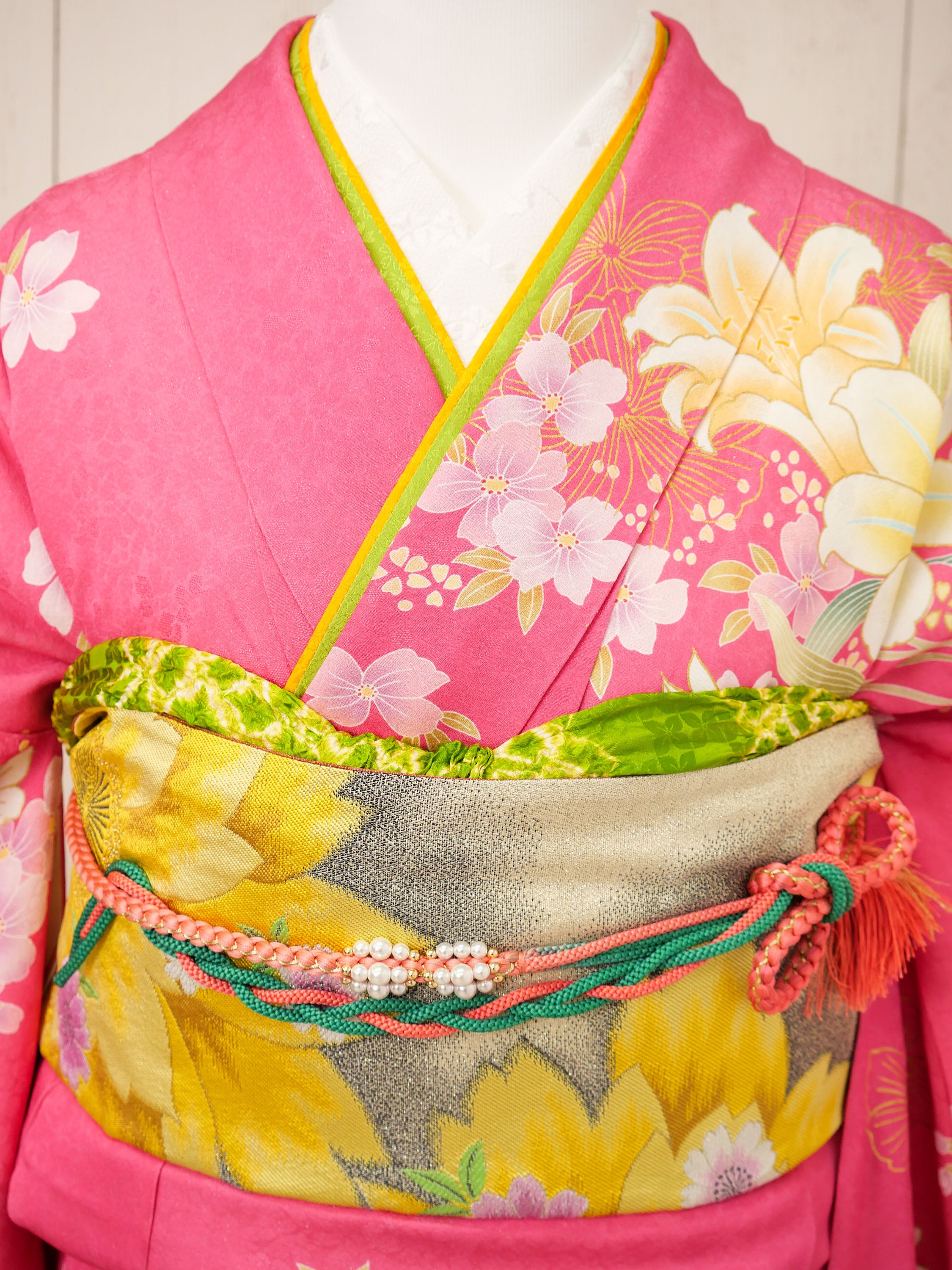 濃いピンク地に咲き誇る白と黄の百合が印象的な振袖。全体に流れるような柄配置がスタイルを美しく魅せ、元気で明るい印象を与えてくれる一枚です。