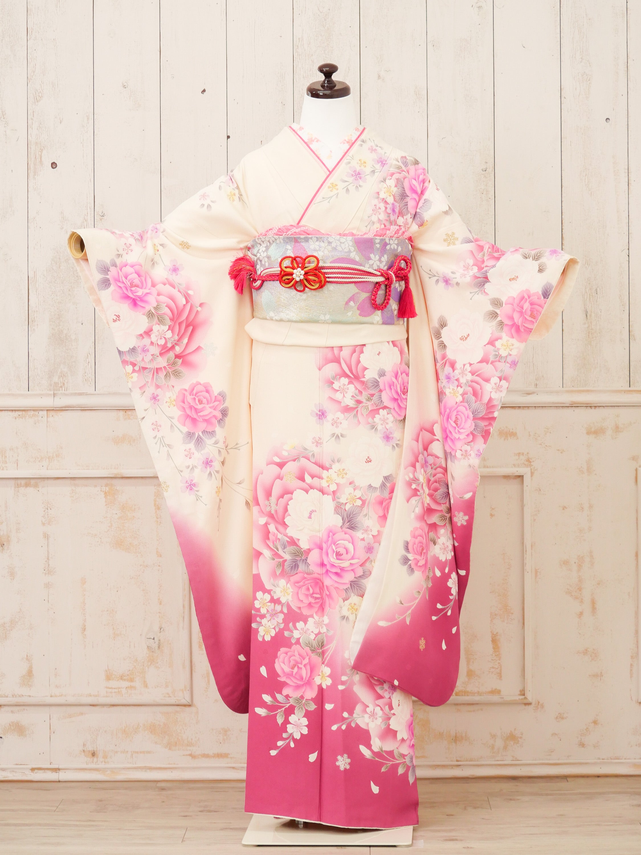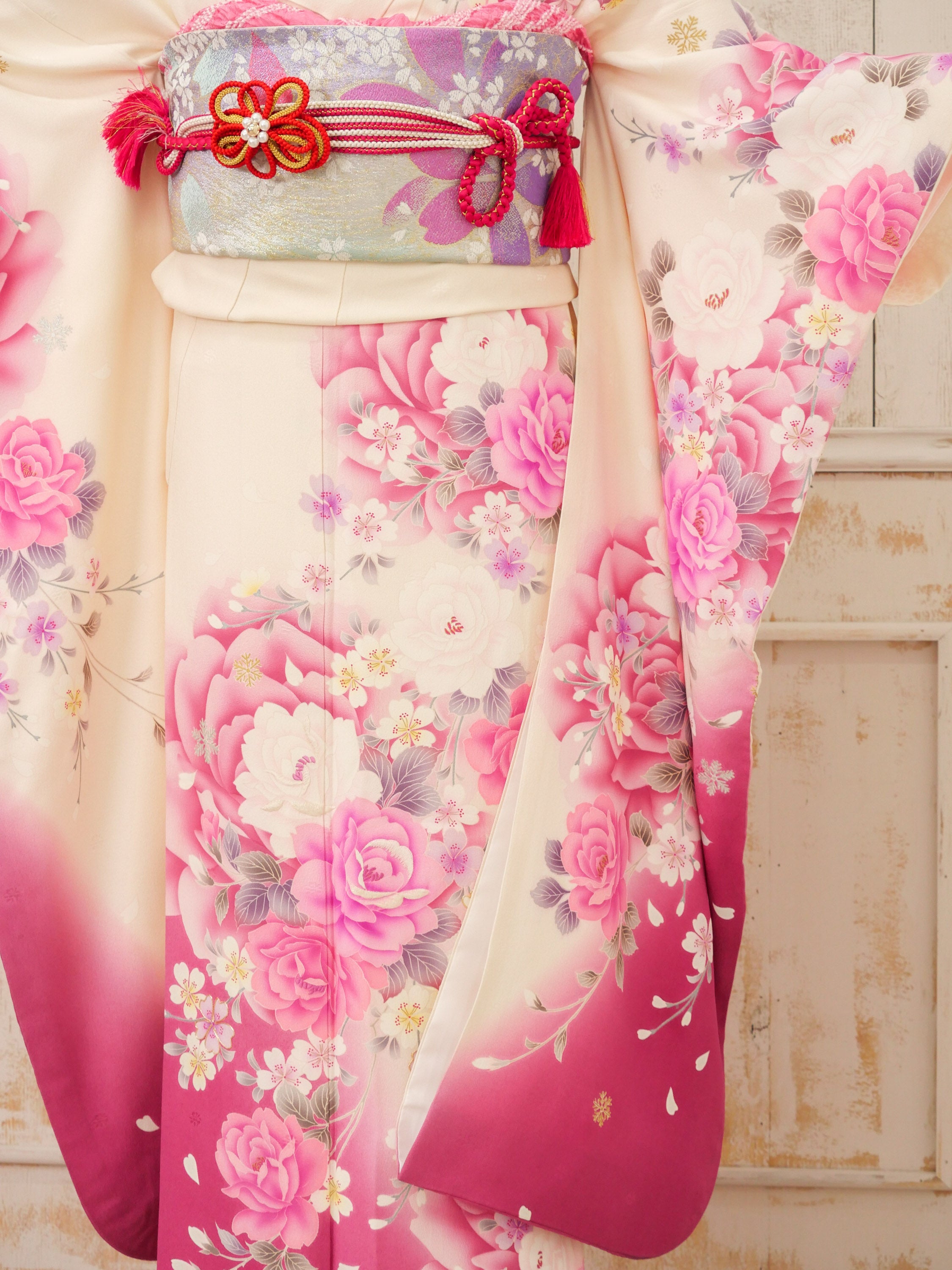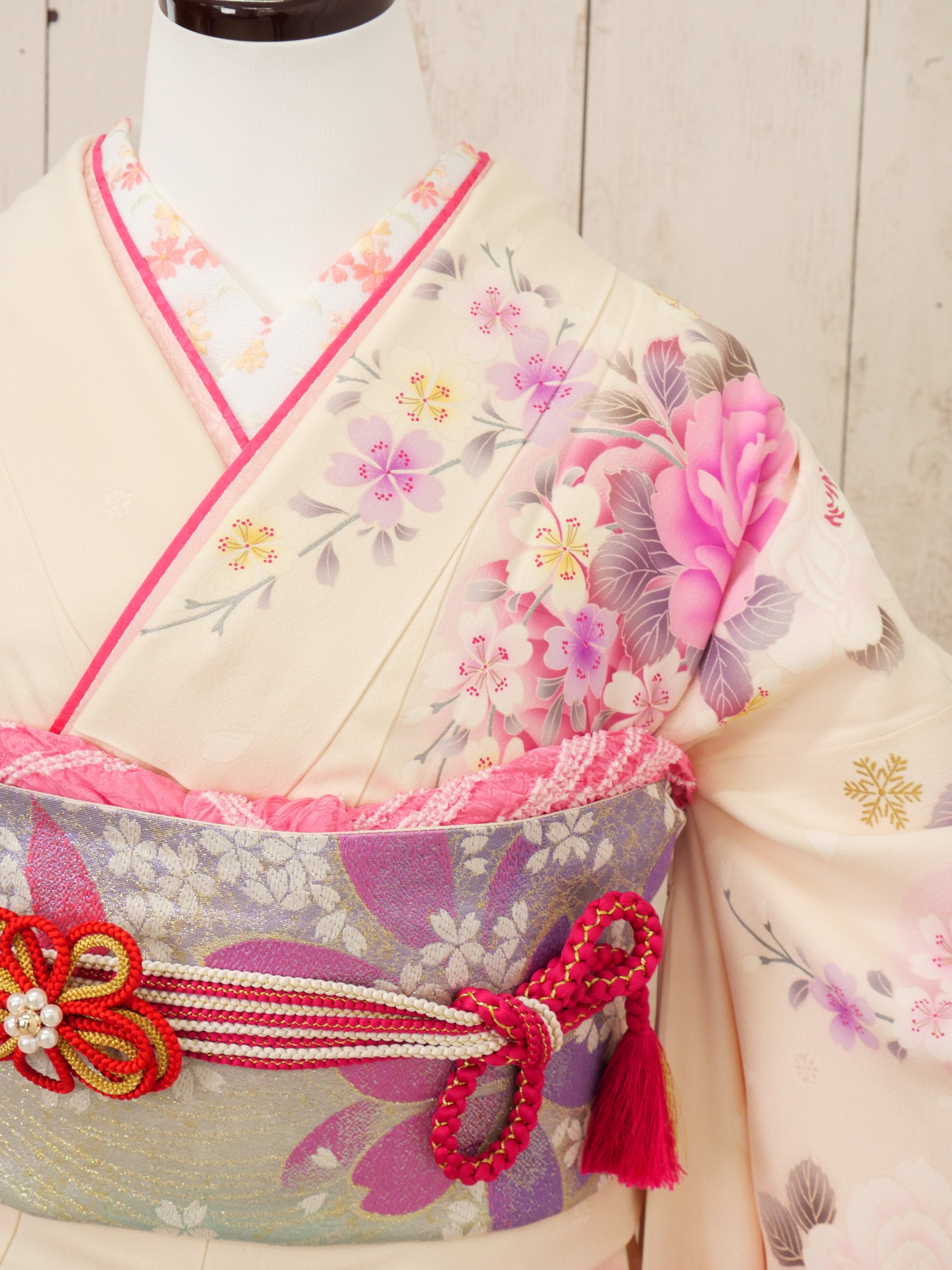 淡いベージュ地に華やかなピンクの牡丹が咲き誇る、優雅で女性らしい振袖。やわらかな印象で、清楚かつ華やかな晴れ姿を演出します。