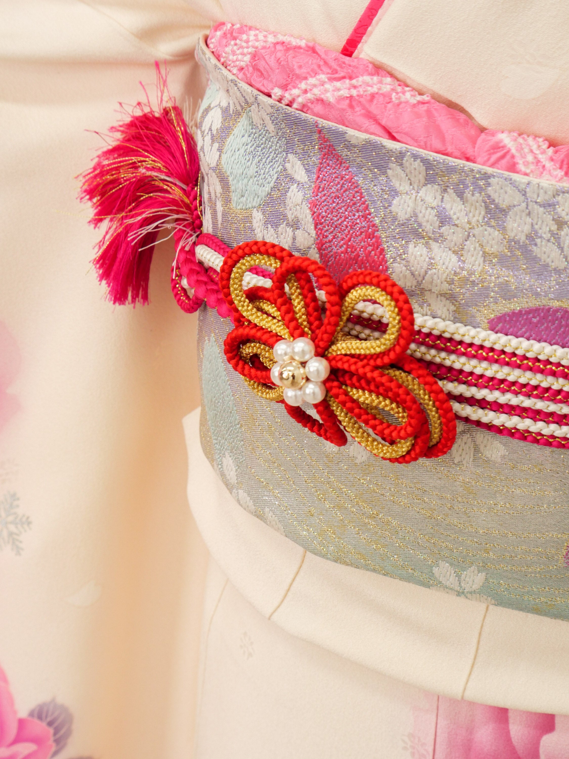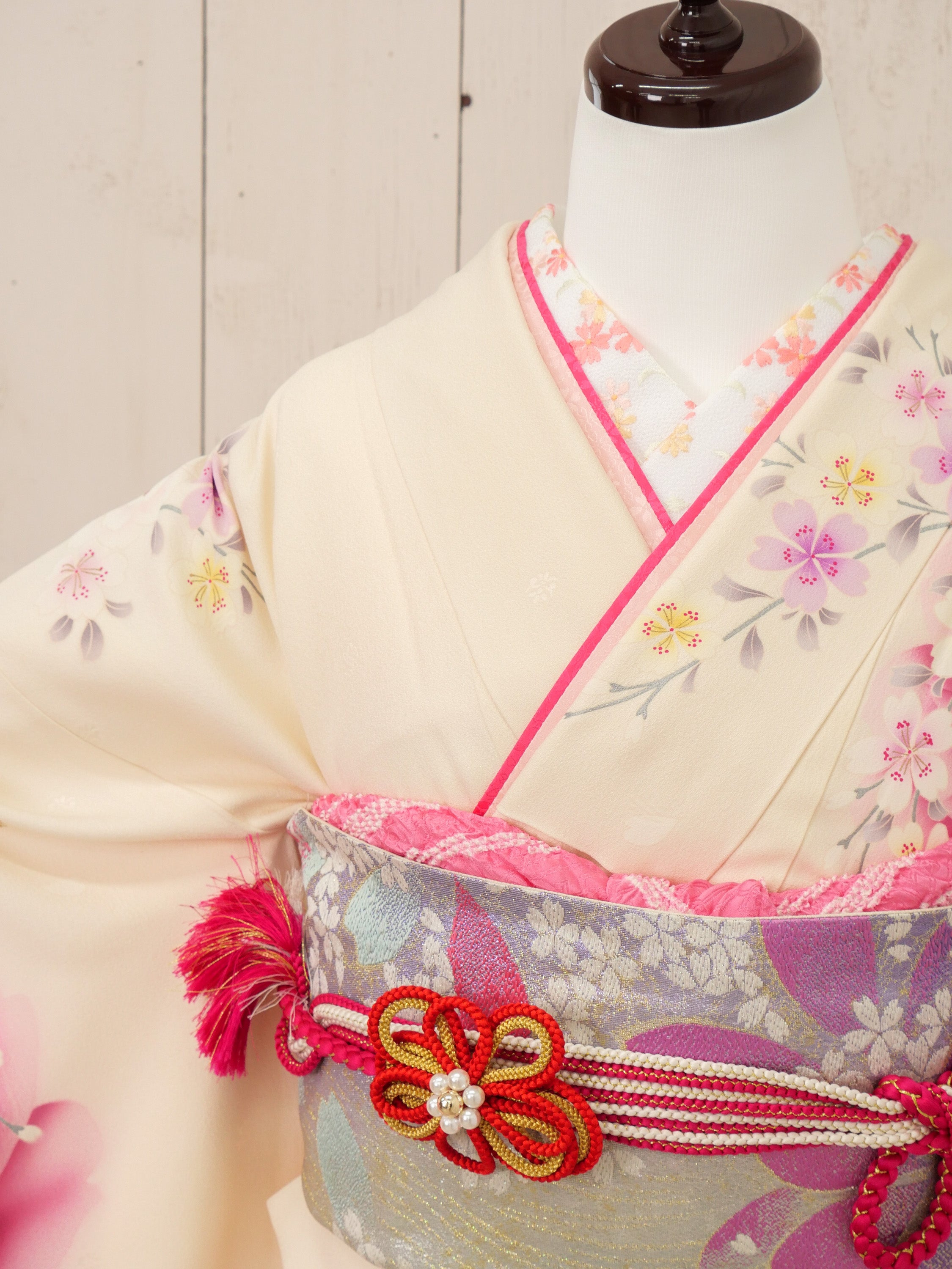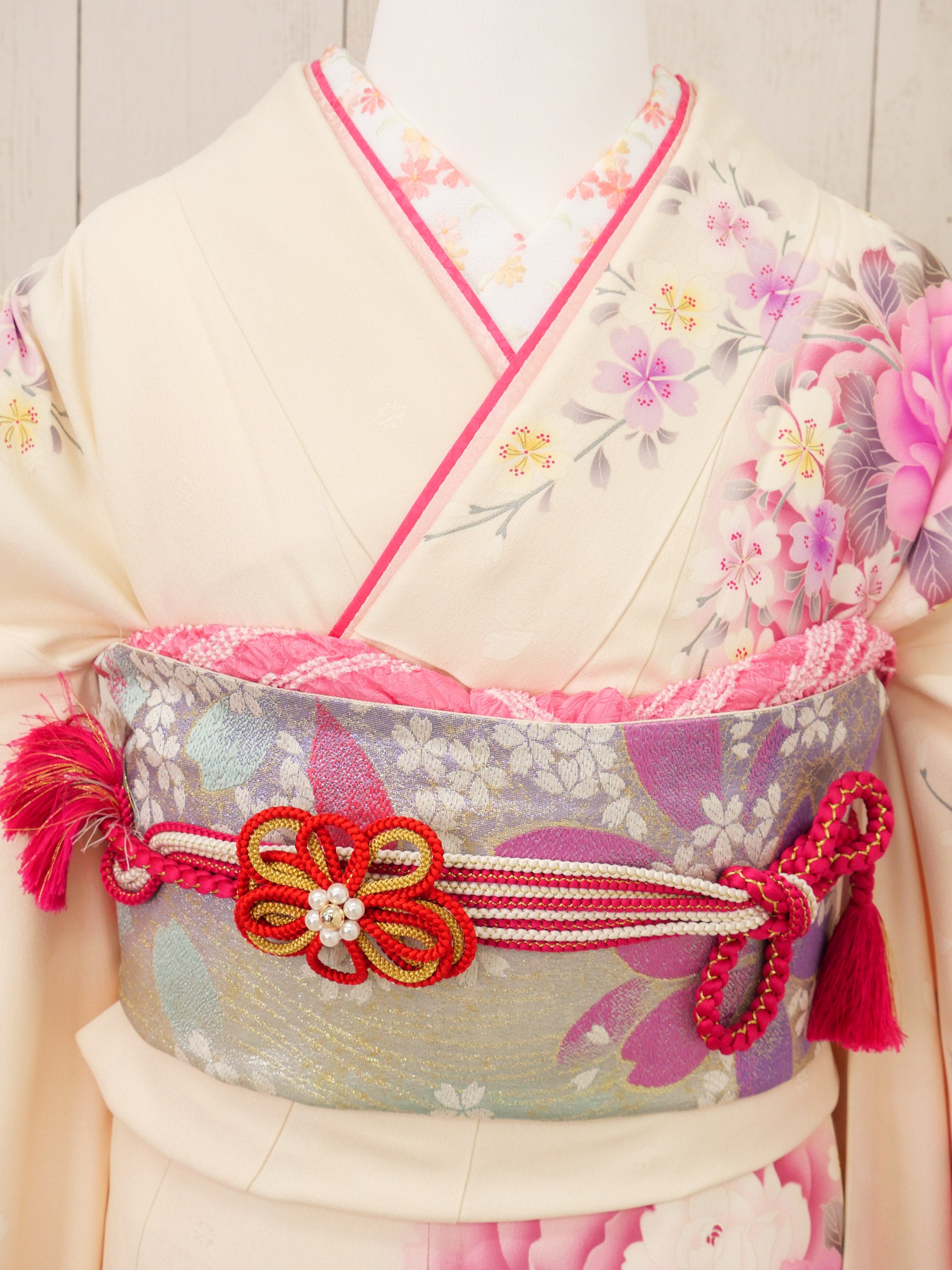 淡いベージュ地に華やかなピンクの牡丹が咲き誇る、優雅で女性らしい振袖。やわらかな印象で、清楚かつ華やかな晴れ姿を演出します。