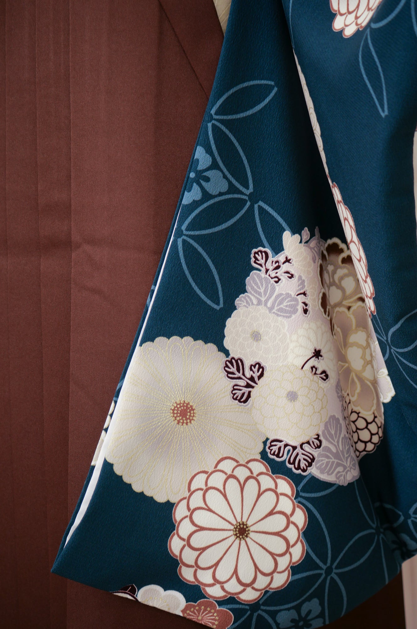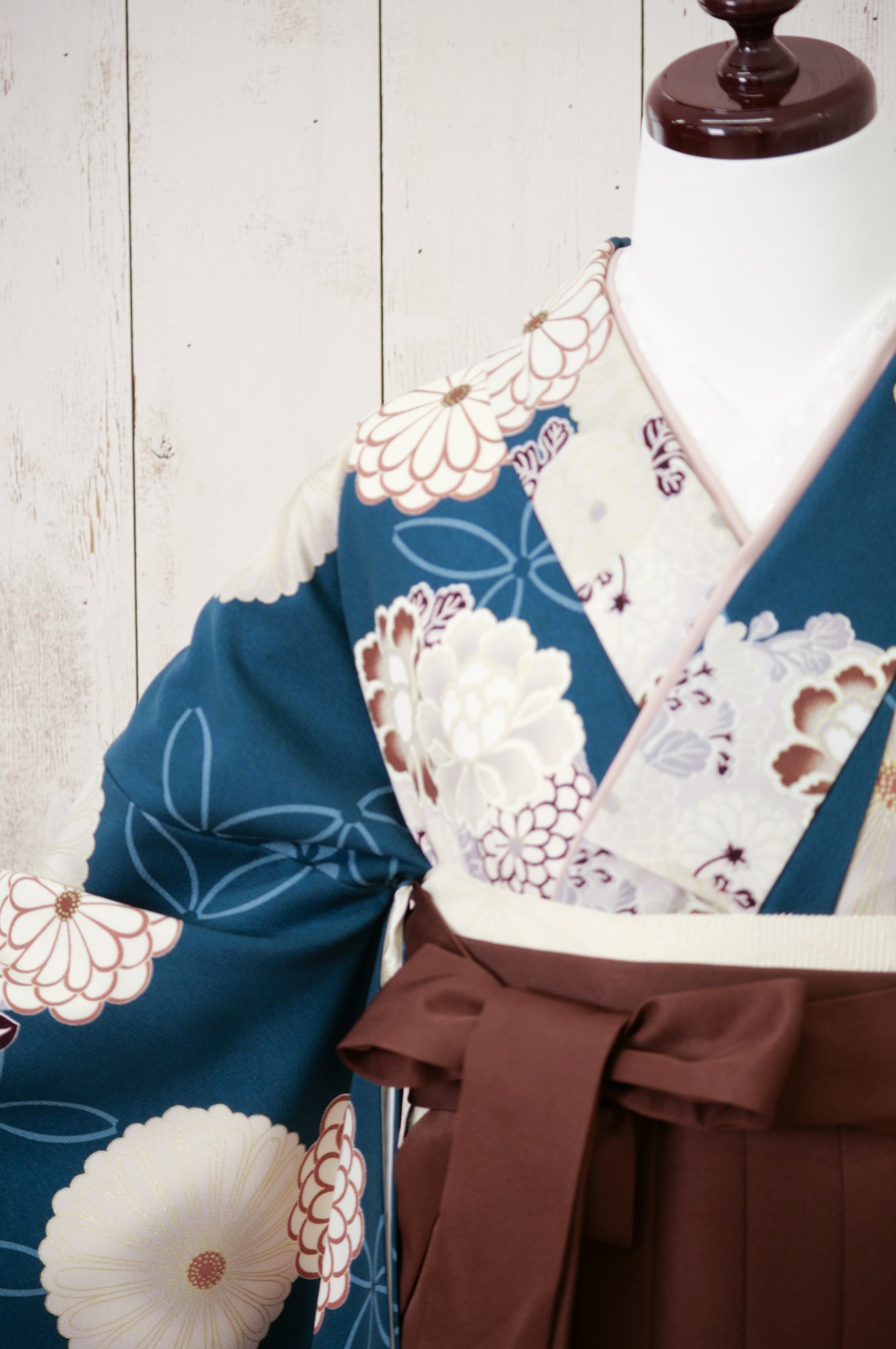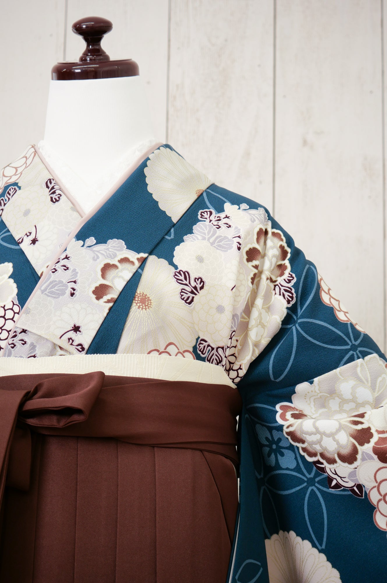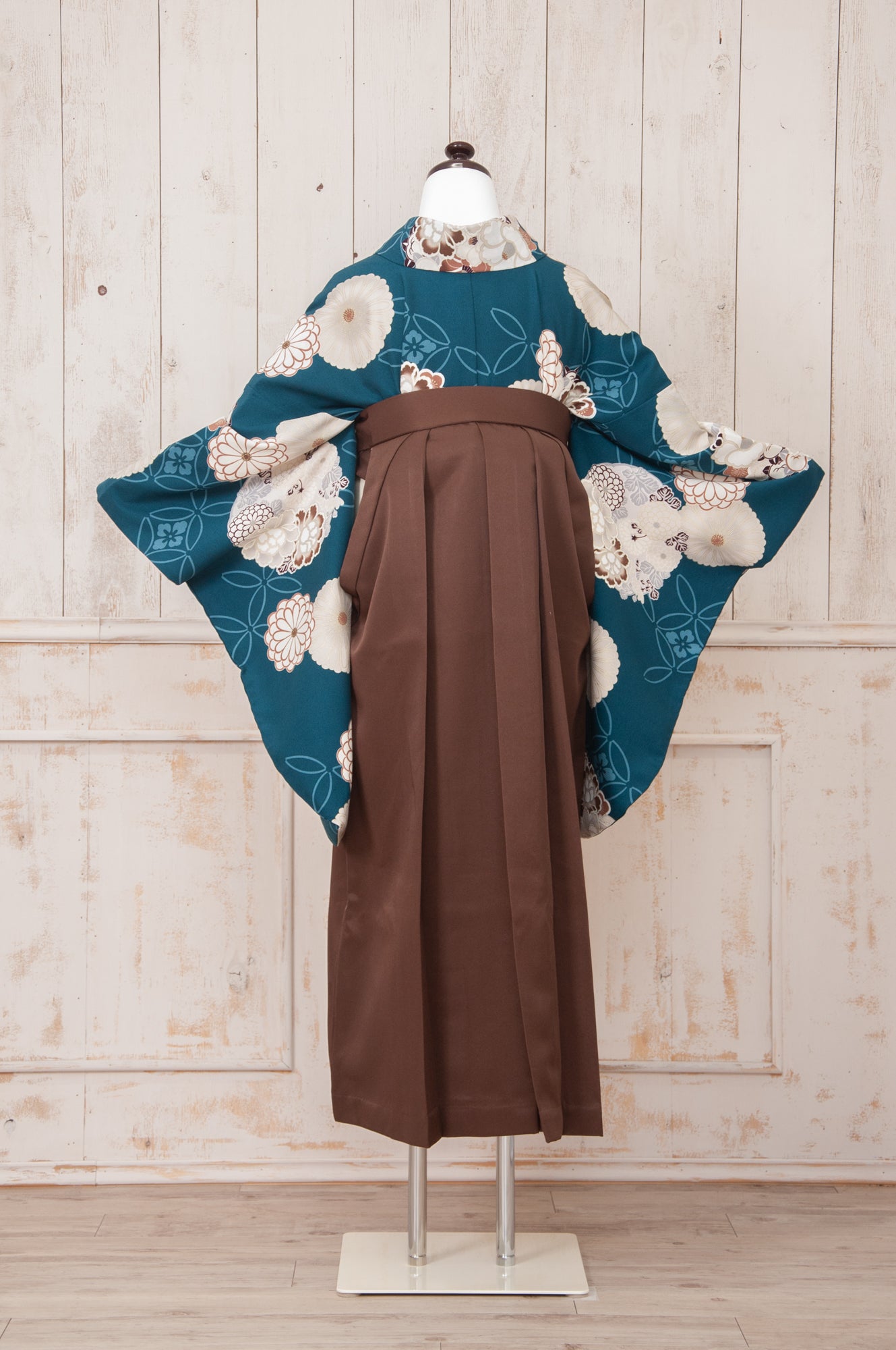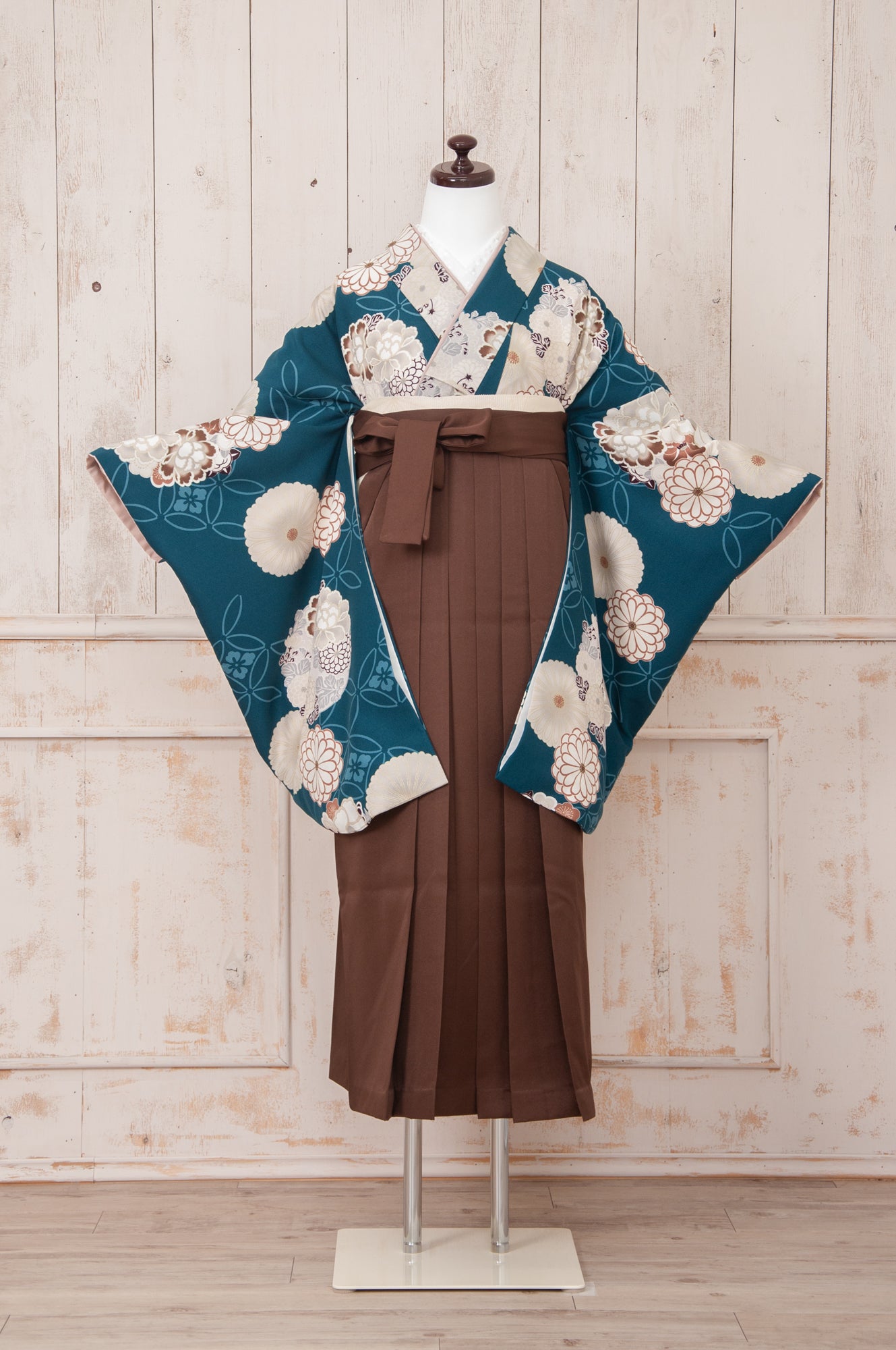 落ち着いた青緑に白い菊が浮かぶ上品なデザイン。ブラウンの袴でシックにまとめた、洗練された和モダンコーデ。