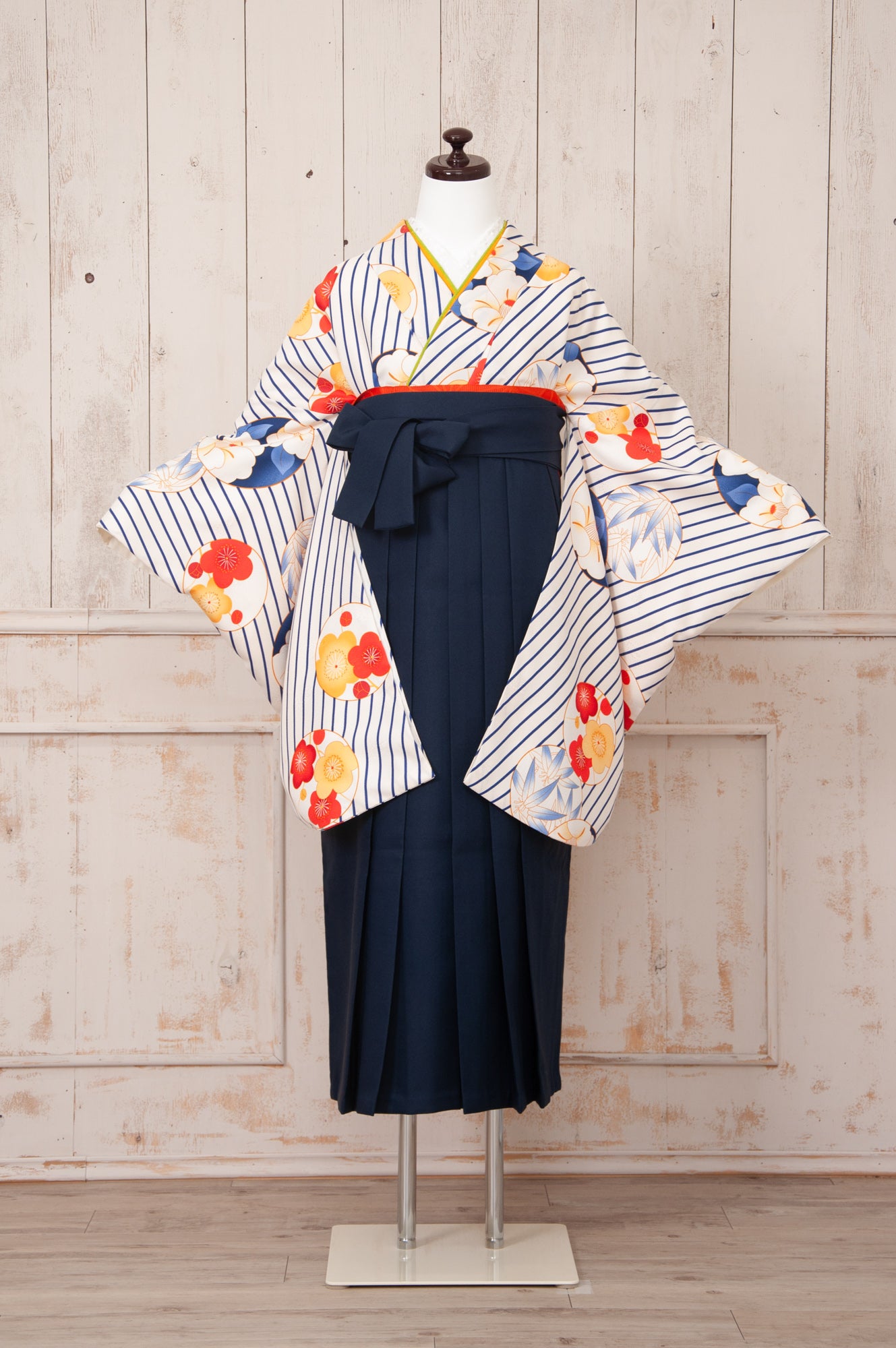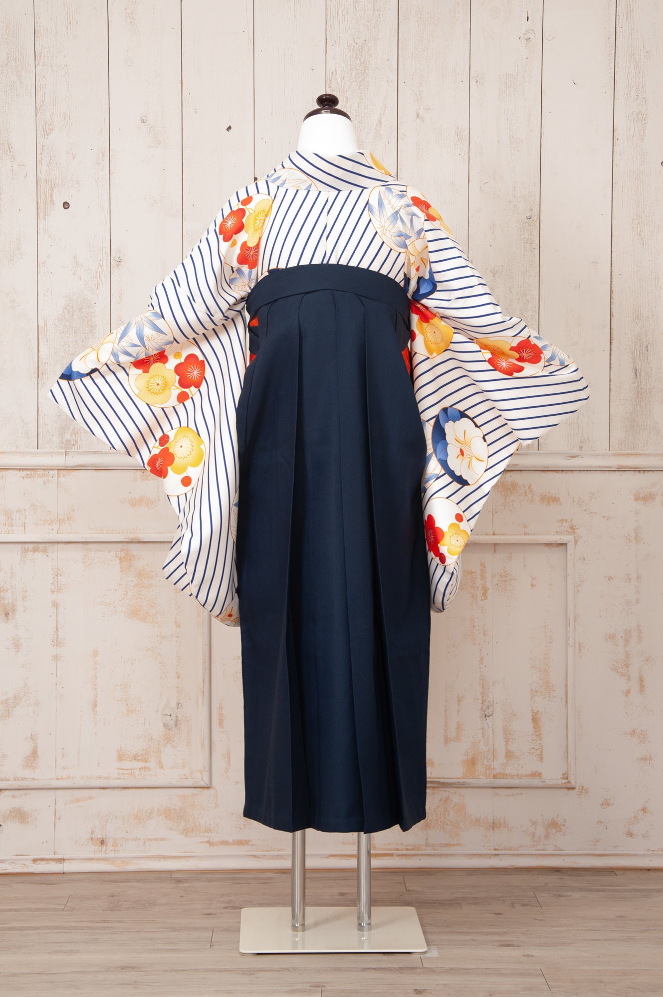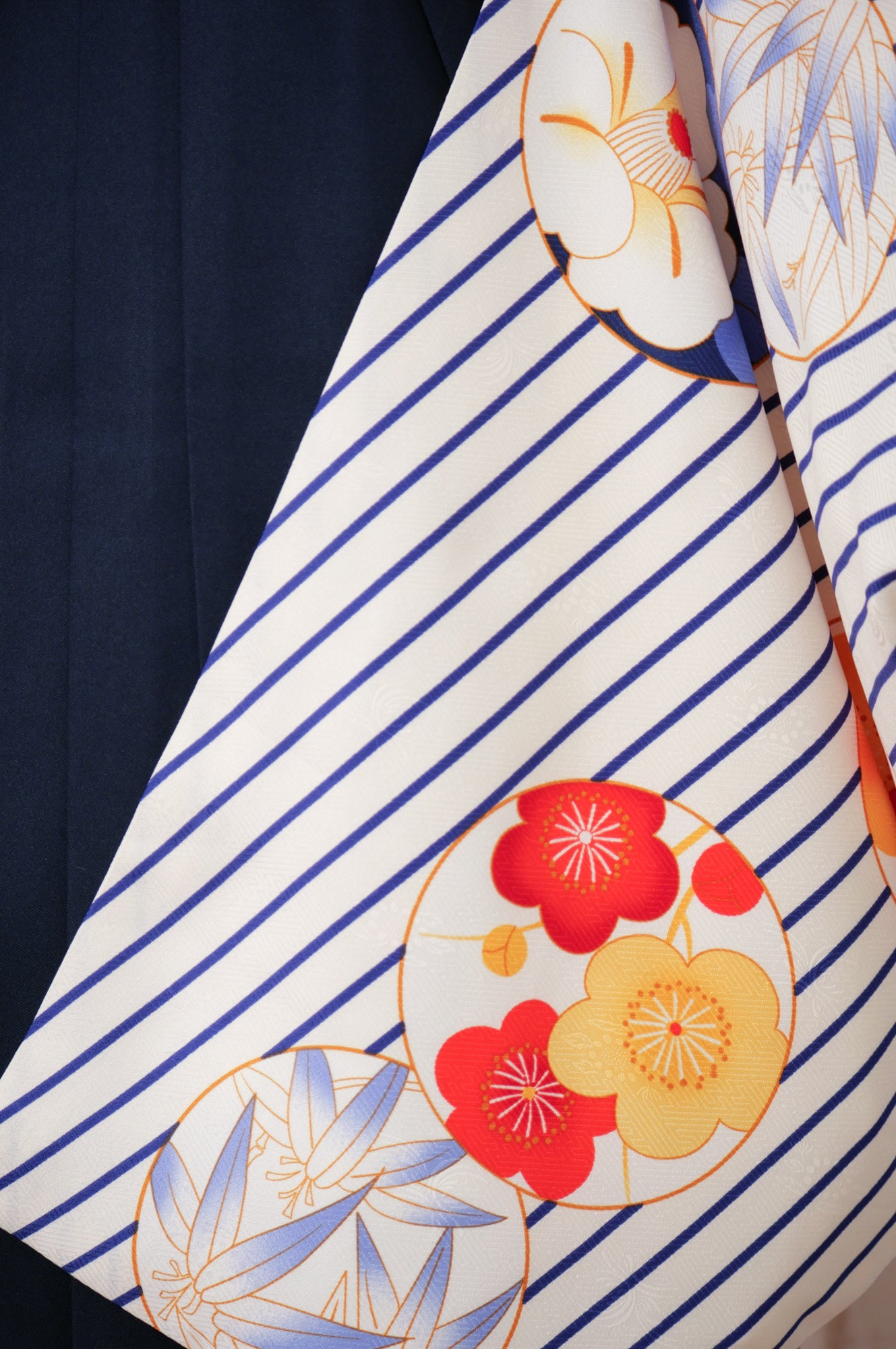 爽やかなストライプに梅の花が咲くデザイン。濃紺の袴で引き締めた、フレッシュで明るい印象の一着です。