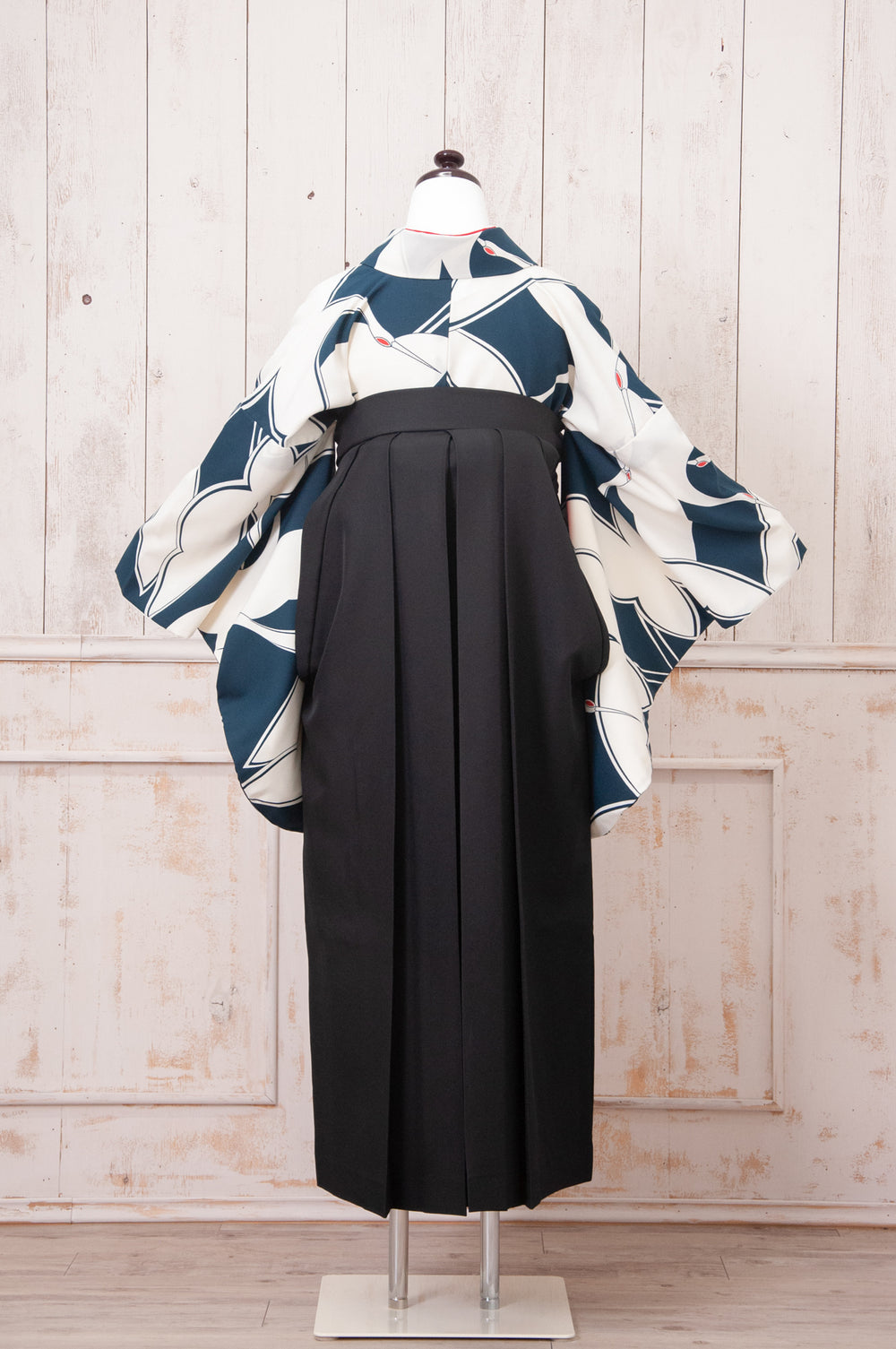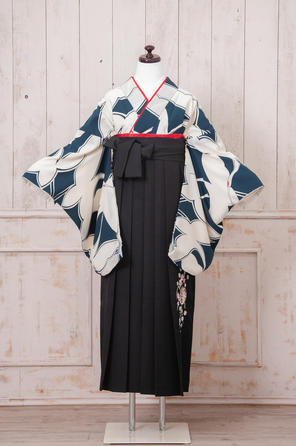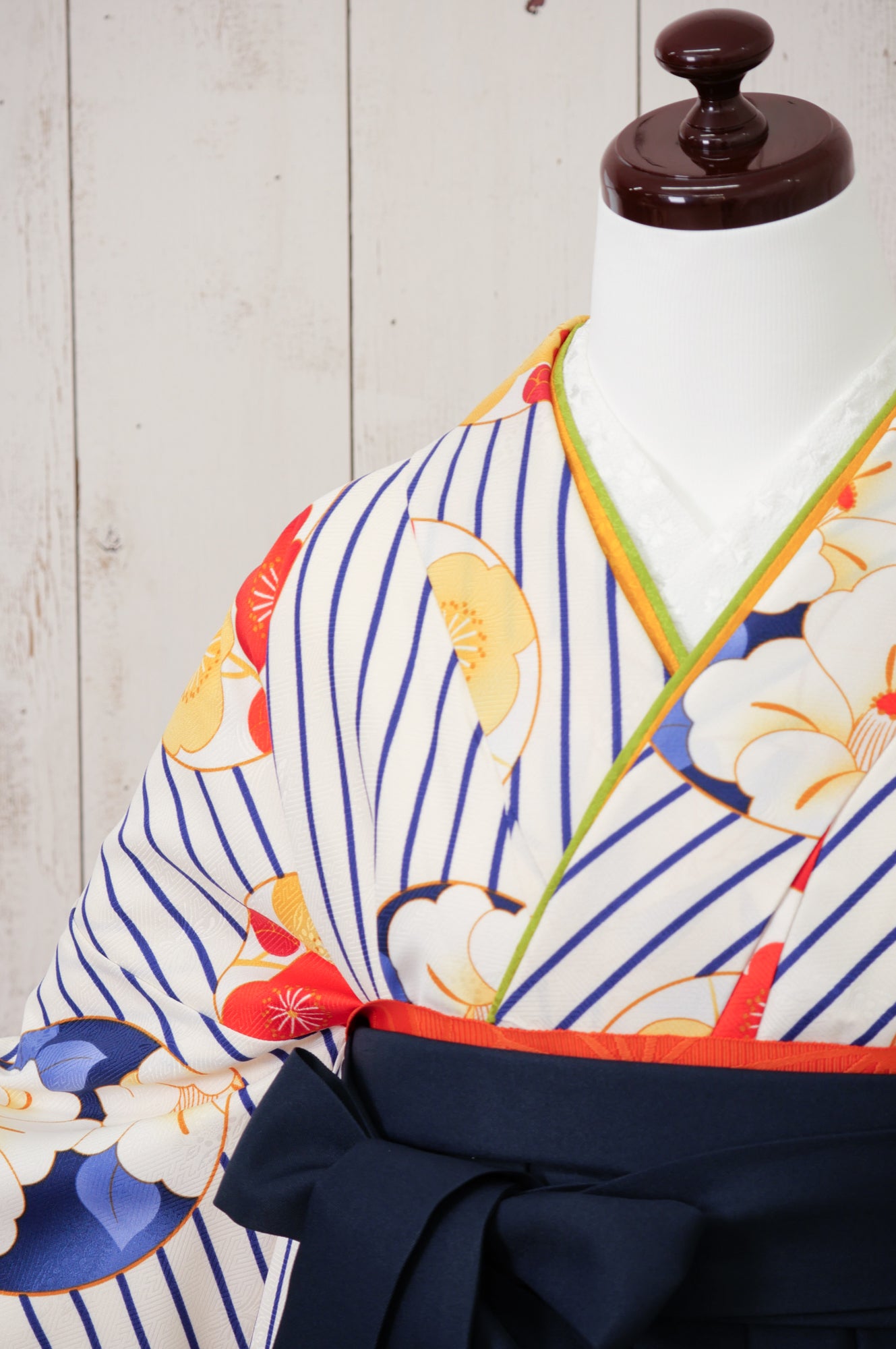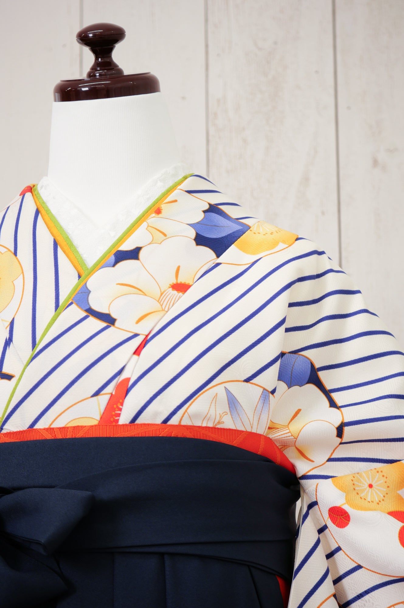 爽やかなストライプに梅の花が咲くデザイン。濃紺の袴で引き締めた、フレッシュで明るい印象の一着です。