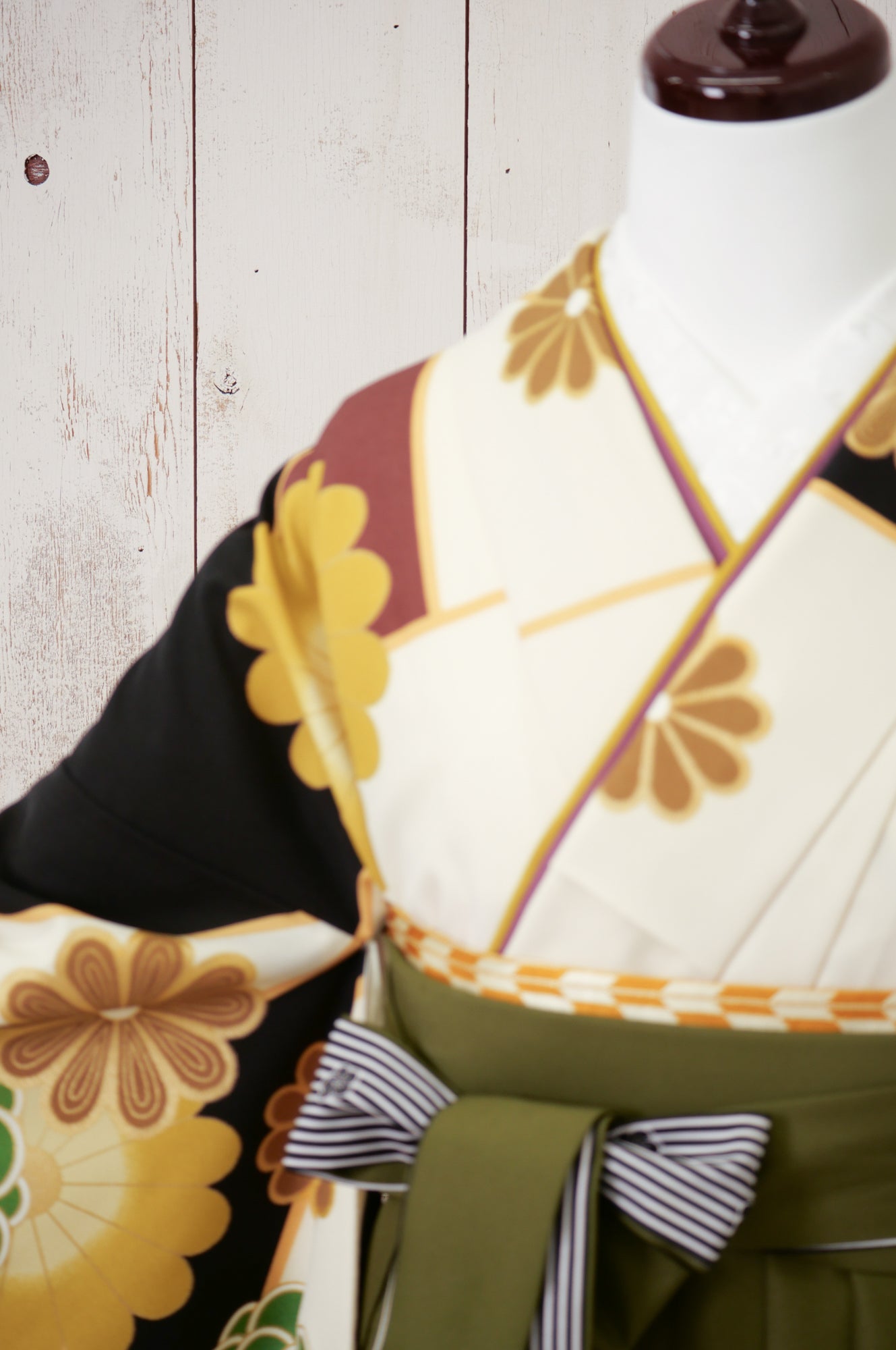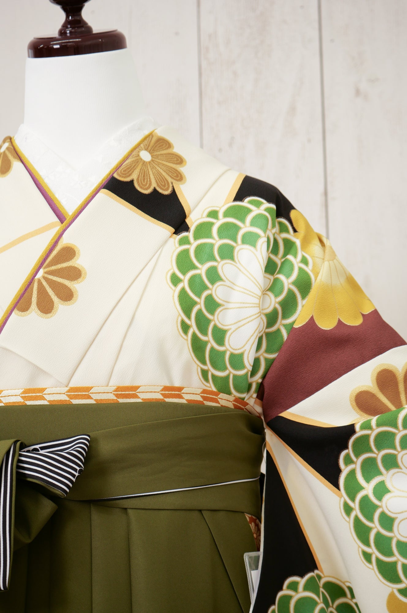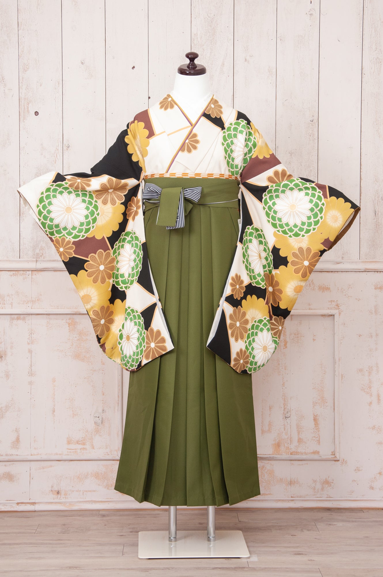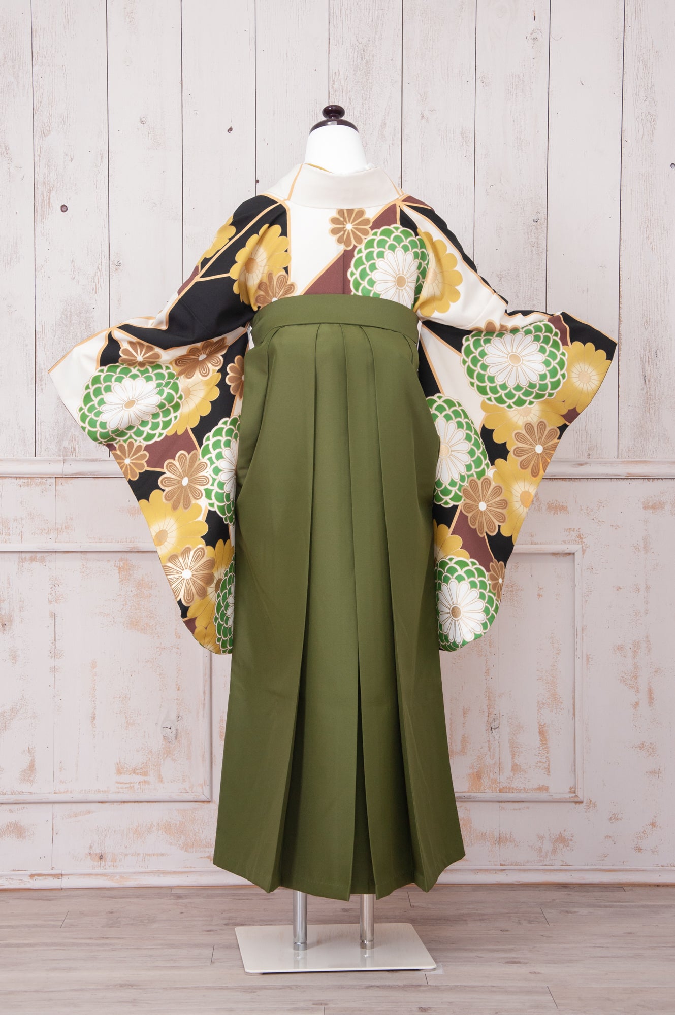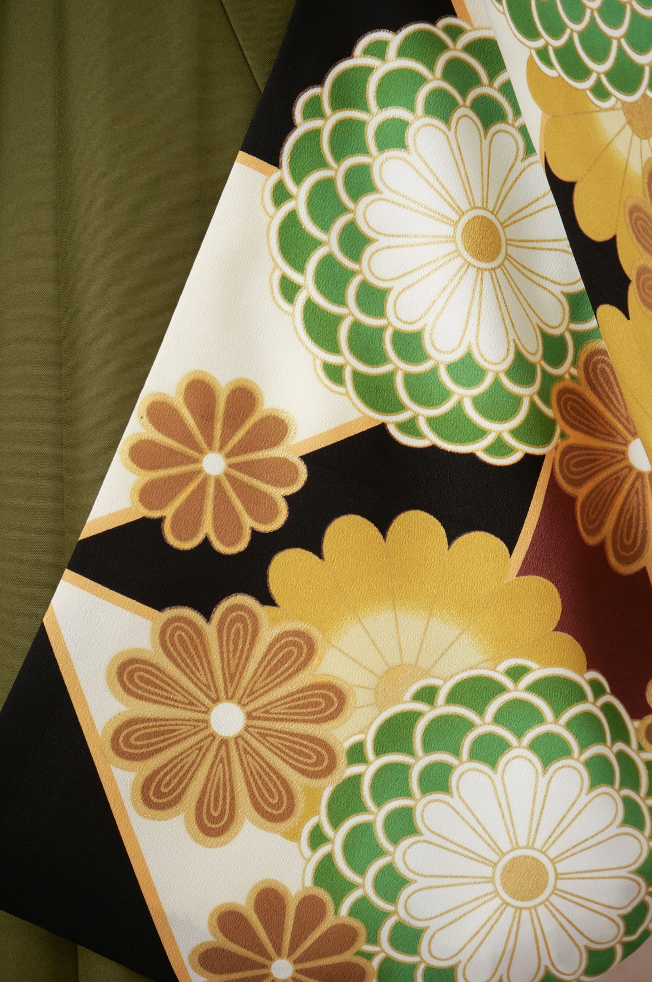 深みのあるアースカラーで大人っぽい雰囲気。古典的な菊模様が上品さを際立たせます。シックな卒業式にぴったり。