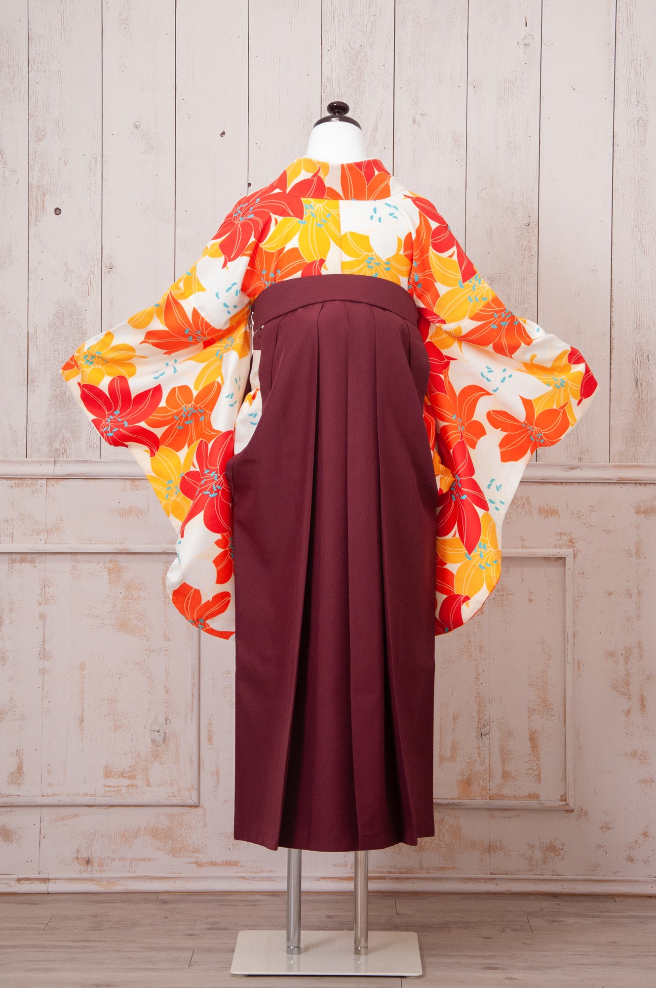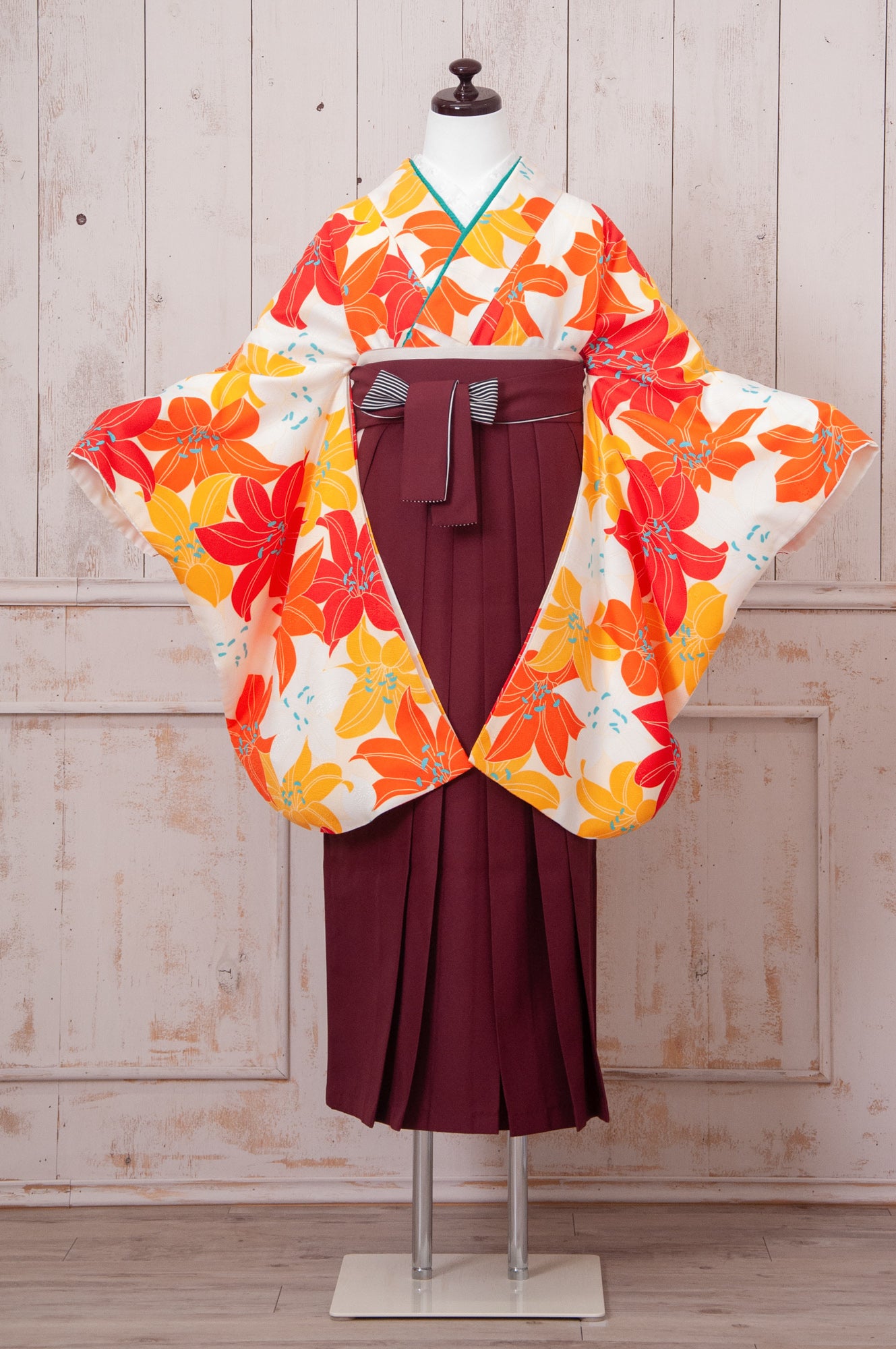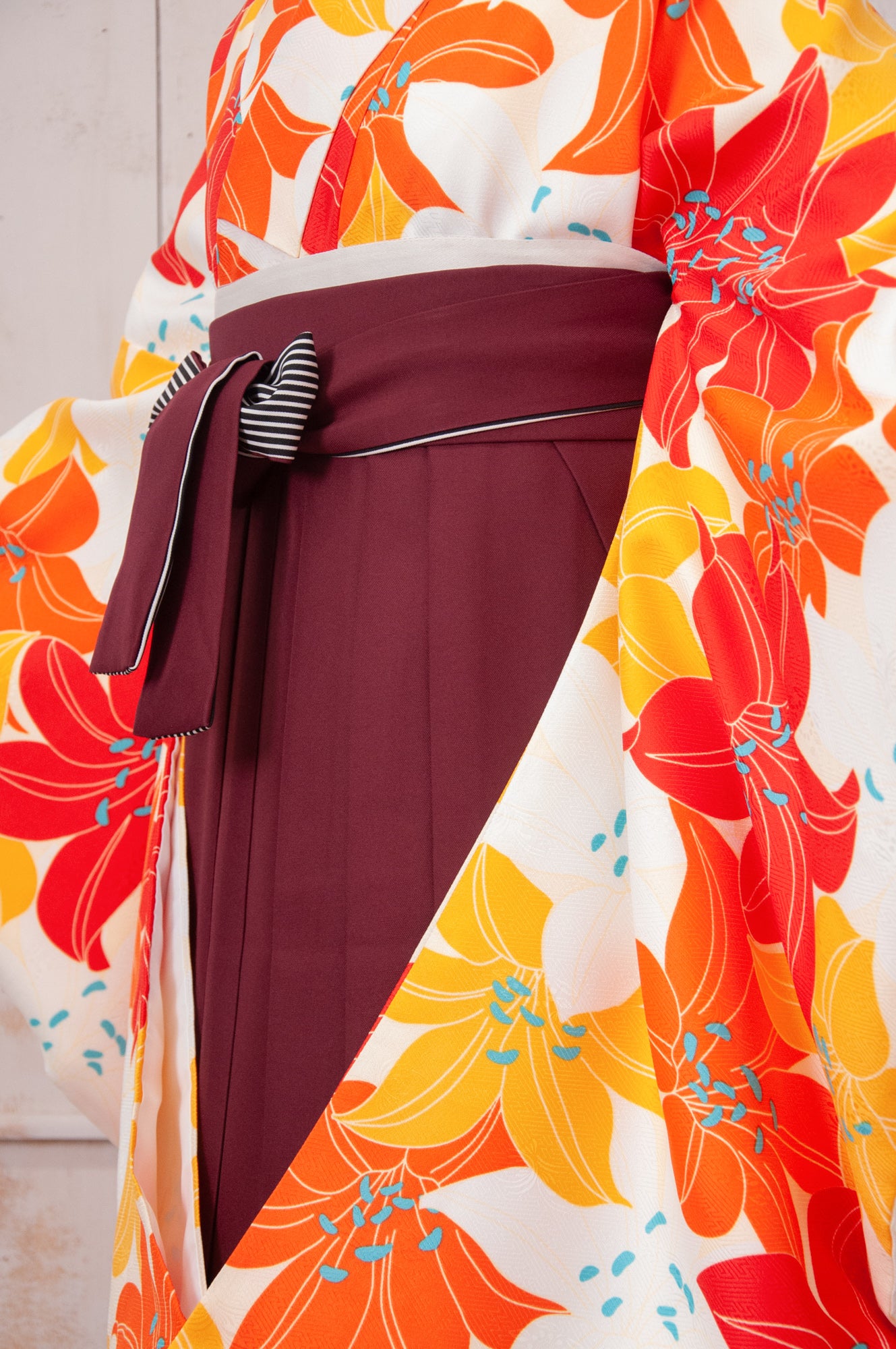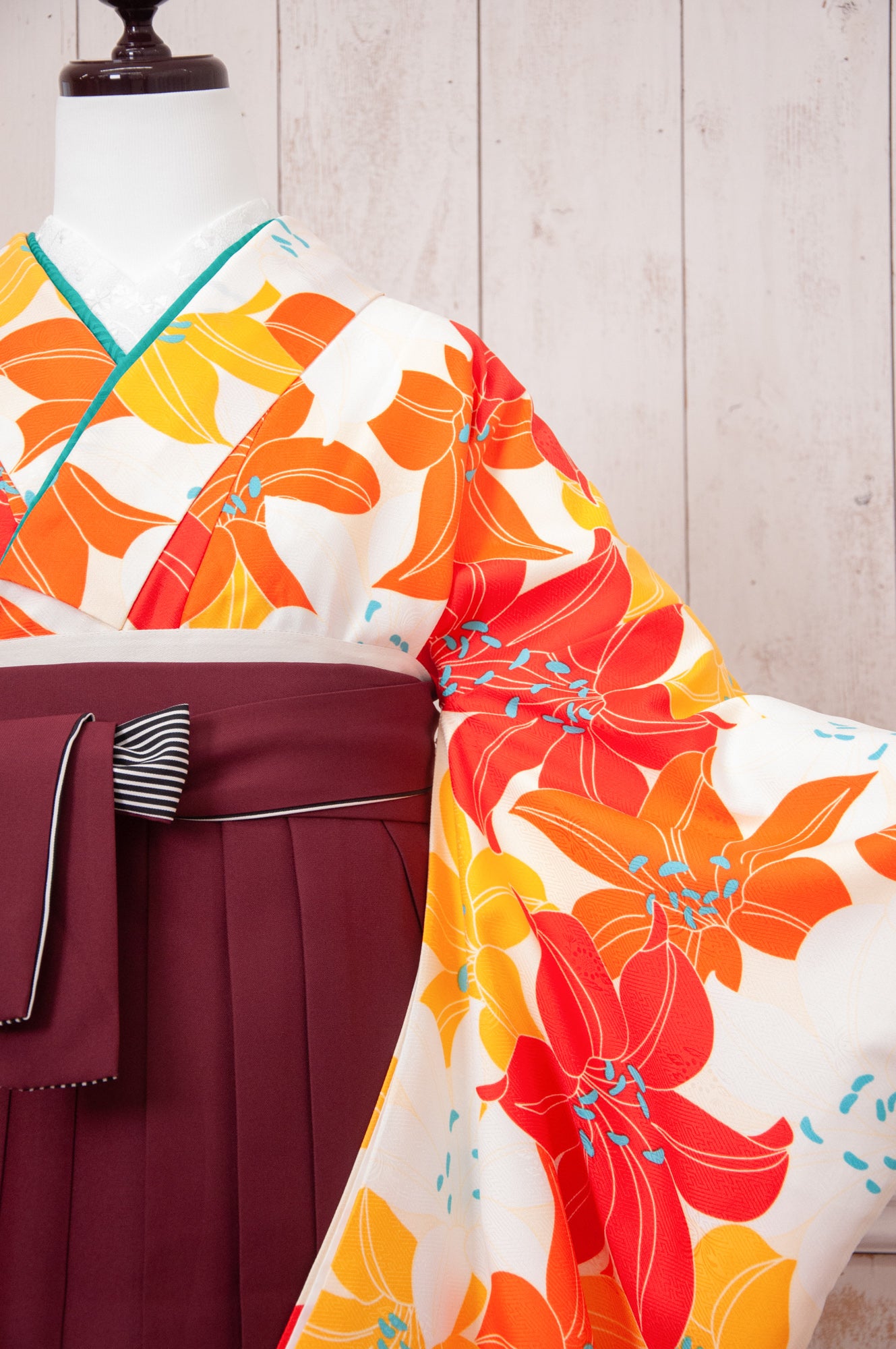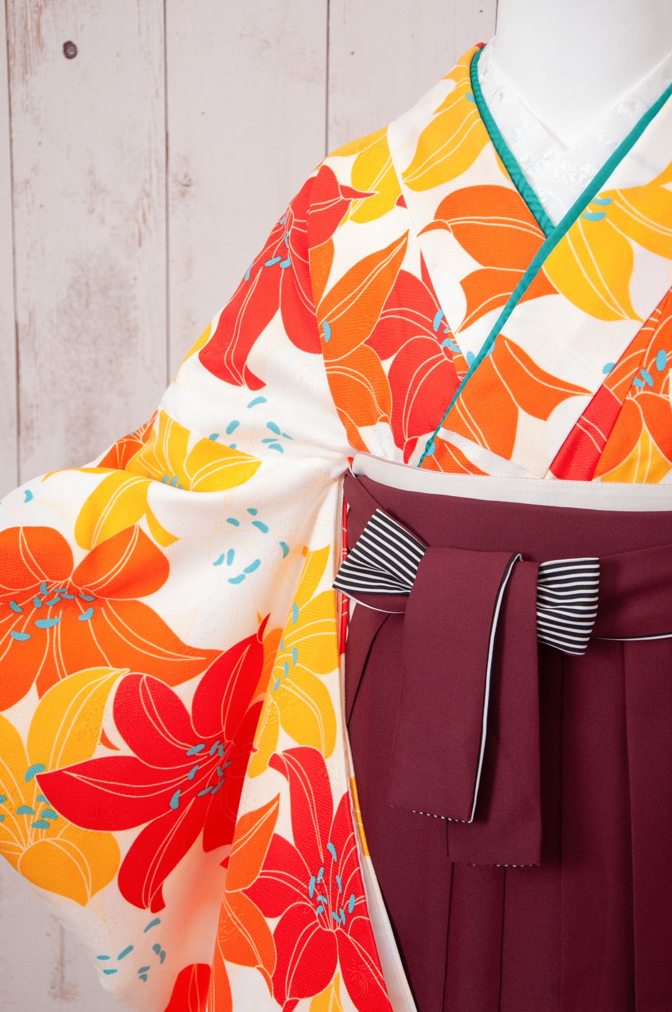 白地に大ぶりな百合のような赤と黄の花が咲く大胆デザイン。えんじ袴で落ち着いた可愛さを演出。
