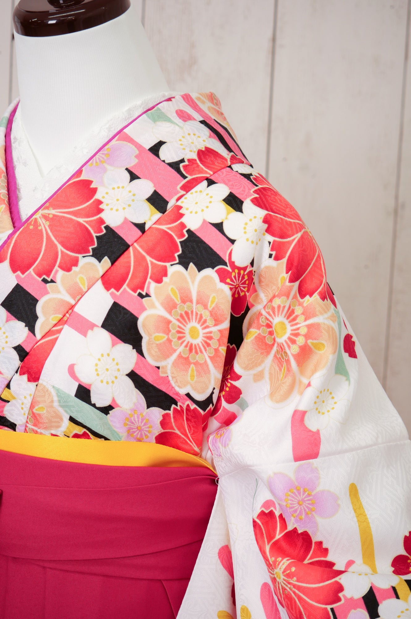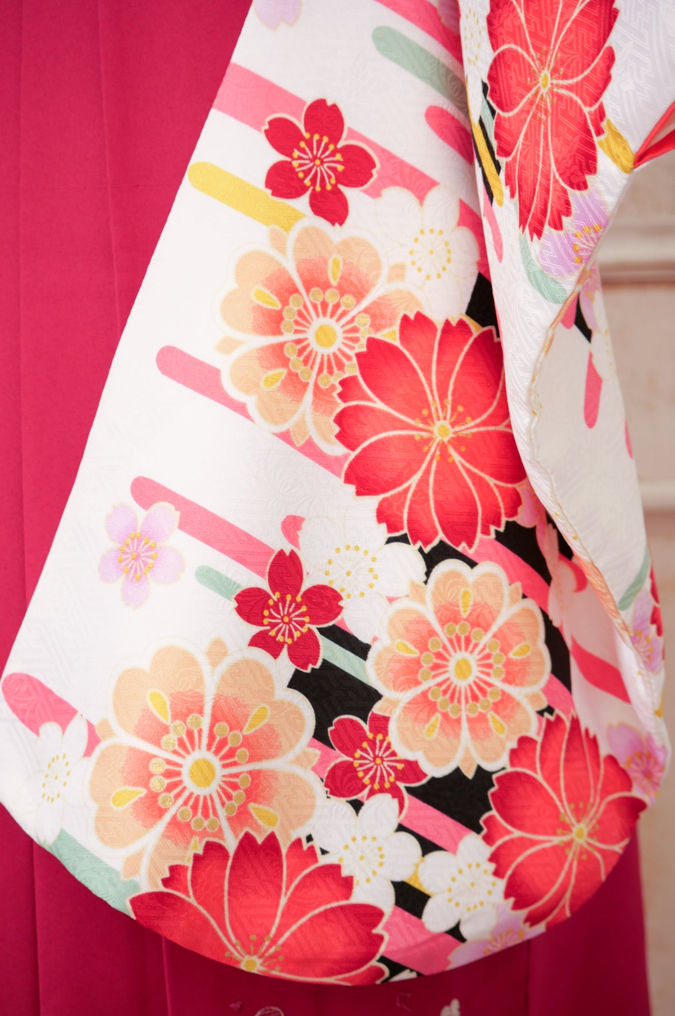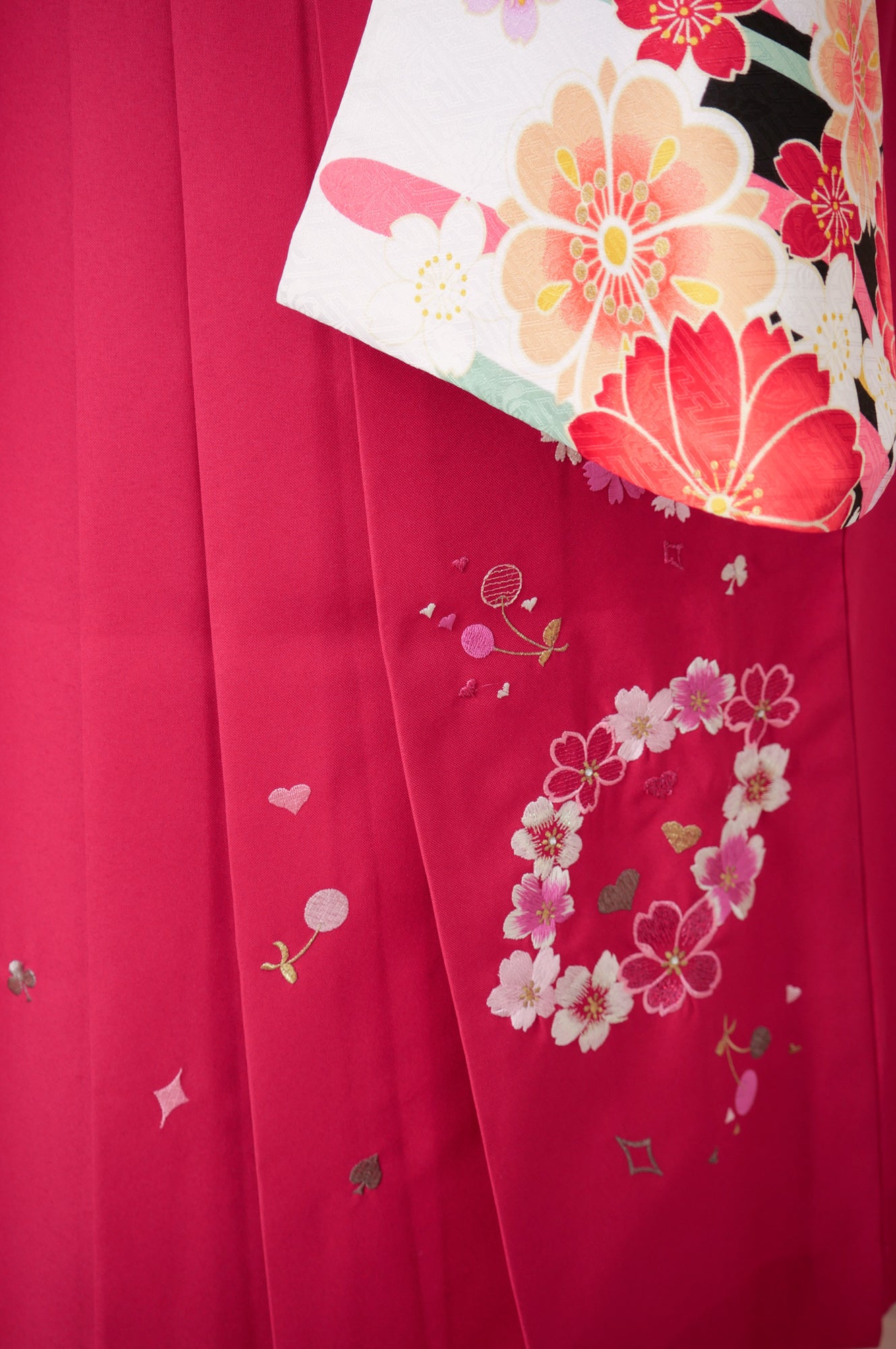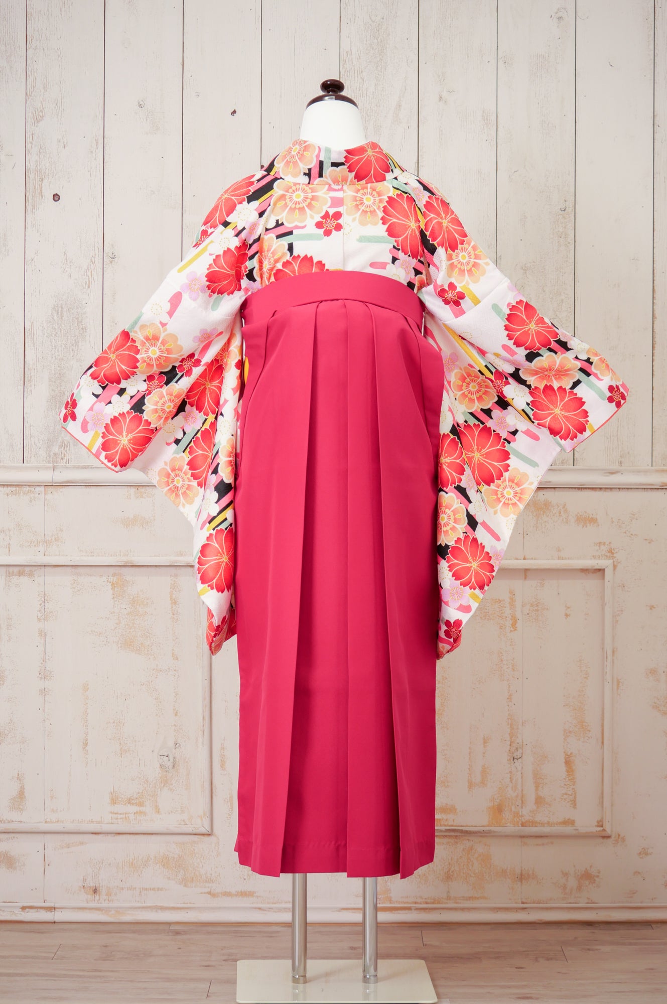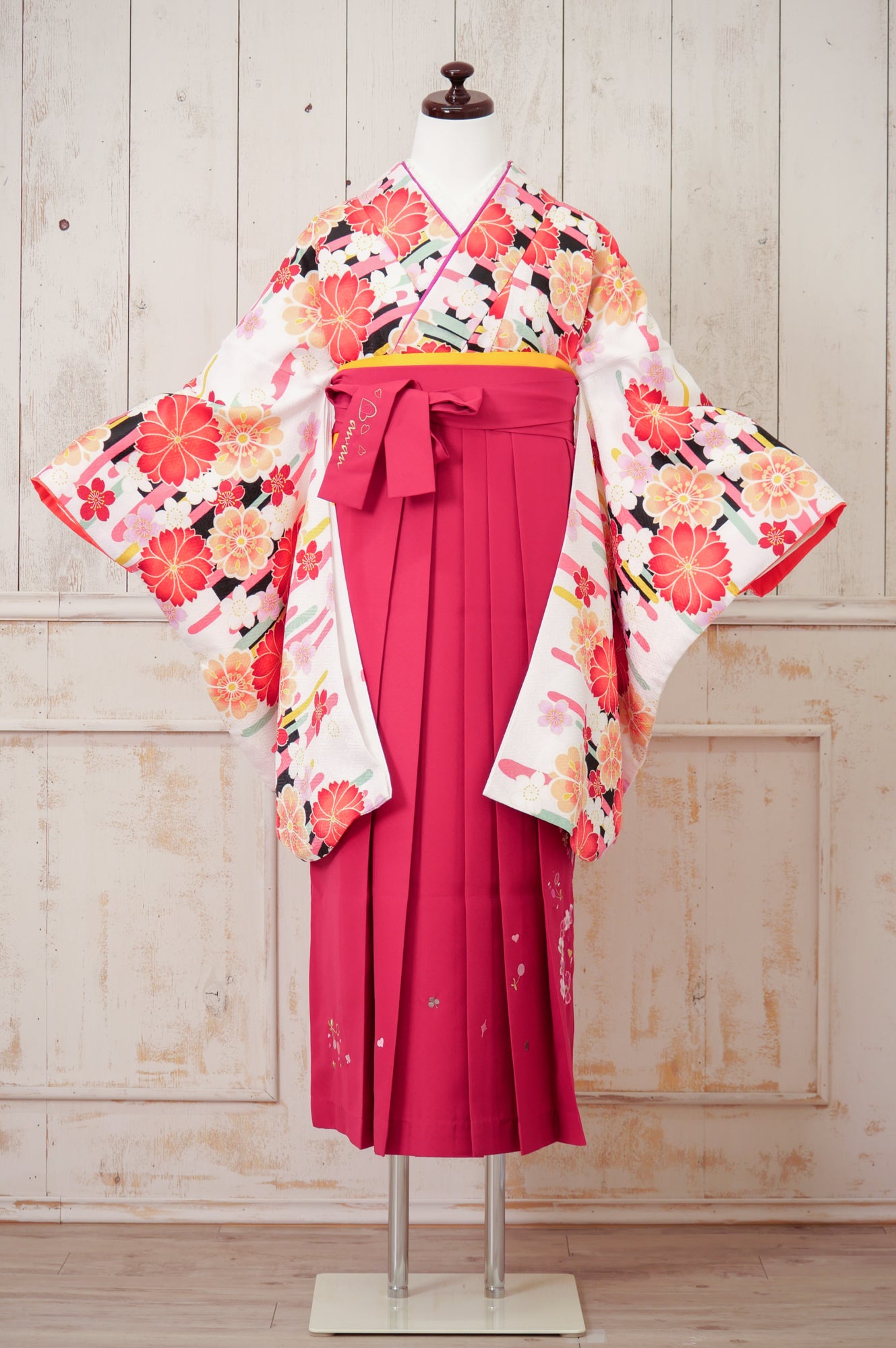 清楚な白地にピンクの薔薇が可憐に咲くデザイン。深緑の袴が全体を引き締め、甘すぎず上品な印象に仕上がります。
