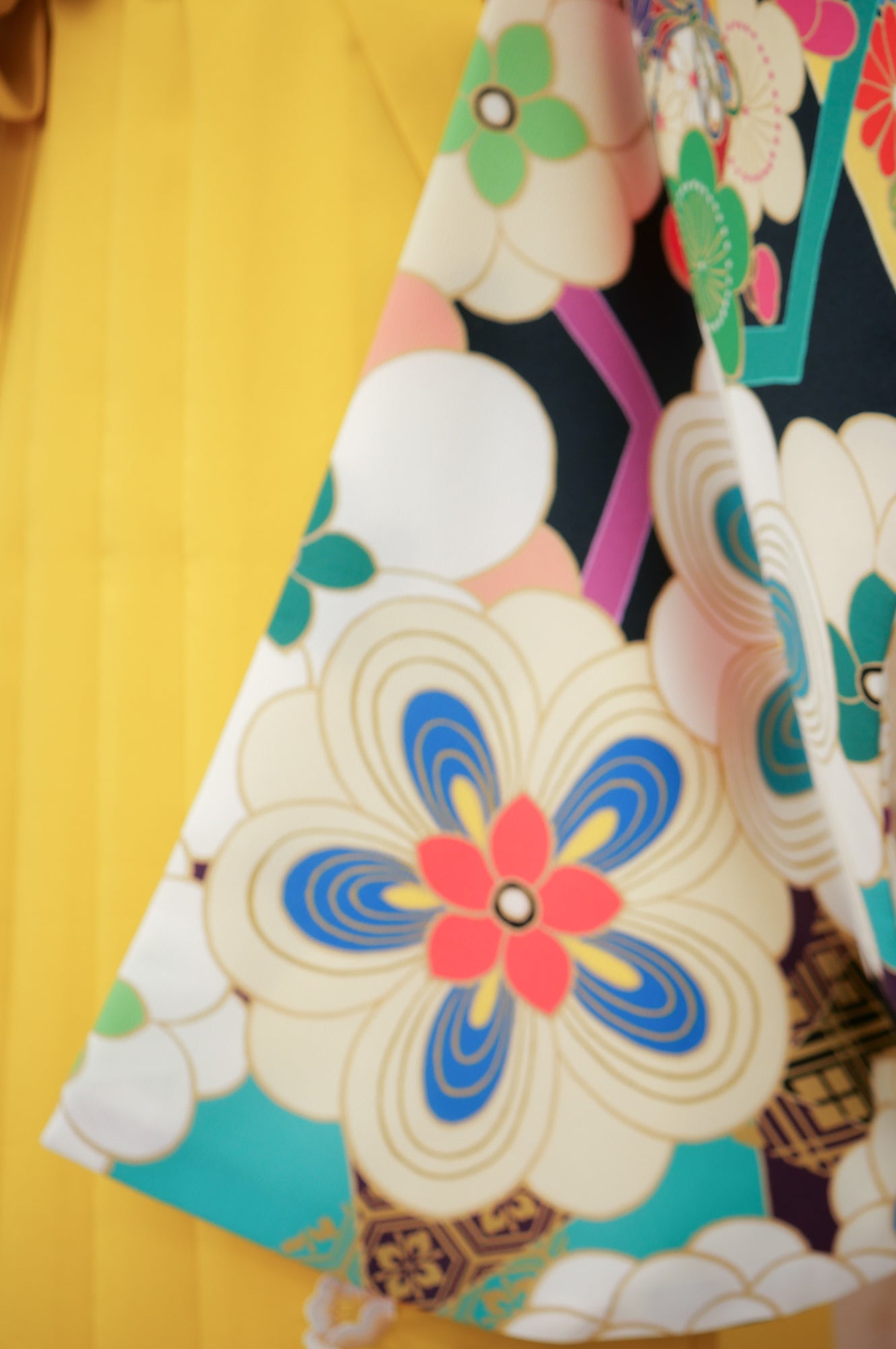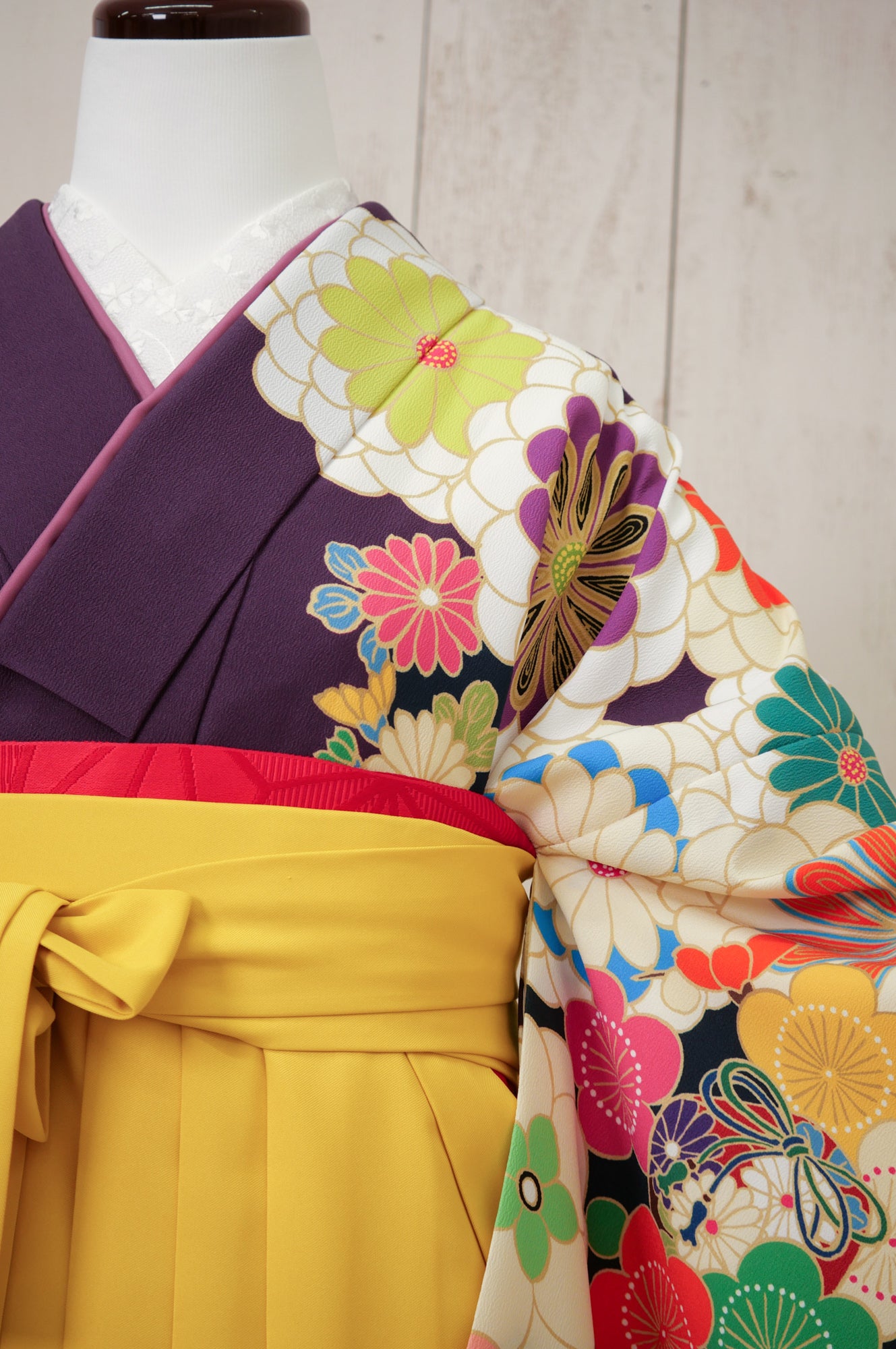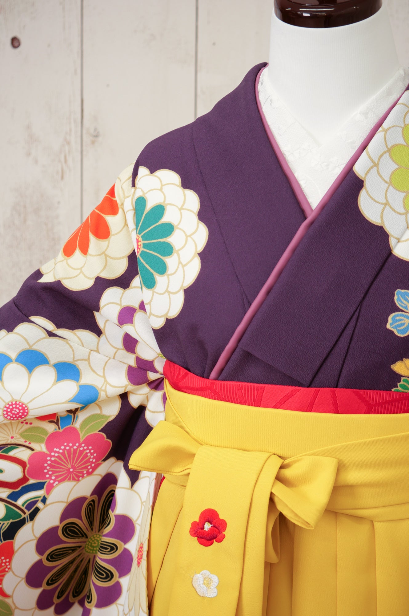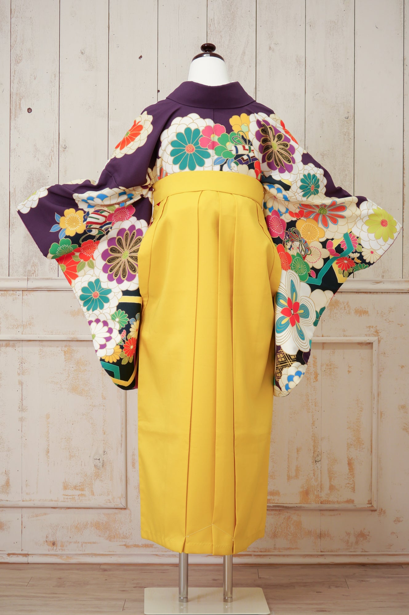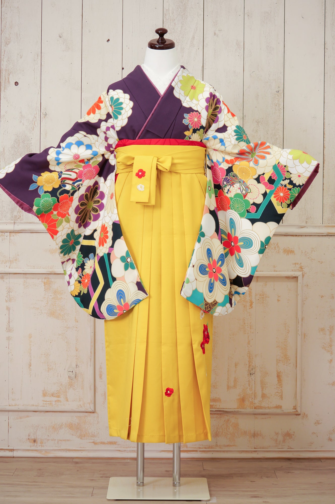 目を引く紫と黄色のコントラストがレトロでポップ。卒業式にぴったりな元気なスタイル。