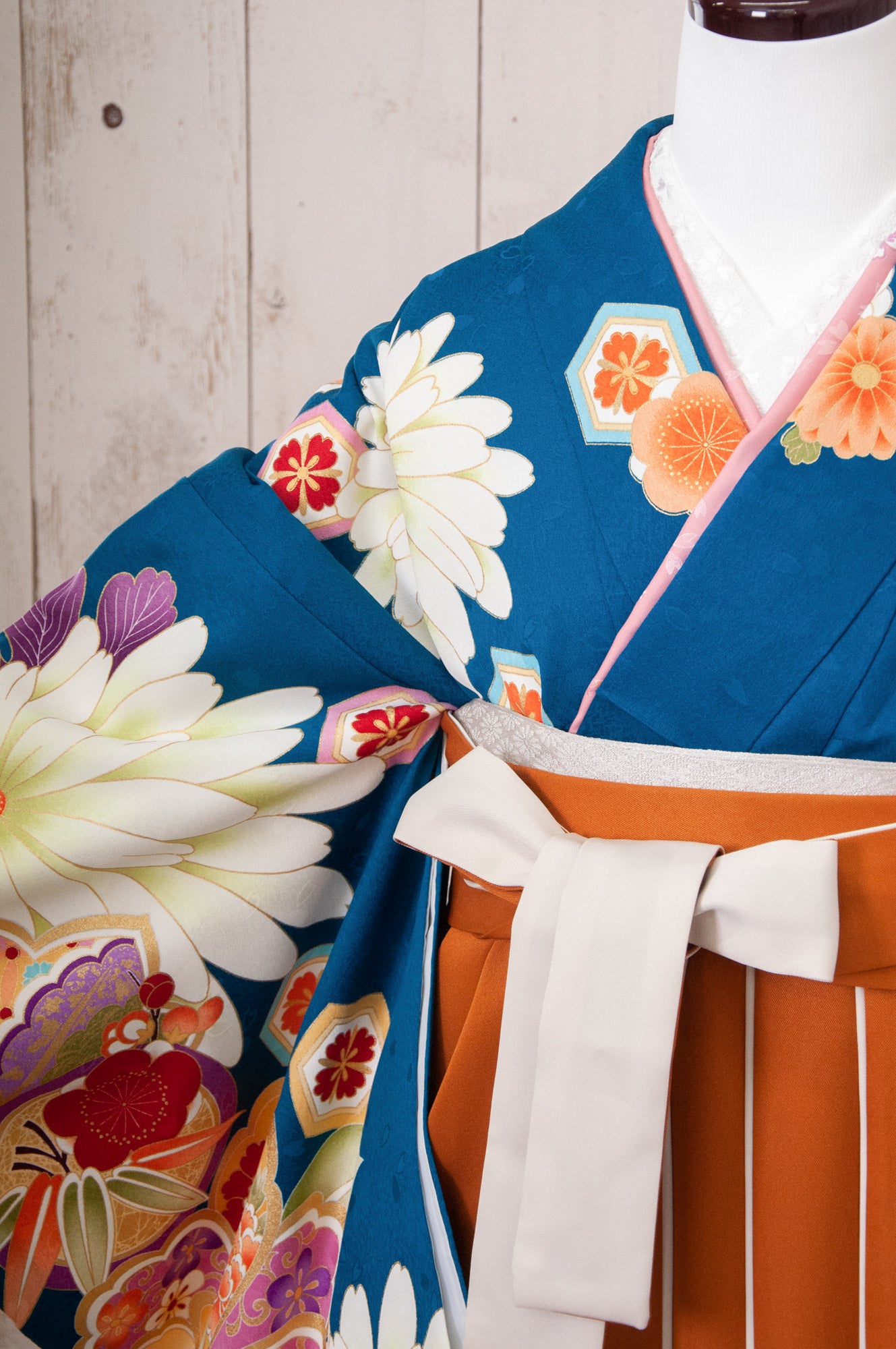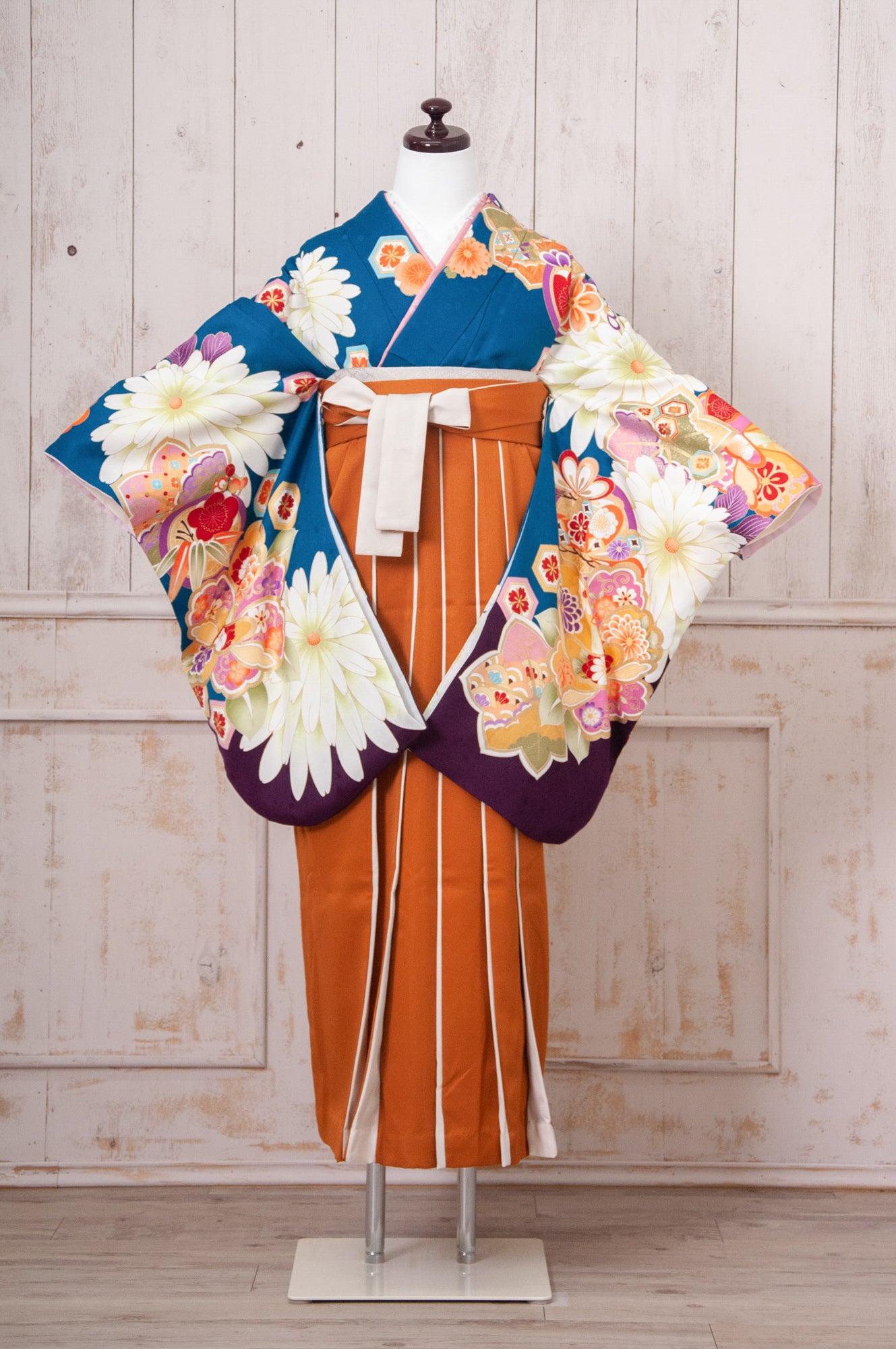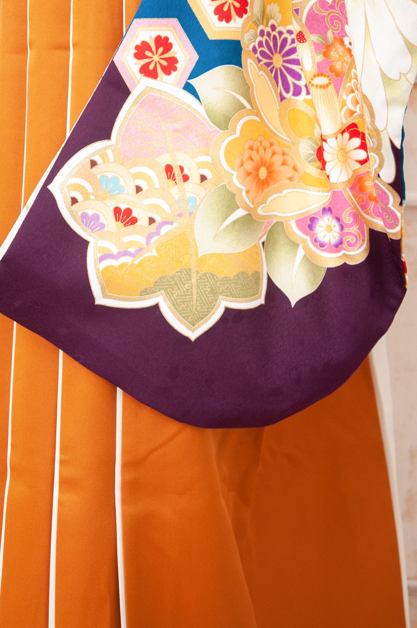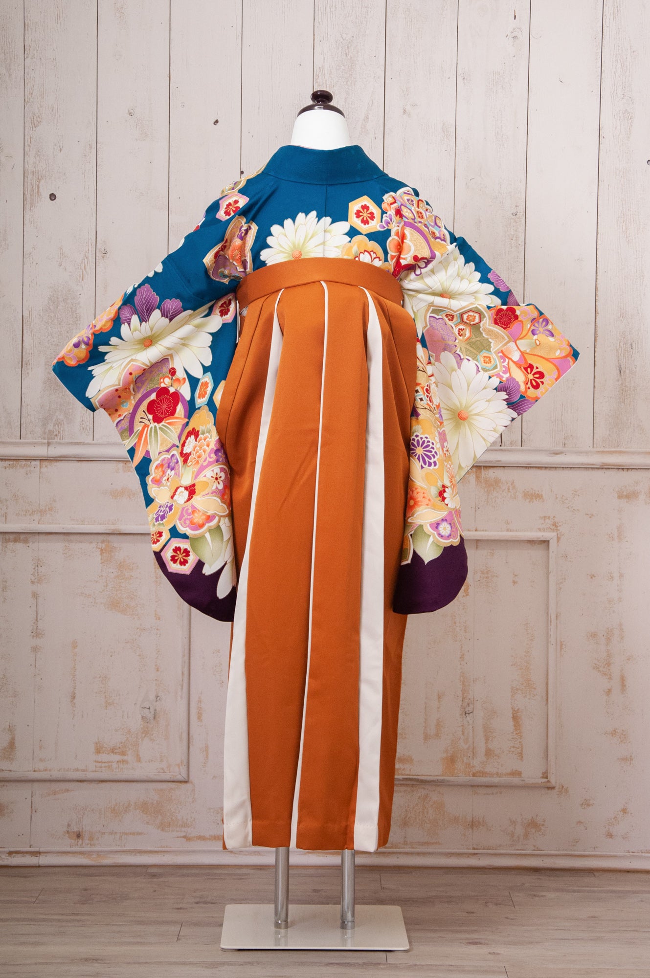 青地に咲く大輪の花がぱっと目を引く個性派デザイン。オレンジのストライプ袴がレトロ可愛いアクセントに。