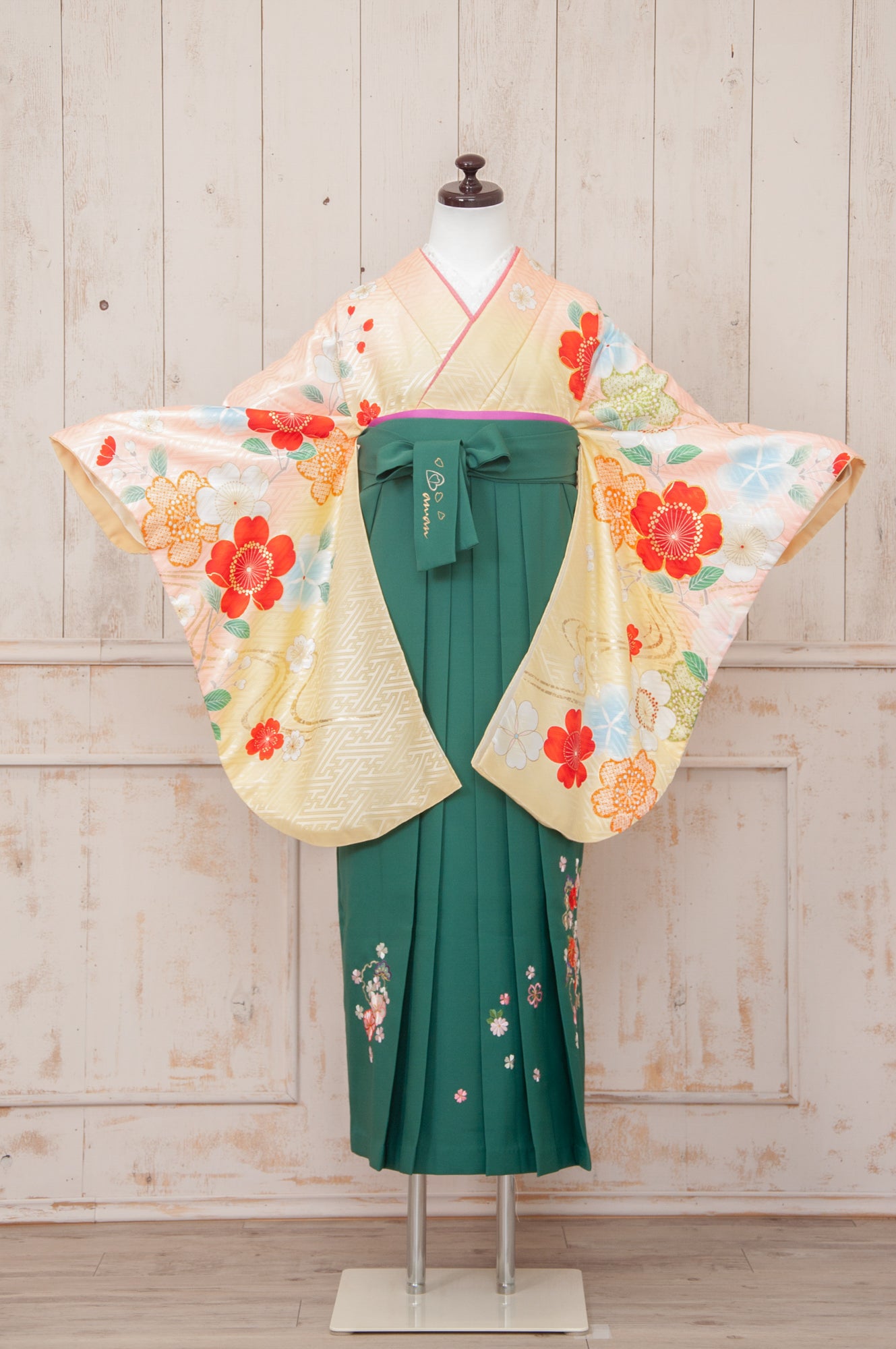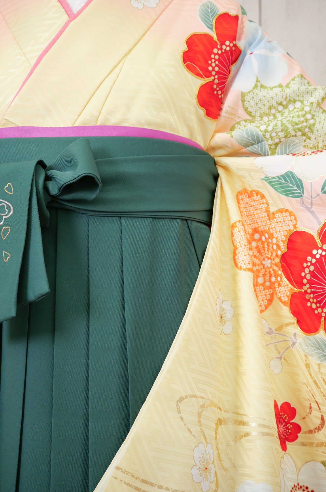 淡い黄色地に咲く花々が春らしい華やかさを演出。グリーンの袴が明るく爽やかな印象を添えます。