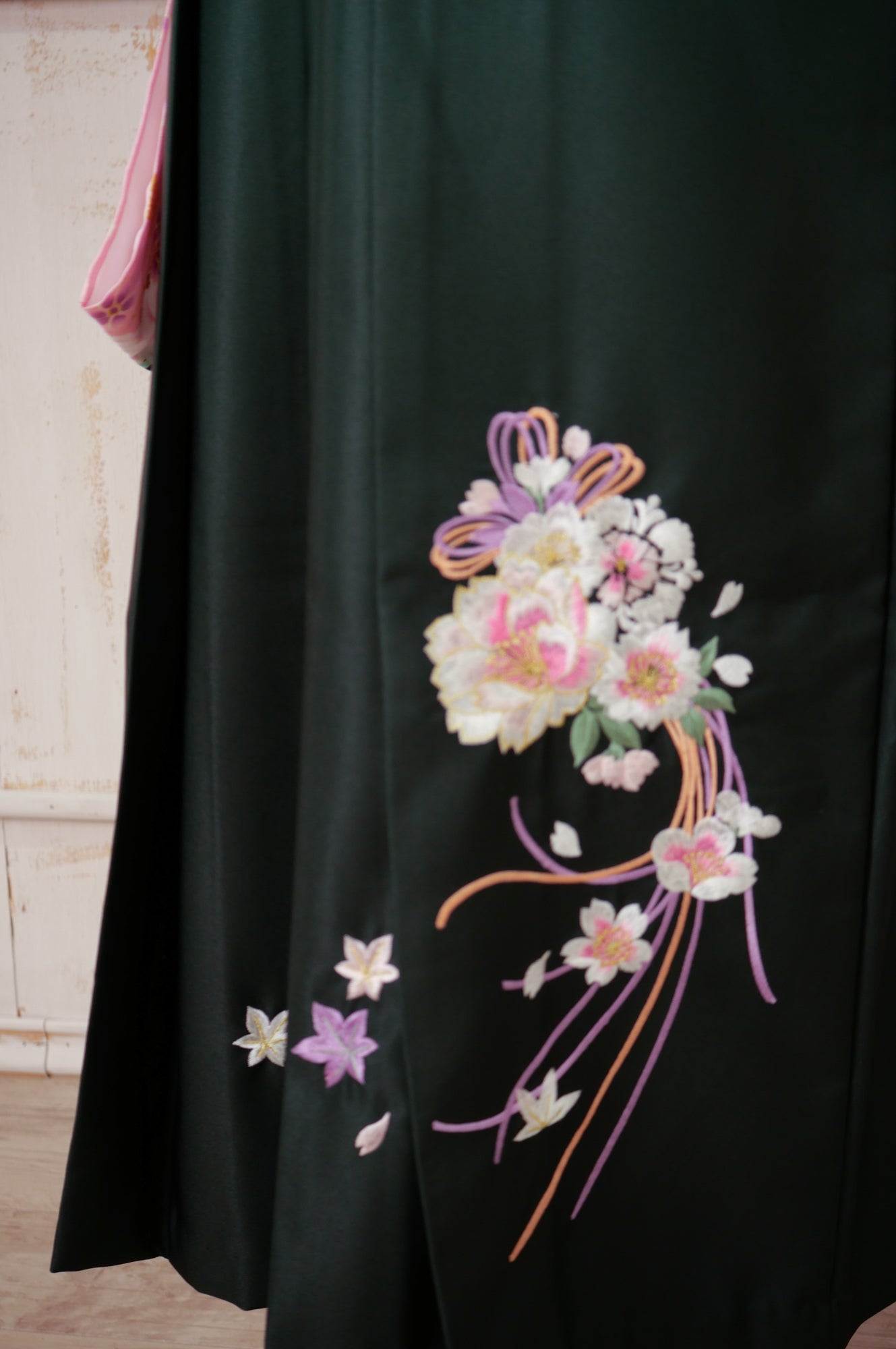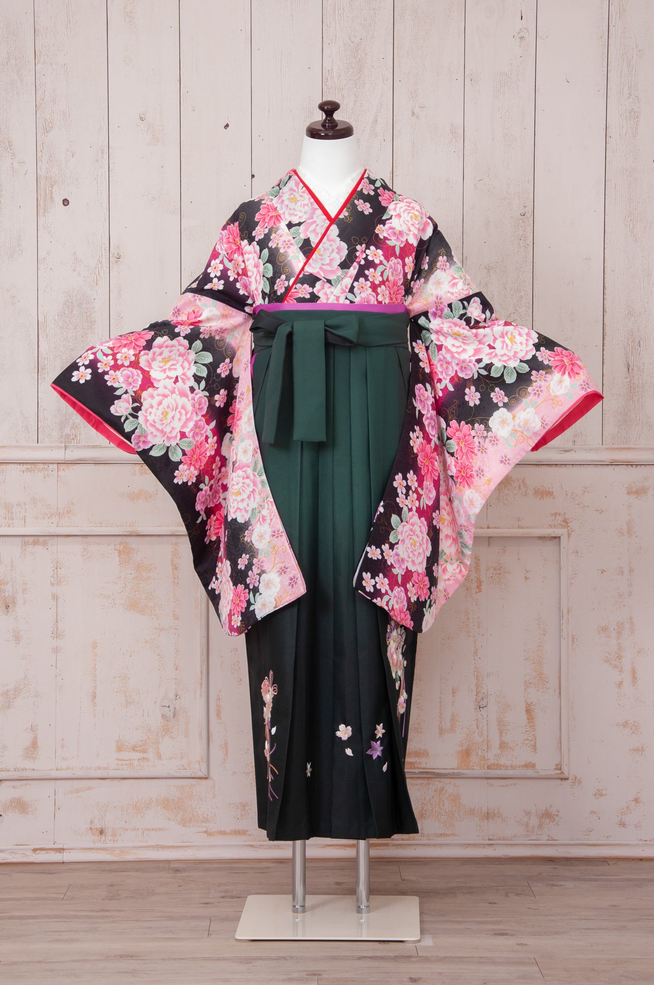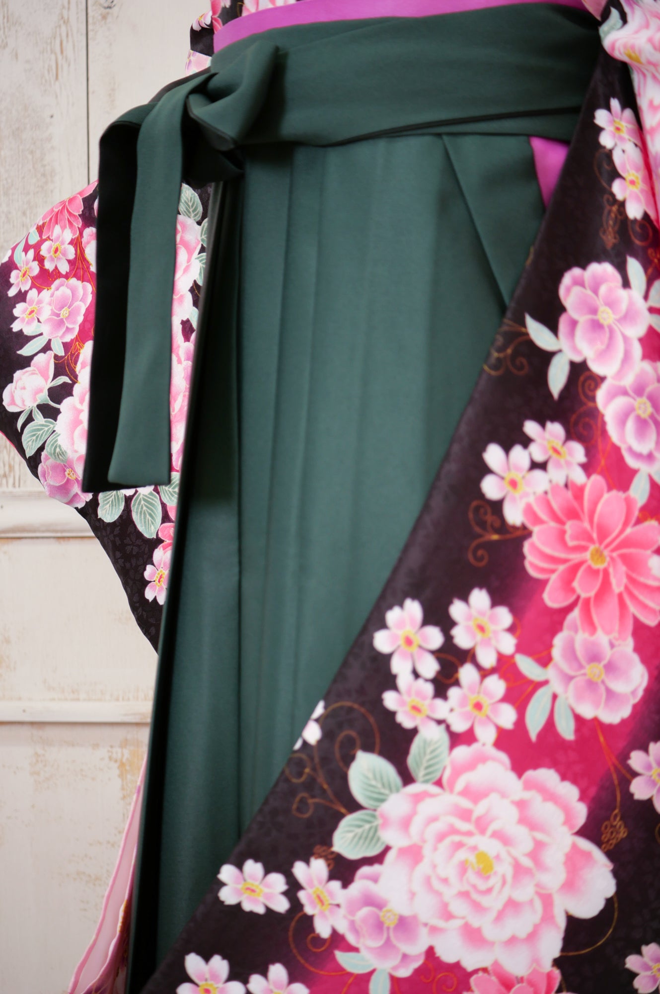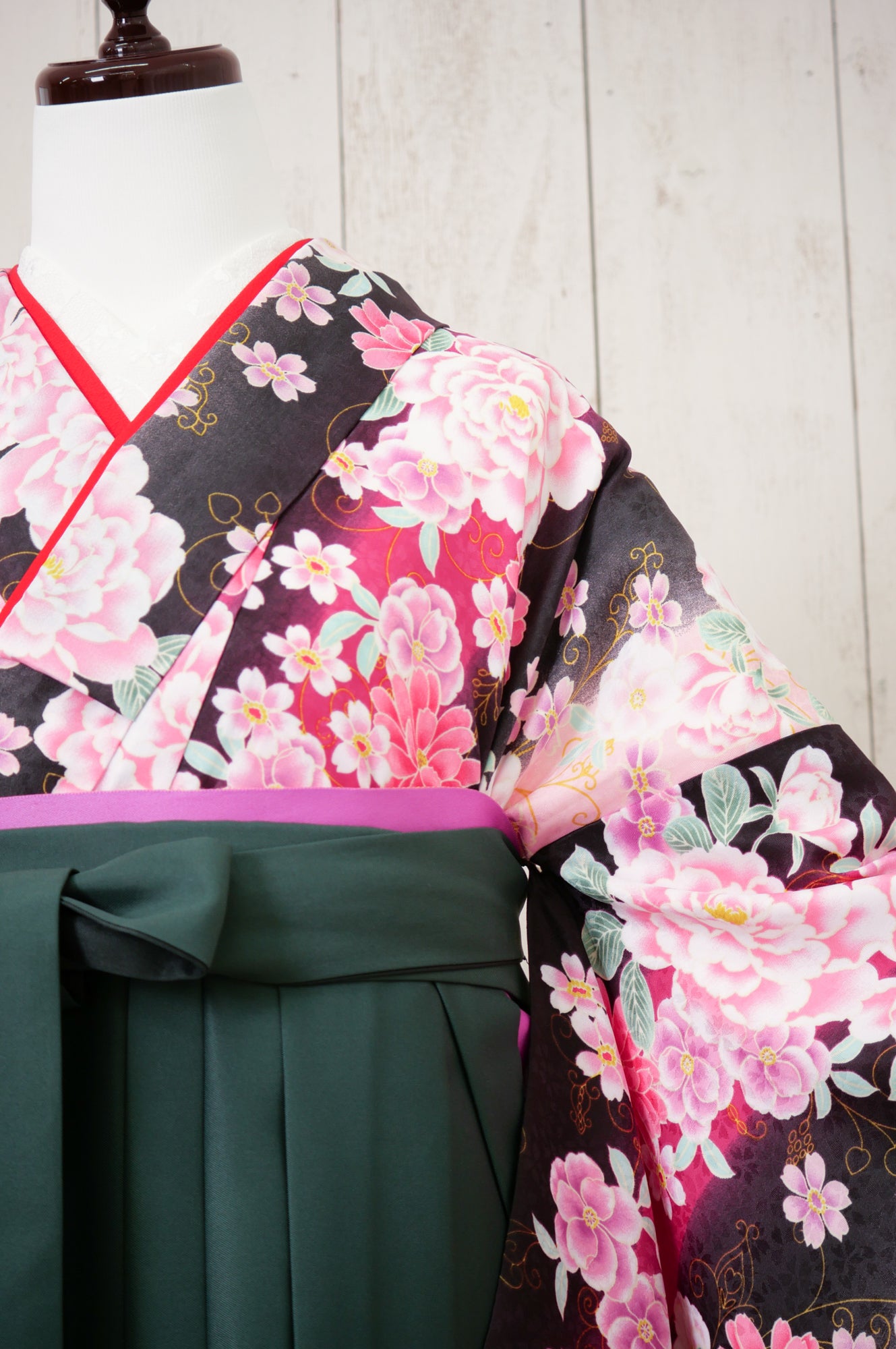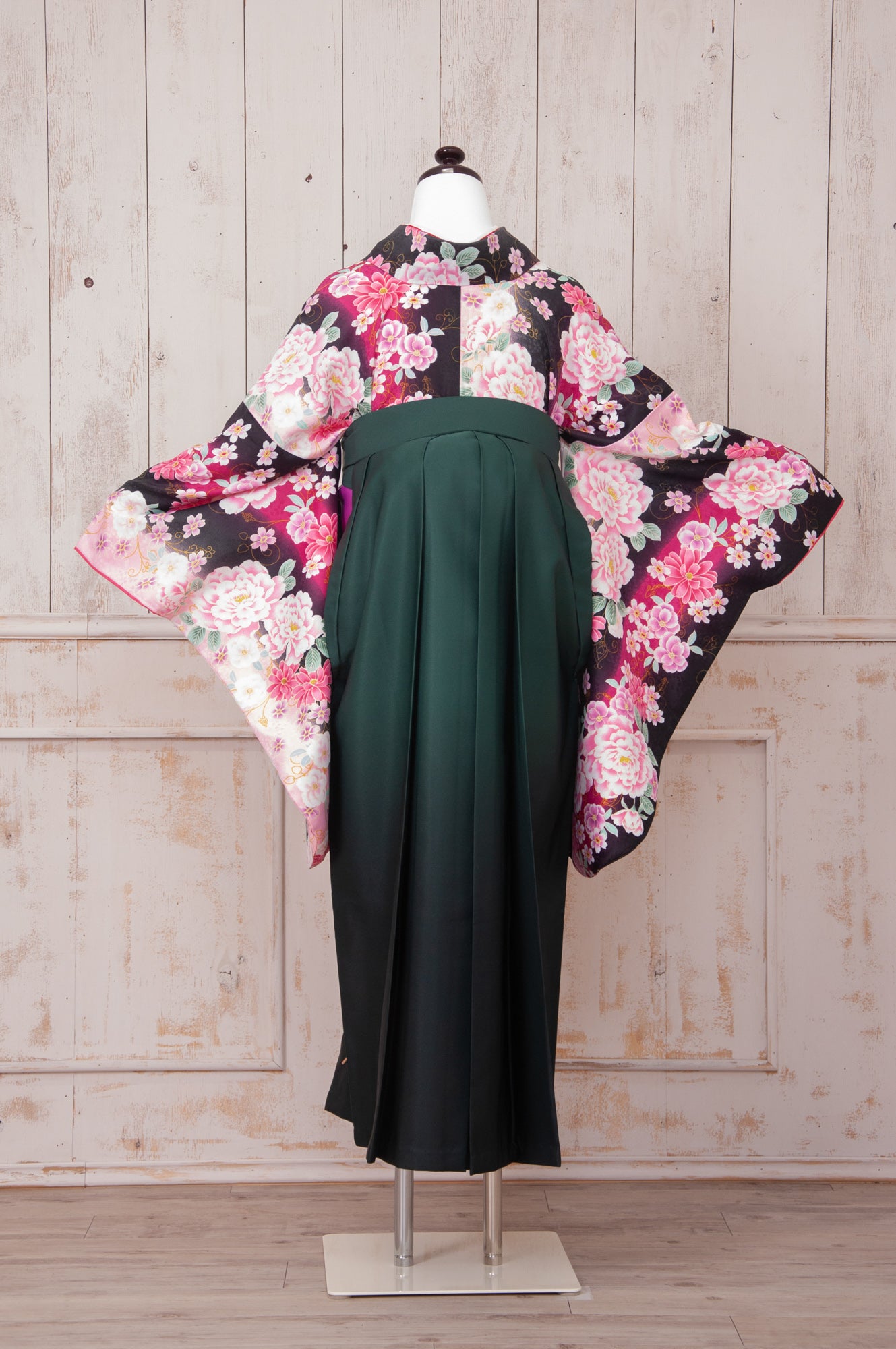 黒地に咲く大輪のピンクの牡丹が印象的。格式あるデザインに、深緑の袴でモード感をプラスしたスタイルです。