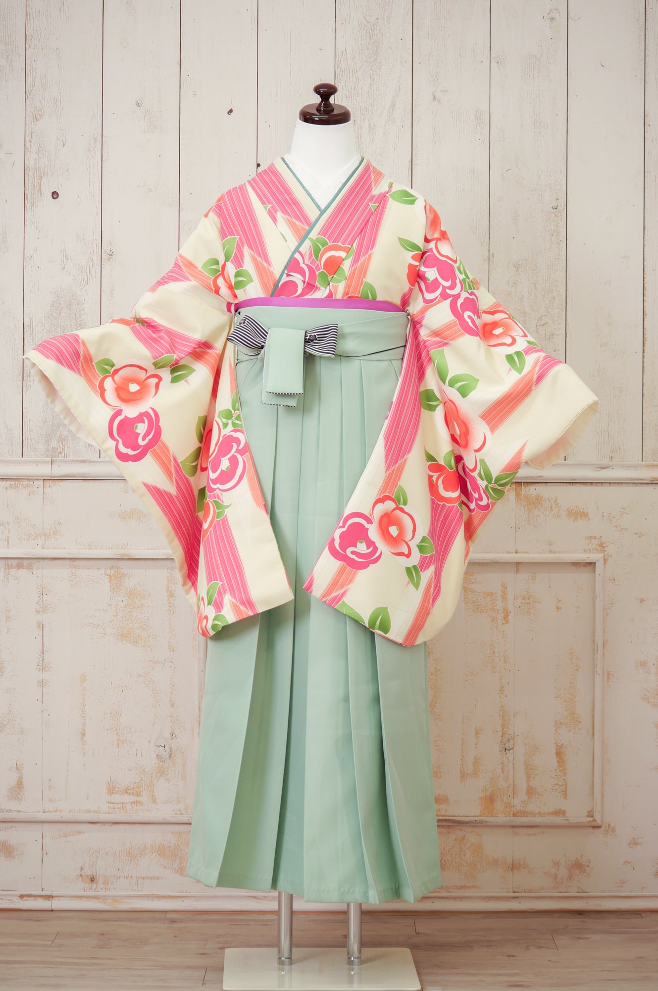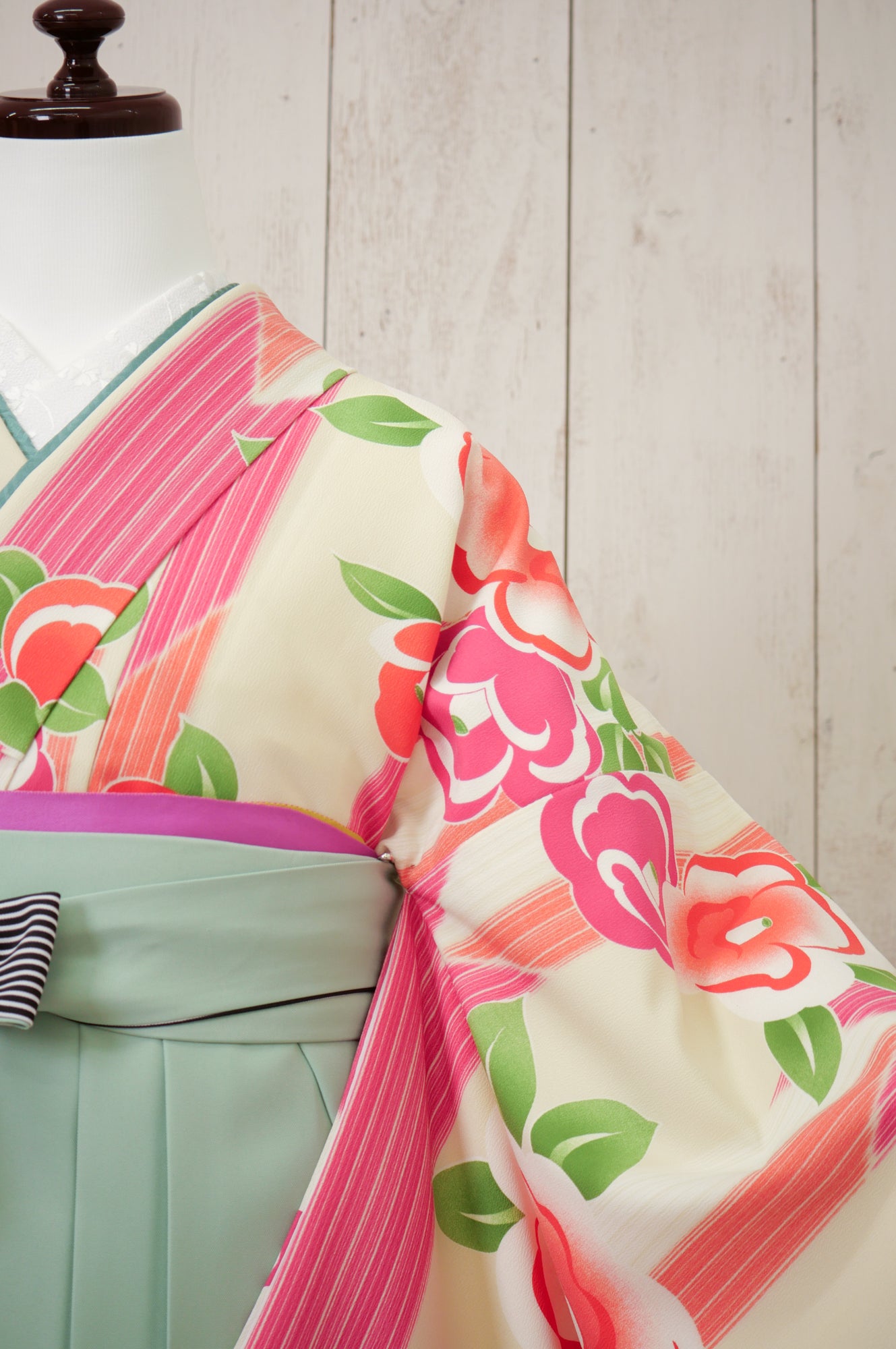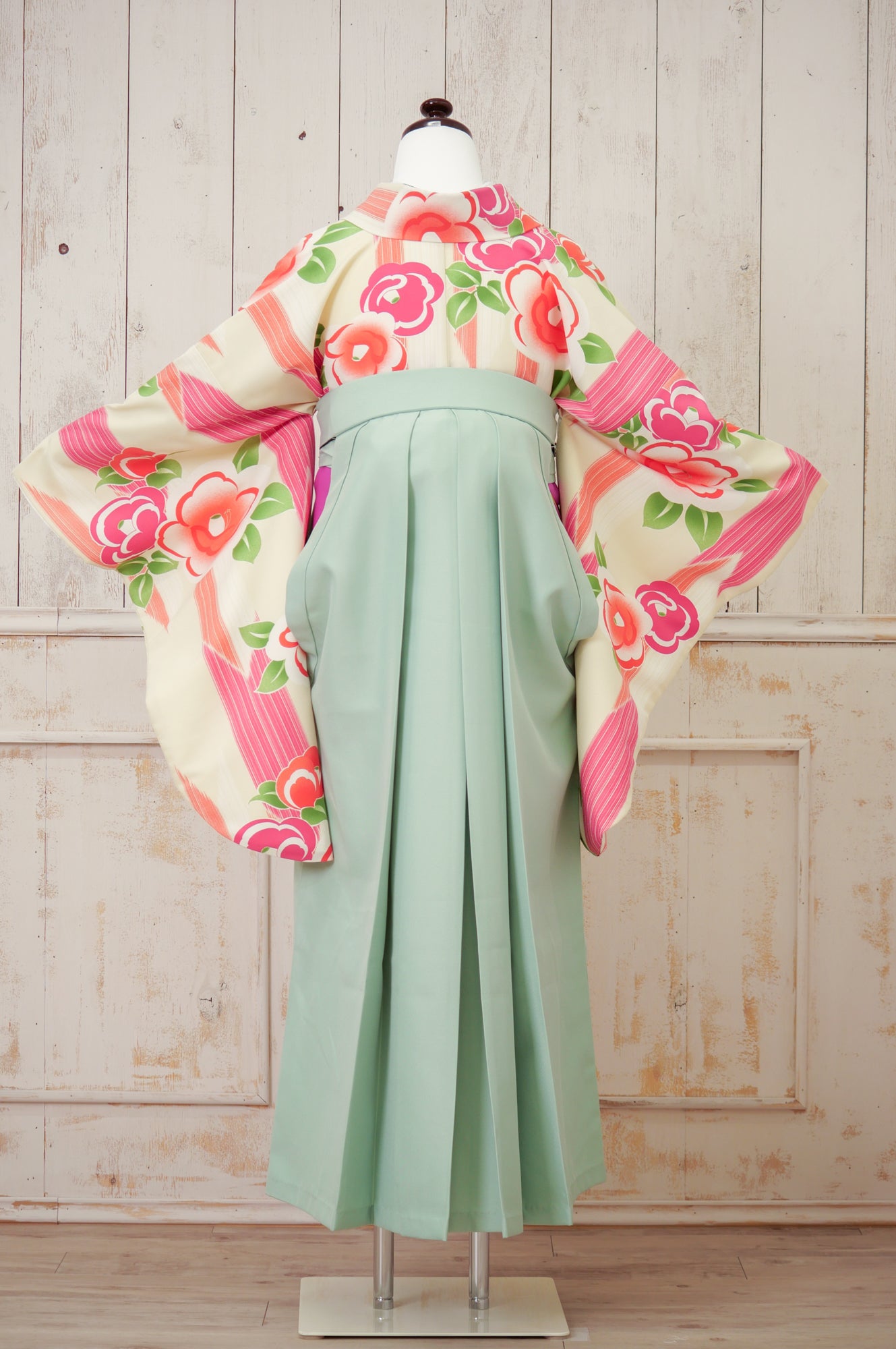淡いアイボリー地にカラフルな椿模様が散りばめられた、レトロポップな印象の一着。ミントグリーンの袴で爽やかに。