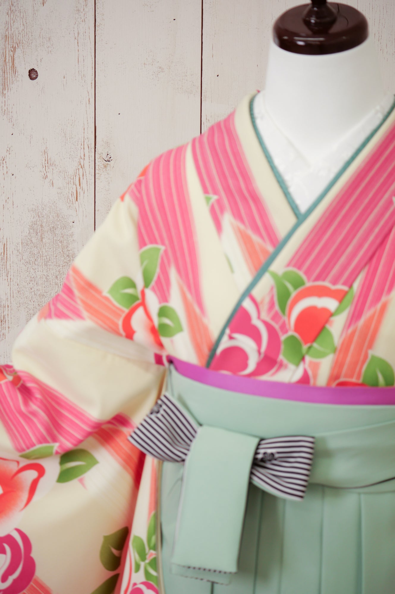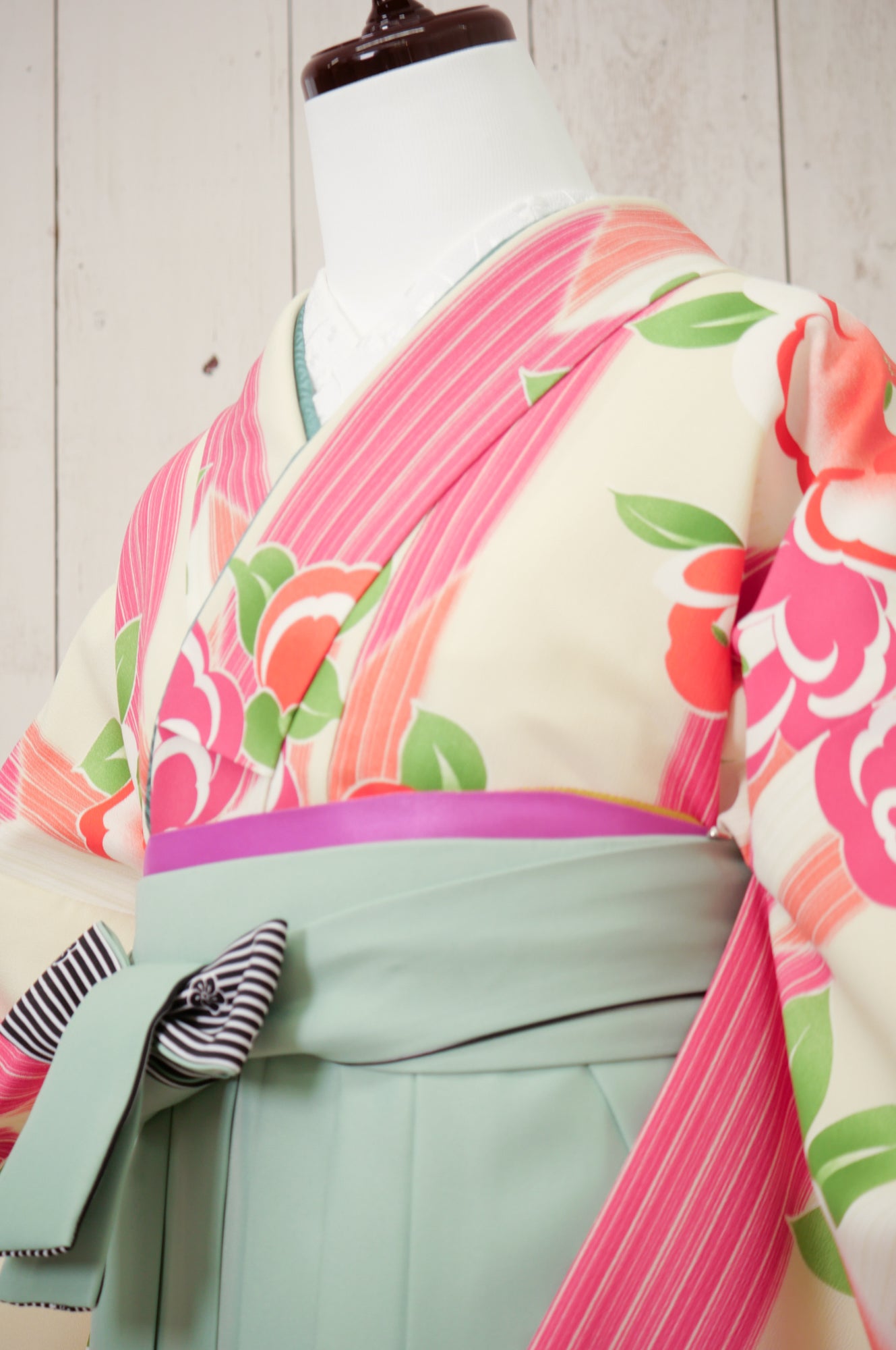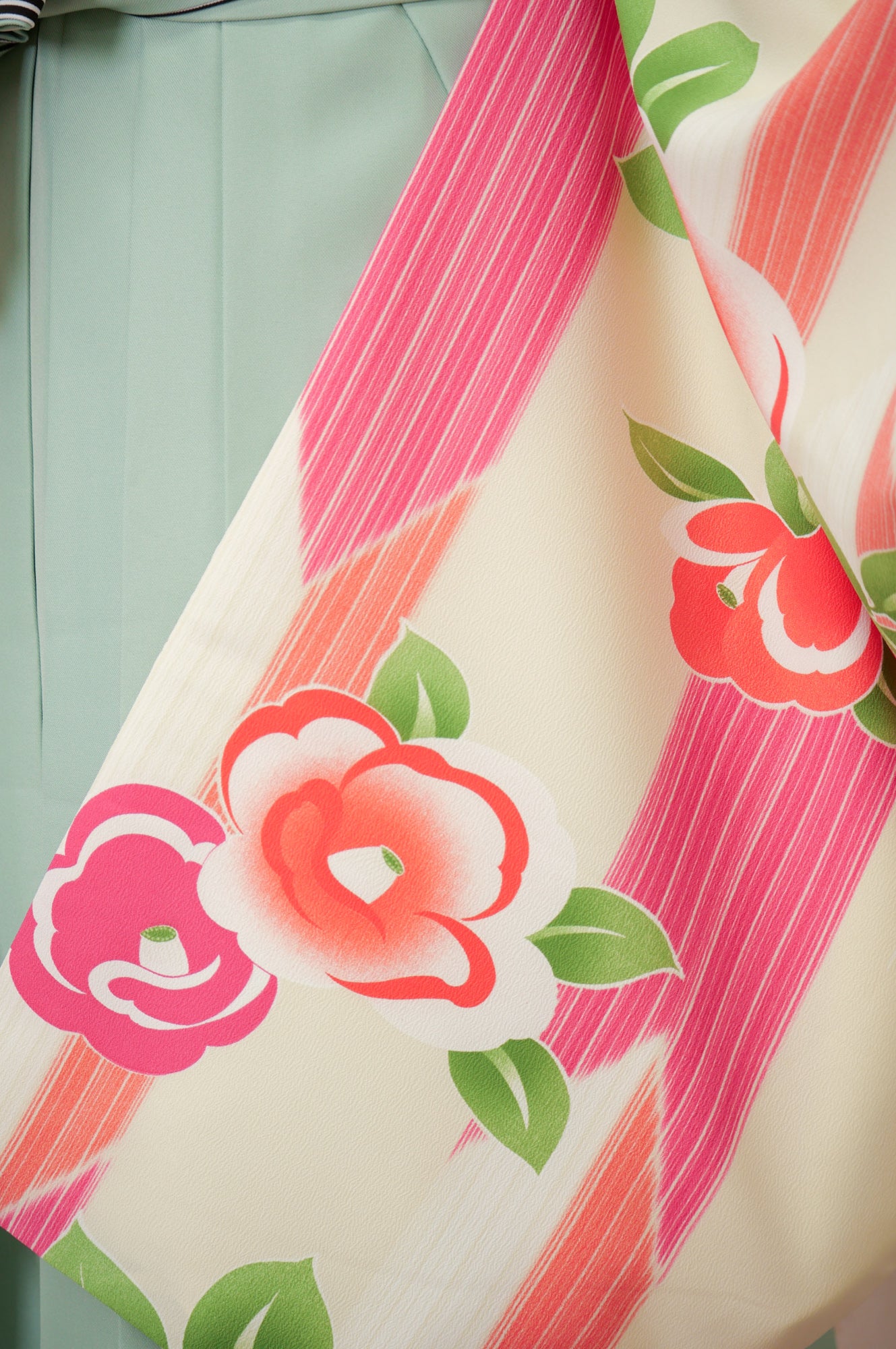 淡いアイボリー地にカラフルな椿模様が散りばめられた、レトロポップな印象の一着。ミントグリーンの袴で爽やかに。