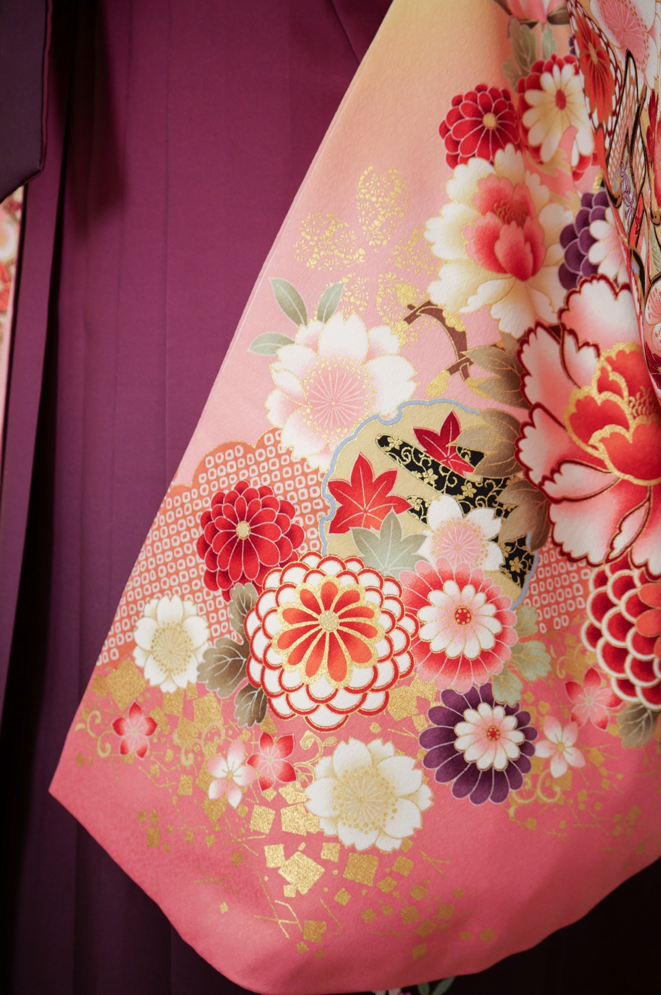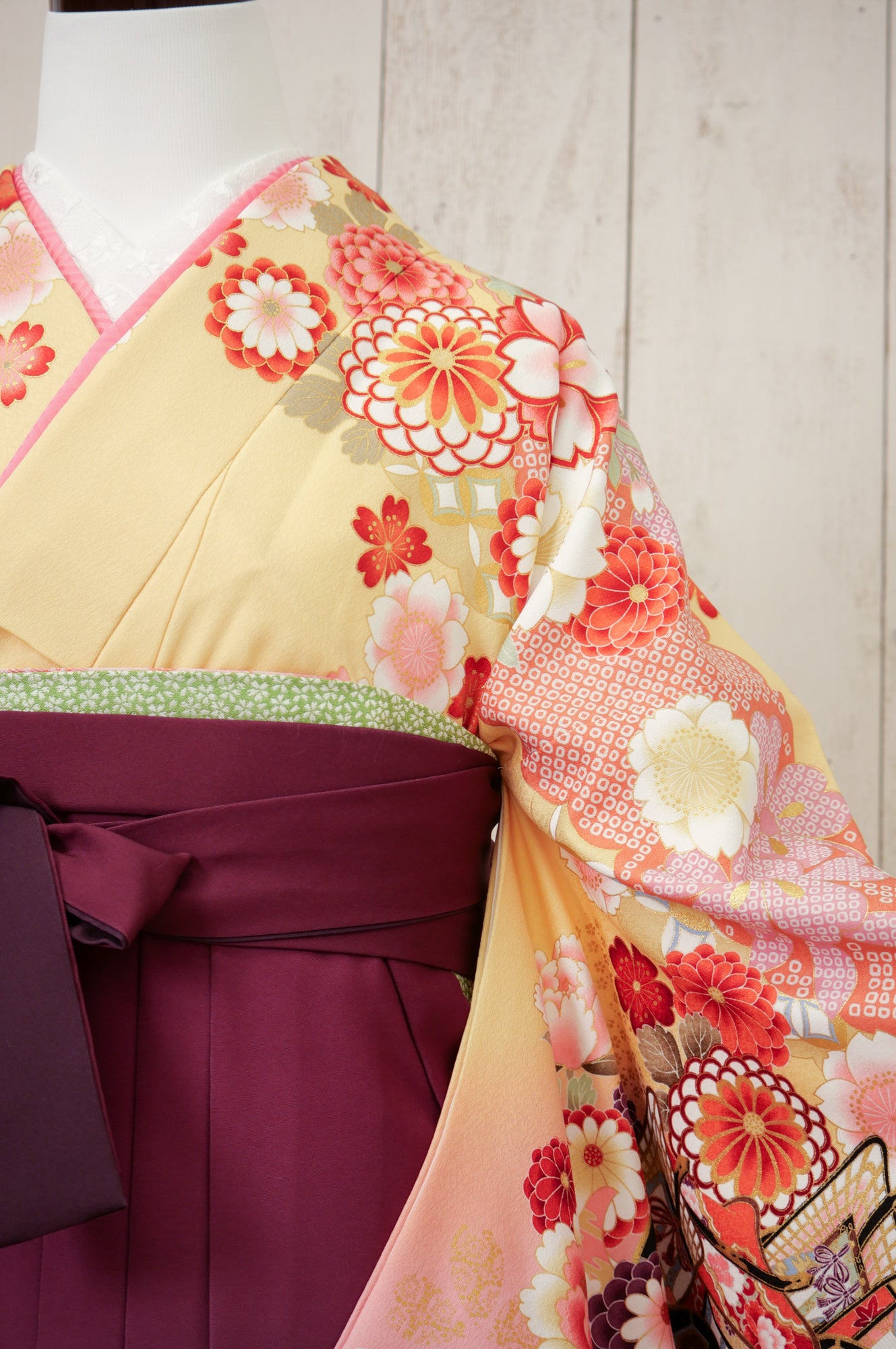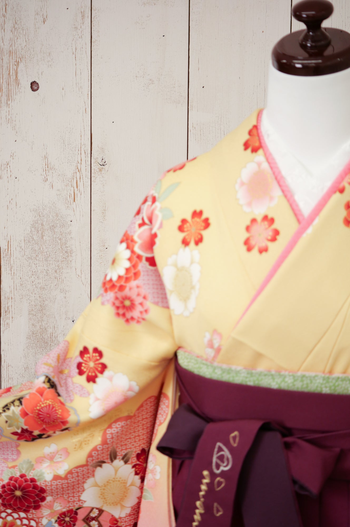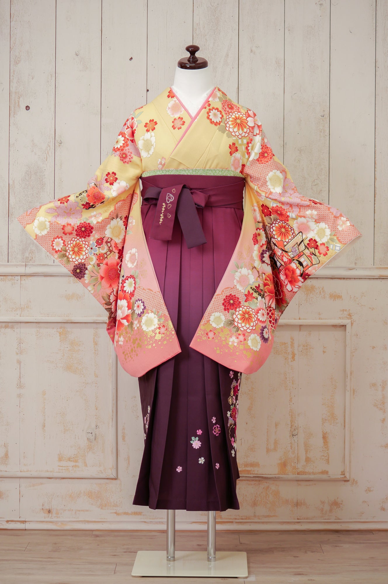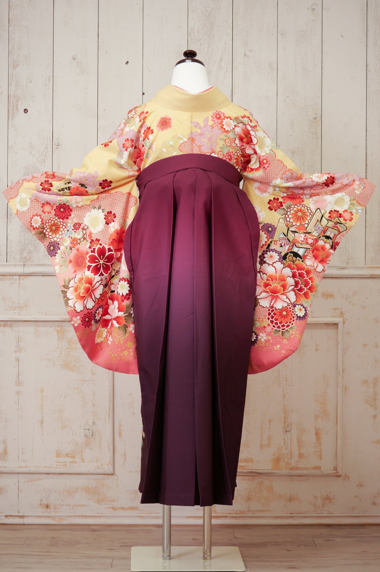黄色地にピンクや赤の花々が咲く華やかな着物。濃い紫の袴が甘さを引き締め、優雅な印象を与えます。