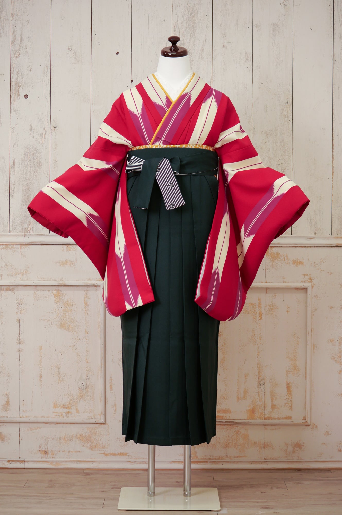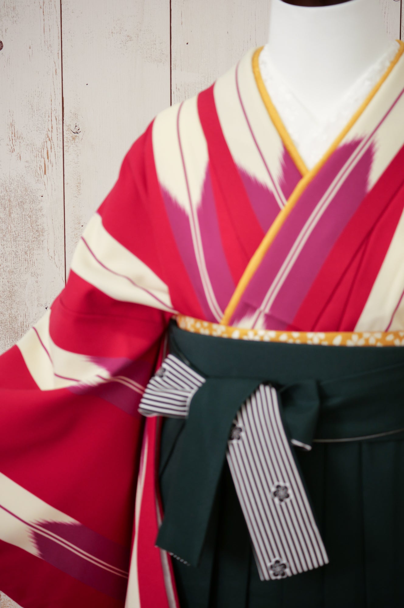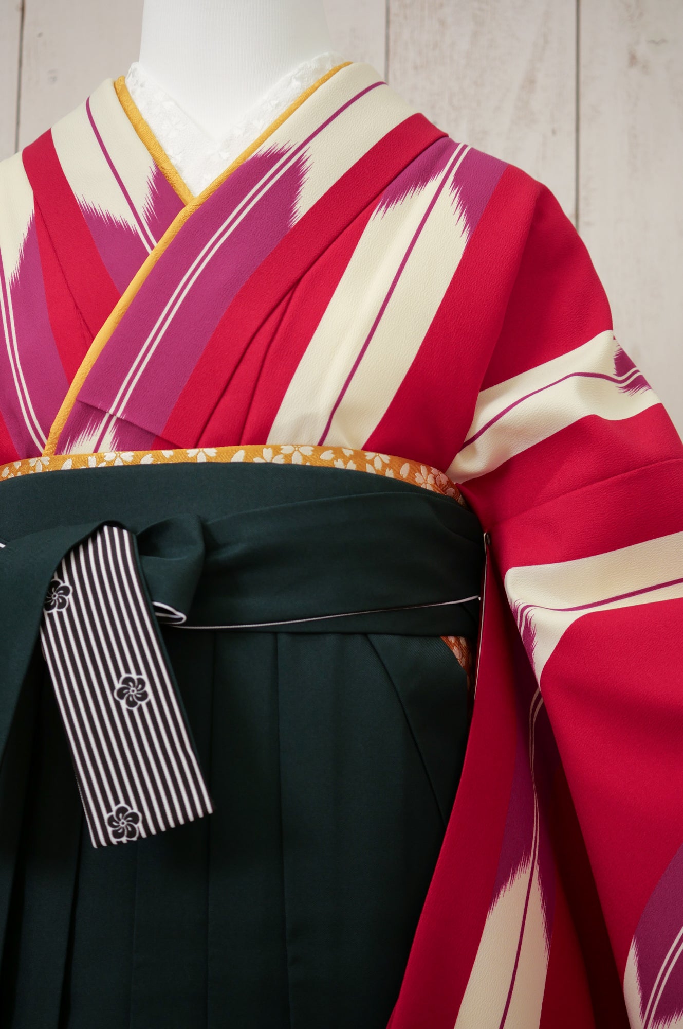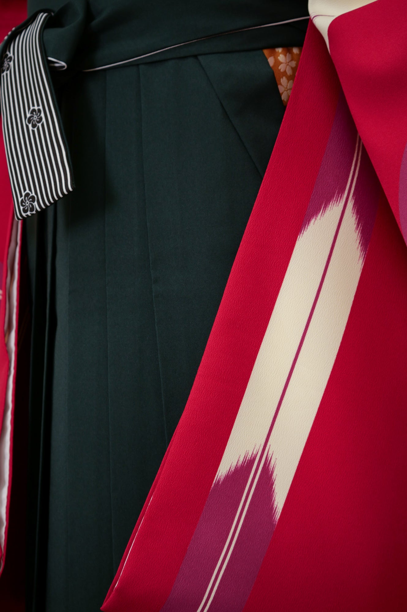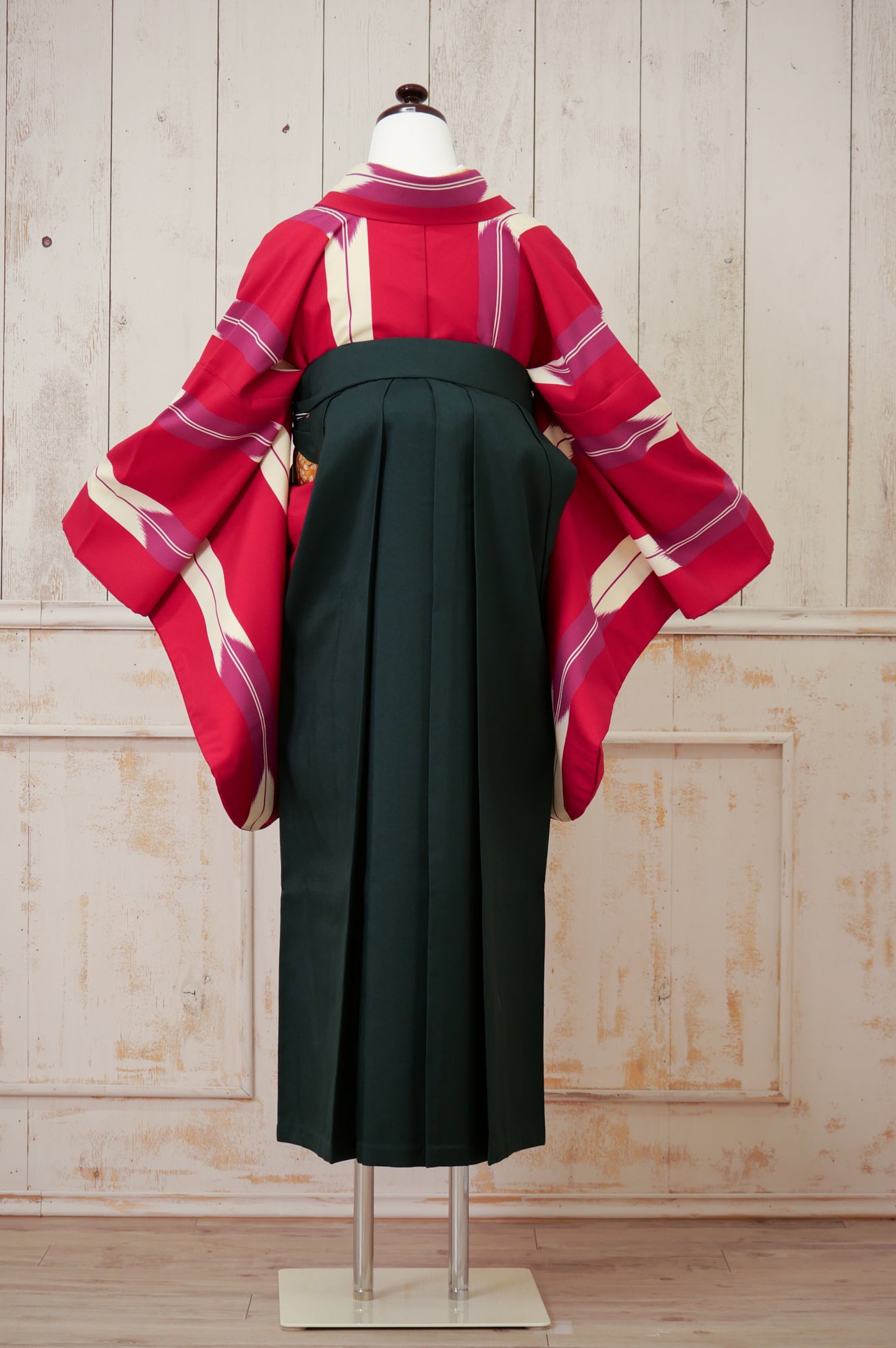 赤と白の縞模様がモダンな雰囲気を演出。深緑の袴と合わせて、伝統と個性が融合したクールなコーデ。