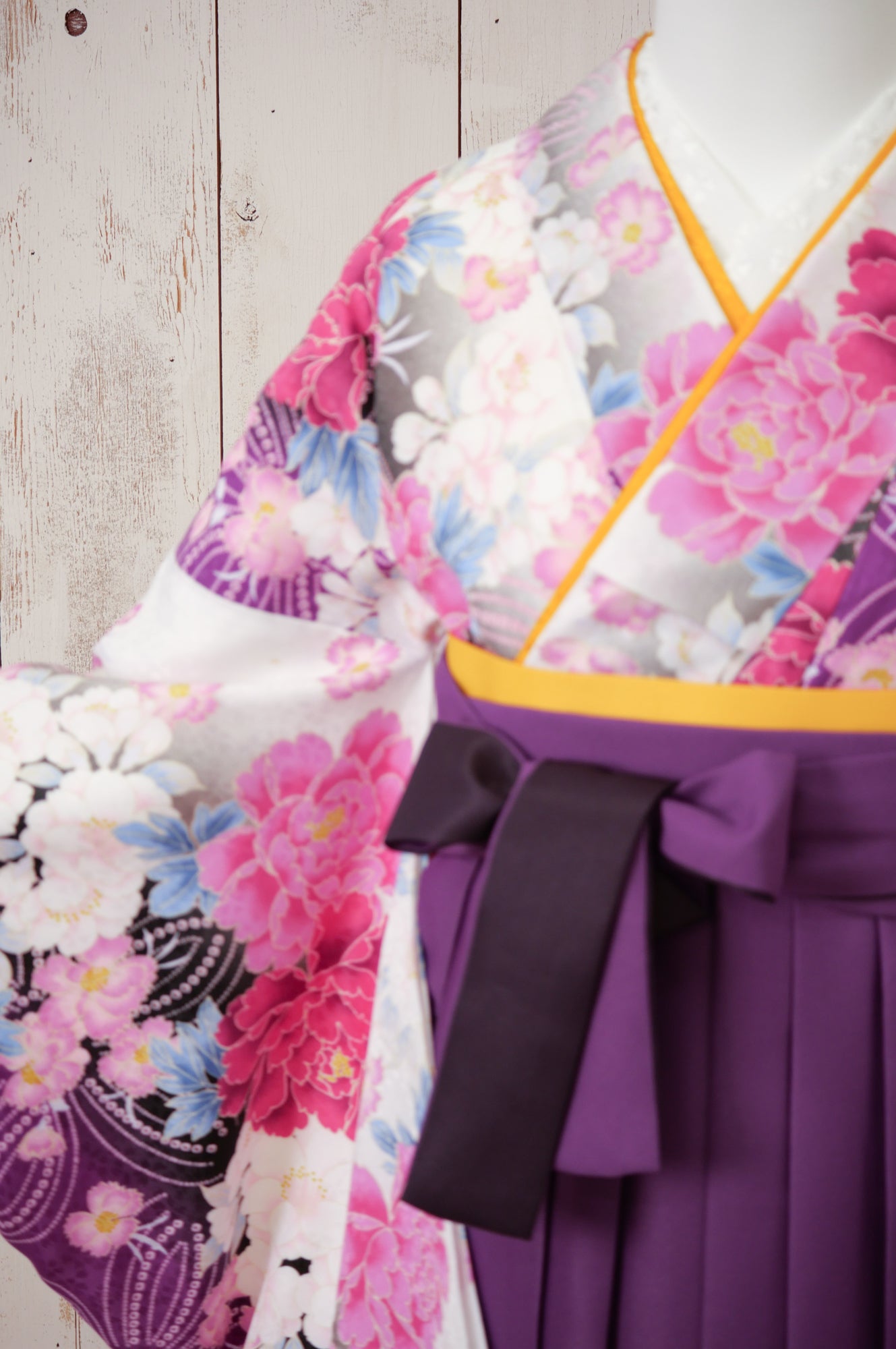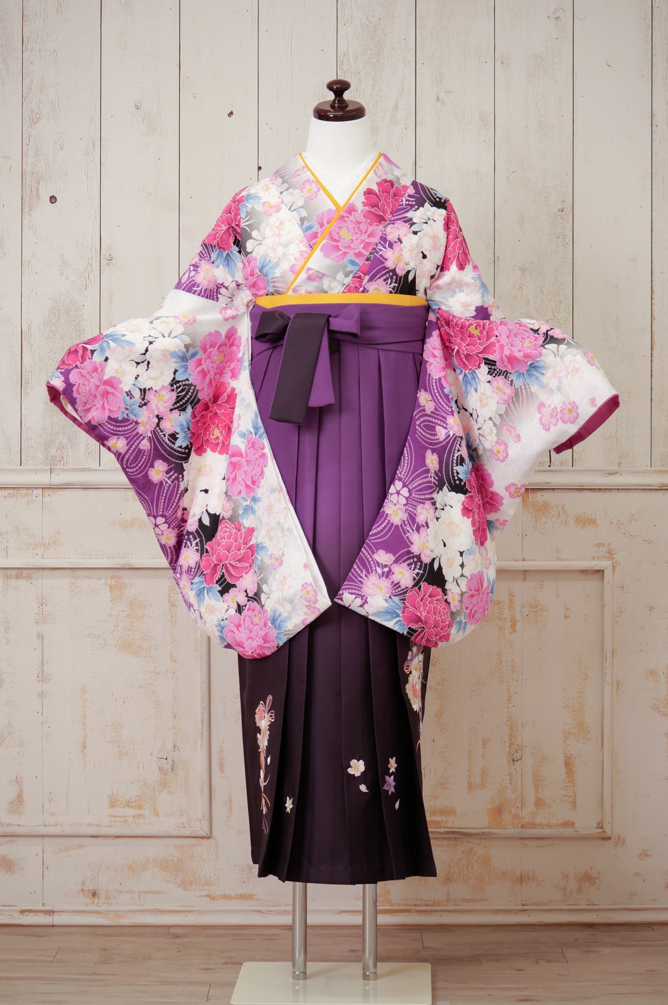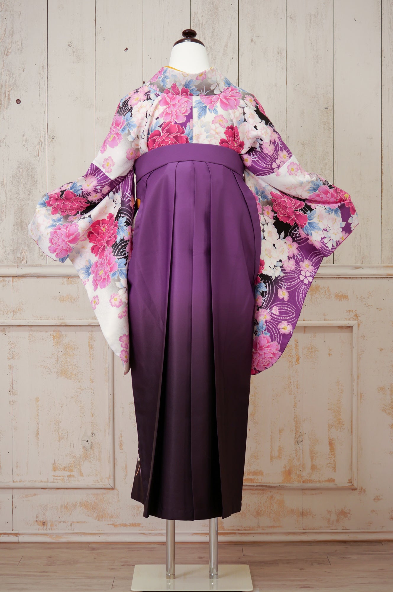 白地にピンクと紫の大輪の花が咲く華やかな着物。濃い紫の袴でクラシカルにまとまり、品のある印象に。