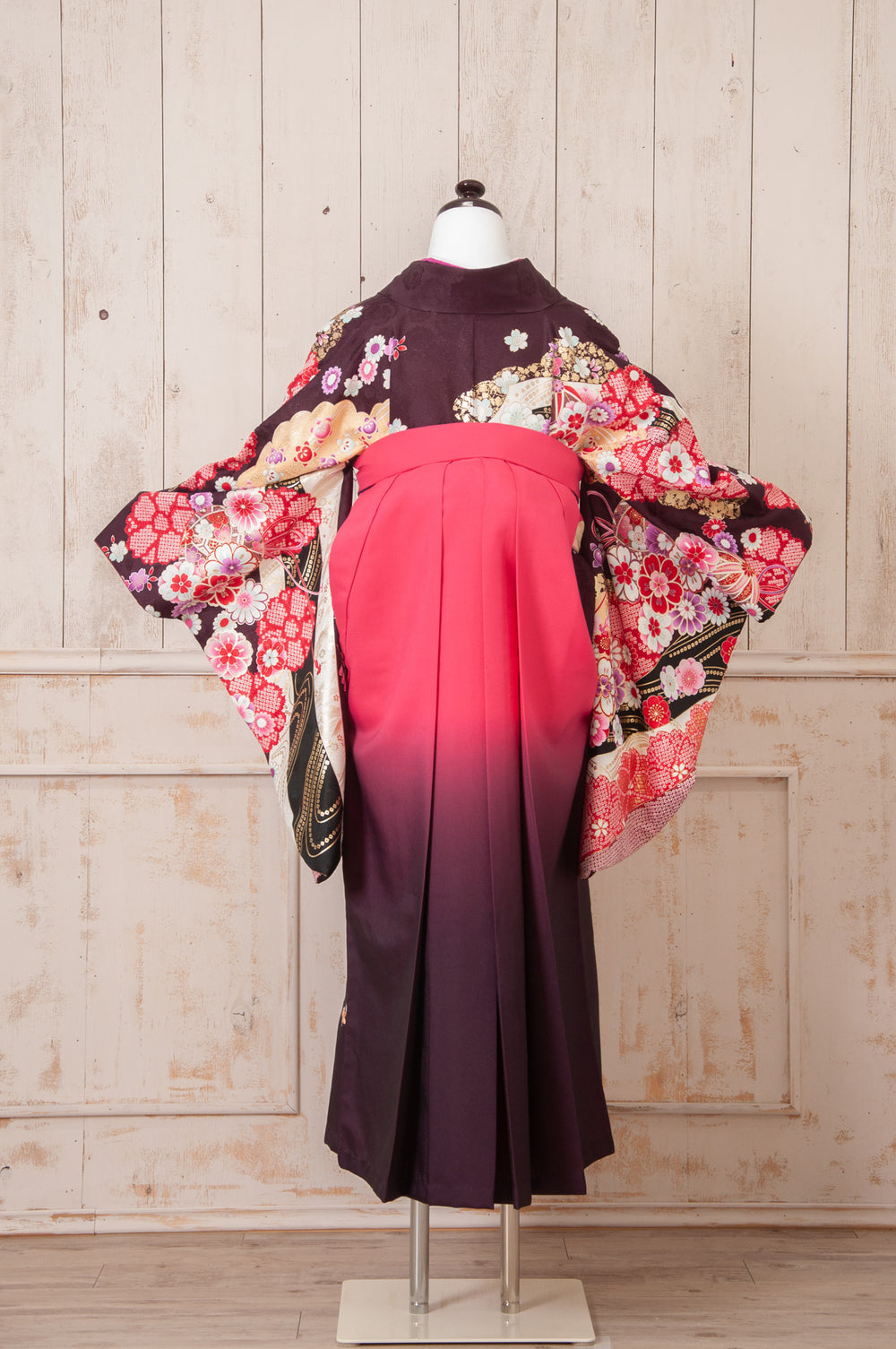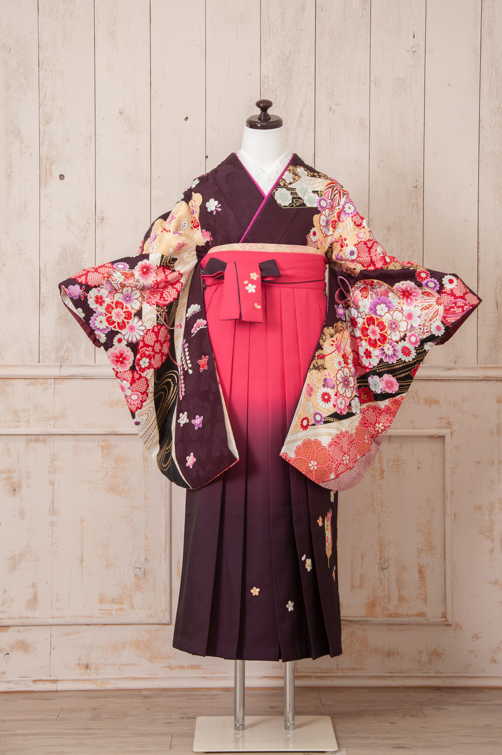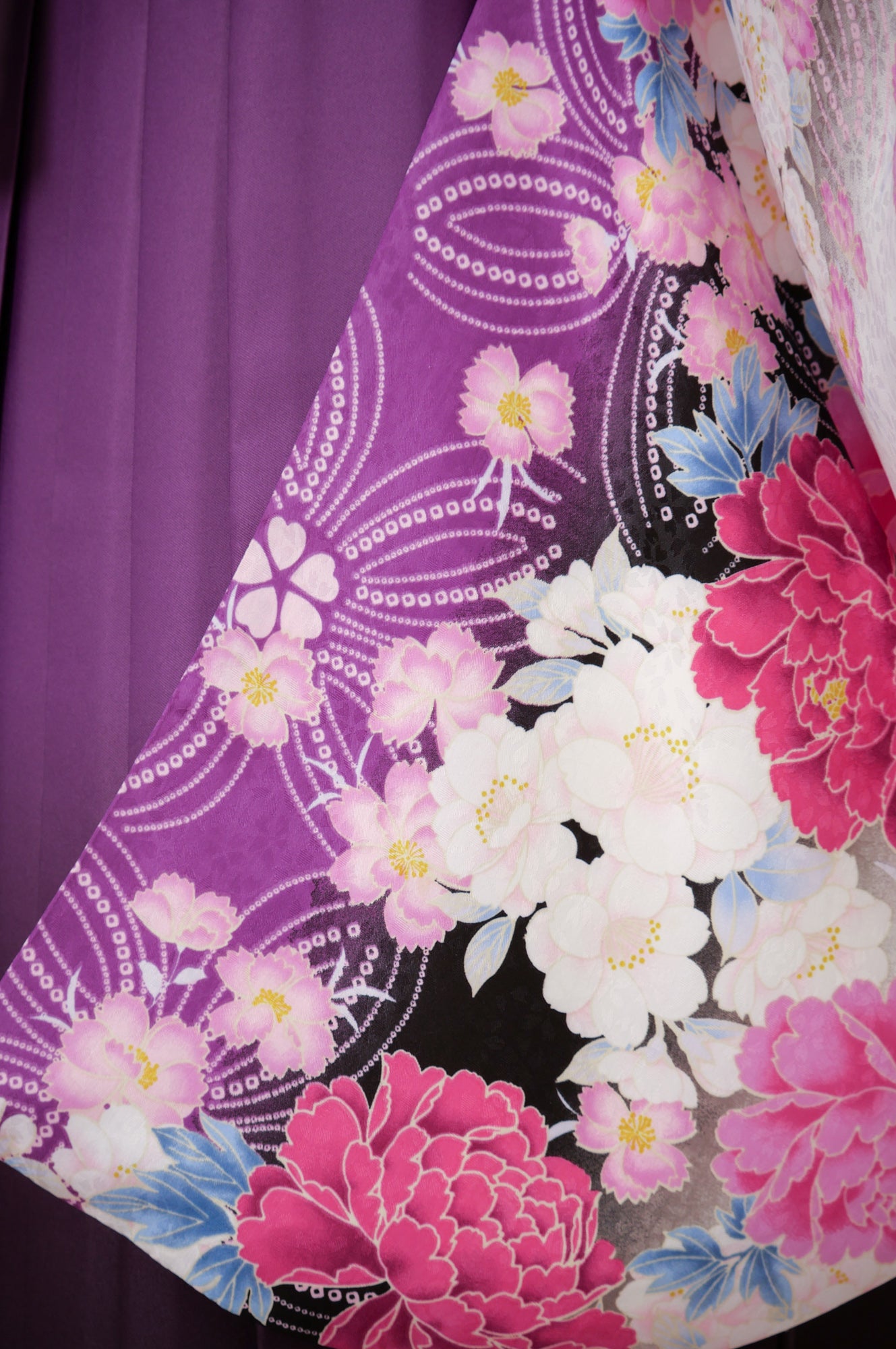 白地にピンクと紫の大輪の花が咲く華やかな着物。濃い紫の袴でクラシカルにまとまり、品のある印象に。